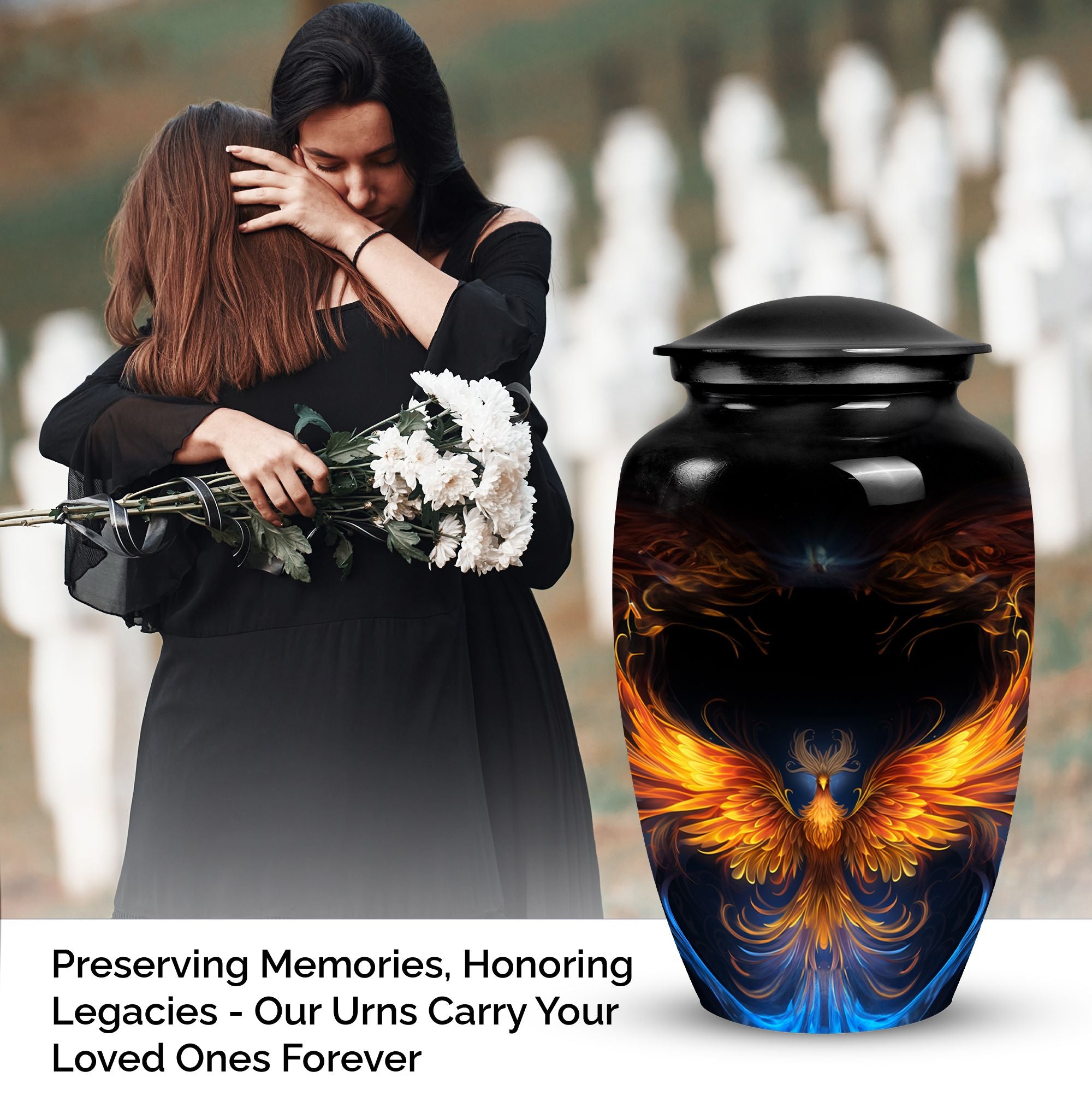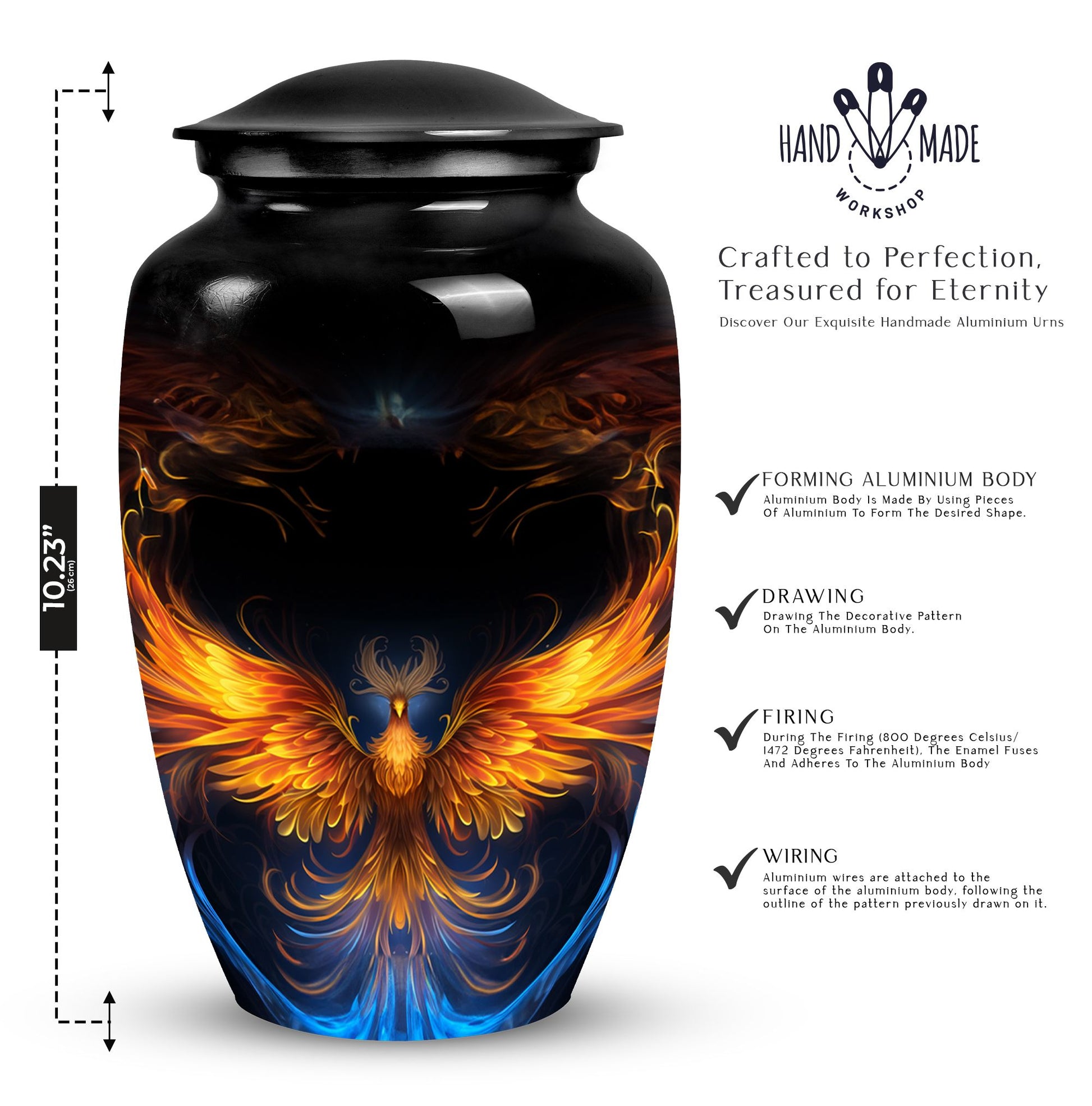 Honor and memorialize a loved one with our Phoenix Urn, a remarkable tribute in the realm of Large Urns. This impeccable Metal Cremation Urn offers a solemn and aesthetically pleasing way to pay respects. Meticulously crafted, it carries an iconic symbolism associated with the Phoenix – a powerful emblem of rebirth, renewal and eternal life. Perfect for the commemoration of a strong and dignified male figure, this urn masterfully conveys a man's unyielding spirit even in his physical absence. Indeed, when seeking 'Urns For Men' or 'Cremation Urns For Adult Ashes Men', the Phoenix Urn offers a compelling choice. It seamlessly melds ceremonial tradition with a modern ethos. Its distinctive design does more than house ashes; it celebrates an esteemed lifetime. Infused with profound symbolism and crafted to perfection, this cremation vessel embodies a triumphant testament to a life well-lived.
