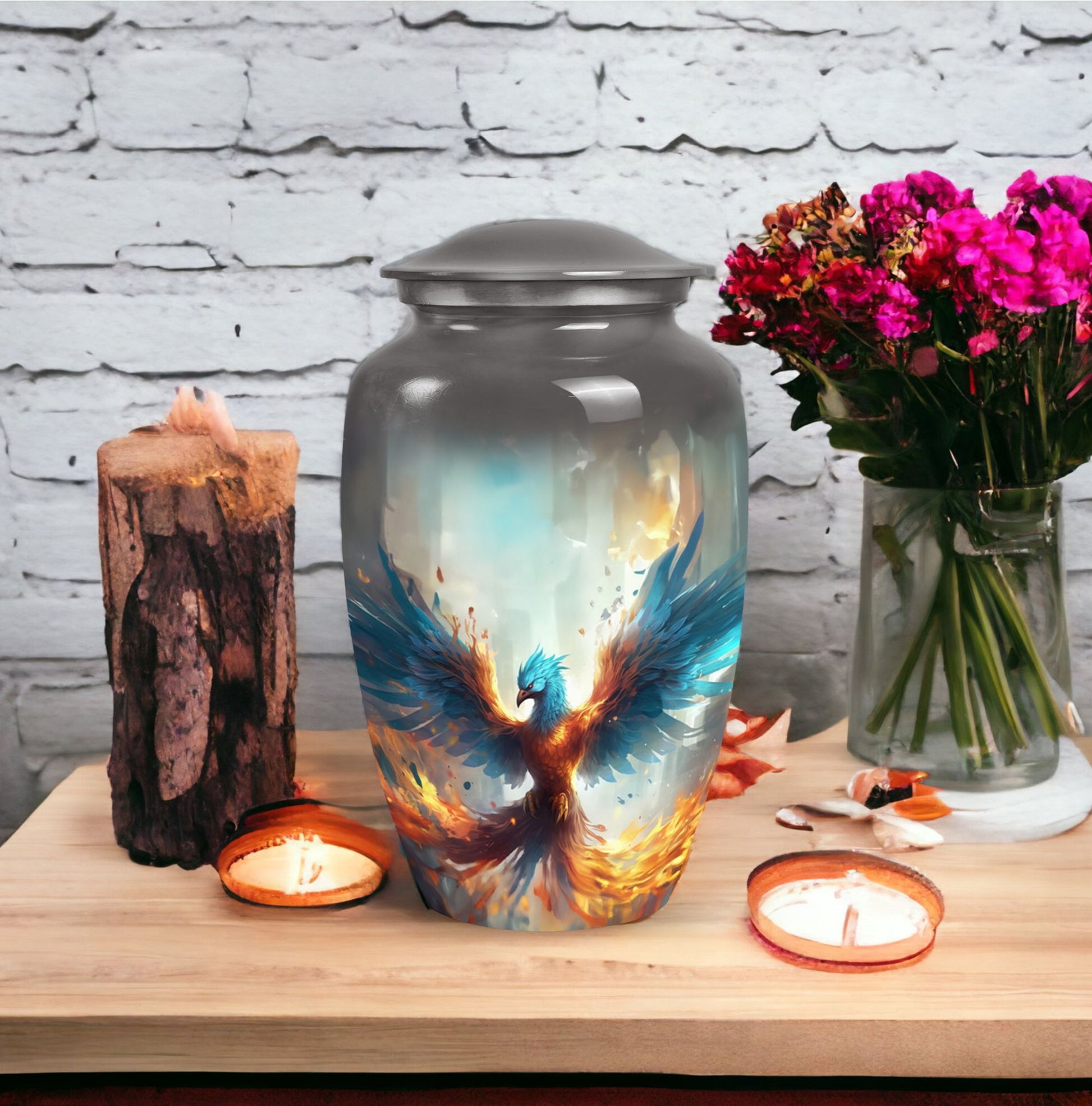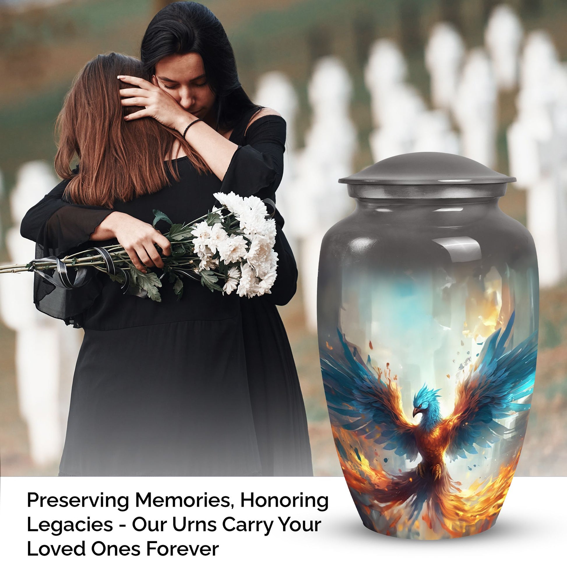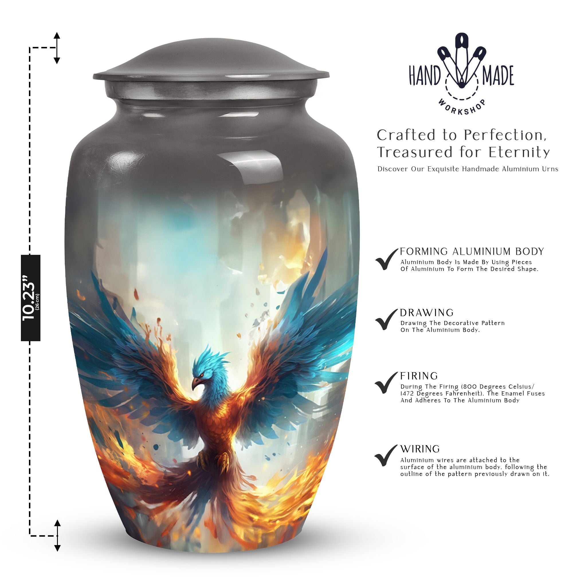 Find peace and solace in our Phoenix Urn, a timeless piece of reverence designed with a seamless blend of aesthetics and symbolism. Skillfully crafted from quality metal, these cremation urns serve as a fitting resting place to immortalize your dearly departed. Perfectly suited for adult ashes, our urns encapsulate the essence of ethereal beauty and unmatched durability. Whether you're seeking large urns for male or female ashes, our selection caters to those variances with spacious designs. Each urn radiates a unique warmth, offering a soothing touch in your time of grief. Be it a memento for yourself or a heartfelt gift for someone grieving, our Phoenix Urn powerfully represents the cycle of life, death, and resurrection. Carrying an unmistakable vibe of comforting serenity, our metal cremation urns cultivate a poignant pillar of memory within the heart of your home.