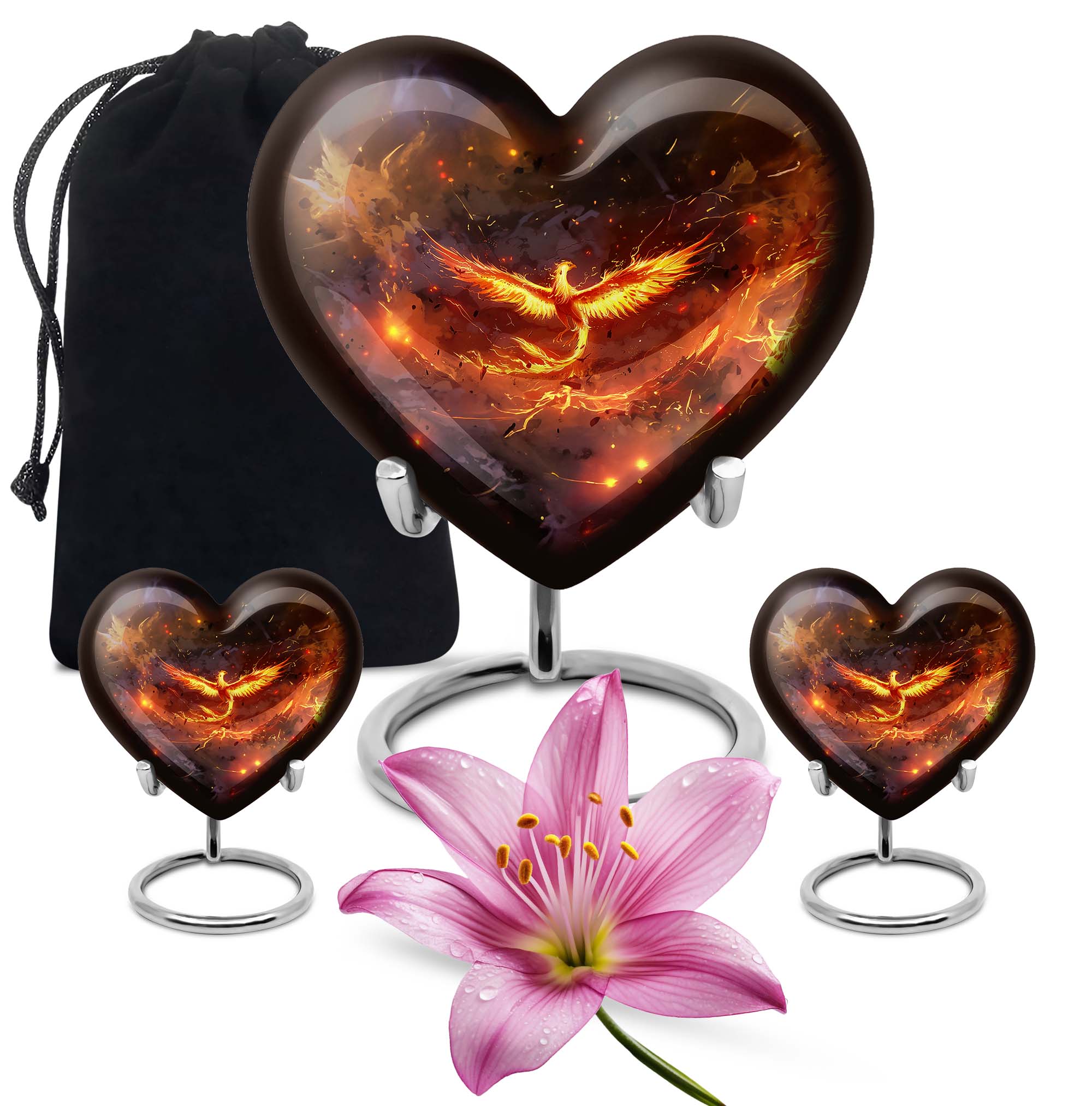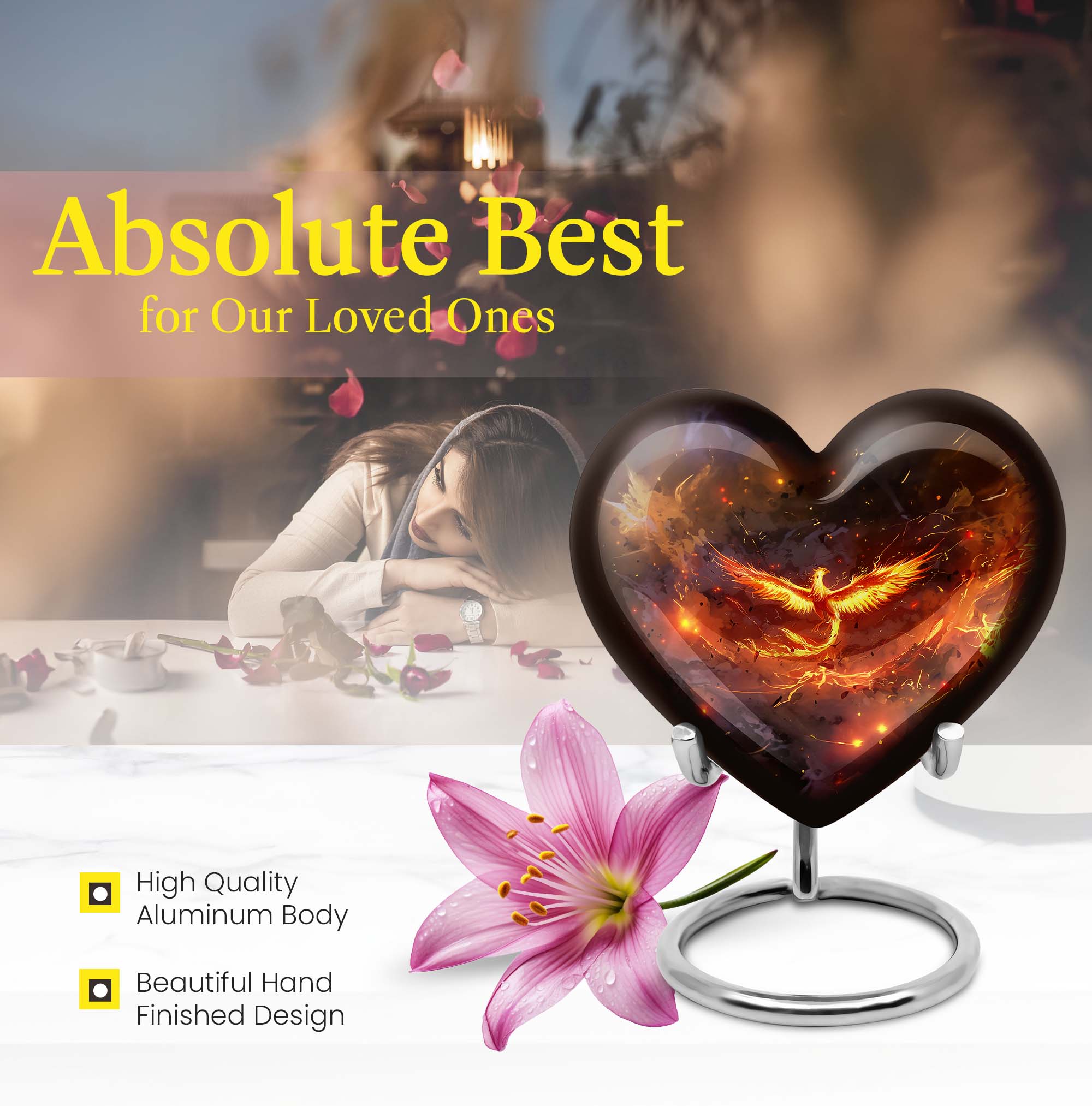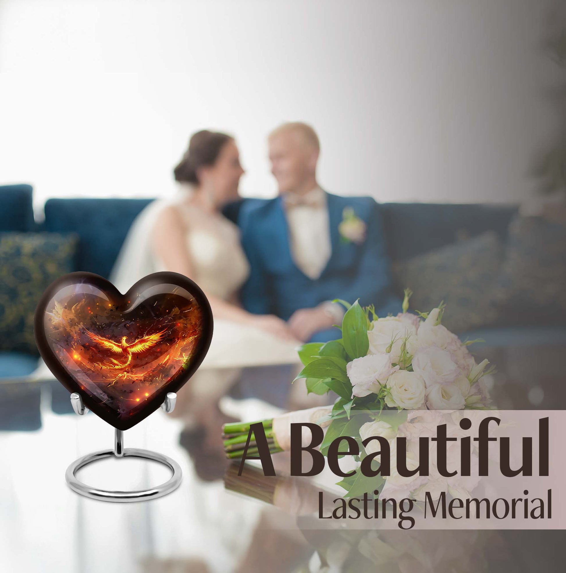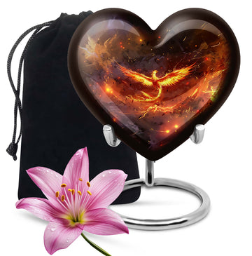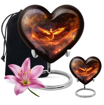 Discover serenity in the midst of sorrow with our absorbing, heirloom-quality phoenix urn. Ideal for use as a memorial urn for male or female adults, this cremation urn uniquely convenes durability, aesthetics, and reverence. Each 10-inch aluminium urn gracefully respects the memory of your loved one, with a weight and size that seems custom-built to match your needs. The heart urn subtly exhibits an abstract theme and can hold up to 200 cubic inches of ashes with dignity. Furthermore, our urn comes with a velvet pouch for containing ashes that ease peaceful containment. The large urn offers the possibility of personalizing with engraved names, enhancing a stirring tribute to create something profoundly intimate. This phoenix urn is perfect for people searching for companion urns for two adults, or large metal urn for ashes. Search no further for a lasting, dignified remembrance. Pay homage to your departed with a transcendent blend of affection and artistry.