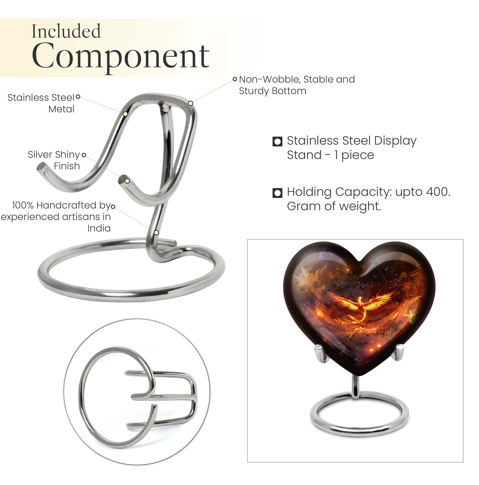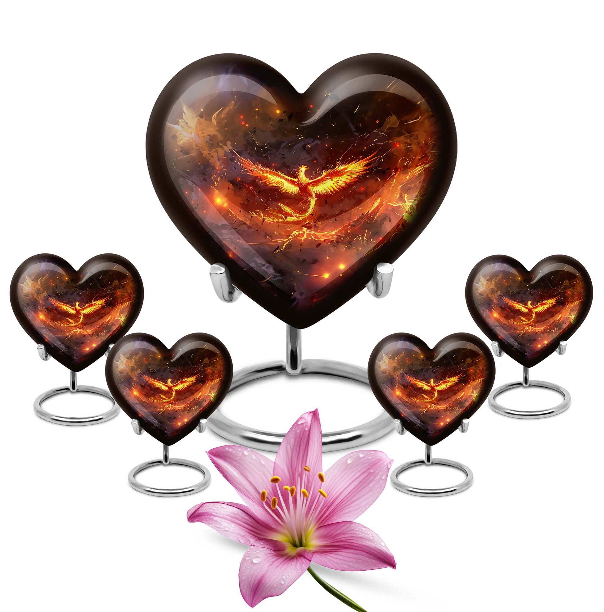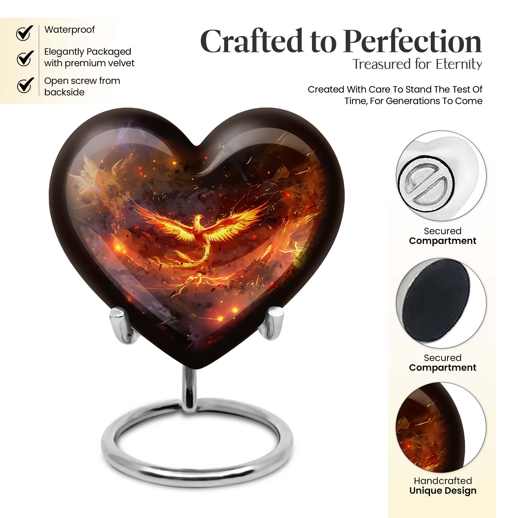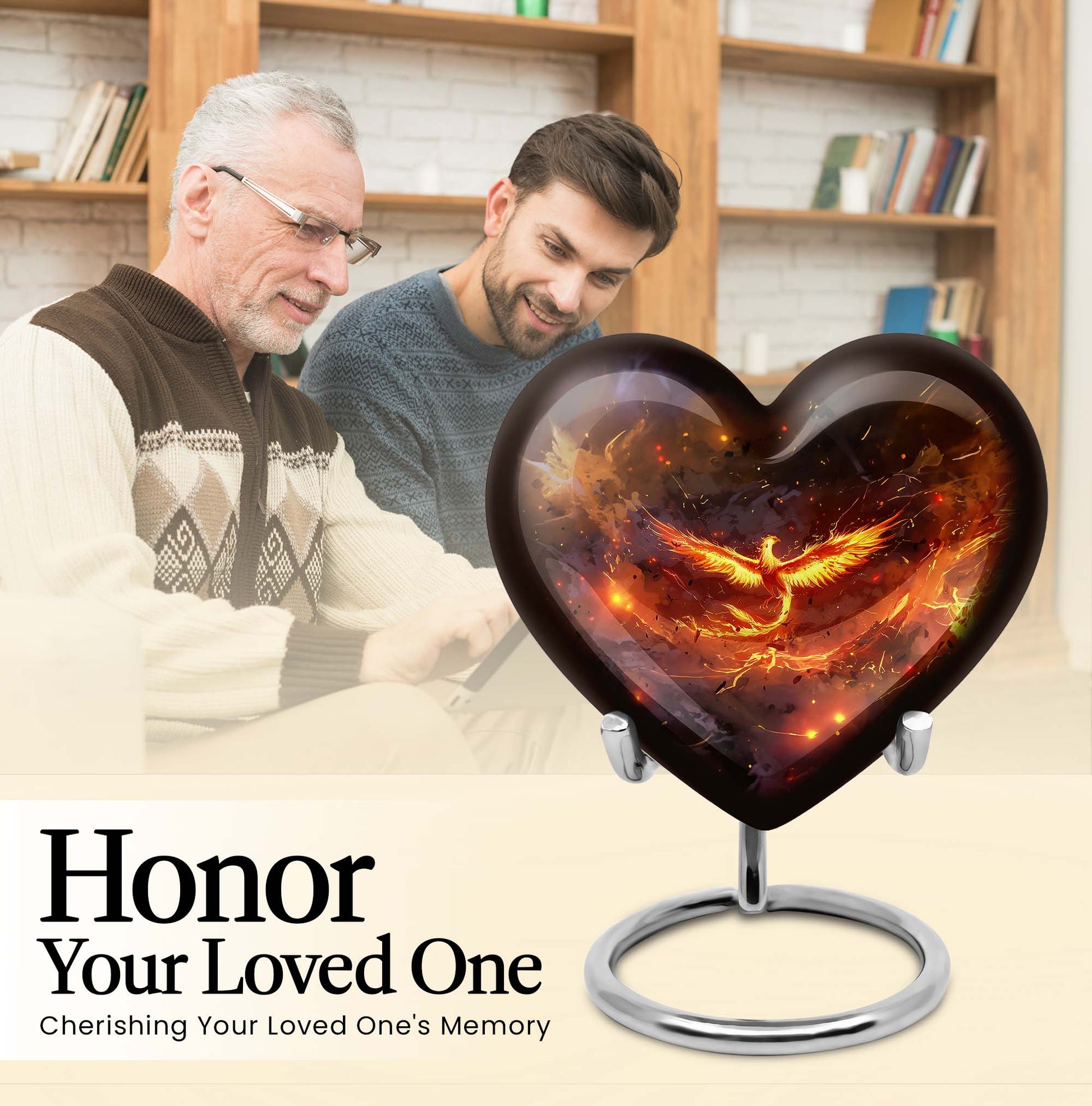 Discover serenity in the midst of sorrow with our absorbing, heirloom-quality phoenix urn. Ideal for use as a memorial urn for male or female adults, this cremation urn uniquely convenes durability, aesthetics, and reverence. Each 10-inch aluminium urn gracefully respects the memory of your loved one, with a weight and size that seems custom-built to match your needs. The heart urn subtly exhibits an abstract theme and can hold up to 200 cubic inches of ashes with dignity. Furthermore, our urn comes with a velvet pouch for containing ashes that ease peaceful containment. The large urn offers the possibility of personalizing with engraved names, enhancing a stirring tribute to create something profoundly intimate. This phoenix urn is perfect for people searching for companion urns for two adults, or large metal urn for ashes. Search no further for a lasting, dignified remembrance. Pay homage to your departed with a transcendent blend of affection and artistry.