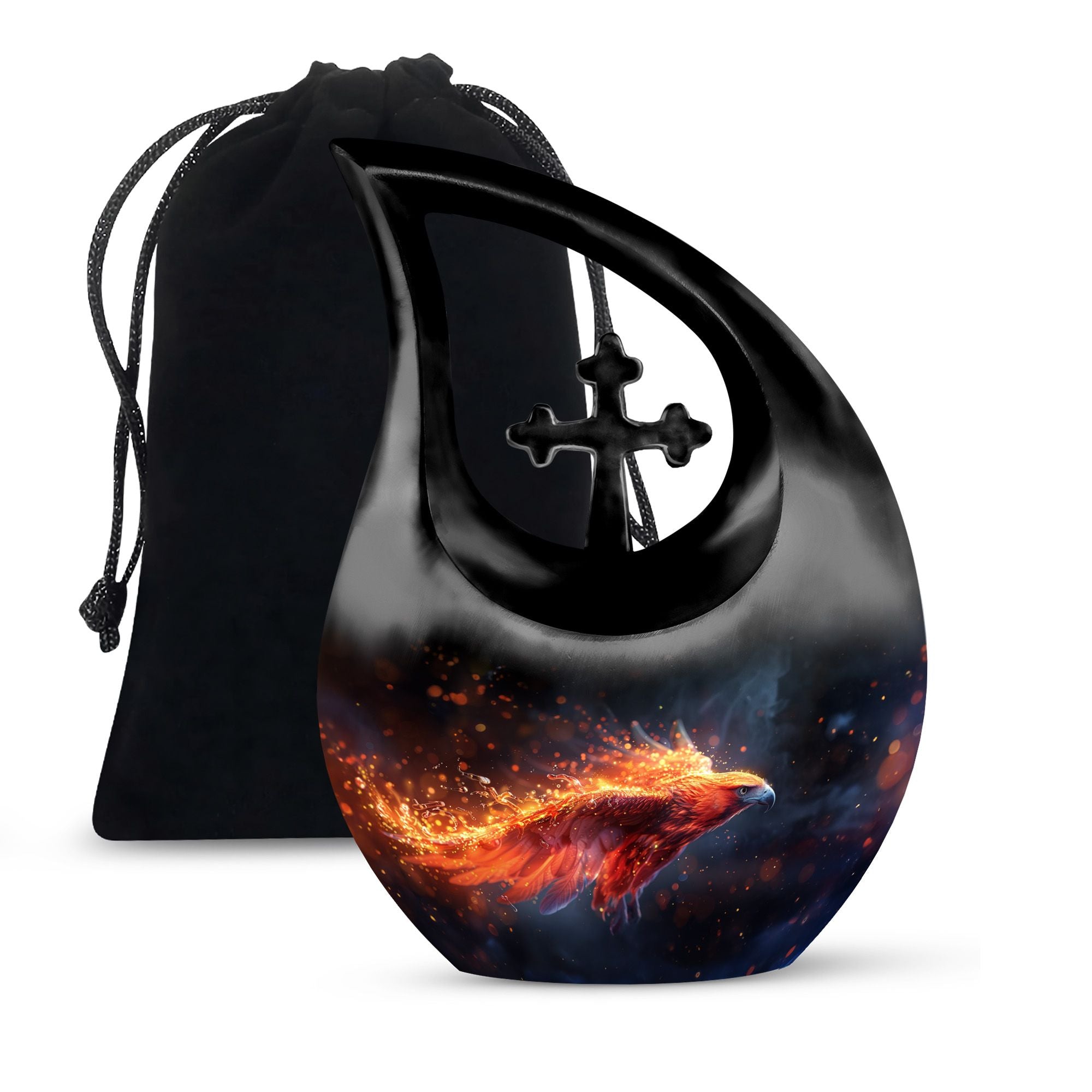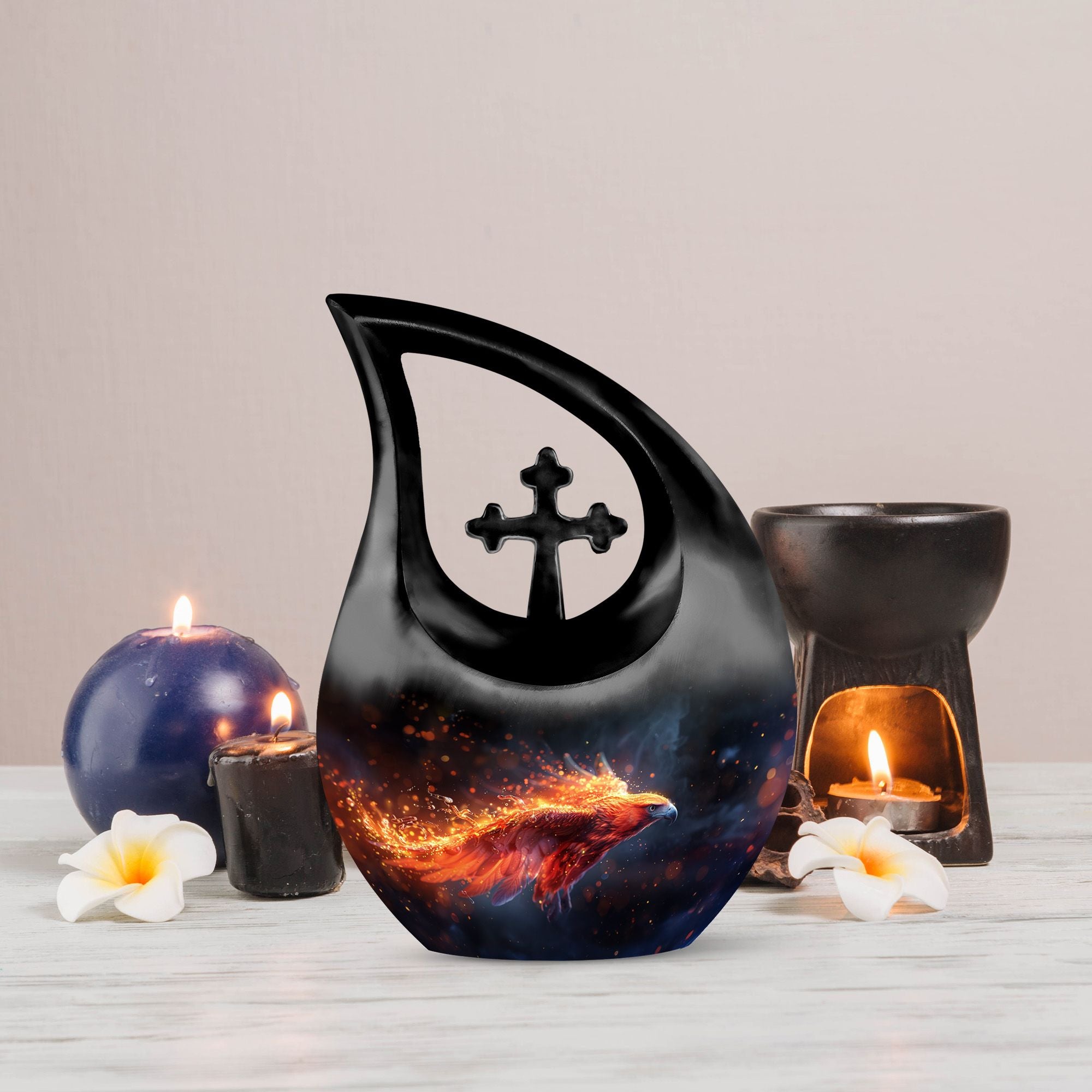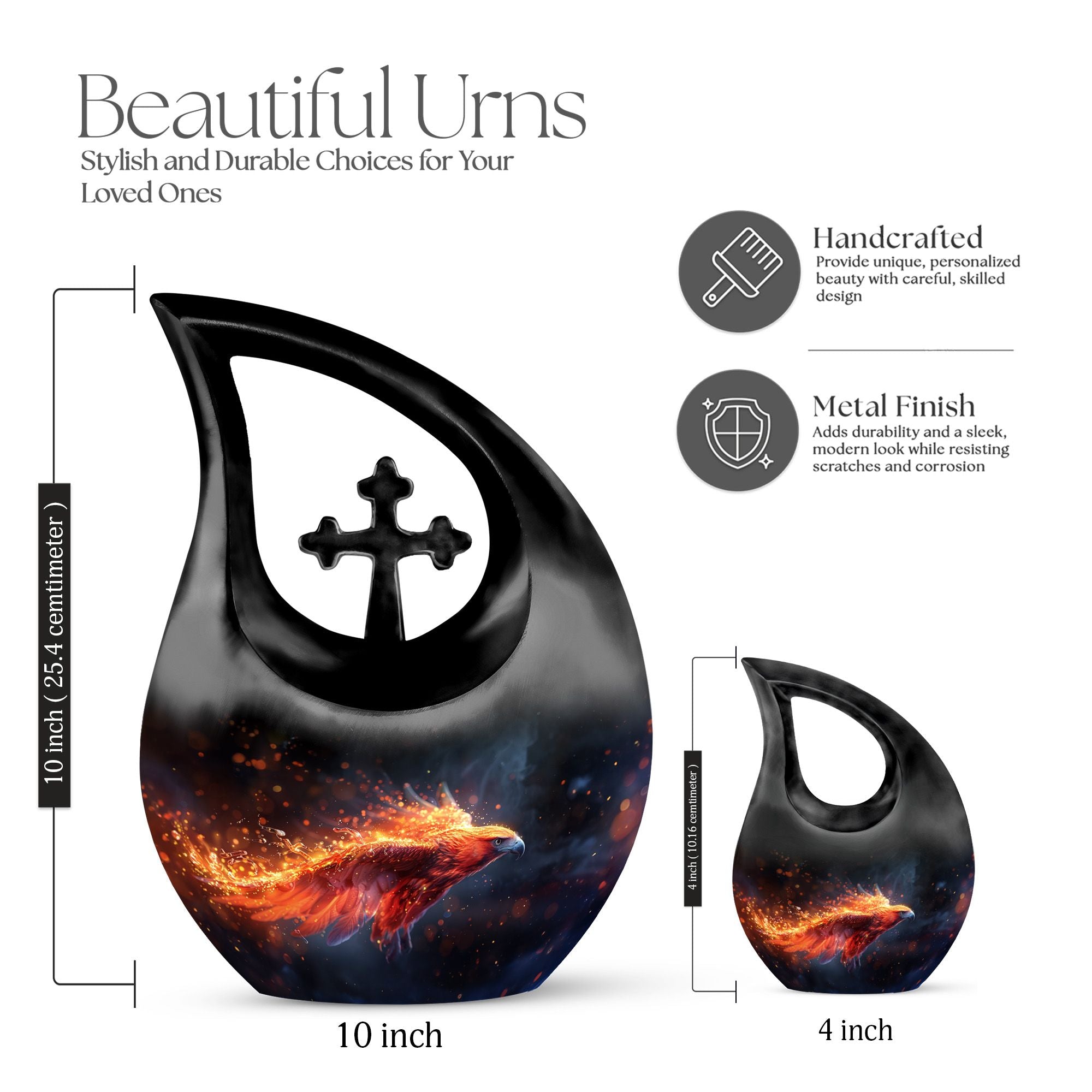 Experience the transformational symbol of resurrection through our Phoenix Rebirth Ascension Urn. This tastefully crafted 10-inch urn resonates the profound theme of rising from the ashes, symbolizing a revival of the soul. Weighing just 3.3 pounds and boasting a generous capacity of 200 cubic inches, these Small Memorial Urns ensure a generous abode for your loved one's last remains. The Cross Drop accent on the urn lends a divine touch to the Aluminum body, fostering a sense of peace and hope. Each urn comes with a velvet pouch, provided to securely contain the ashes. Add a personal touch by engraving your dear one's names on this Large Urn, making it one of a kind. This urn genuinely merges beauty, memory, and uniqueness. Unveil the essence of eternal love with our Beautiful Cremation Urns that can serve as Personalized Urns for Mom or XL urns for Human Ashes. Helps treasuring the memories forever.