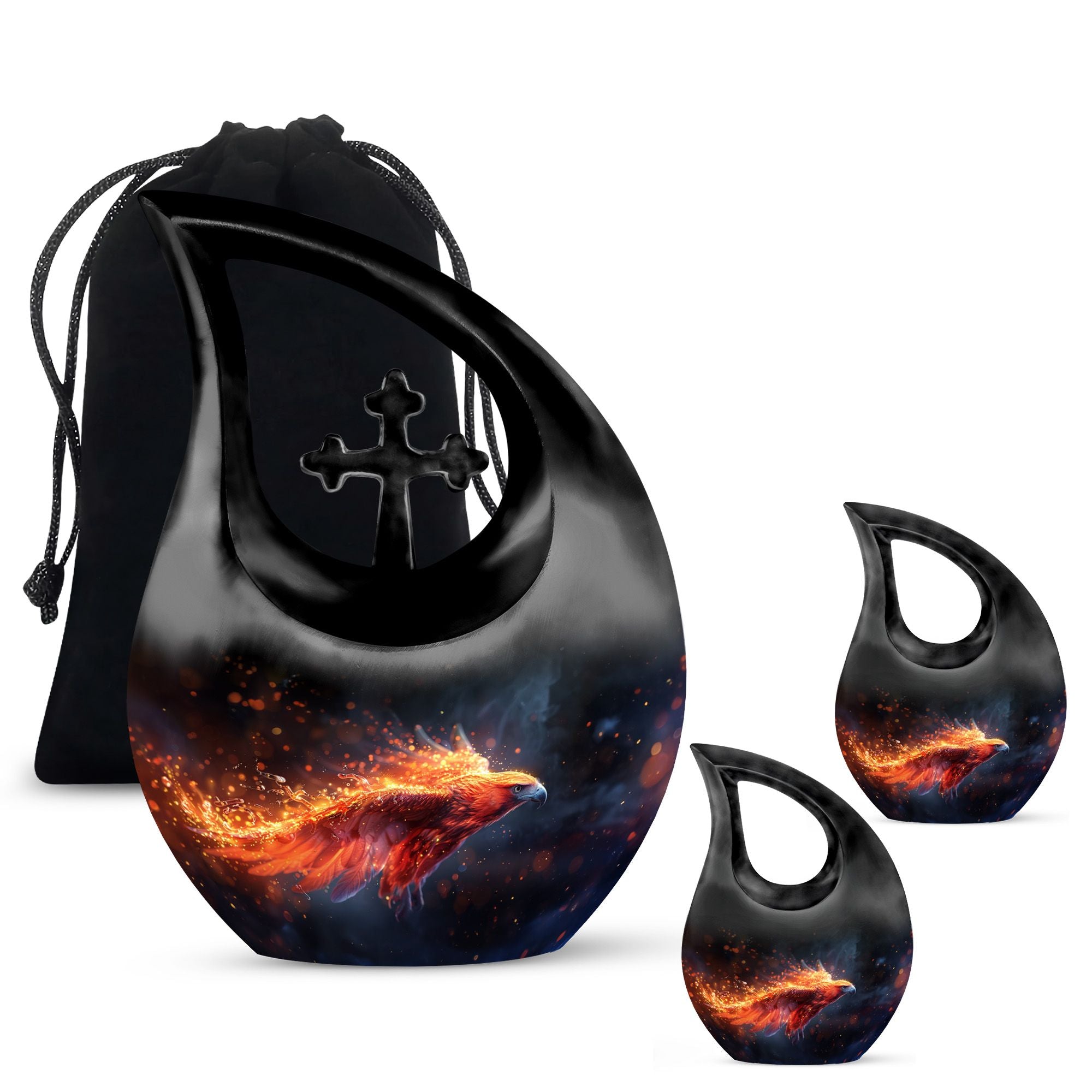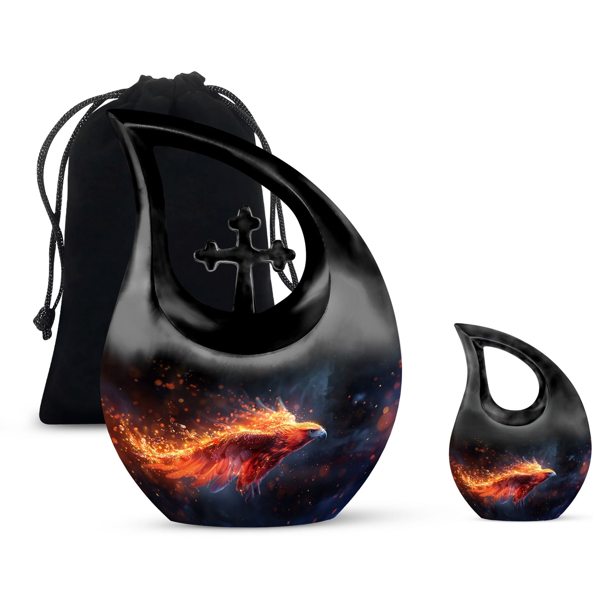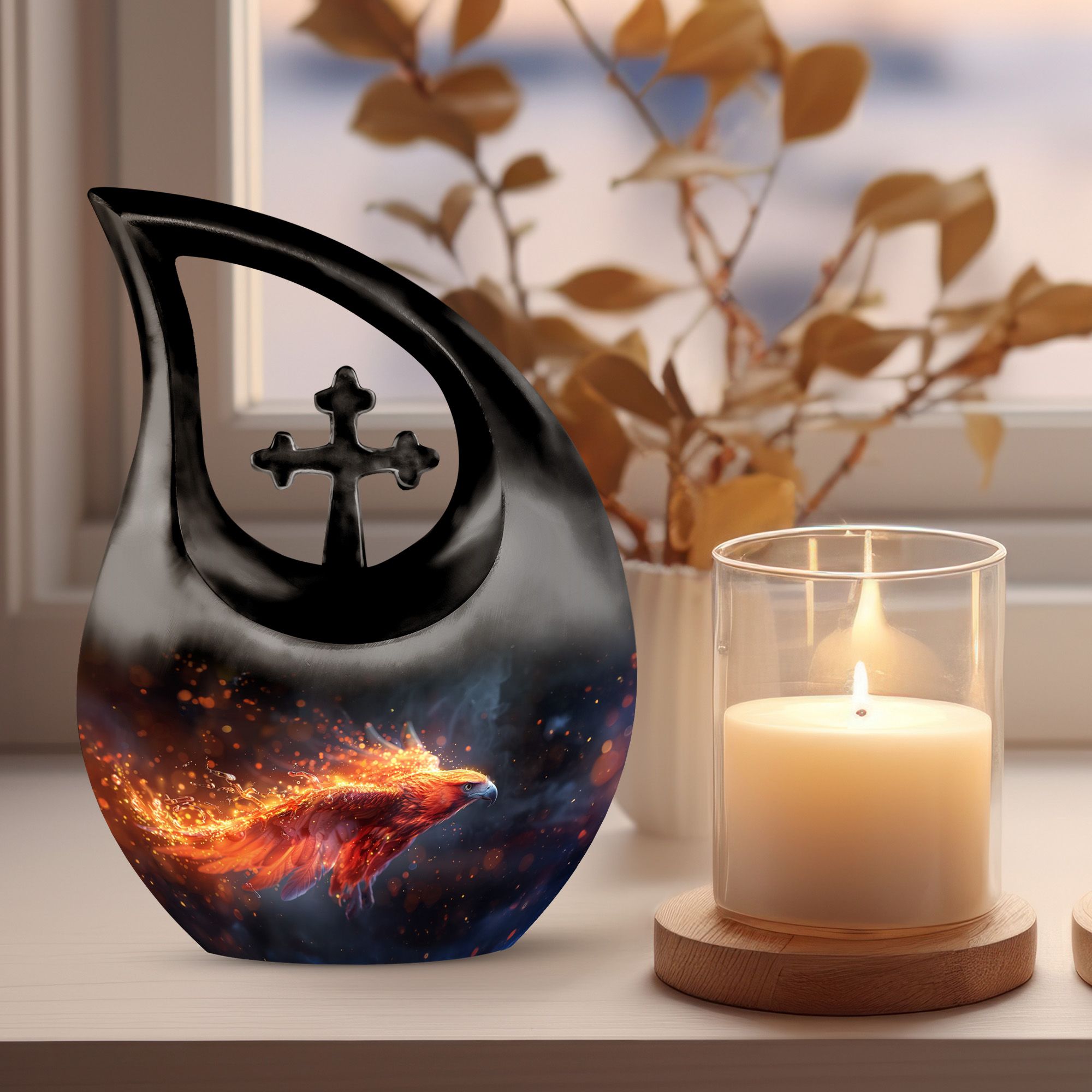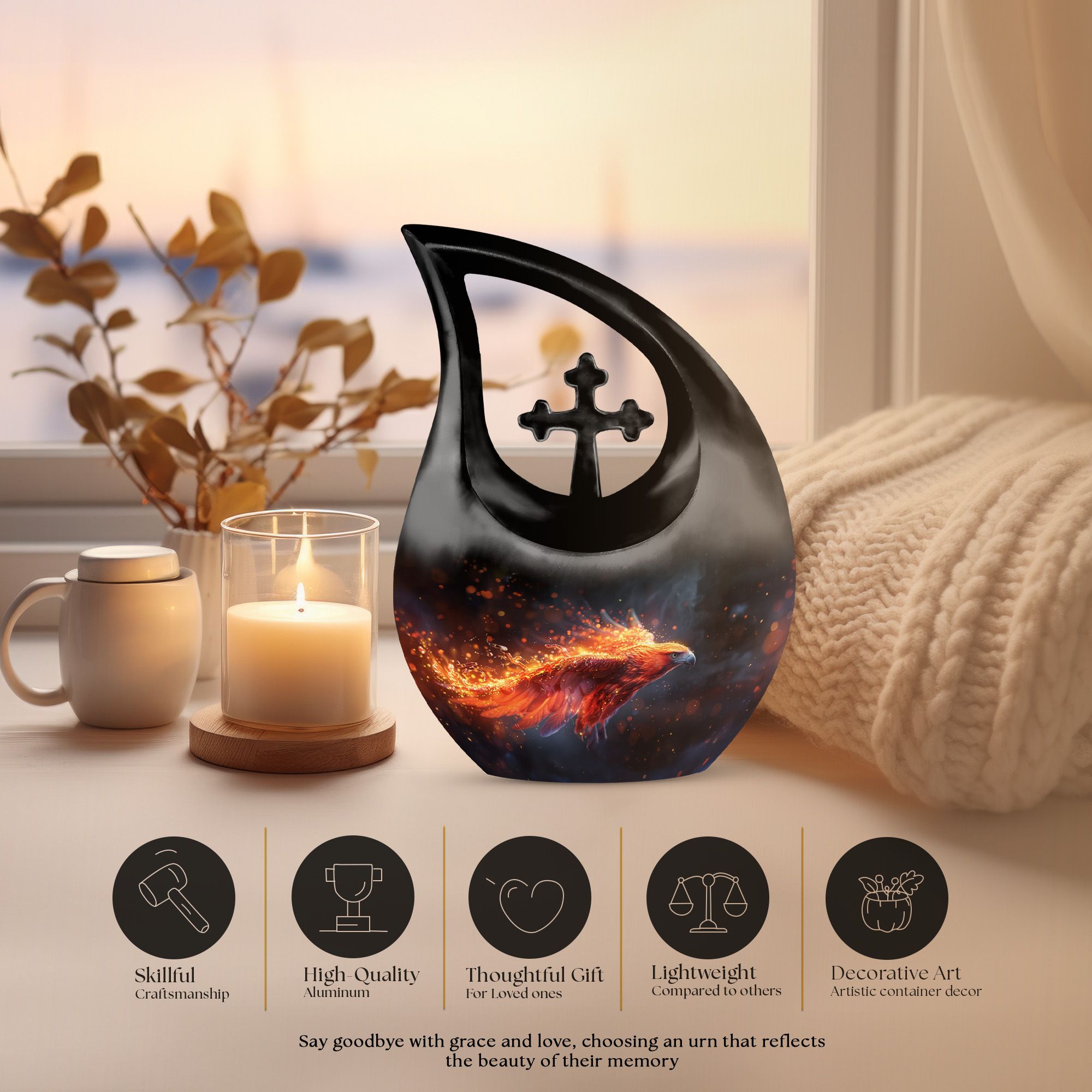 Experience the transformational symbol of resurrection through our Phoenix Rebirth Ascension Urn. This tastefully crafted 10-inch urn resonates the profound theme of rising from the ashes, symbolizing a revival of the soul. Weighing just 3.3 pounds and boasting a generous capacity of 200 cubic inches, these Small Memorial Urns ensure a generous abode for your loved one's last remains. The Cross Drop accent on the urn lends a divine touch to the Aluminum body, fostering a sense of peace and hope. Each urn comes with a velvet pouch, provided to securely contain the ashes. Add a personal touch by engraving your dear one's names on this Large Urn, making it one of a kind. This urn genuinely merges beauty, memory, and uniqueness. Unveil the essence of eternal love with our Beautiful Cremation Urns that can serve as Personalized Urns for Mom or XL urns for Human Ashes. Helps treasuring the memories forever.