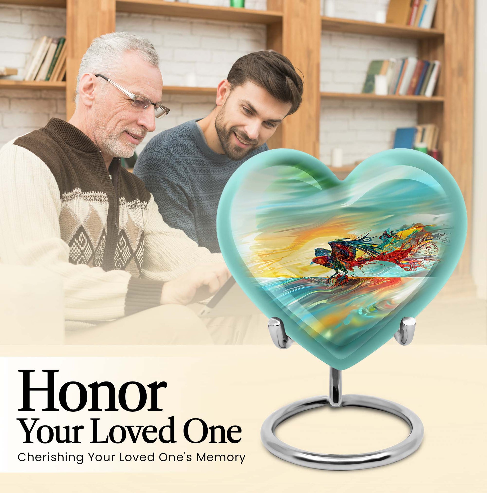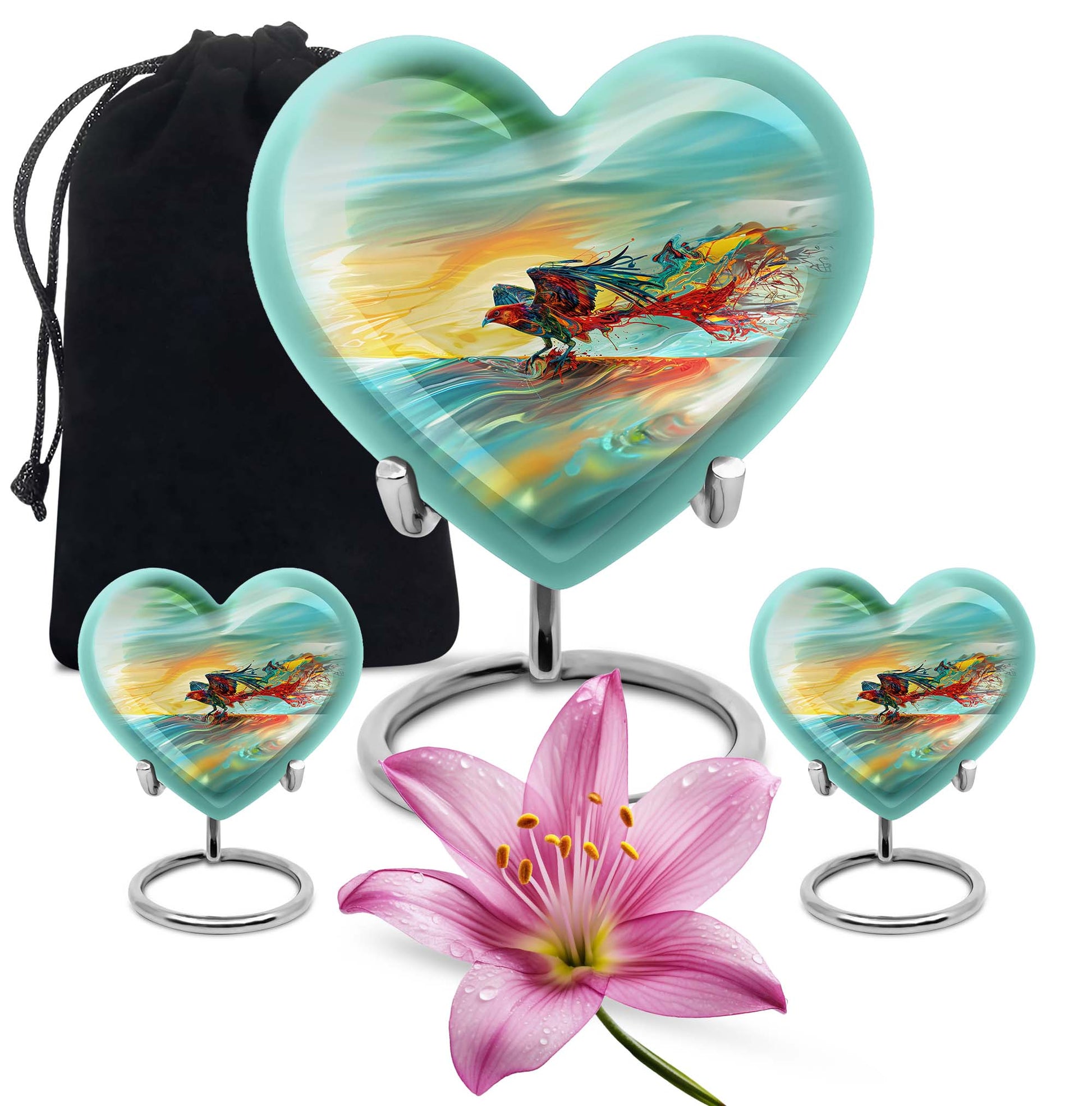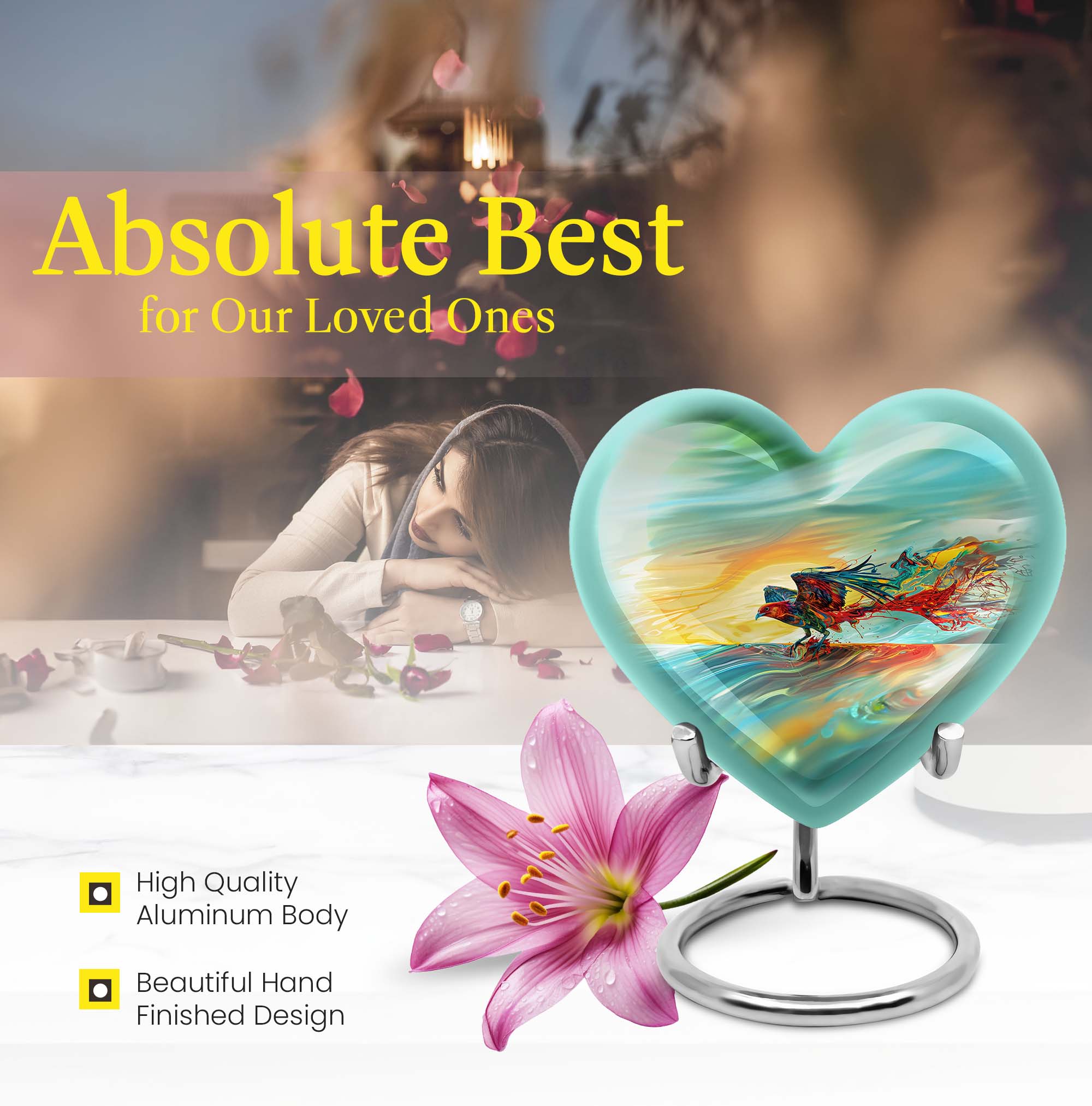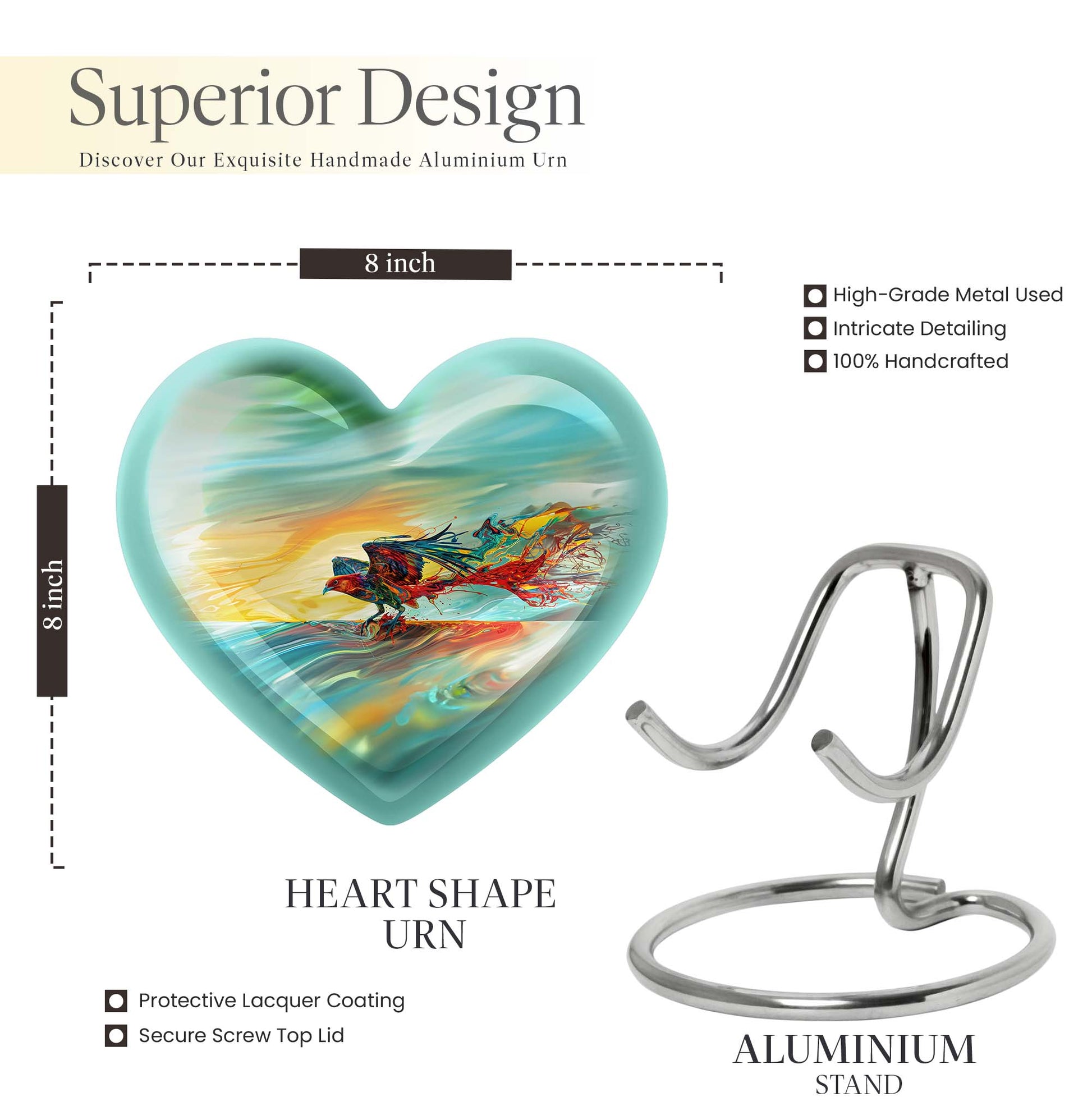 Discover the profound embodiment of a loving tribute with our uniquely heart-themed, large-sized Phoenix Urn. Standing at 10 inches and crafted meticulously with durable aluminium, this cremation urn has an impressive 200 cubic inches capacity. Its weight, a significant 3.3 pounds, is representative of its quality and sturdiness. With a striking abstract theme, the urn does more than just hold ashes; it's a masterpiece of remembrance. It comes with a soft velvet pouch used for the containment of your cherished one's ashes, ensuring they remain respectfully preserved. The urn allows for personalization with engraved names, adding a touch of individuality and intimate memory to this dignified vessel. This urn is ideal for those in search of funeral ashes urns or large cremation urns aimed for men. Capture the essence of a life well-lived and love unending as this cremation urn becomes a gentle reminder of the spirit that shared your life's journey.