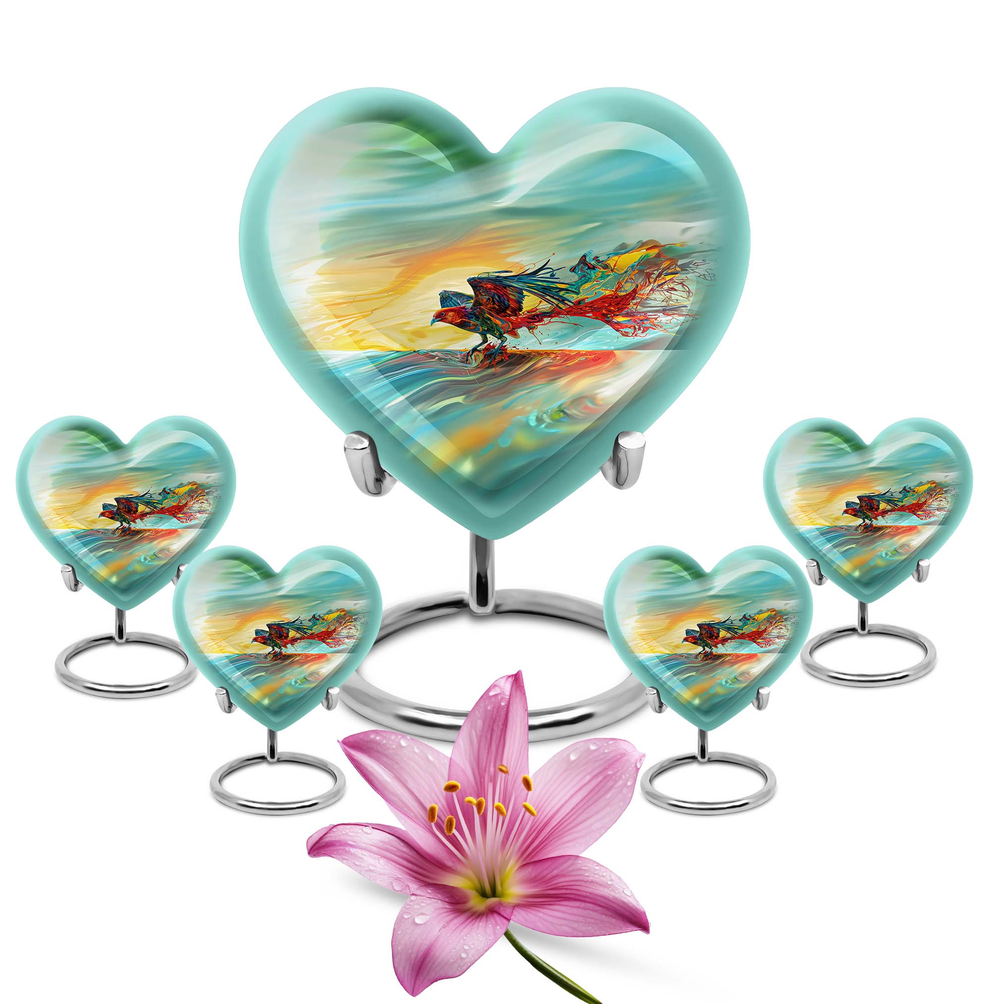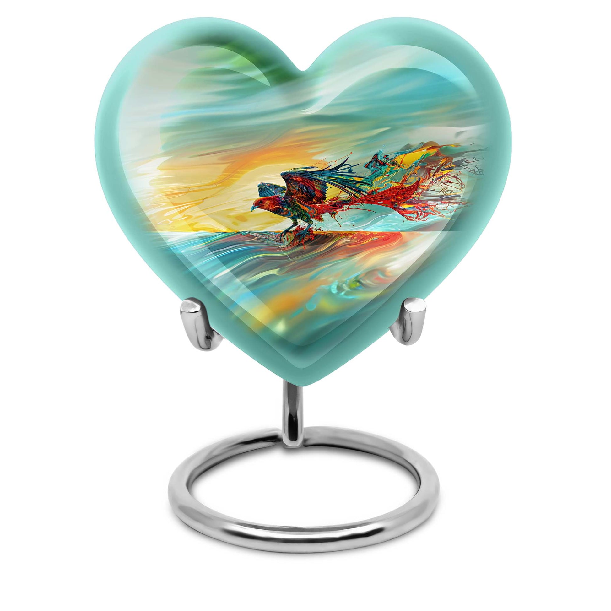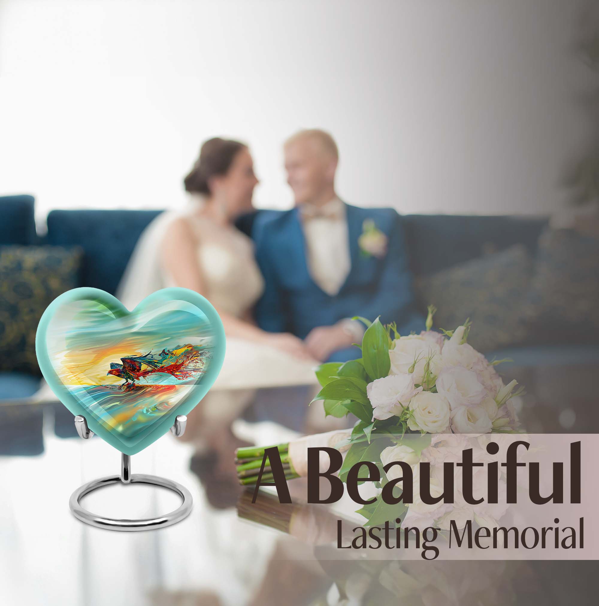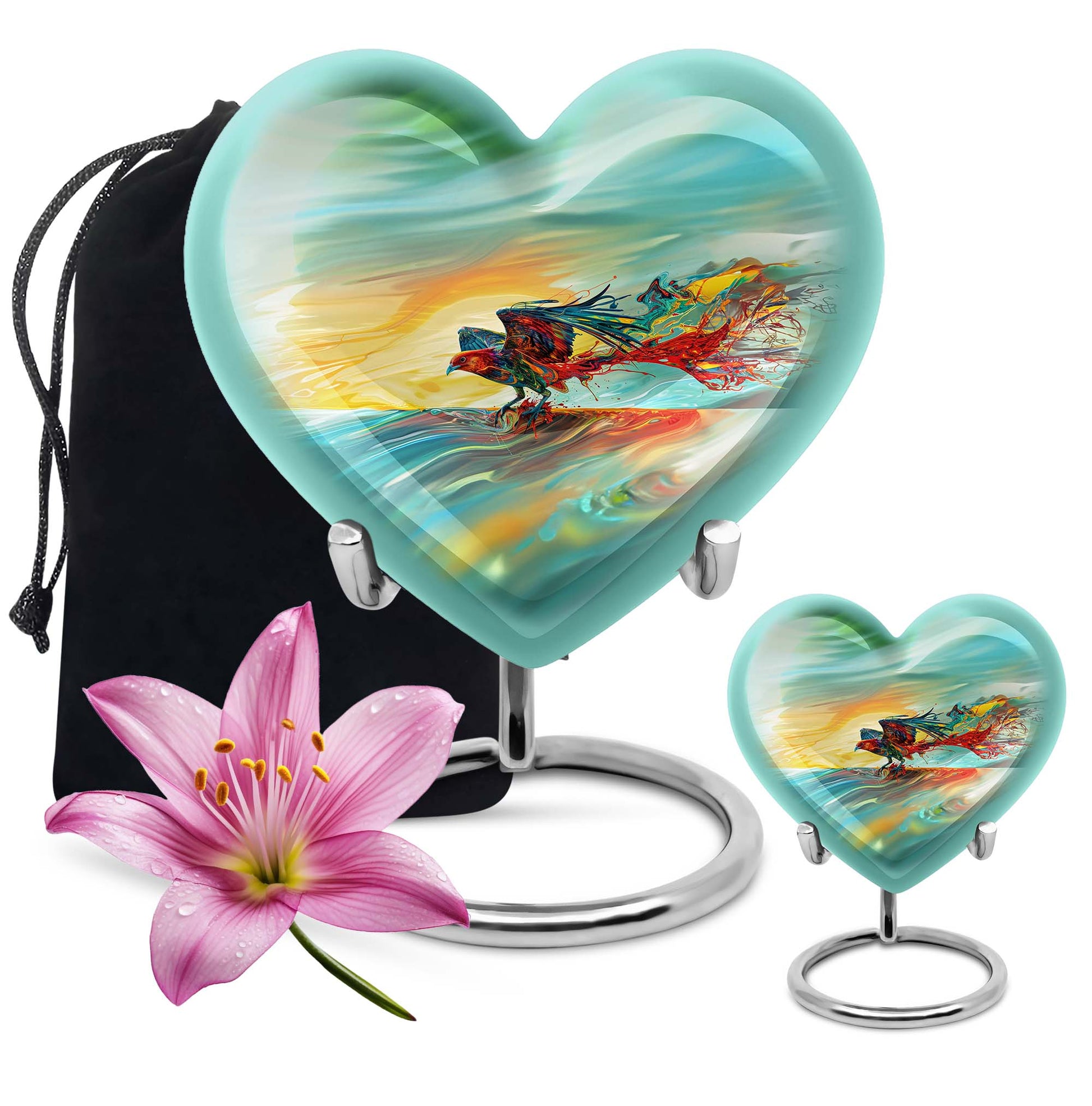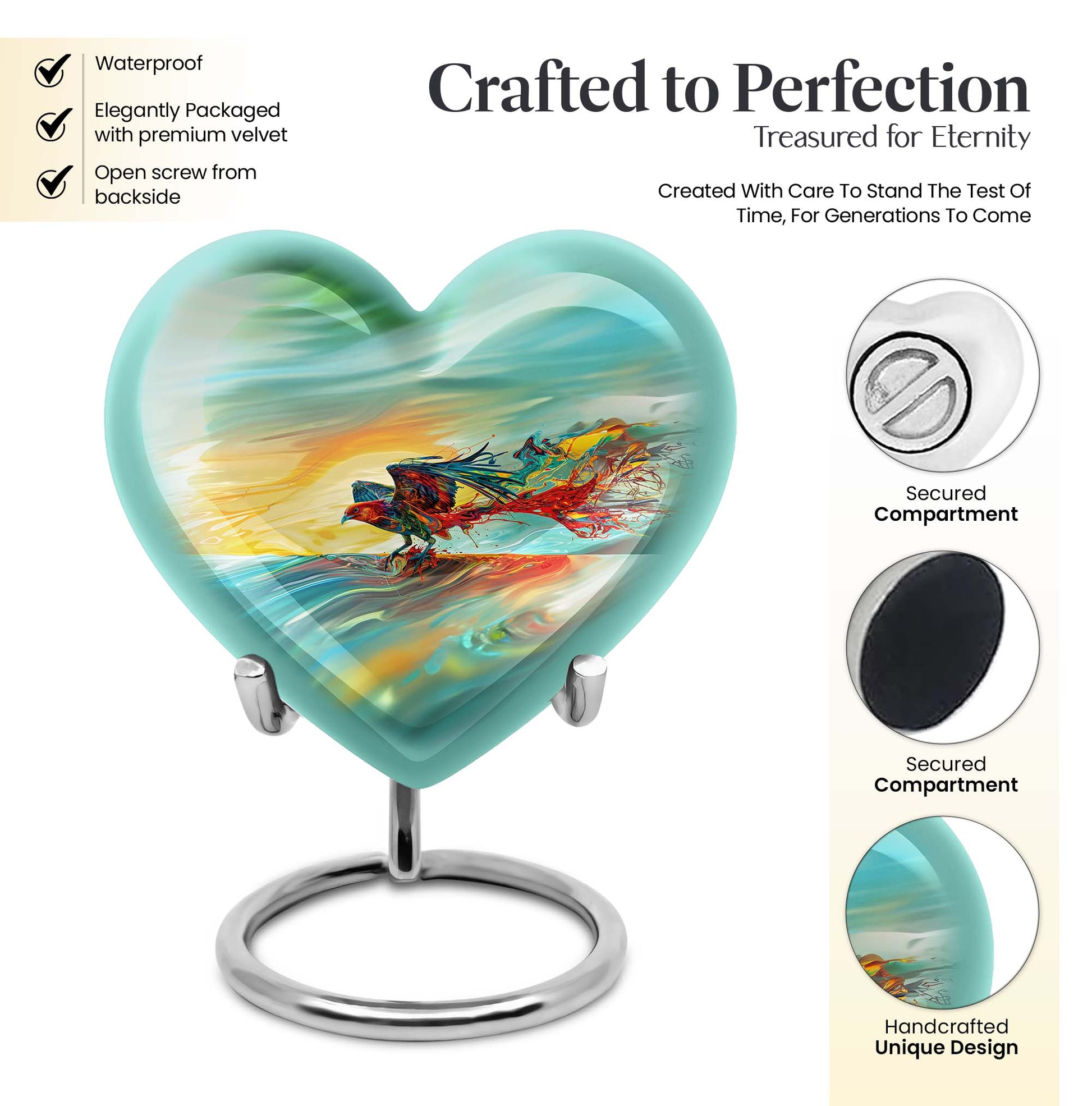 Discover the profound embodiment of a loving tribute with our uniquely heart-themed, large-sized Phoenix Urn. Standing at 10 inches and crafted meticulously with durable aluminium, this cremation urn has an impressive 200 cubic inches capacity. Its weight, a significant 3.3 pounds, is representative of its quality and sturdiness. With a striking abstract theme, the urn does more than just hold ashes; it's a masterpiece of remembrance. It comes with a soft velvet pouch used for the containment of your cherished one's ashes, ensuring they remain respectfully preserved. The urn allows for personalization with engraved names, adding a touch of individuality and intimate memory to this dignified vessel. This urn is ideal for those in search of funeral ashes urns or large cremation urns aimed for men. Capture the essence of a life well-lived and love unending as this cremation urn becomes a gentle reminder of the spirit that shared your life's journey.