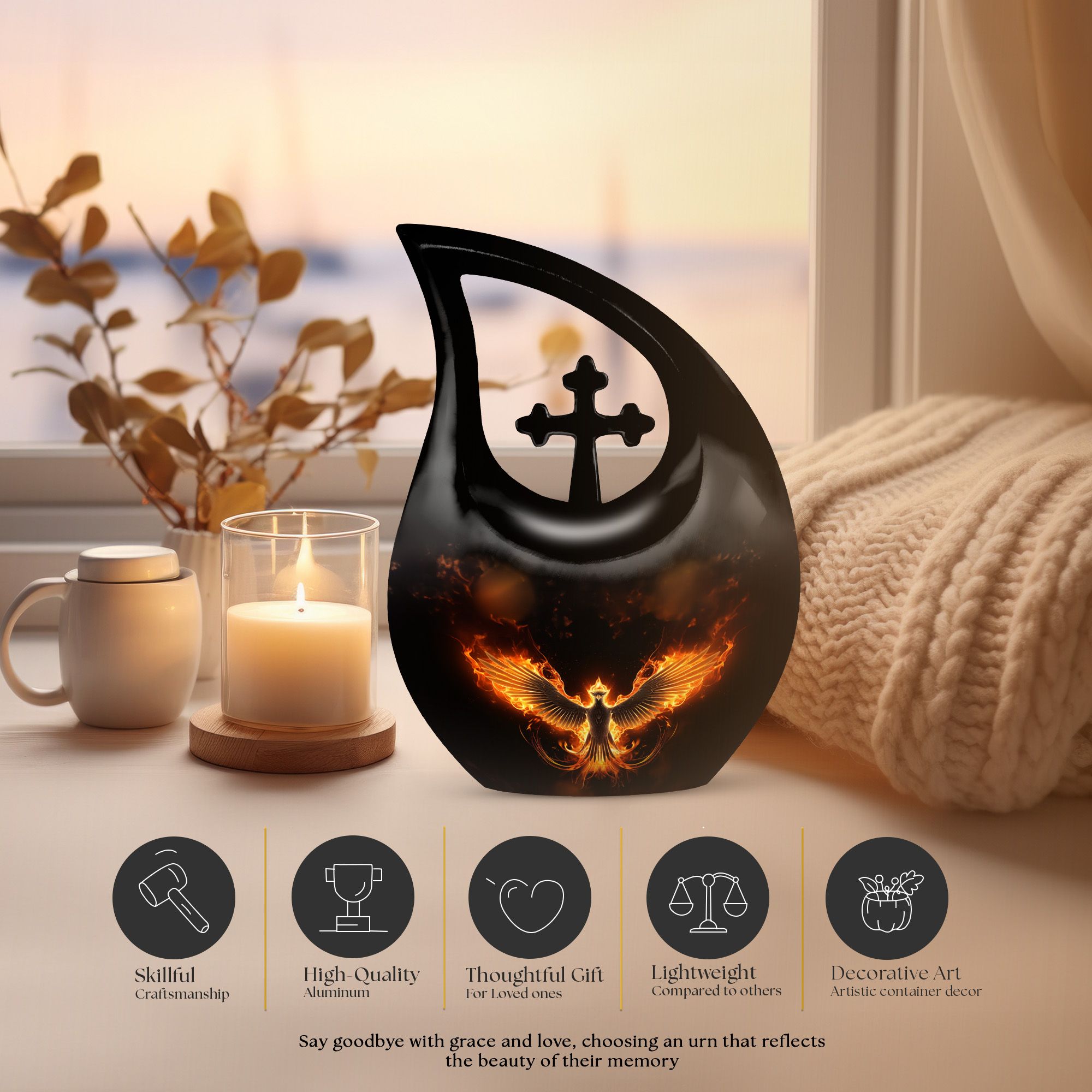 Expertly crafted from durable aluminum, this adult cremation urn features a smooth black finish that highlights the vivid phoenix artwork — symbolizing rebirth and eternal connection. Its secure, threaded lid ensures lasting protection, while the elegant teardrop form enhances any memorial display. Whether chosen as a human cremation urn or part of a cremation urns set, it embodies strength, comfort, and timeless artistry.