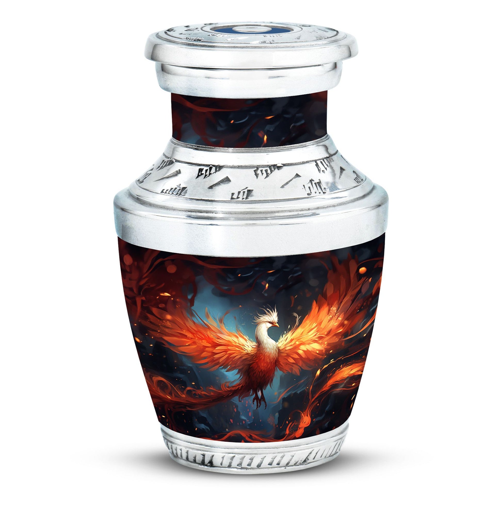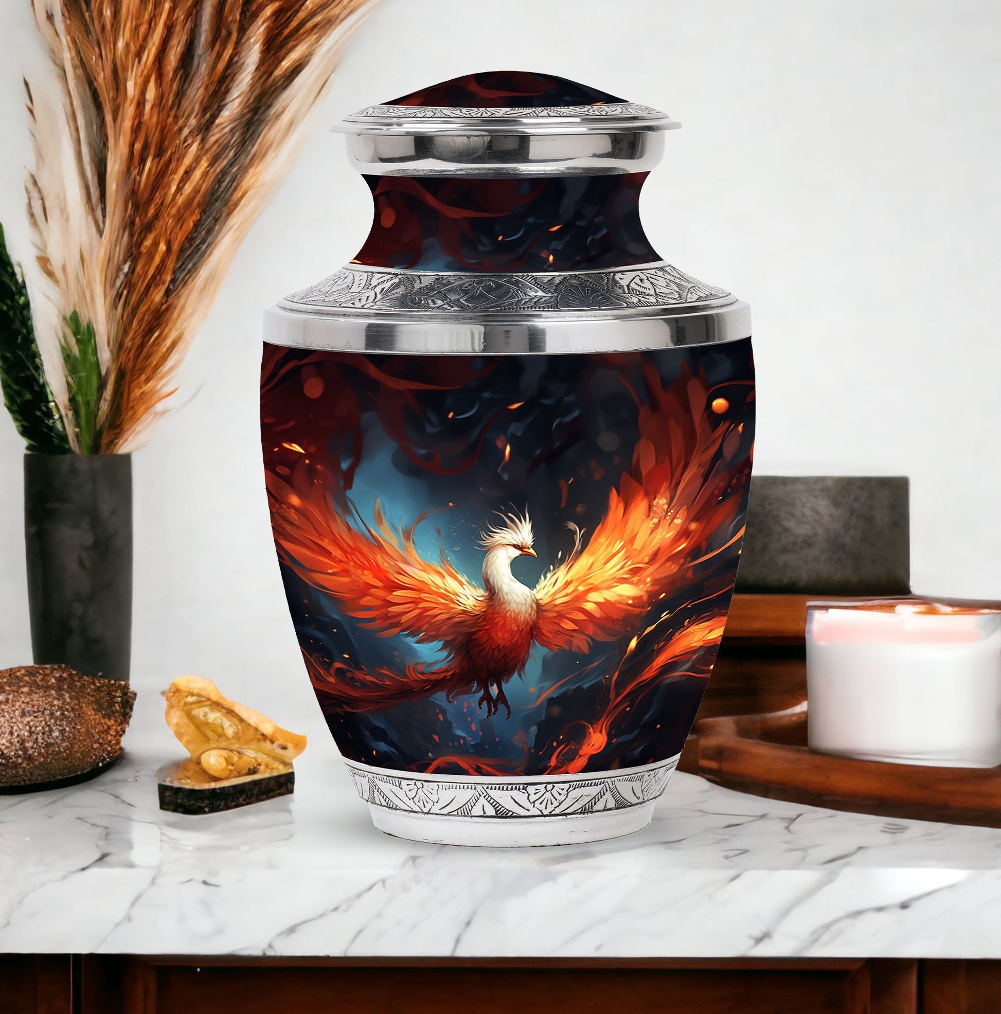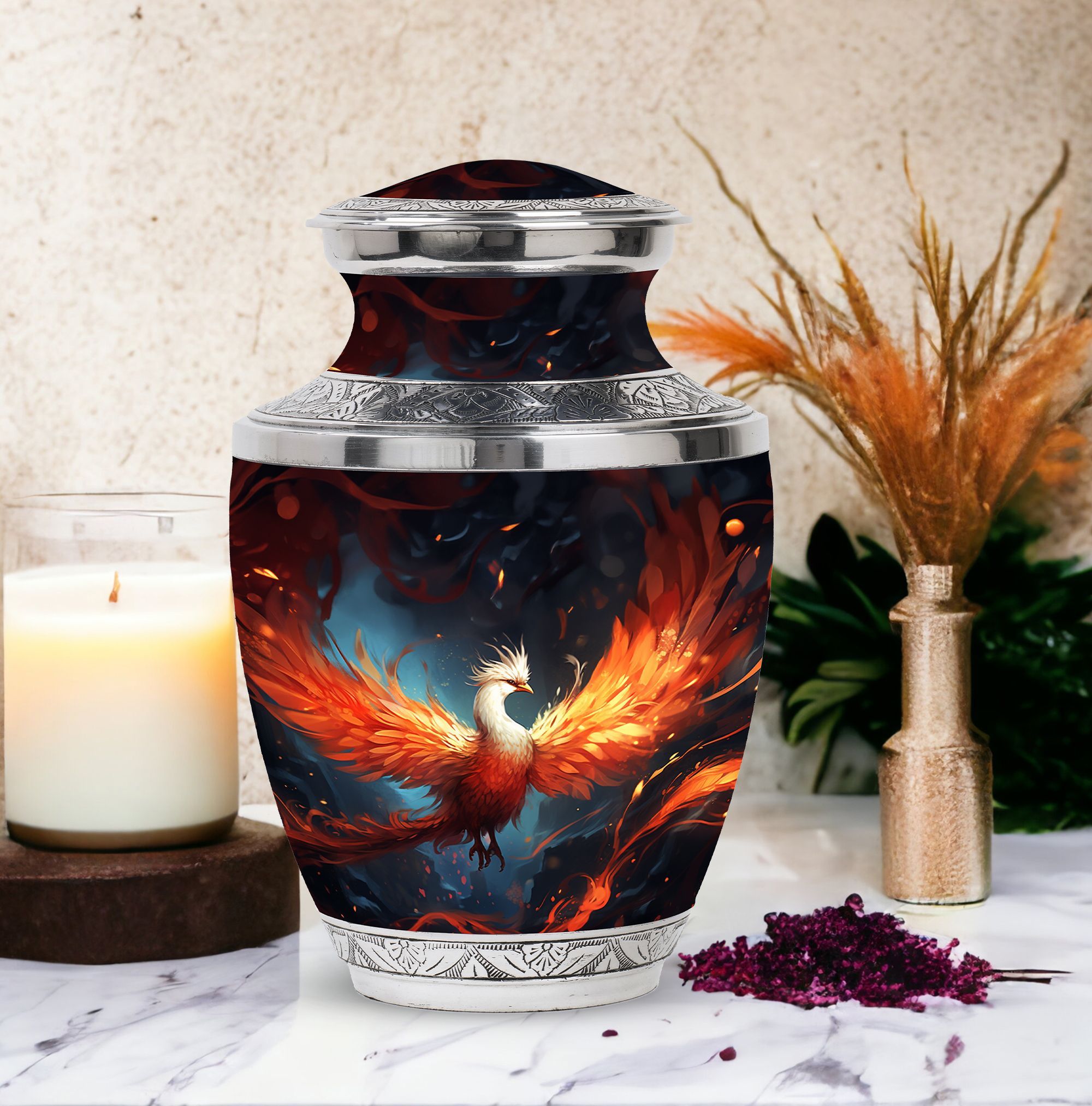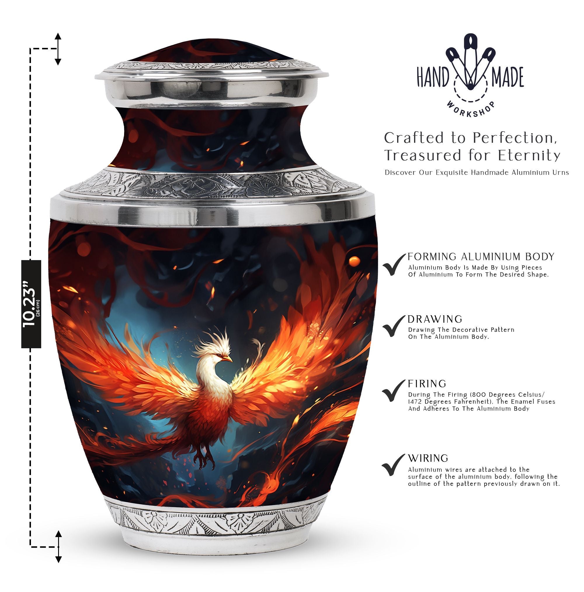Cherish the memory of your loved ones with our White Phoenix Cremation Urn, a precious holder designed for sacred ceremonies. This large urn stands 10 inches in height and features a durable aluminium construction. Its weight, at 3.3 pounds, provides a substantial, sturdy feel and its 200 cubic inches capacity makes it a thoughtful solution to honor your loved ones. Though Classic in design, it refrains from ordinary with its unique touch of modernity. As one of the leading large urns in the market, it satisfies the needs of adults and seniors seeking comfort in memorial rituals. It arrives with a gentle velvet pouch for secure containment of ashes. Excellent for personalizing, you can engrave names on it - a heartfelt expression in your journey of remembrance. This urn belongs among your cherished memorial ceremony supplies. While it is primarily known as a human cremation urn, it also captures attention as an ashes holder and a burial urn. Its elegance and charm make it a stand-out selection in an array of modern urns for human ashes.