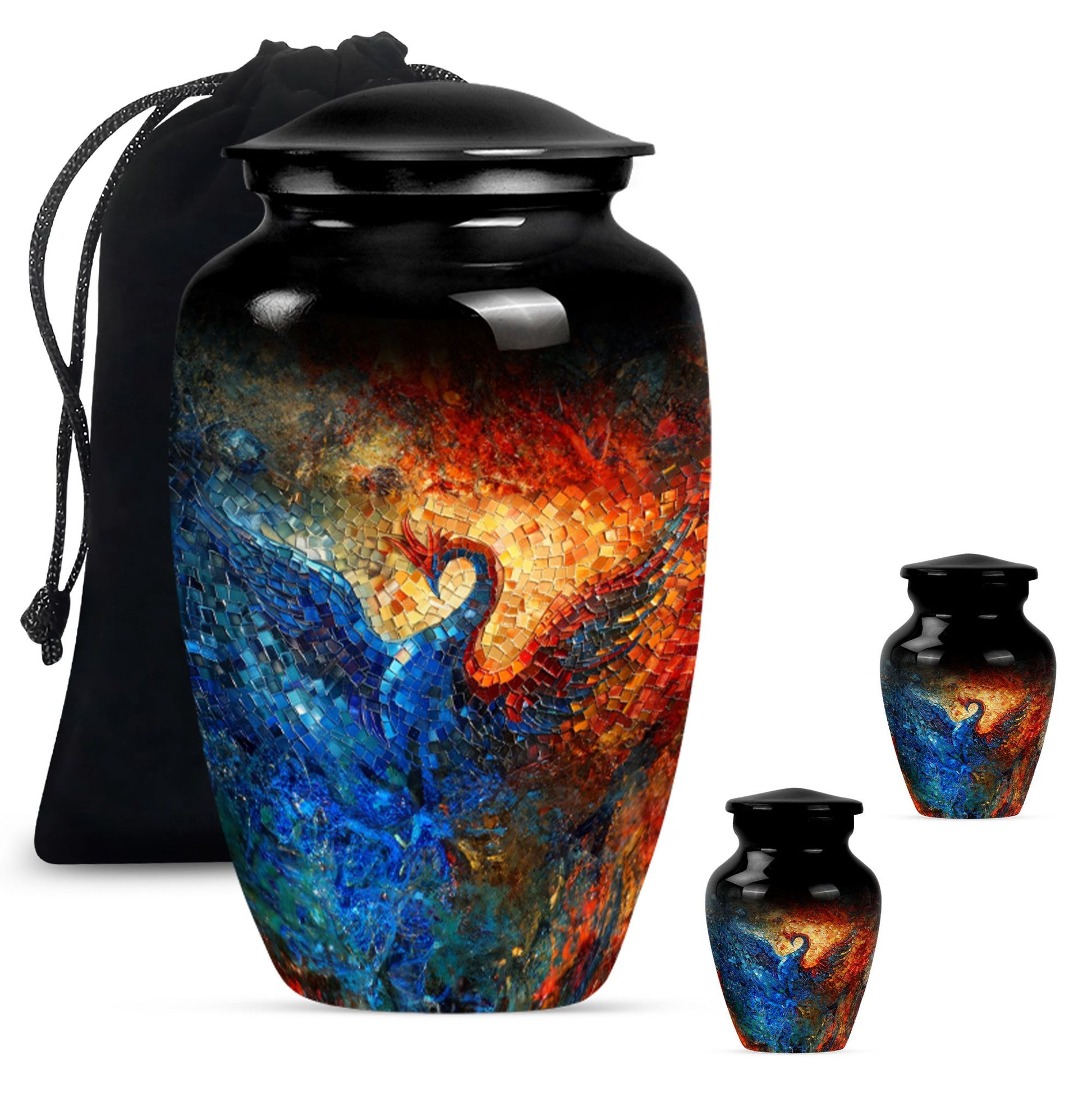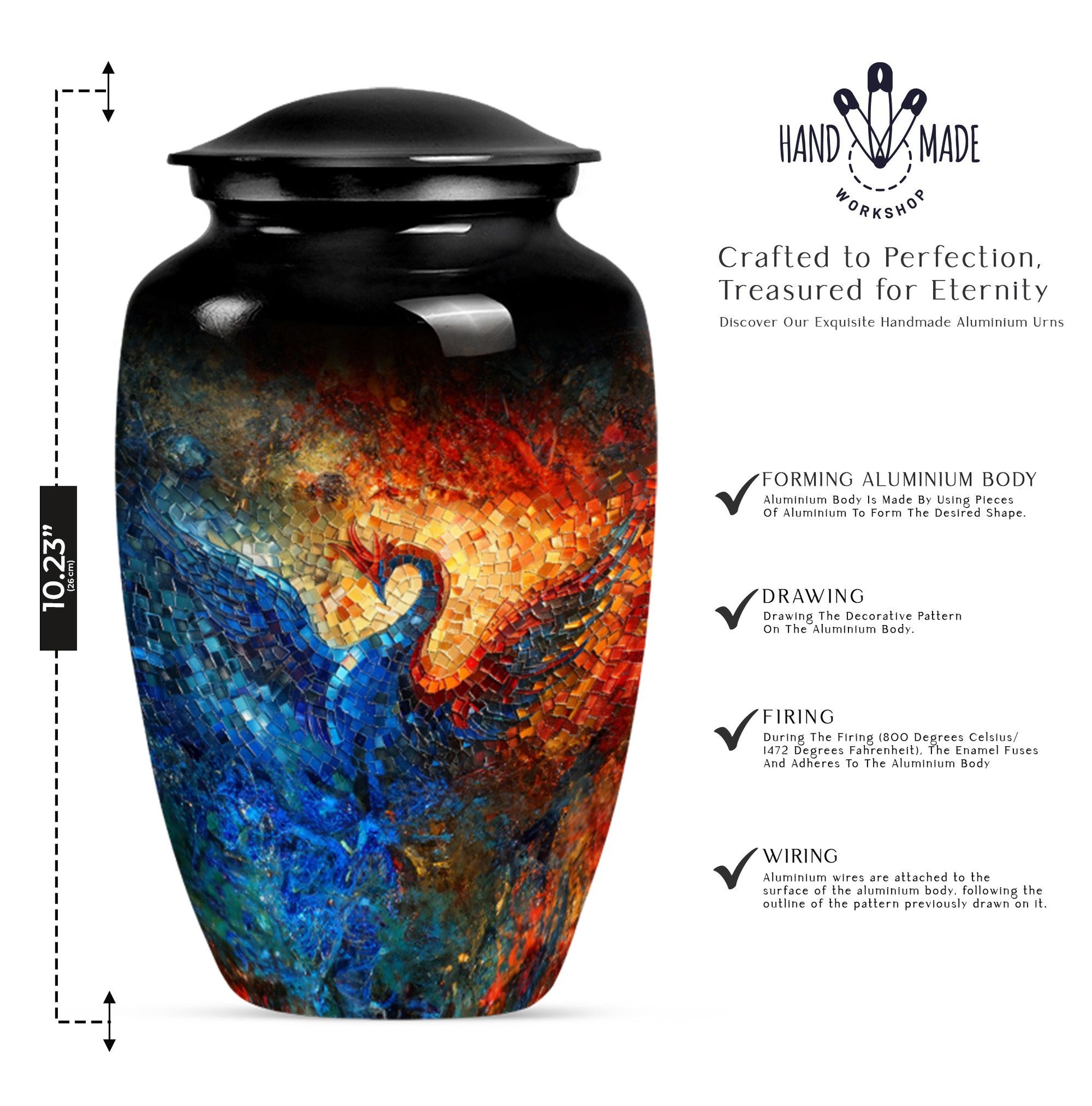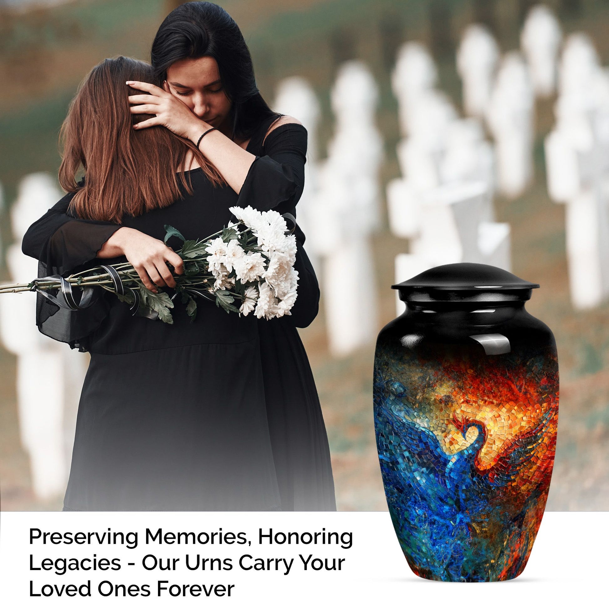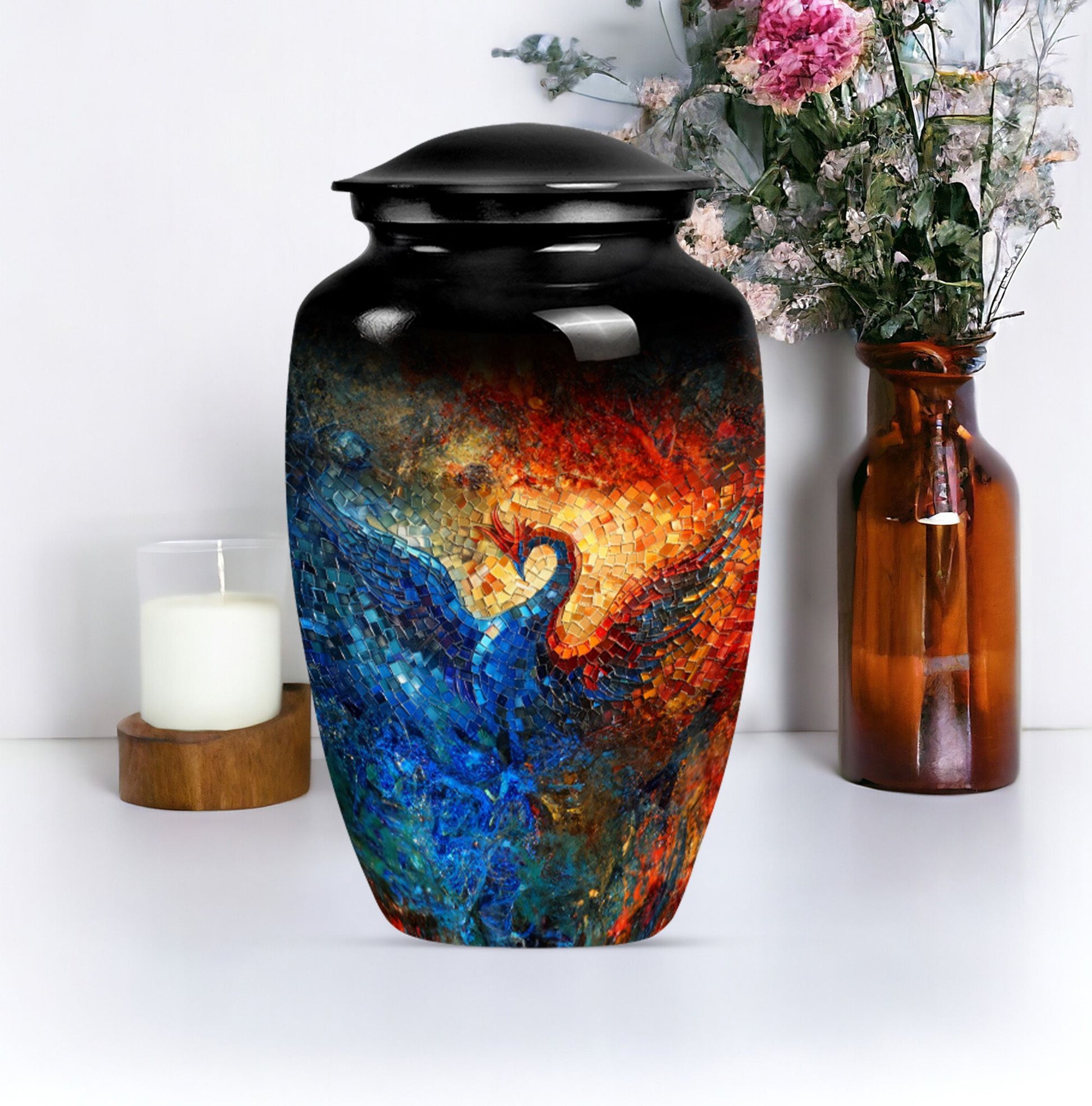 Honor and celebrate the life of your departed loved one with our resplendent Phoenix Urn. This memorial urn for an adult male is beautifully crafted from quality aluminium, offering solidity and longevity. With a convenient size of 10 inches and a weight of a mere 3.3 pounds, the urn is designed to seamlessly fit into your home or columbarium niche. Our Phoenix Urn is one of the elegant large urns with a 200 cubic inch capacity, sufficient space to honor the memory of an adult. Packaged with a velvet pouch, it serves a dual purpose, allowing for dignified containment and easing transportation of ashes. With an abstract theme, it subtly communicates respect and long-lasting admiration. Another remarkable feature is the urn's customization option - personalize with engraved names for an intimate touch. This cremation urn serves as both a repository for your loved one’s ashes and as a beautiful, timeless keepsake. This product is ideal if you're seeking funeral medium-sized urns for human ashes, for a human urn adult, or companion cremation urns for 2 adults. Easy to handle, durable, and sophisticated, the Phoenix Urn is a touching tribute to cherished memories and everlasting bonds.