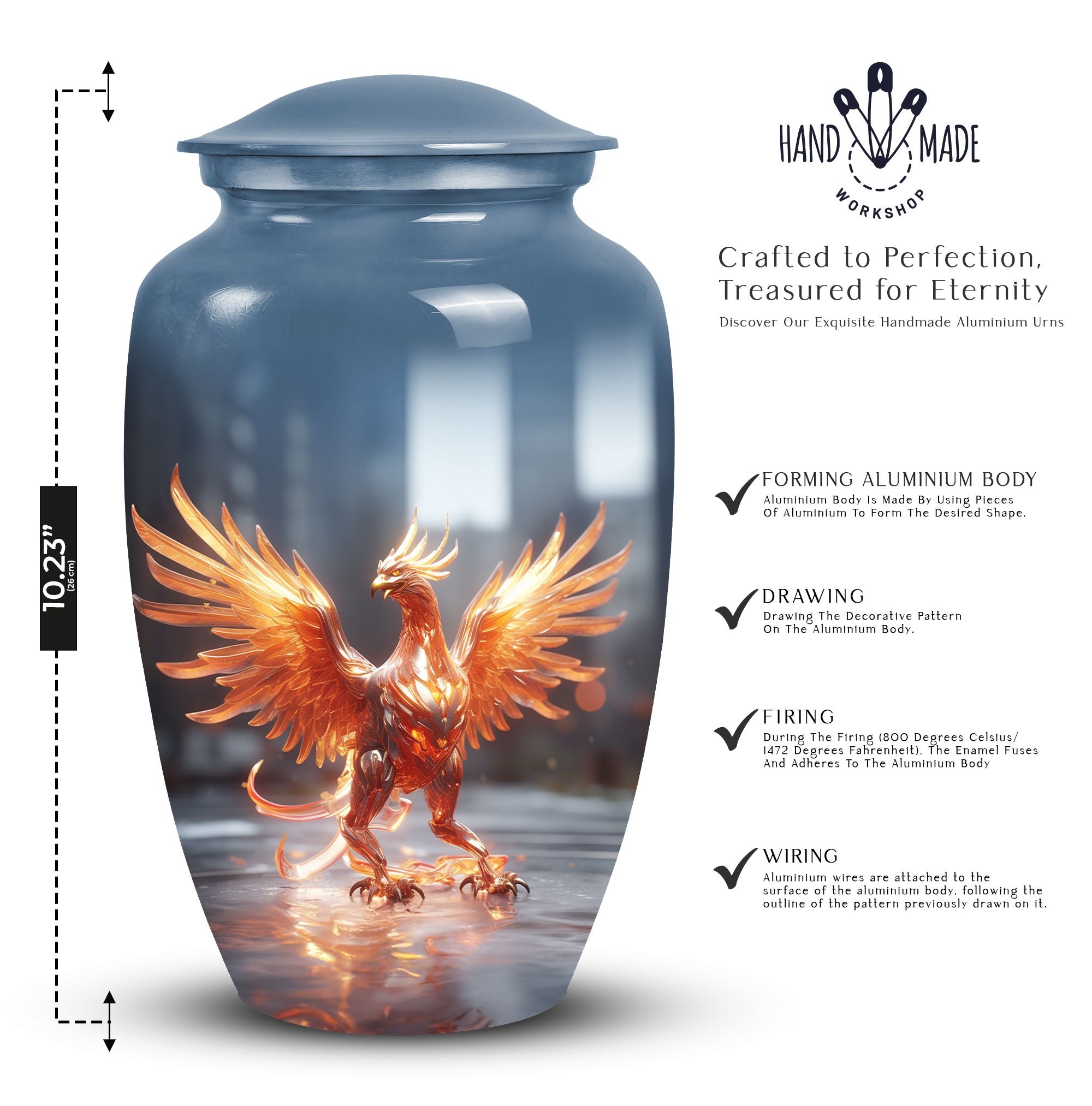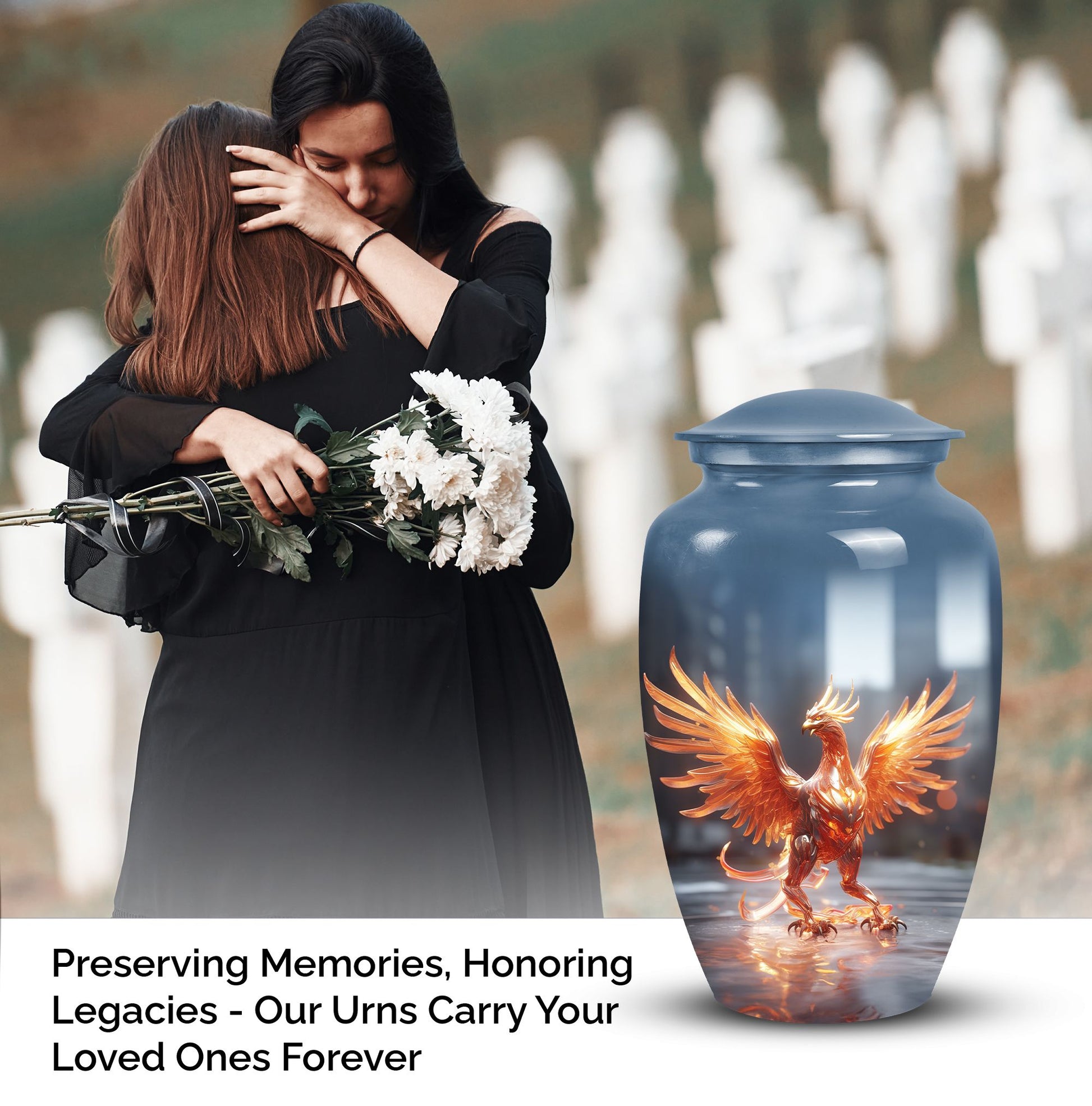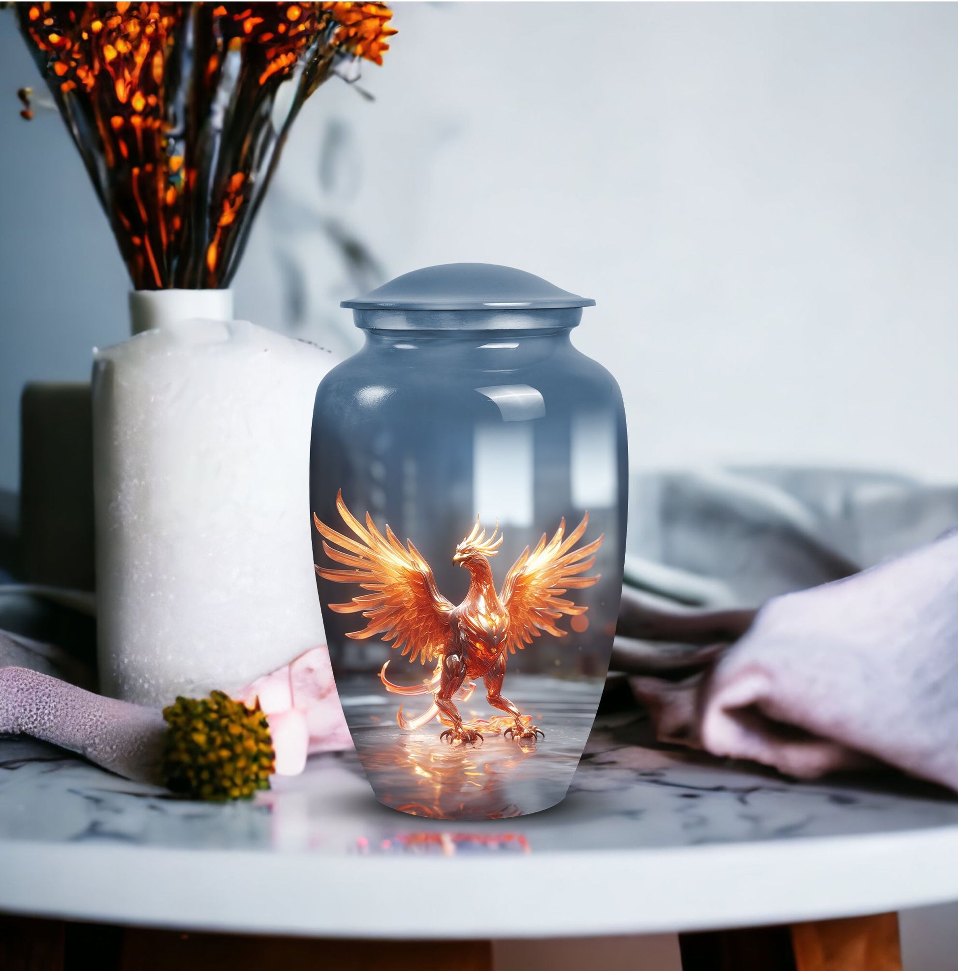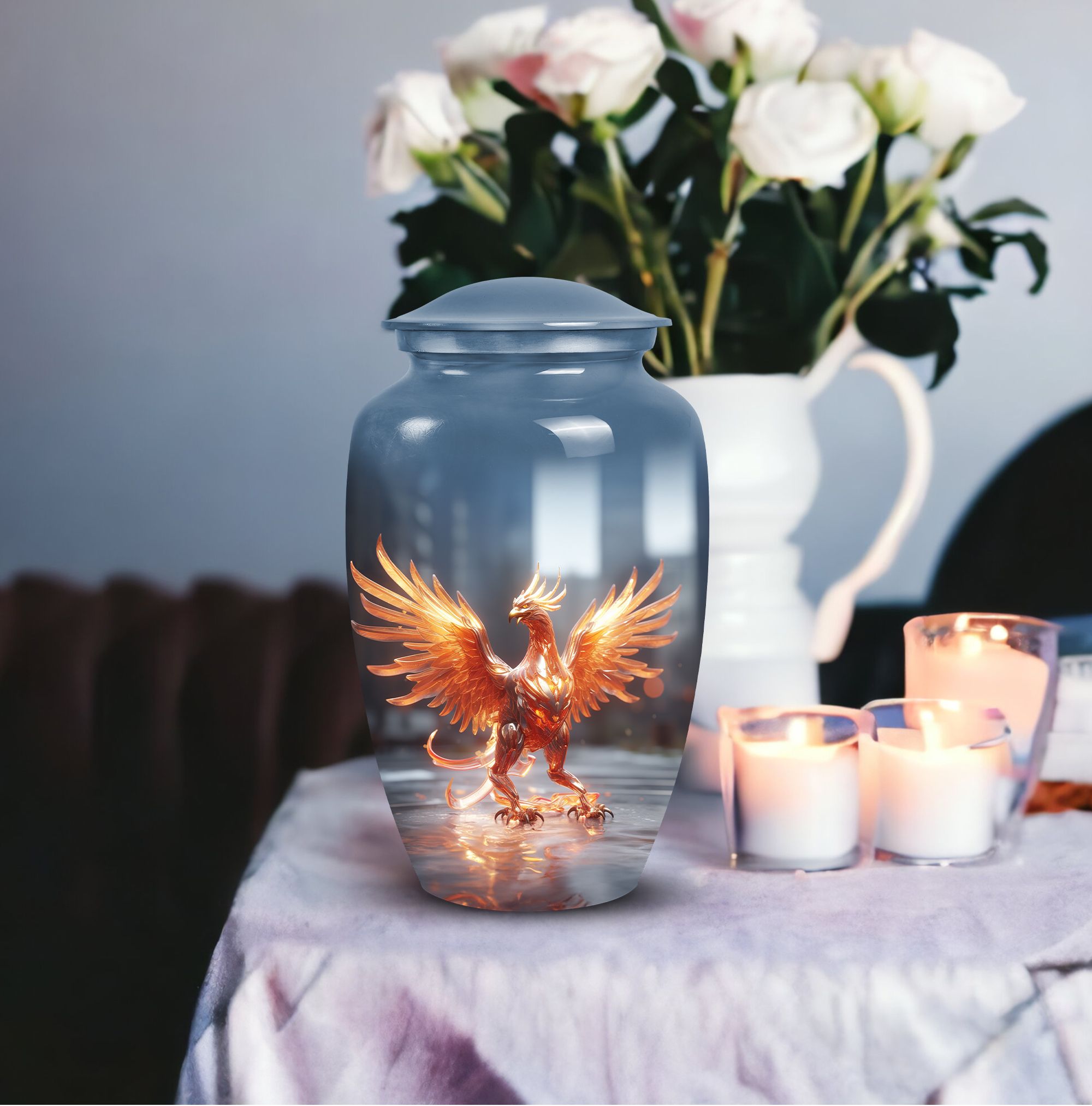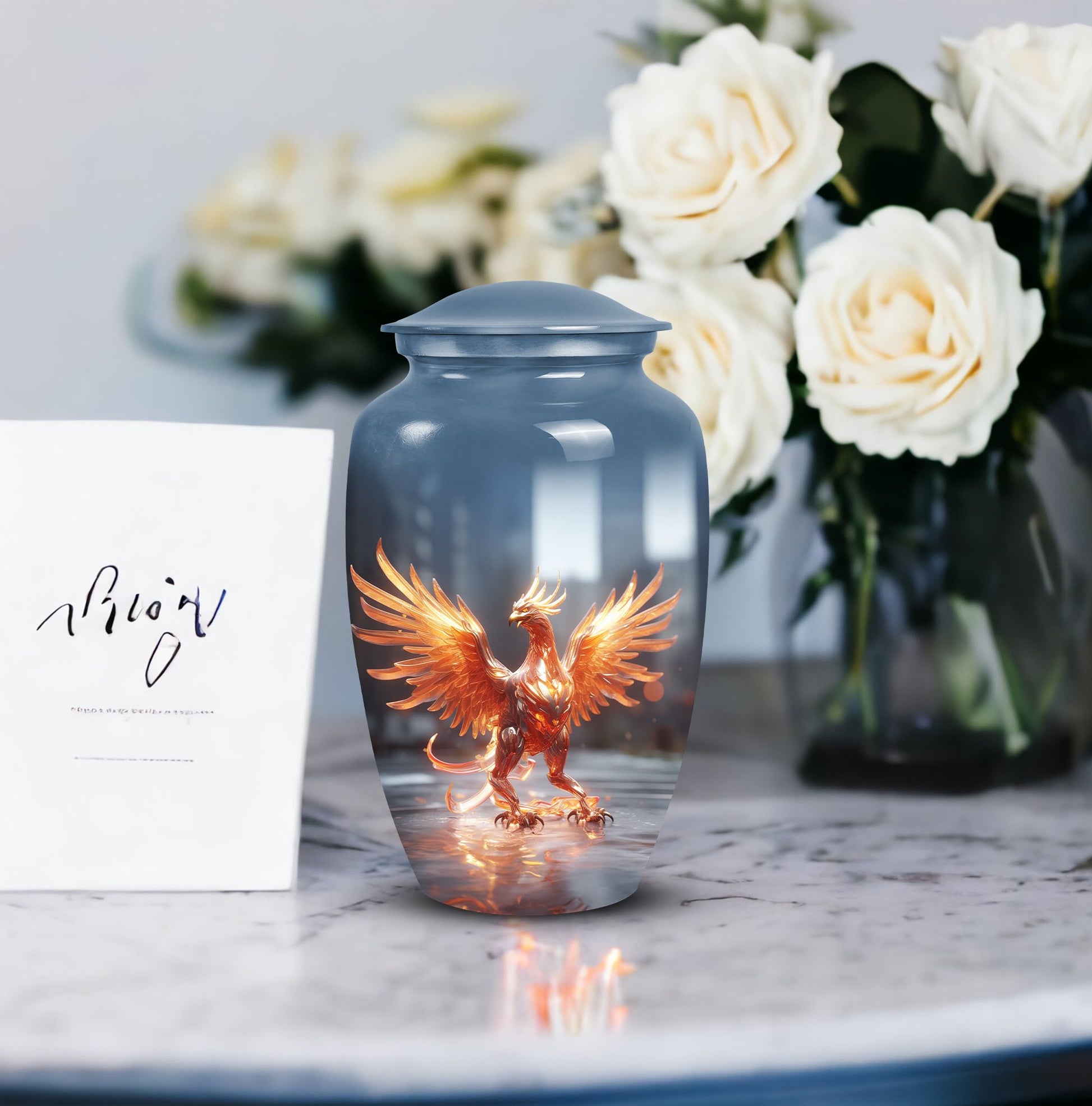 Introducing our phoenix urn - an impeccable tribute to your cherished departed. This first-rate, masterfully handcrafted decorative urn is not only an honorable vessel for precious ashes but also an embodiment of love, reverence, and transitory life. Its symbolic phoenix figure articulates the cycle of birth, death, and rebirth, offering solace through profound metaphysical insight. Designed for adults, our urn has the capacity to securely hold ashes while enhancing the commemorative decor due to its elegant aesthetic. Particularly, this piece is well-suited for women who value distinctive and soulful details during memorial ceremonies. As a physical manifestation of perpetual affection, it serves as a comforting presence during mourning. Distinguishing itself among typical funeral decorations, our phoenix urn aligns with the dignity and the bespoke preferences linked to the journey beyond. This item does not merely offer a resting place but also transcends as a beautiful tribute to the resplendence of life and the optimism of birth after death. With our burial urn, honor the memory of your loved one with grace, style, and respect.