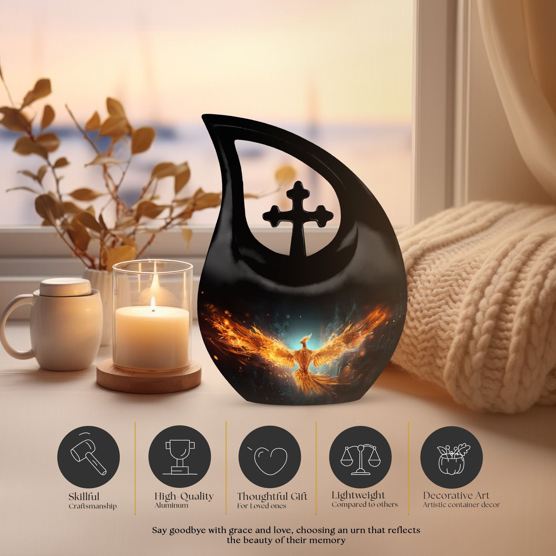 The luminous golden phoenix symbolizes eternal renewal — a reminder that love and light live on beyond the ashes. This cremation ashes urn stands as both a beautiful keepsake and a heartfelt expression of remembrance, honoring a life that continues to shine.