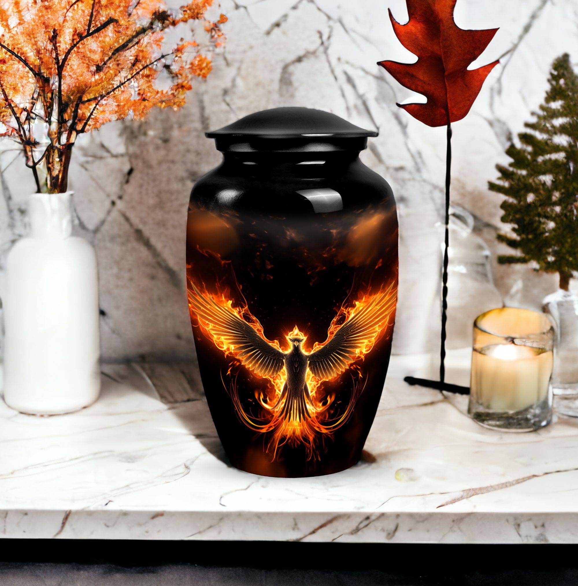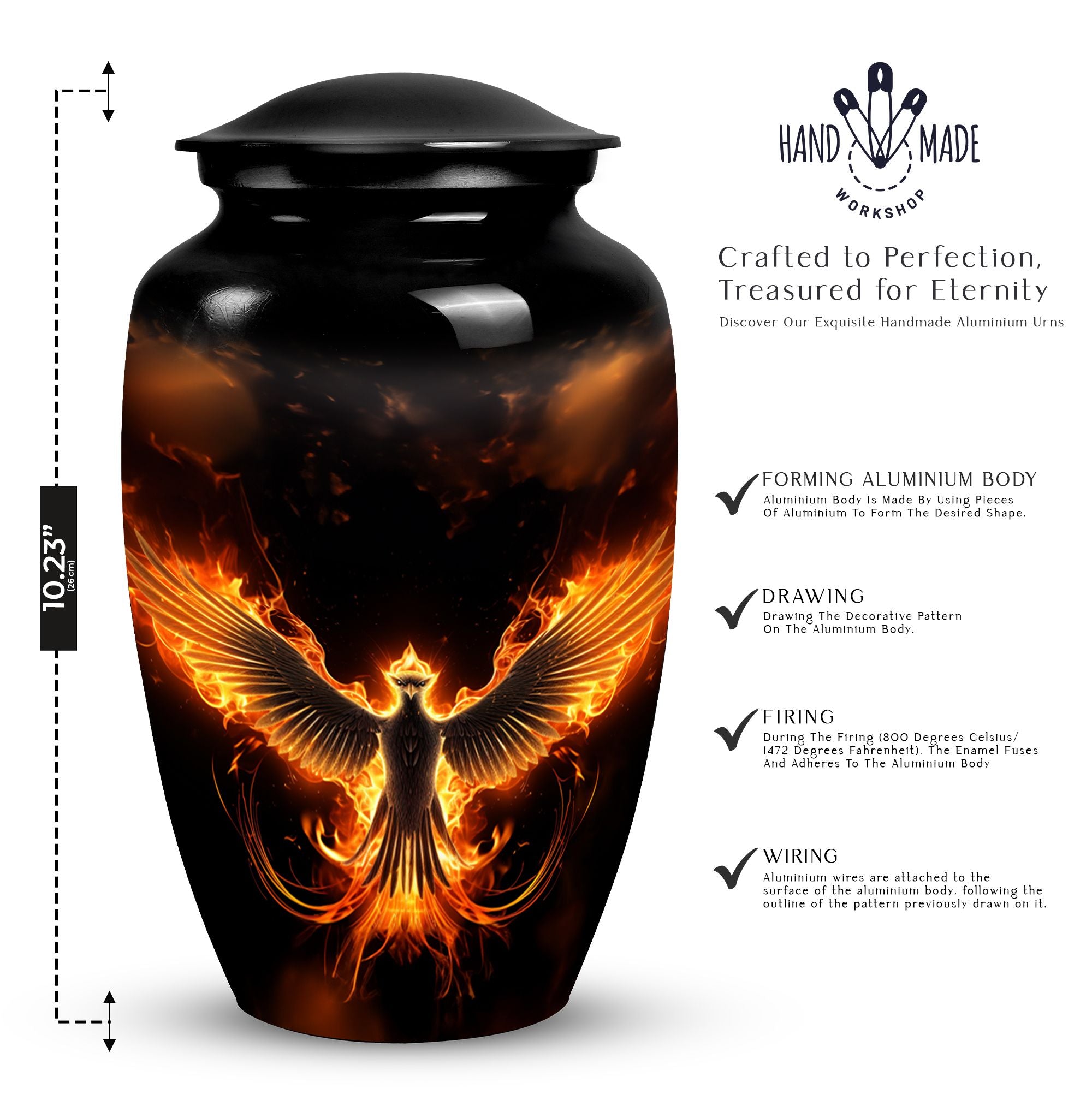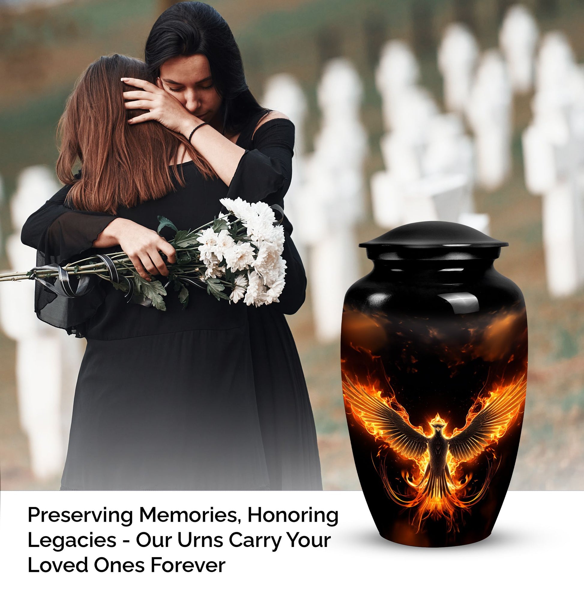 Discover the serenity of our Phoenix Urn, a standout in adult cremation urns. Crafted with meticulous care, this funeral decoration incorporates the symbolic essence of the majestic Phoenix, providing a respectful final abode to your loved one's remains. Our burial urns for ashes are made to incorporate solemn grace and elegance into the memorial ritual. As a significant addition to your memorial ceremony supplies, this Phoenix Urn exhibits an sublime blend of tender love and everlasting memory. Enhanced by its exceptional design and remarkable quality, it serves as a majestic vessel for honoring the memories and celebrating the life of your dearly departed. Our Phoenix Urn distinguishes itself through its detail-oriented design and exceptional artistry, ensuring a meaningful tribute to your beloved one. Rest assured, our Phoenix Urn bridges the gap from a heartfelt goodbye to an eternal remembrance.