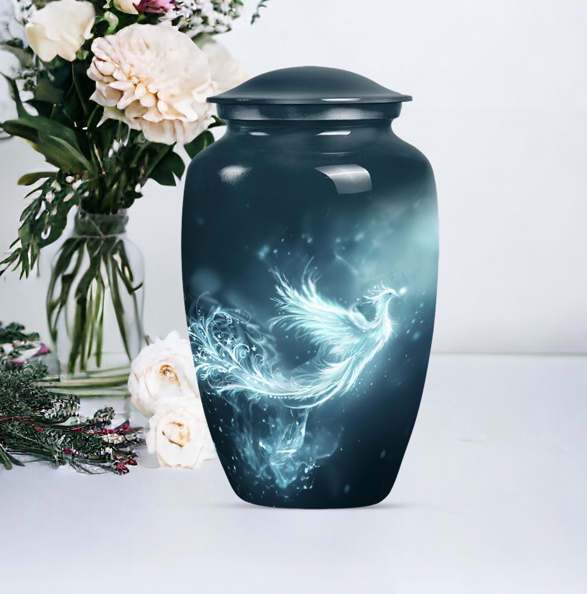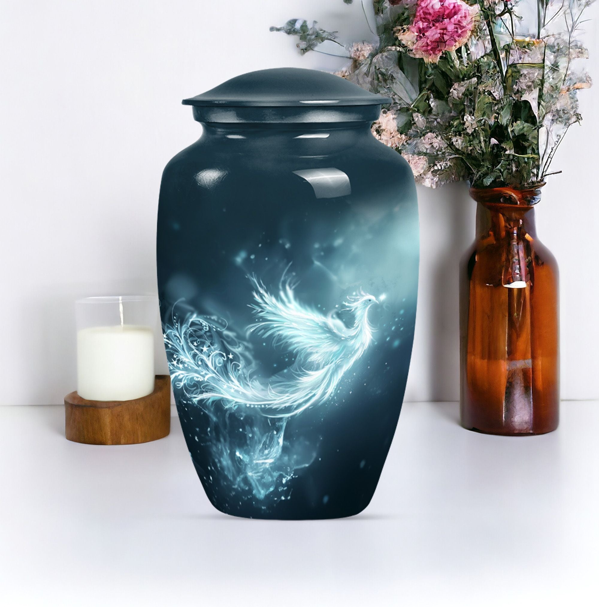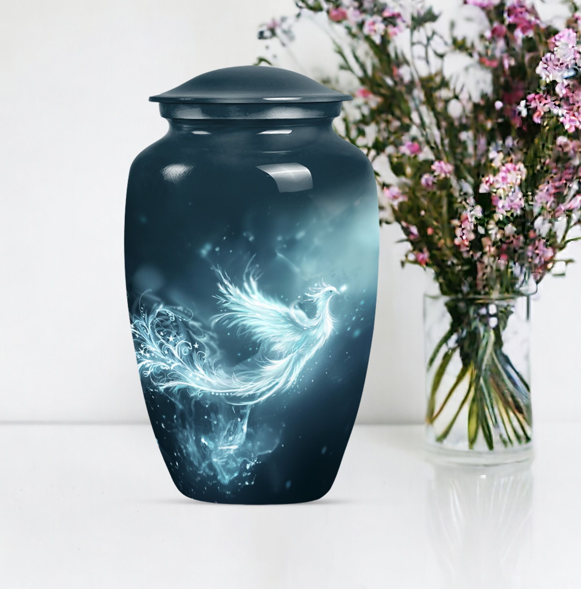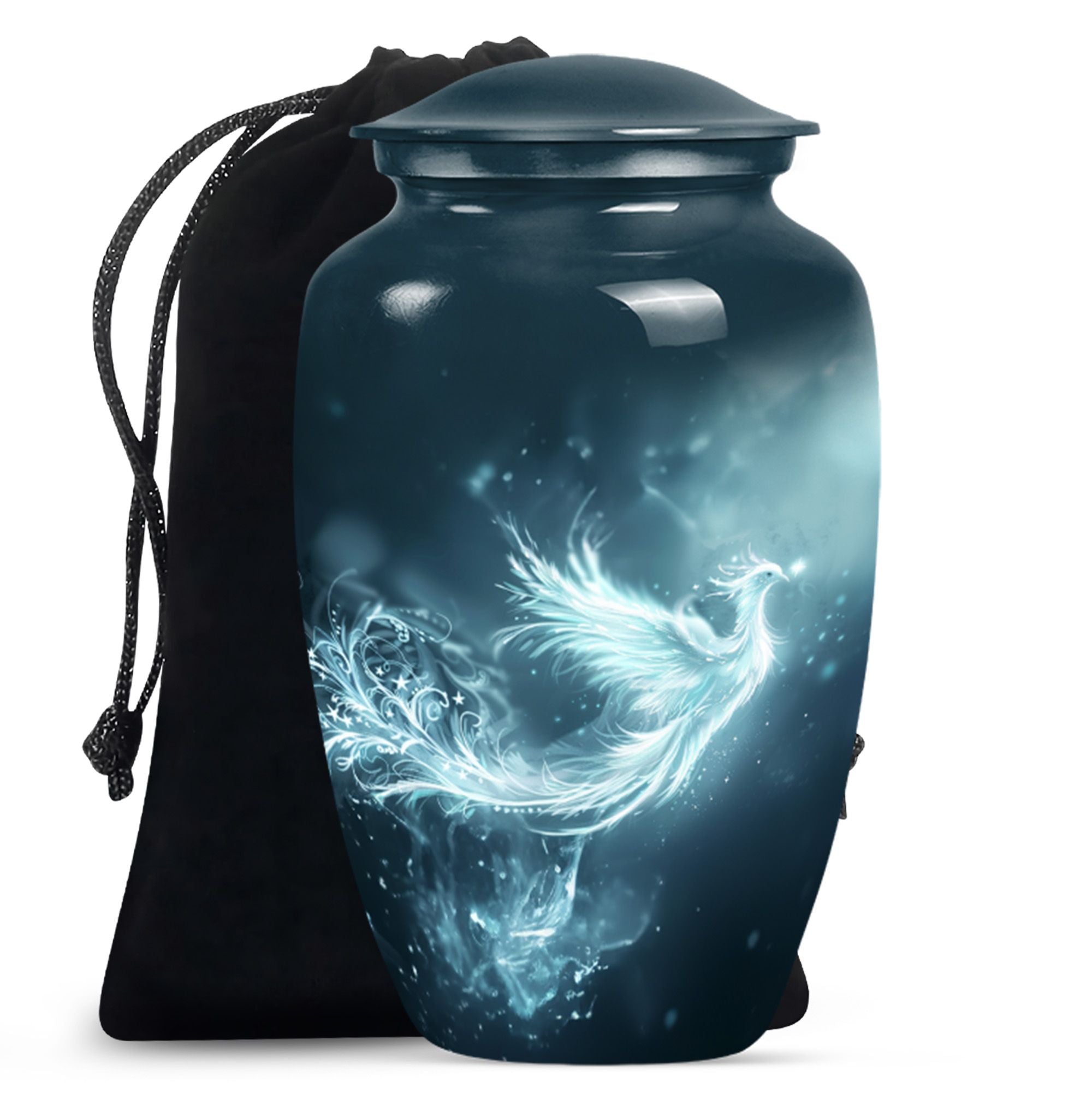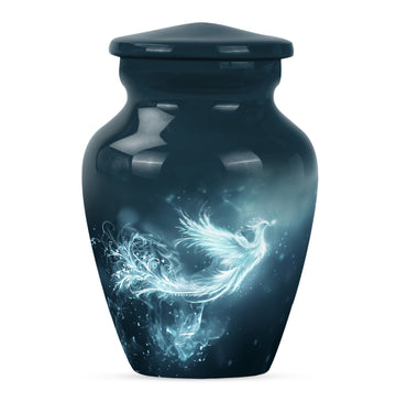 This Phoenix Urn is a beautiful, long-lasting tribute to your cherished departed. This large urn, meticulously crafted from durable aluminium, stands 10 inches in height and has a capacity of 200 cubic inches, making it a fitting memorial for any adult. Its weight of 3.3 pounds speaks to its substantial and high-quality feel. Across its surface is an abstract theme, providing a unique and respectful homage. What sets this urn apart is its customization option. Make it truly special by personalizing it with engraved names, cementing the sense of sentimentality and remembrance it embodies. Each urn comes complete with a velvet pouch, providing an elegant storage solution for the ashes. Primary keywords that represent this product are Phoenix Urn, memorial medium urns for ashes, while relevant secondary keywords include burial urns for human ashes adult, human ash urn adult ash woman, cremation urns for burial, cremation urn for dad. Note: Utilize the keyword phrase 'cremation urn' when searching for this product.