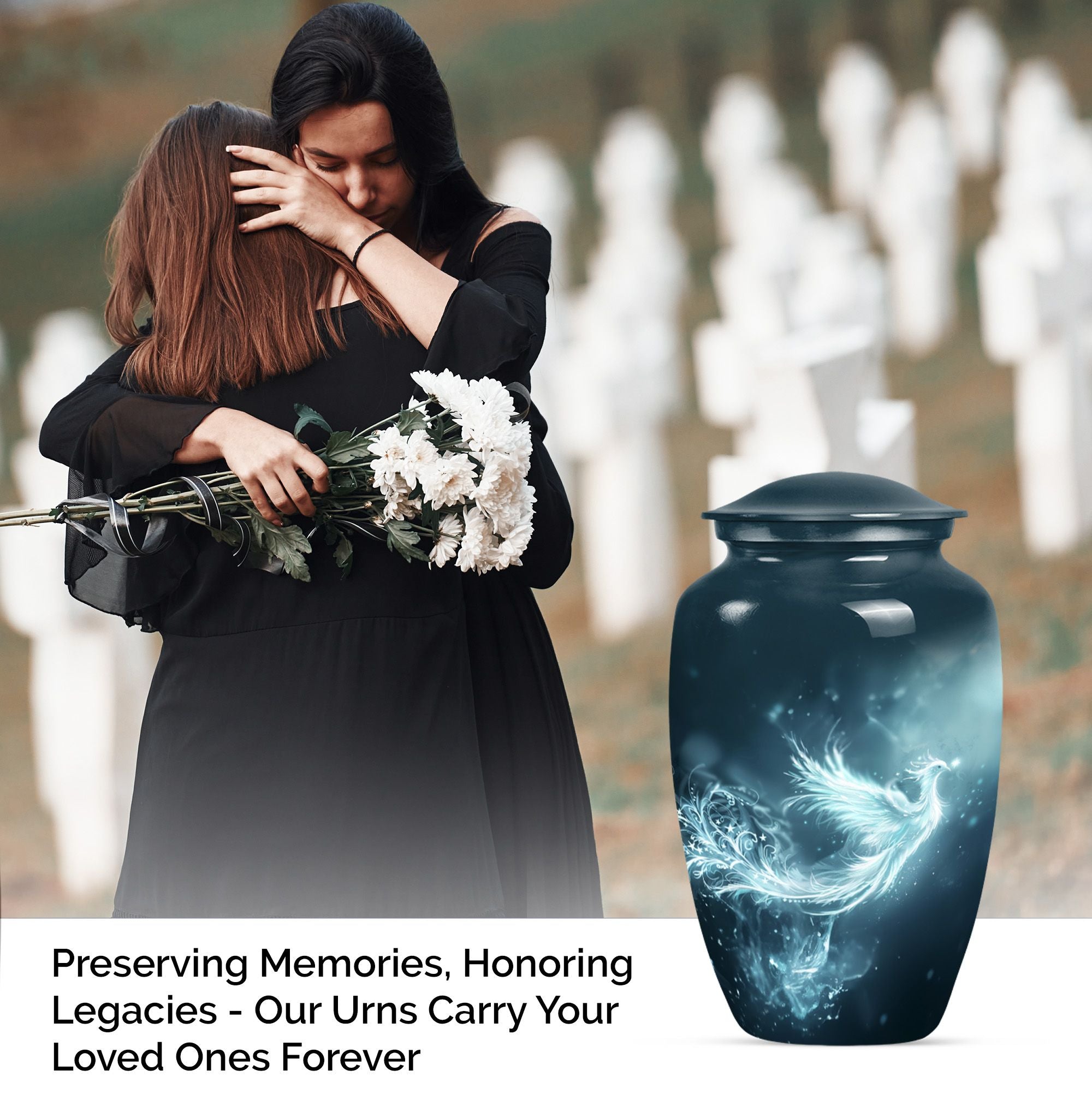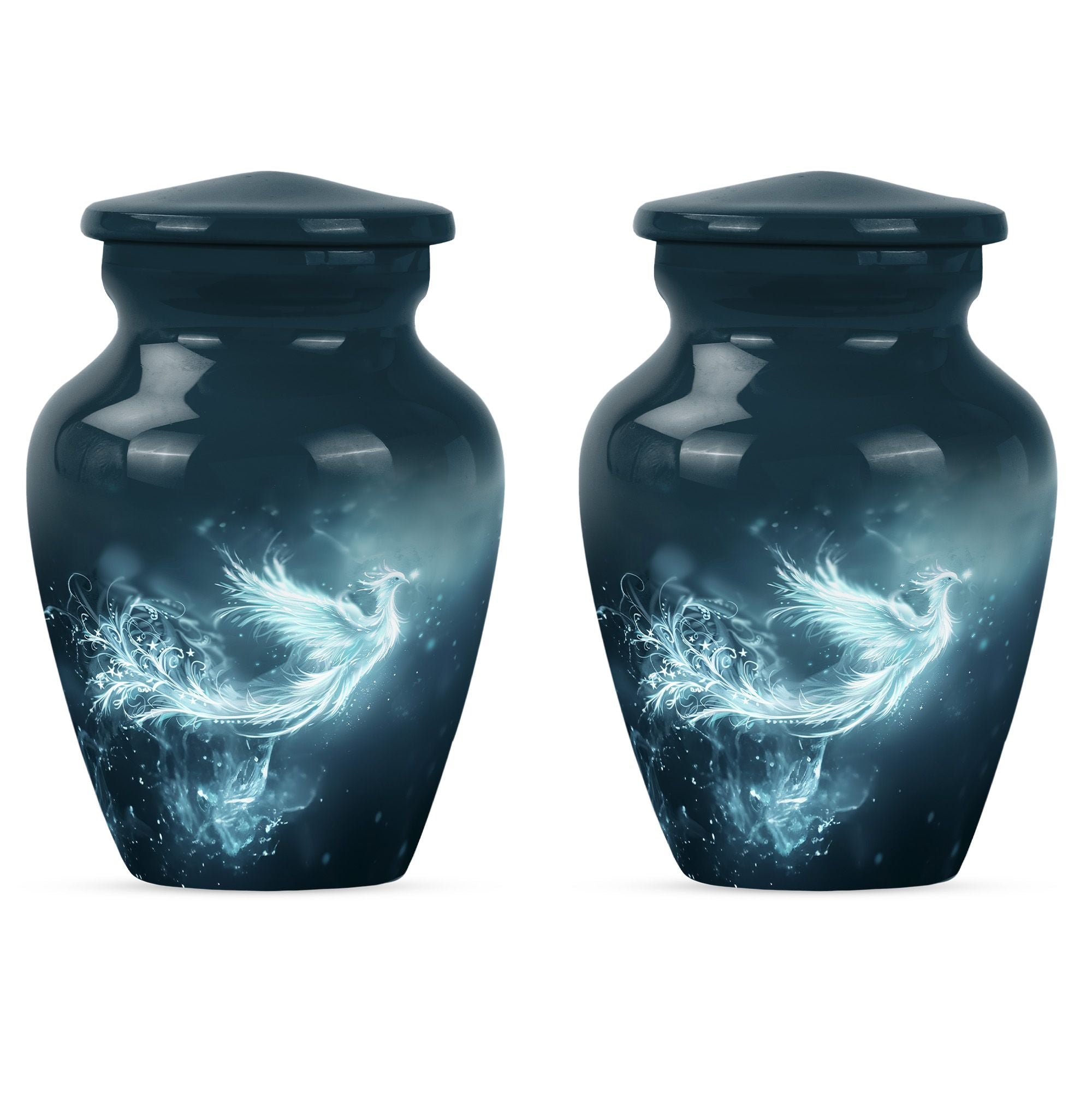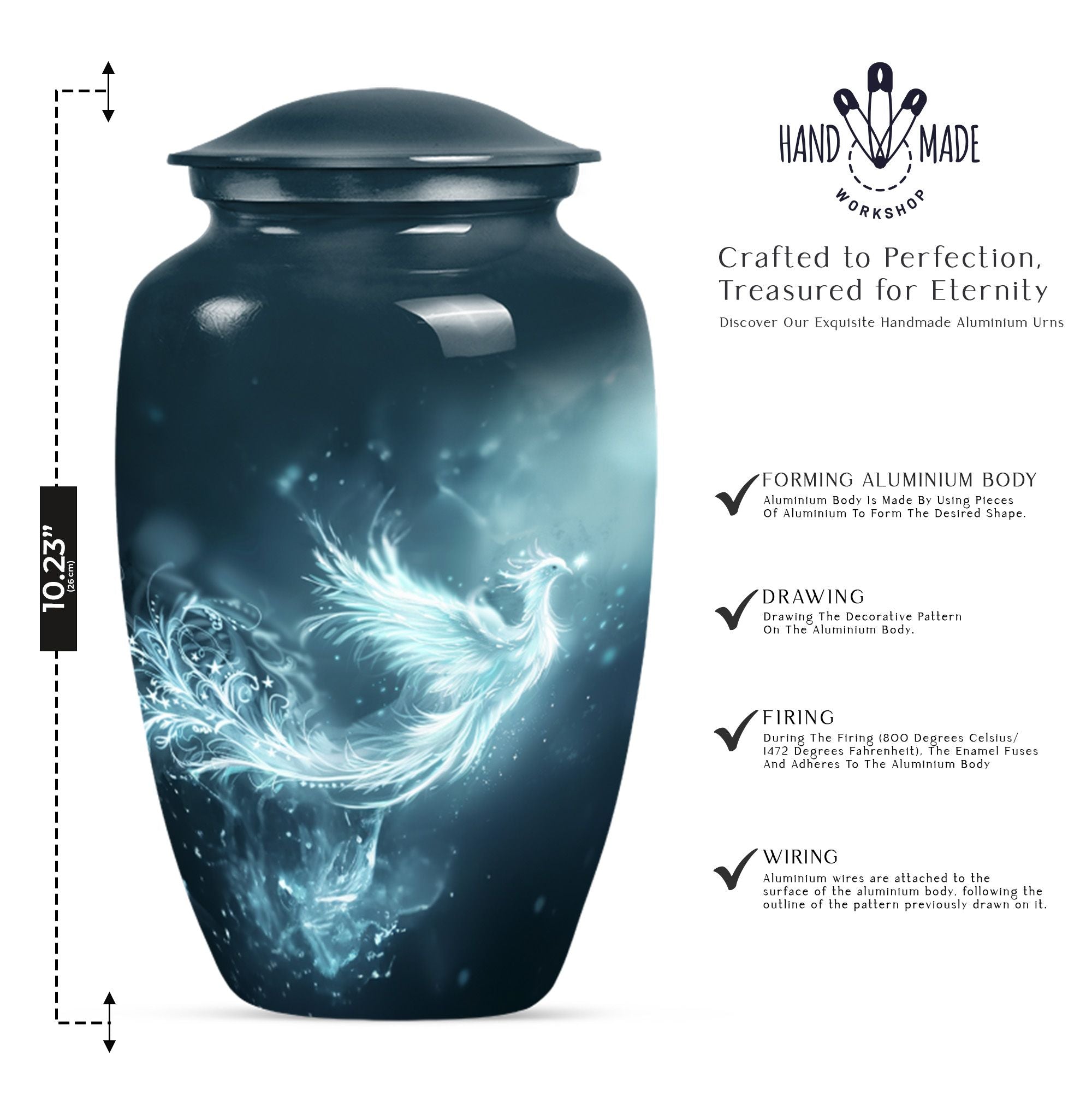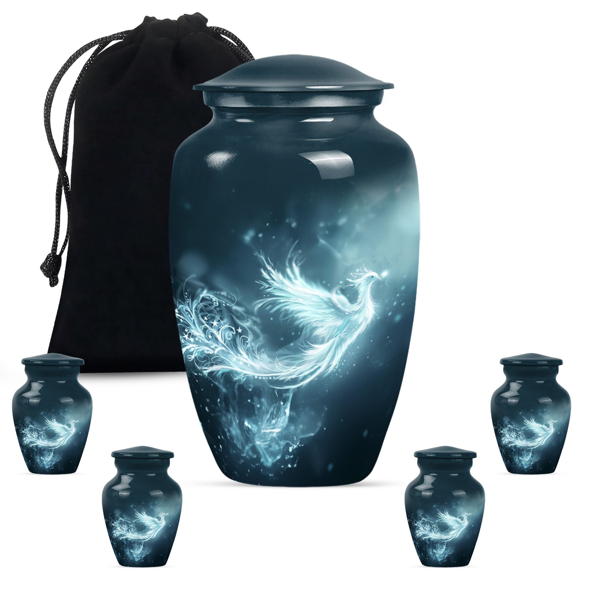 This Phoenix Urn is a beautiful, long-lasting tribute to your cherished departed. This large urn, meticulously crafted from durable aluminium, stands 10 inches in height and has a capacity of 200 cubic inches, making it a fitting memorial for any adult. Its weight of 3.3 pounds speaks to its substantial and high-quality feel. Across its surface is an abstract theme, providing a unique and respectful homage. What sets this urn apart is its customization option. Make it truly special by personalizing it with engraved names, cementing the sense of sentimentality and remembrance it embodies. Each urn comes complete with a velvet pouch, providing an elegant storage solution for the ashes. Primary keywords that represent this product are Phoenix Urn, memorial medium urns for ashes, while relevant secondary keywords include burial urns for human ashes adult, human ash urn adult ash woman, cremation urns for burial, cremation urn for dad. Note: Utilize the keyword phrase 'cremation urn' when searching for this product.