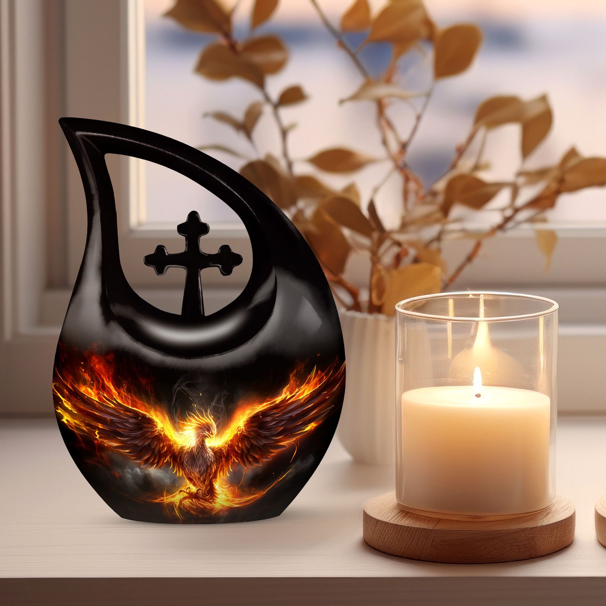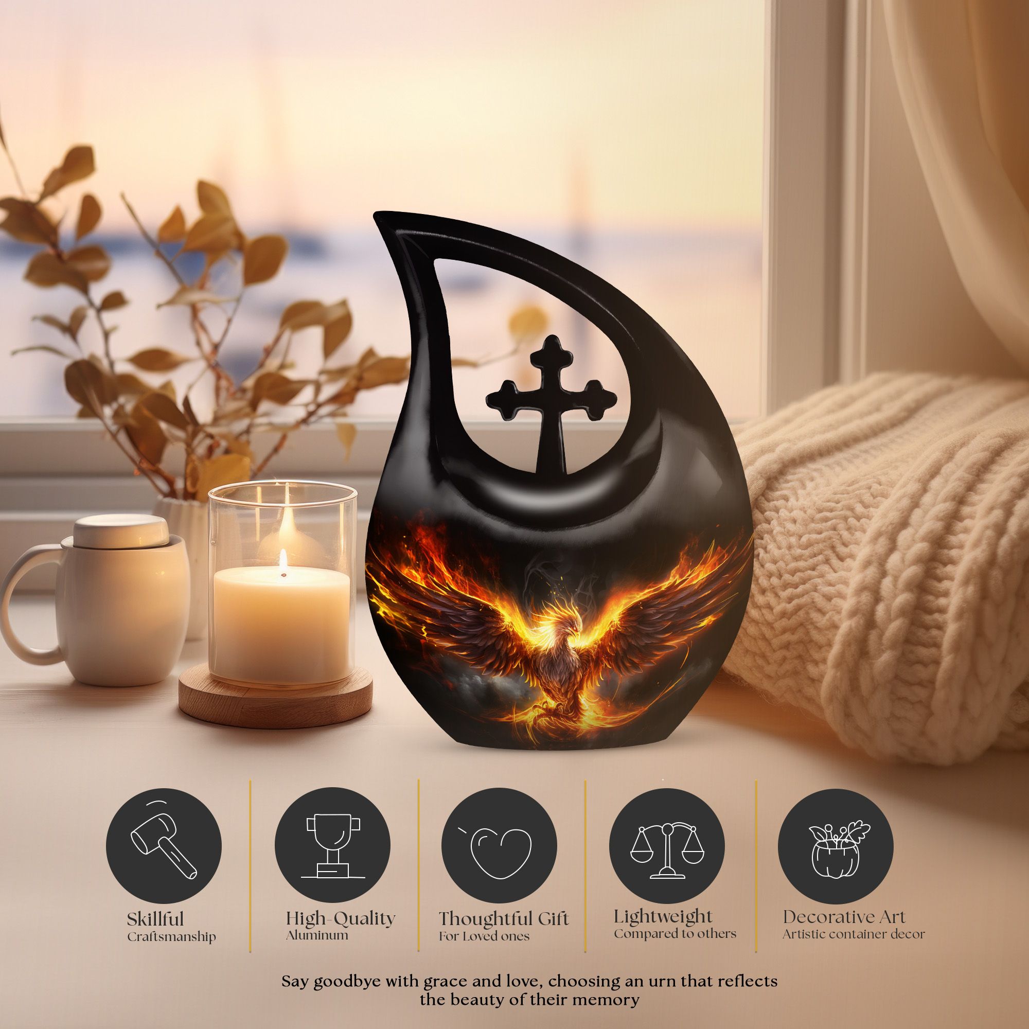 The flaming phoenix reminds us that love and spirit never fade—they transform and live on eternally, making this large urn human ashes a powerful and comforting tribute.