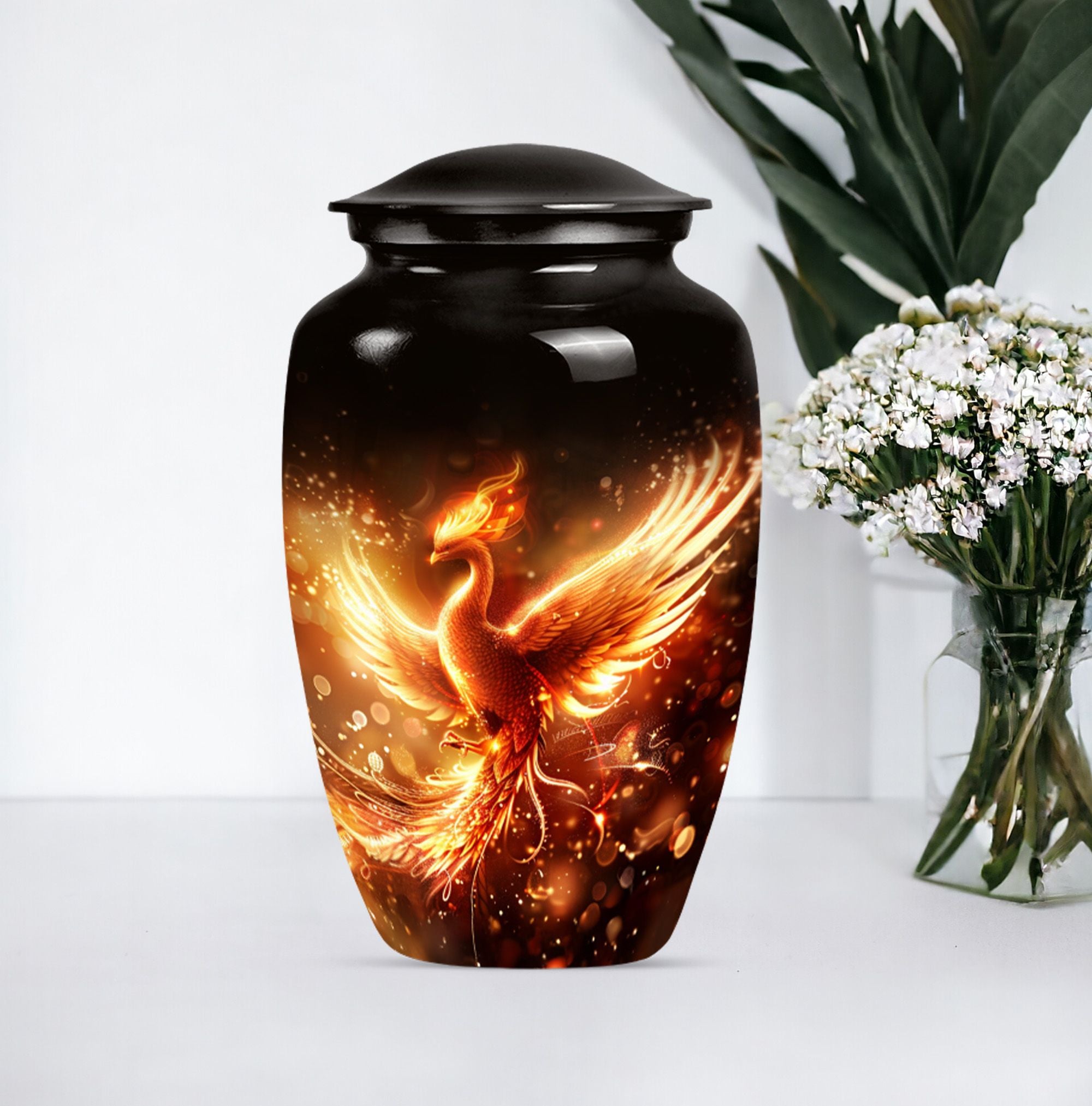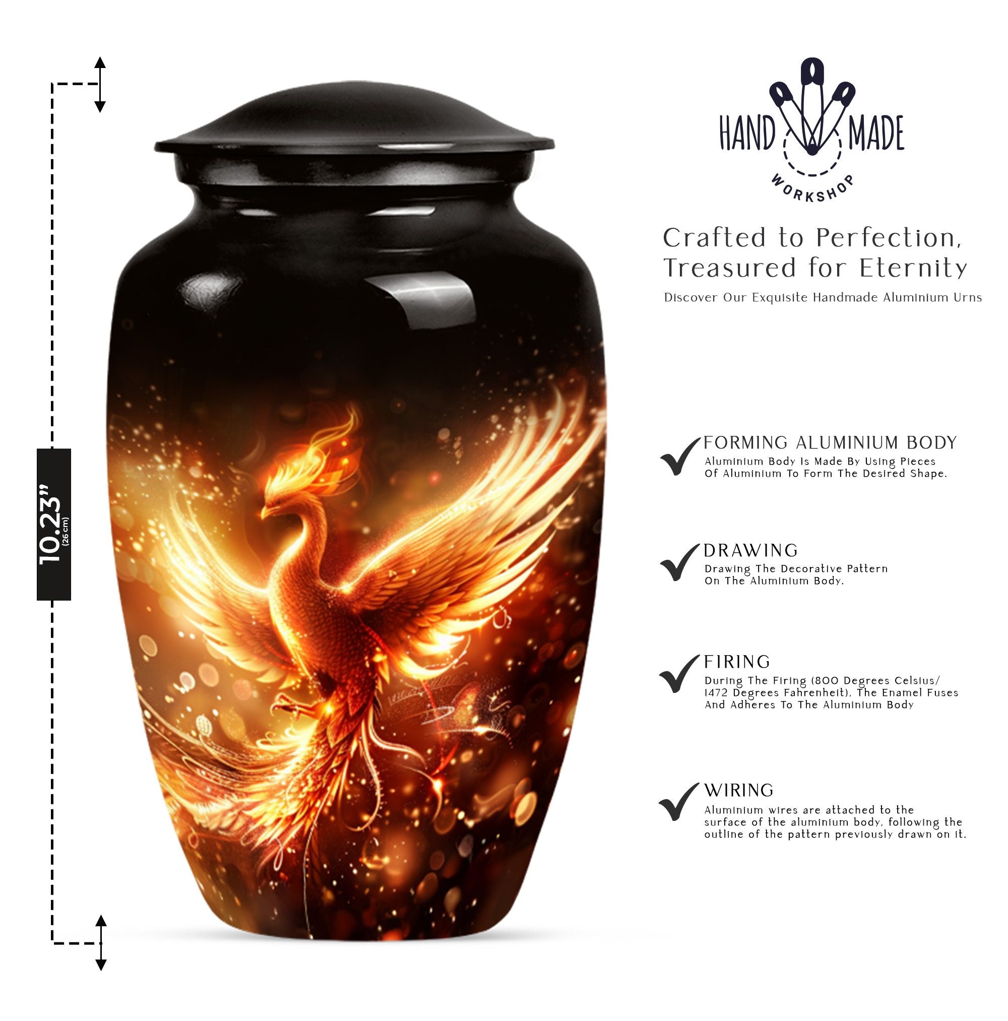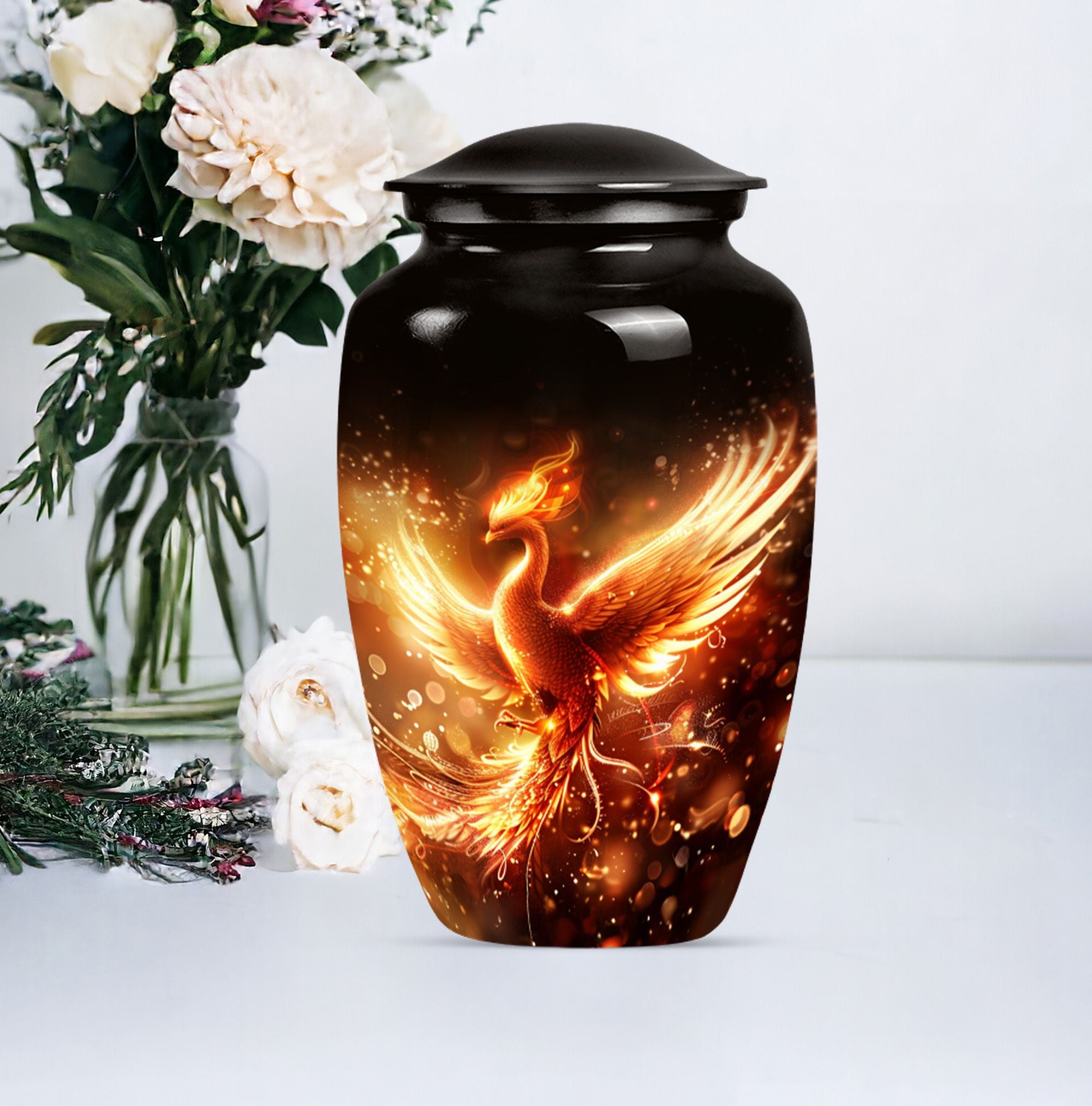 Treasure the memory of a loved one with dignity and respect with our Phoenix Urn. This 10-inch cremation personalized urn provides a classic touch to house the ashes of adults. The urn, built from quality aluminium, offers robustness with a weight of 3.3 pounds, and an abstract theme that adds a unique touch. The large urn has a significant capacity of 200 cubic inches, ensuring an adequate space for containment. It comes with a velvet pouch for a more intimate and respectful containment of ashes. To make it more personal, we offer customization options so you can personalize it with engraved names, transforming the large urn into a touching tribute. The Phoenix Urn perfectly reflects the importance and preciousness of the one it commemorates. Ideal for adults and seniors searching for 'cremation urns', 'large urns for ashes', 'cremation personalized urns for human ashes adult', or 'personalized urns for cremation ashes mother'. With our Phoenix Urn, you will find a remarkable marriage of workmanship, value, and deep respect for the solemnity of the occasion.