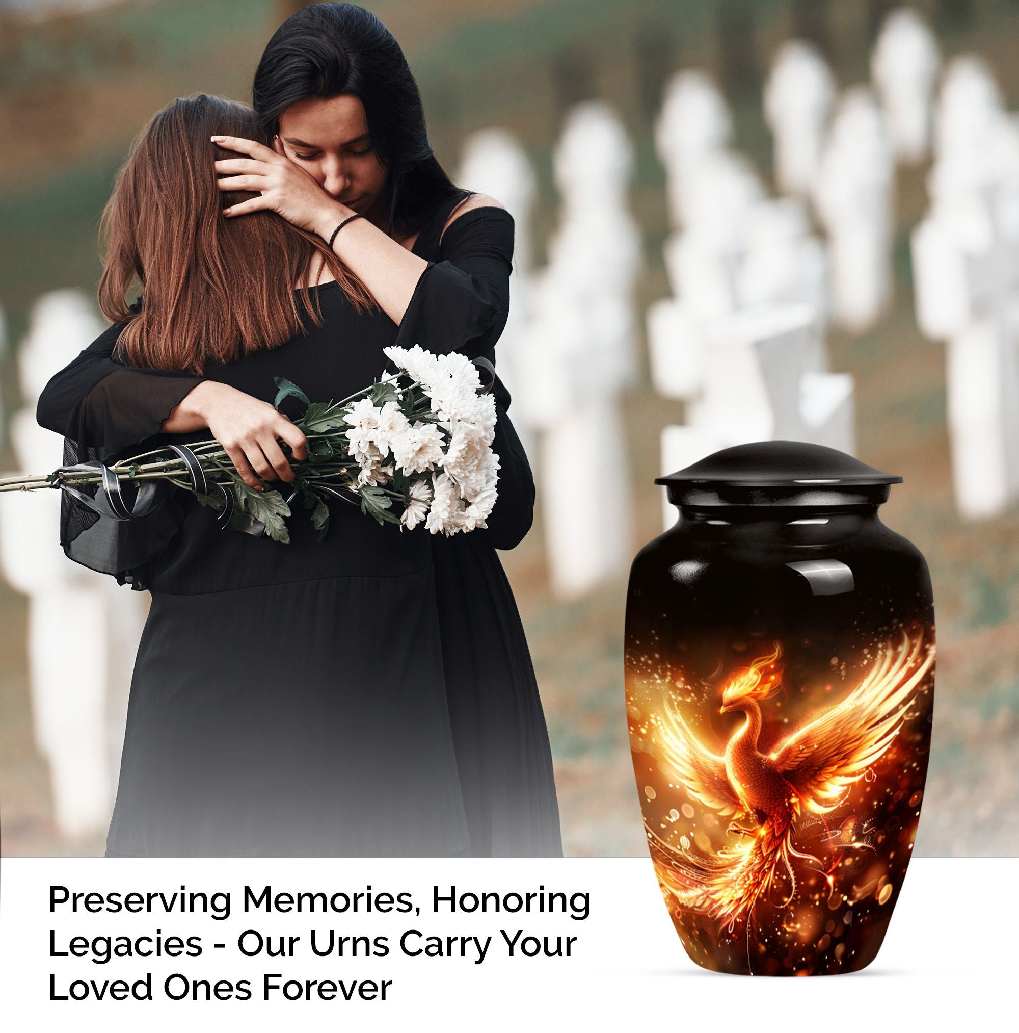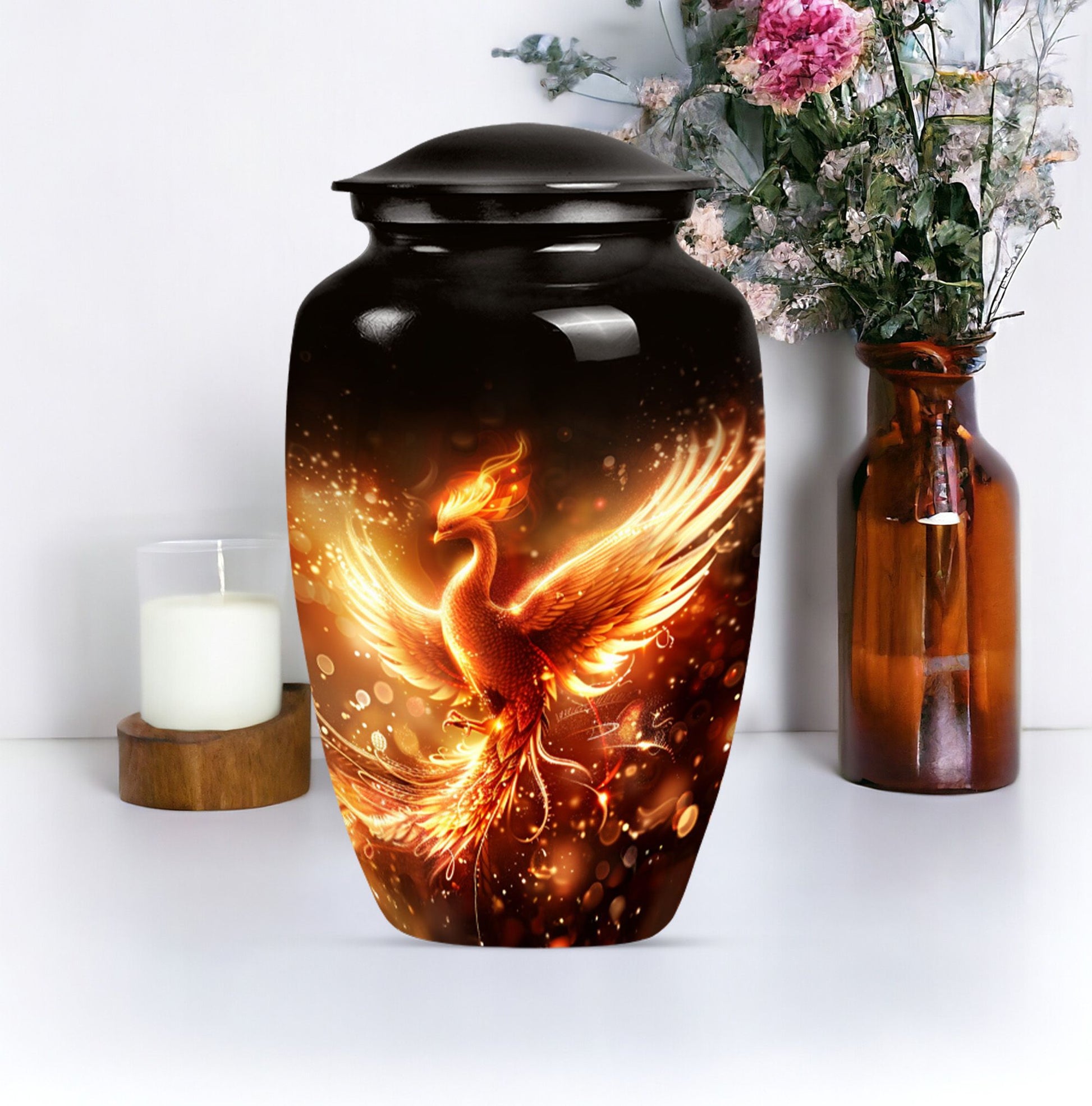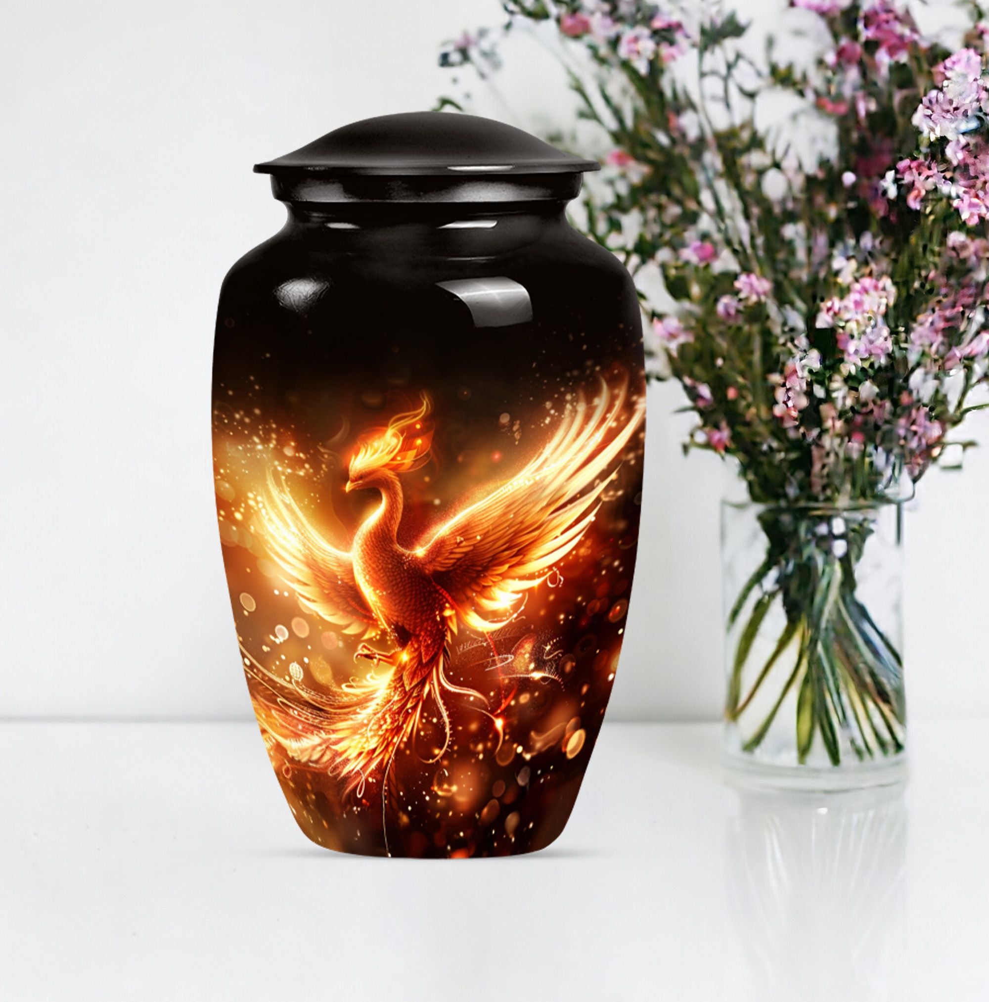 Treasure the memory of a loved one with dignity and respect with our Phoenix Urn. This 10-inch cremation personalized urn provides a classic touch to house the ashes of adults. The urn, built from quality aluminium, offers robustness with a weight of 3.3 pounds, and an abstract theme that adds a unique touch. The large urn has a significant capacity of 200 cubic inches, ensuring an adequate space for containment. It comes with a velvet pouch for a more intimate and respectful containment of ashes. To make it more personal, we offer customization options so you can personalize it with engraved names, transforming the large urn into a touching tribute. The Phoenix Urn perfectly reflects the importance and preciousness of the one it commemorates. Ideal for adults and seniors searching for 'cremation urns', 'large urns for ashes', 'cremation personalized urns for human ashes adult', or 'personalized urns for cremation ashes mother'. With our Phoenix Urn, you will find a remarkable marriage of workmanship, value, and deep respect for the solemnity of the occasion.
