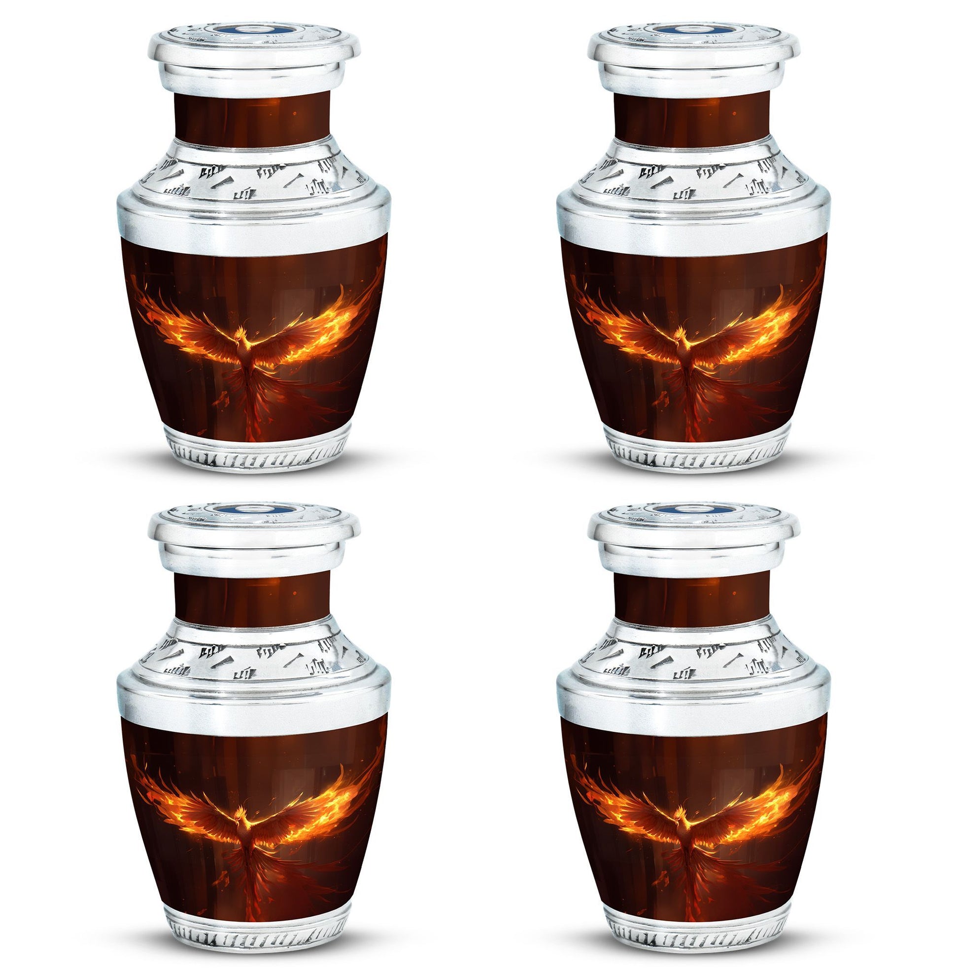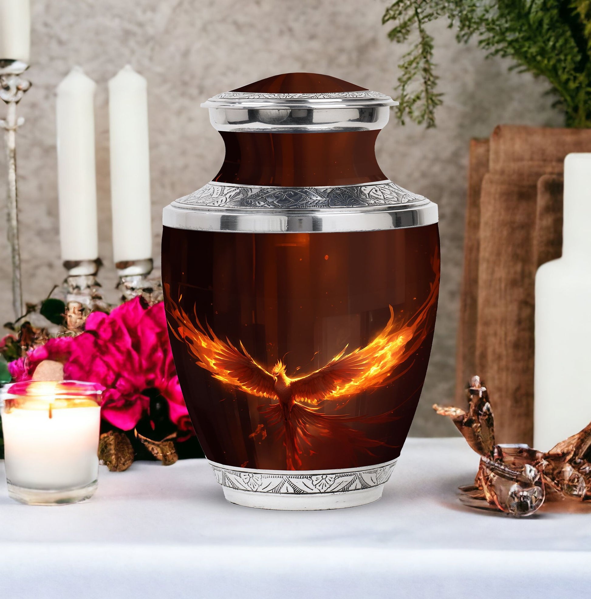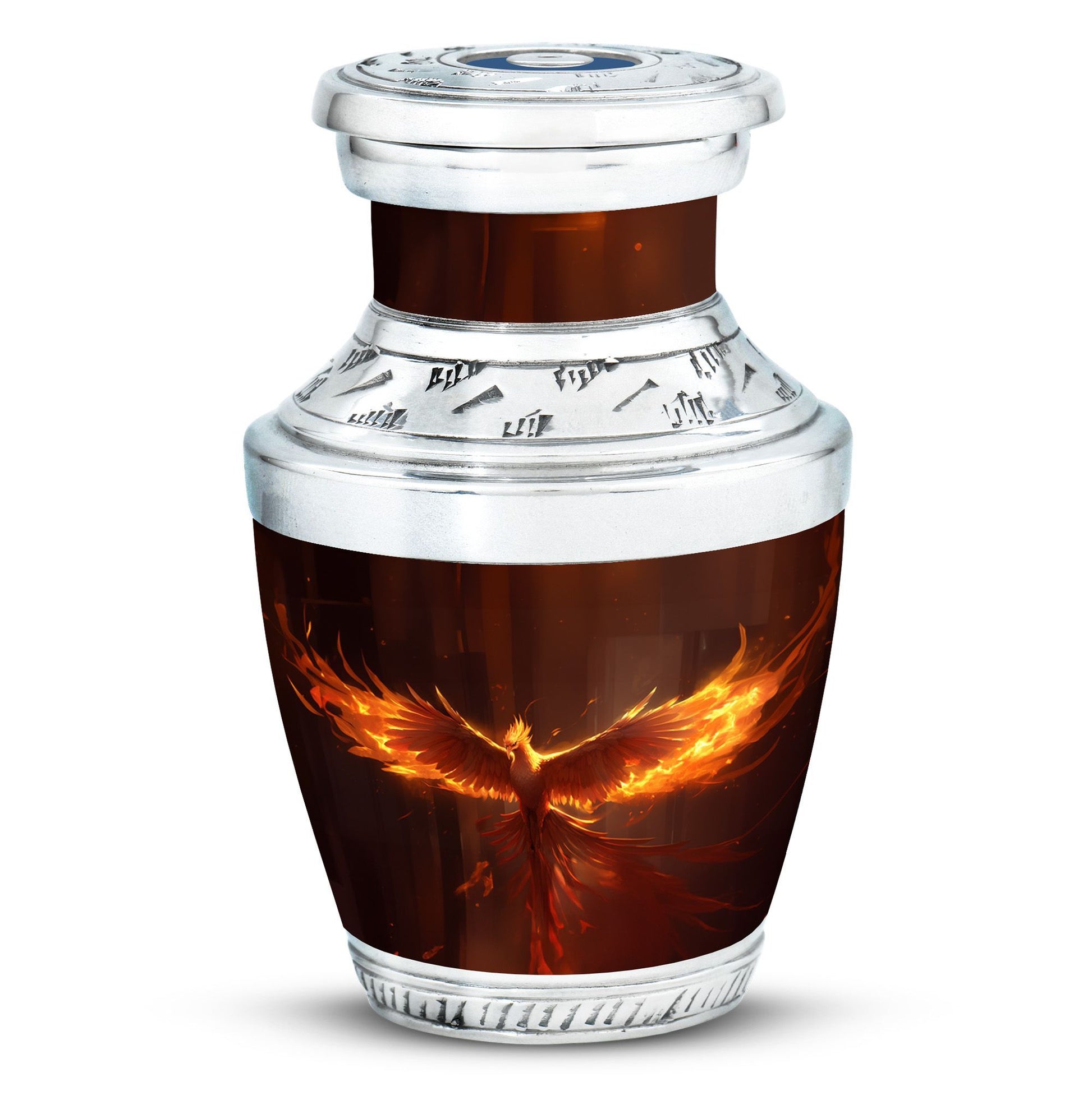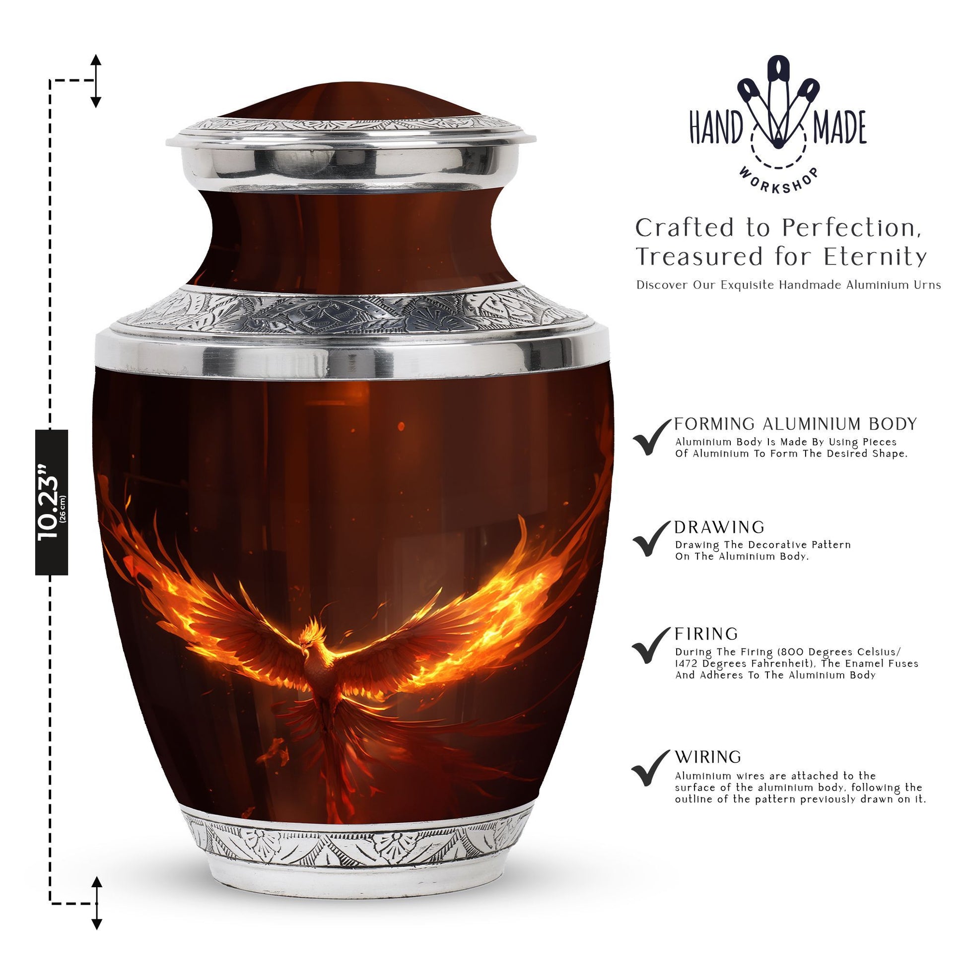 Honor your loved one's memory with our Phoenix Urn, a classic masterpiece among cremation urns. These large urns are crafted with utmost attention given to both aesthetic and functionality. Measuring at 10 inches in height, it is sizable enough to hold 200 cubic inches of ashes, and weighs 3.3 pounds. Despite its substantial dimensions, it is easy to handle. Made from durable and resilient aluminium, it signifies strength, representing how your dear ones have left an enduring mark in your life. Included in the package is a velvet pouch for containment of ashes, aptly fitting for this timeless memento. You can further personalize this unique urn for dad or any loved one by arranging for names to be engraved upon it. Search for metal urns for ashes, or other related phrases, and you'll be redirected to our Phoenix Urn - an epitome of remembrance, allowing you to keep your loved ones closer, even in their eternal journey. Our cremation containers for ashes allow you to remember and honor your loved one in a significant and lasting way.