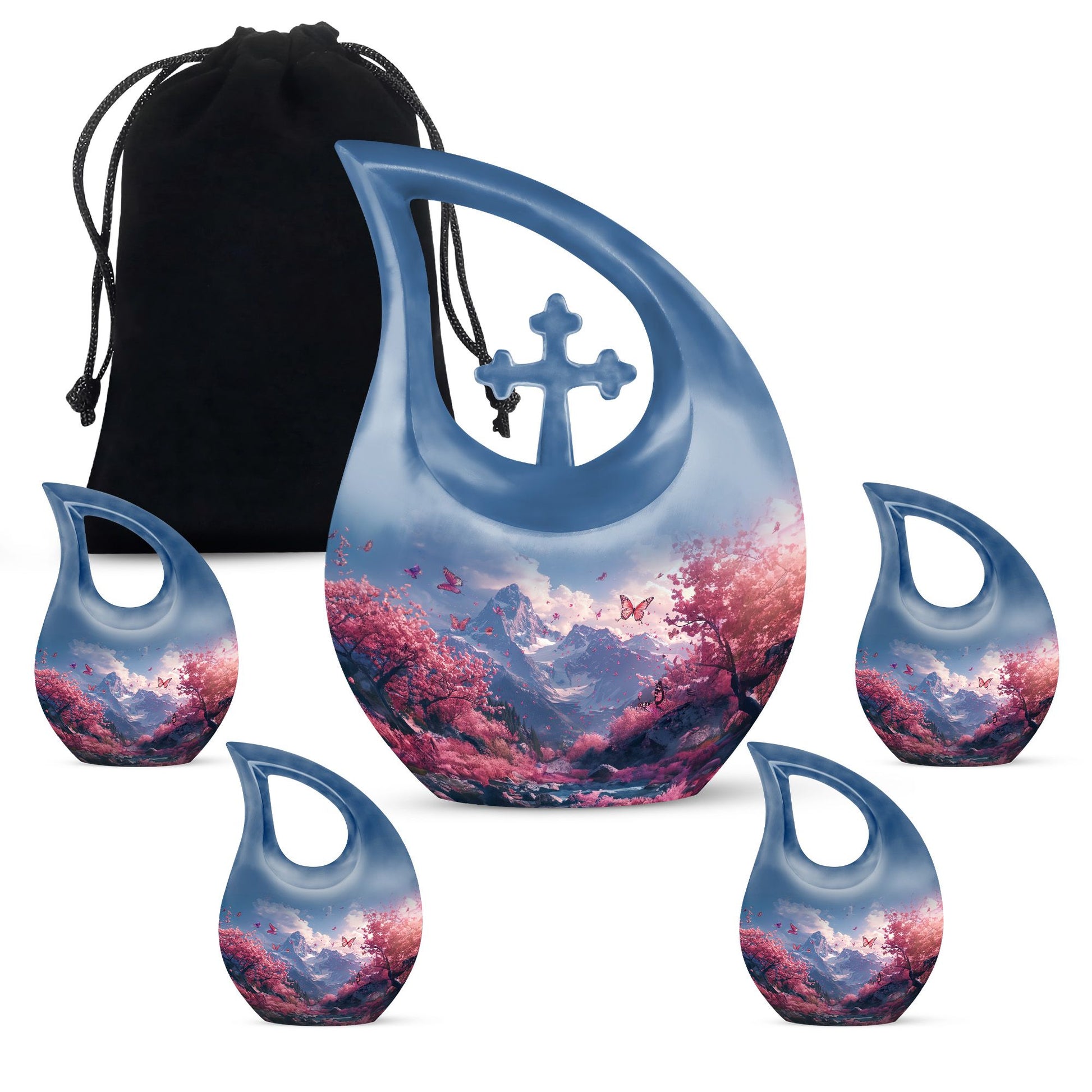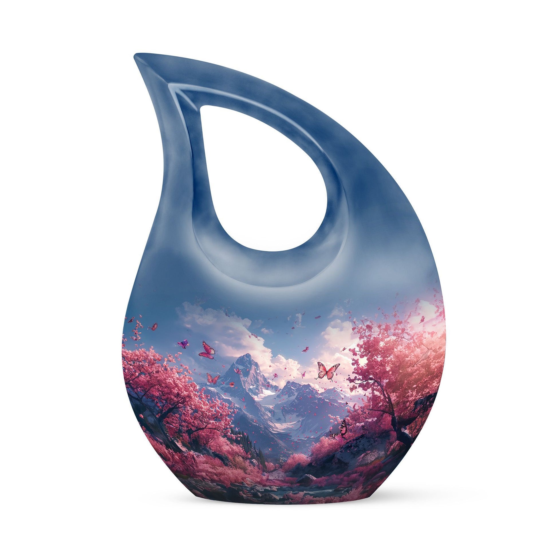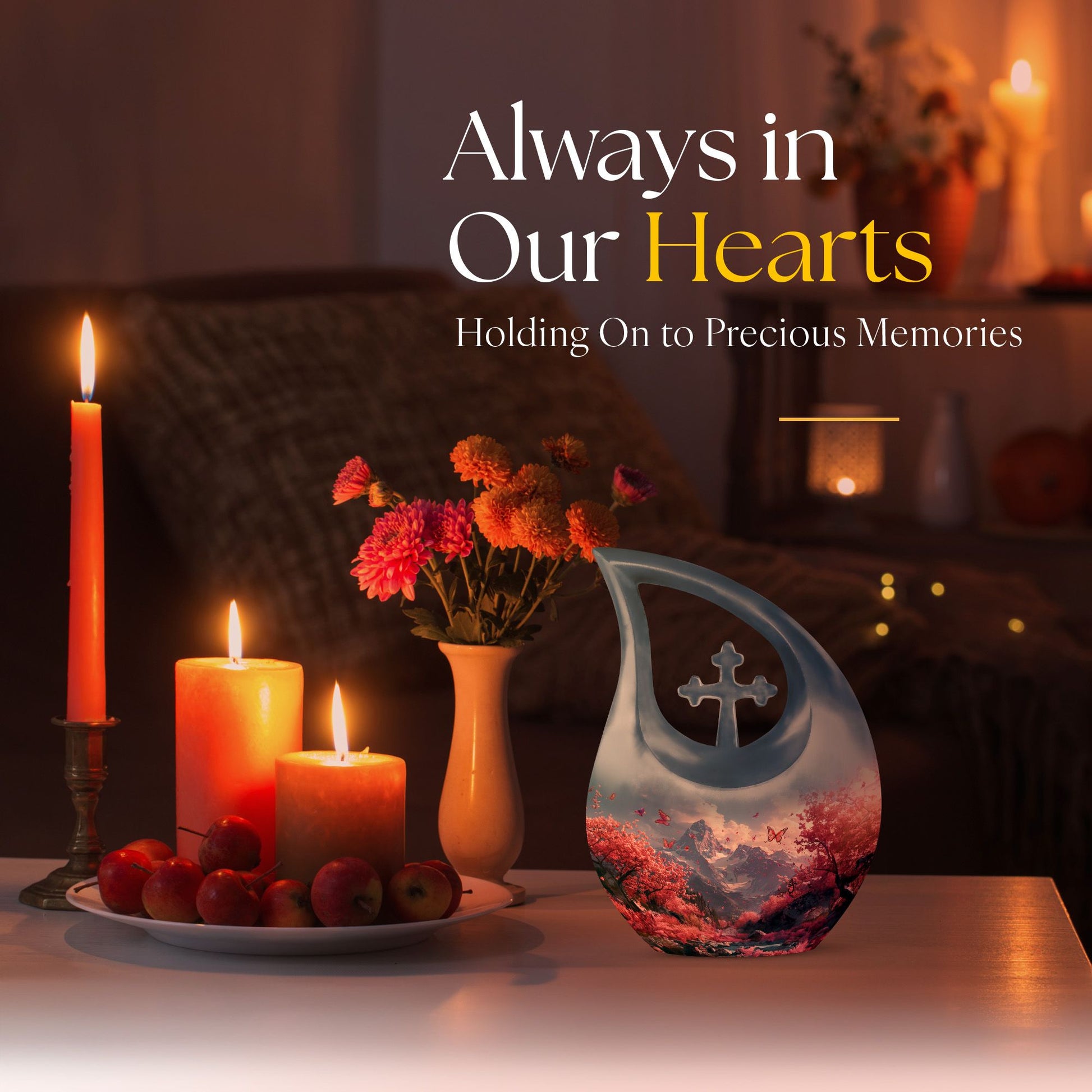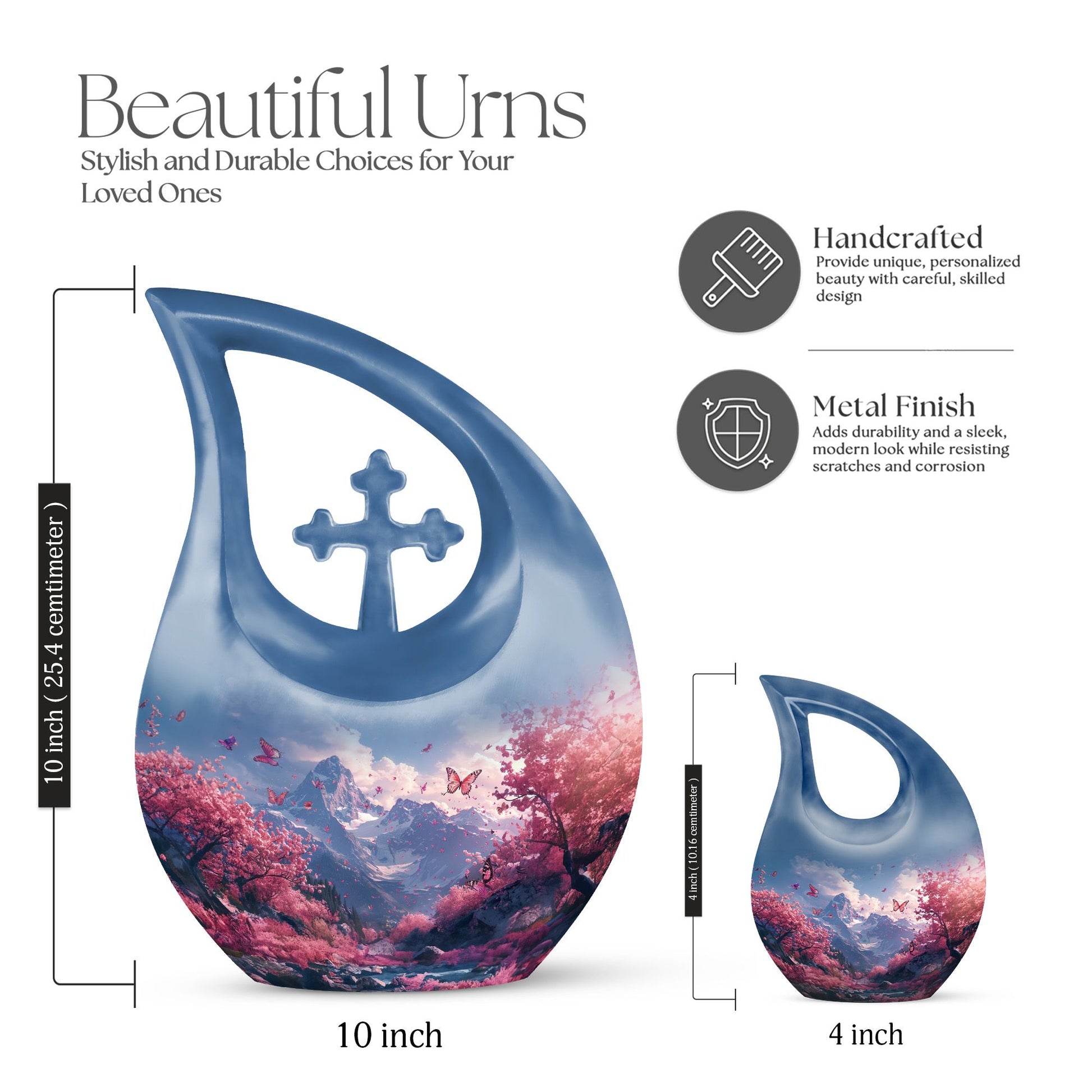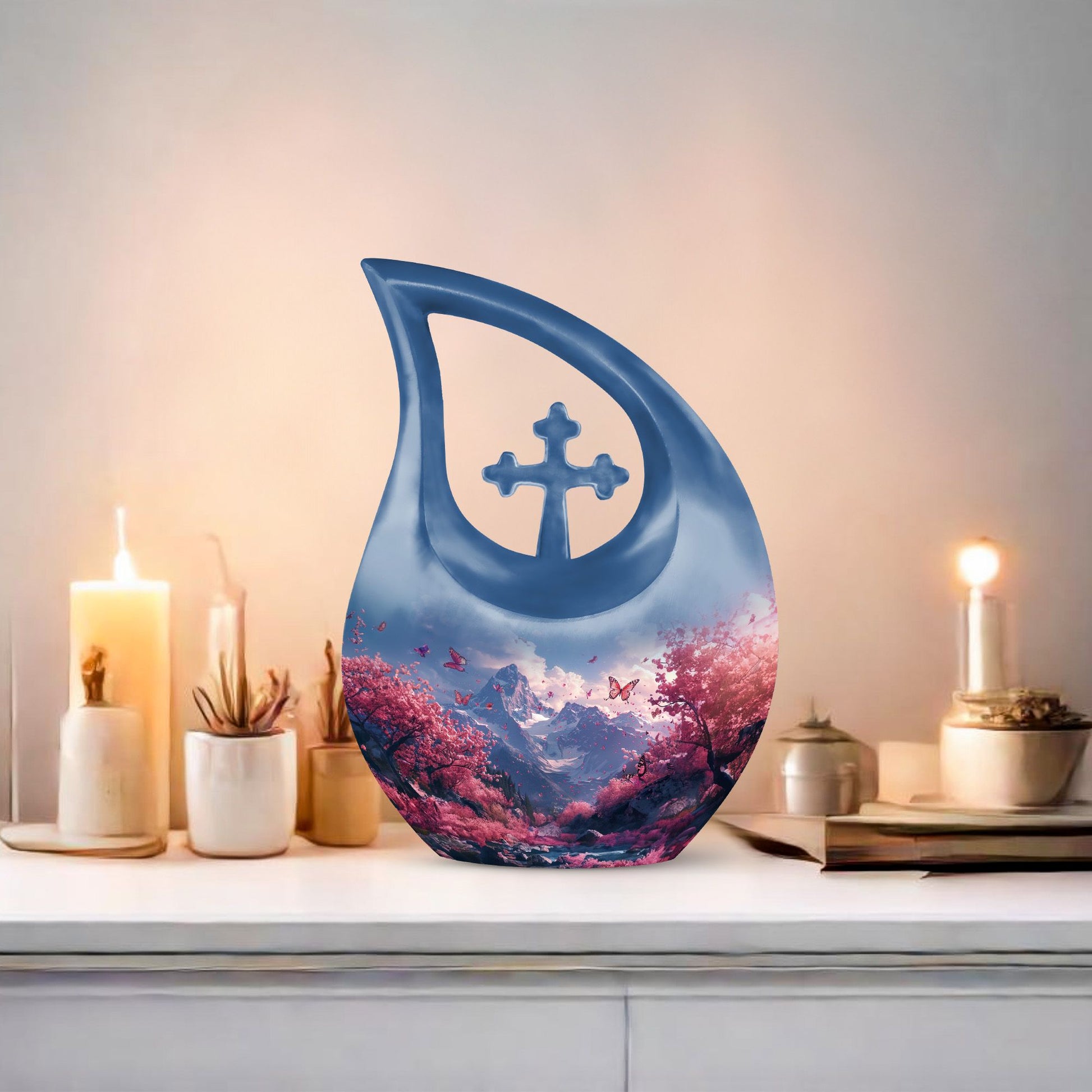 The Pink Butterfly Cross Drop Urn for Ashes captures the beauty of transformation, faith, and eternal love. Adorned with delicate cherry blossoms and butterfly artwork, this urn represents renewal and serenity — a fitting tribute for honoring your loved one’s memory. Crafted for both men and women, it serves beautifully as an urn for human ashes adult male or female memorial urn.