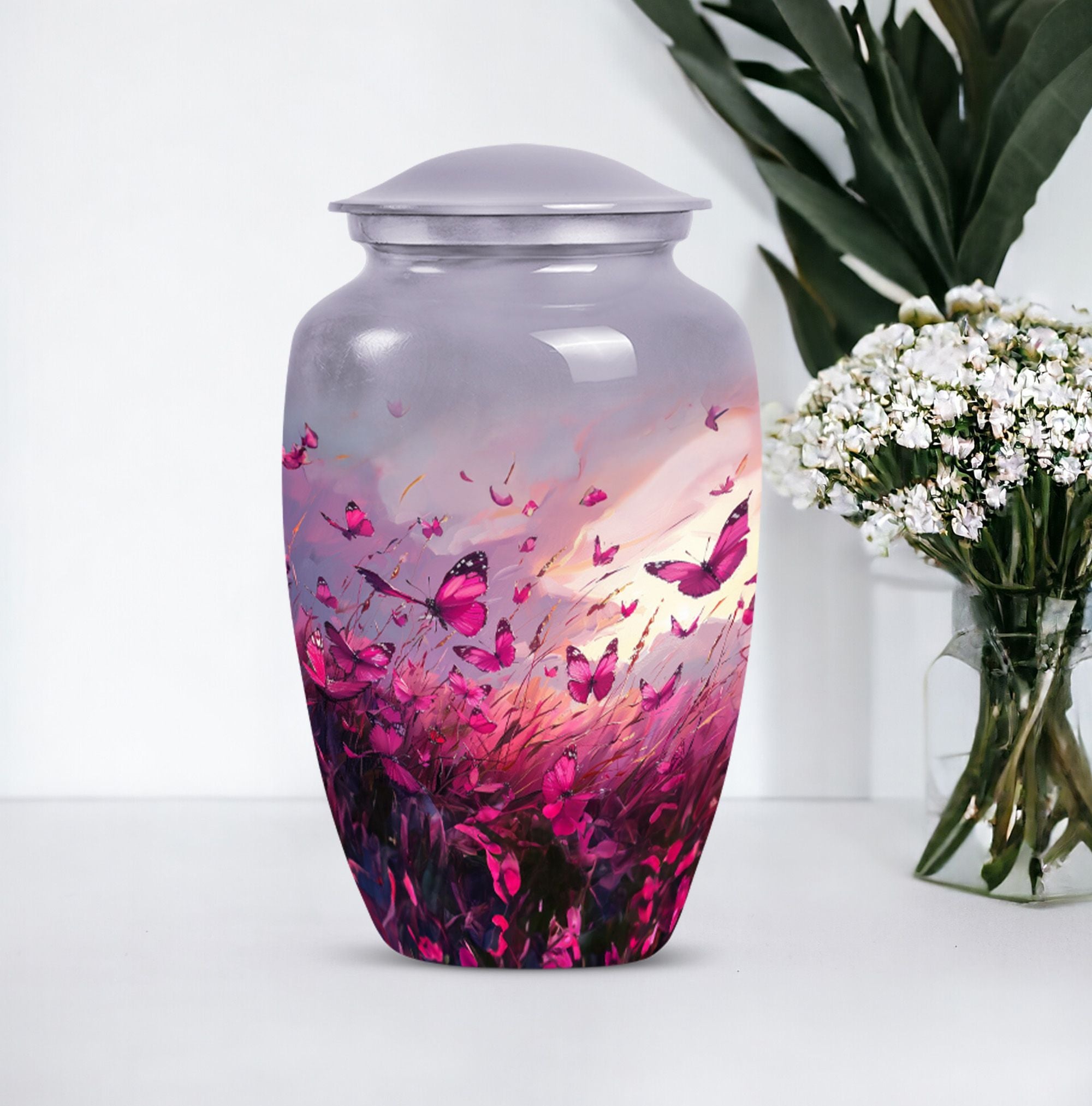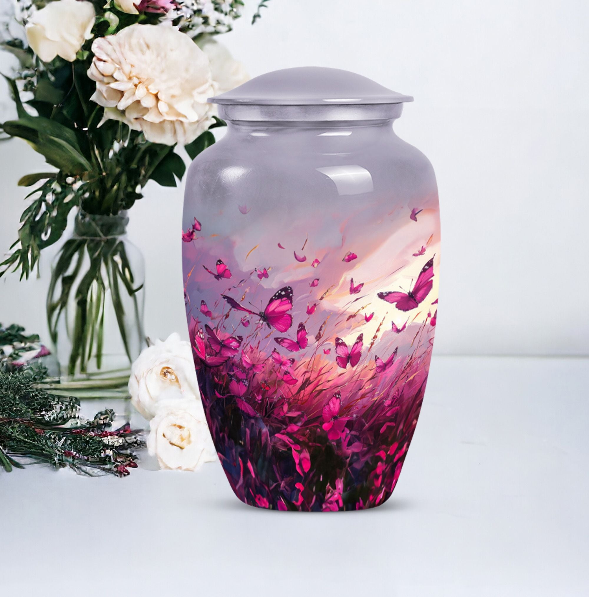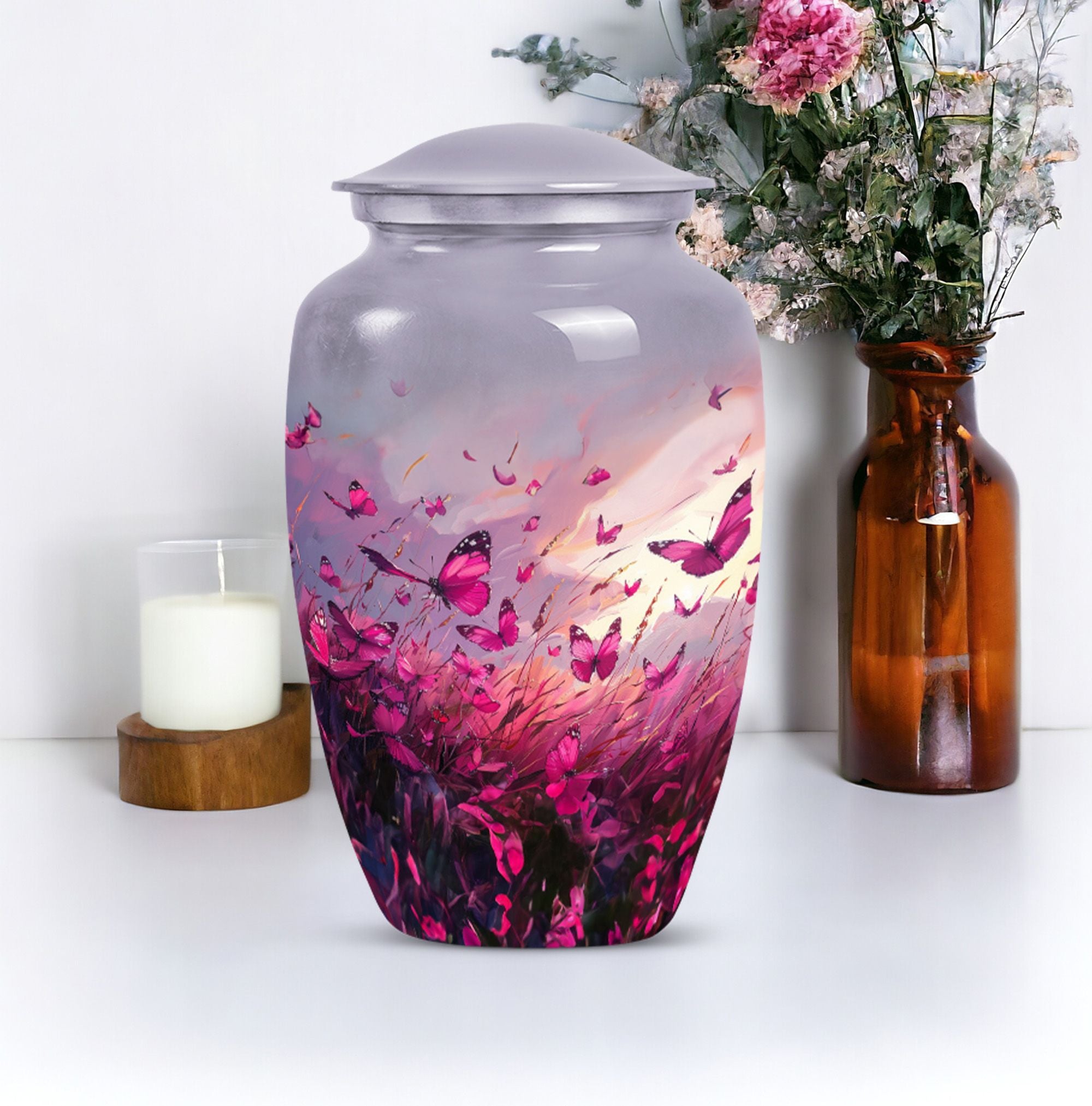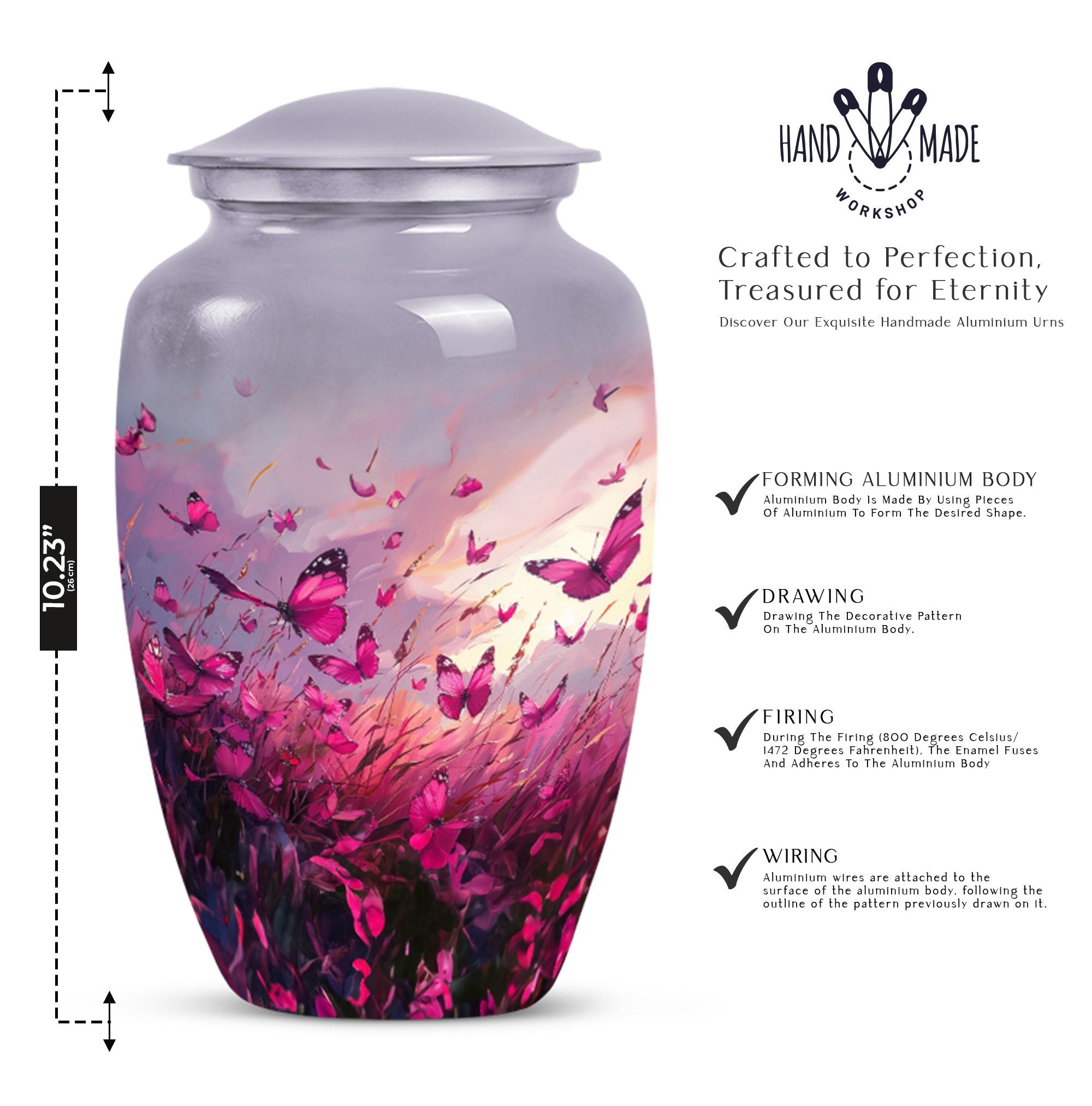 Immerse yourself in the serene world of remembrance with our intricately adorned 'Pink Butterfly Urn'. This large urn is not just a burial cremation urn, it is an artistic ode to the serenity and beauty of life. Cast in high-quality Aluminium, this 10-inch memorial piece comfortably holds 200 cubic inches of ash, a size typically sufficient for an adult. The elegantly themed butterfly urn mirrors the soul's transformation, serving as a comforting symbolic piece. Each pink butterfly urn is complete with a velvet pouch for containment and safekeeping of ashes. Weighing a sturdy 3.3 pounds and 10 inches in height, its formidable presence is a dignified tribute to your loved ones. Moreover, the urn offers a feature of personalization - engrave names or a heartfelt message. Leave behind the generic metal urn for burial and embrace the adult female elegant urn in porcelain - a meaningful way to honor your loved ones in this solemn time. Please search for 'cremation urn' to further explore our wide collection.