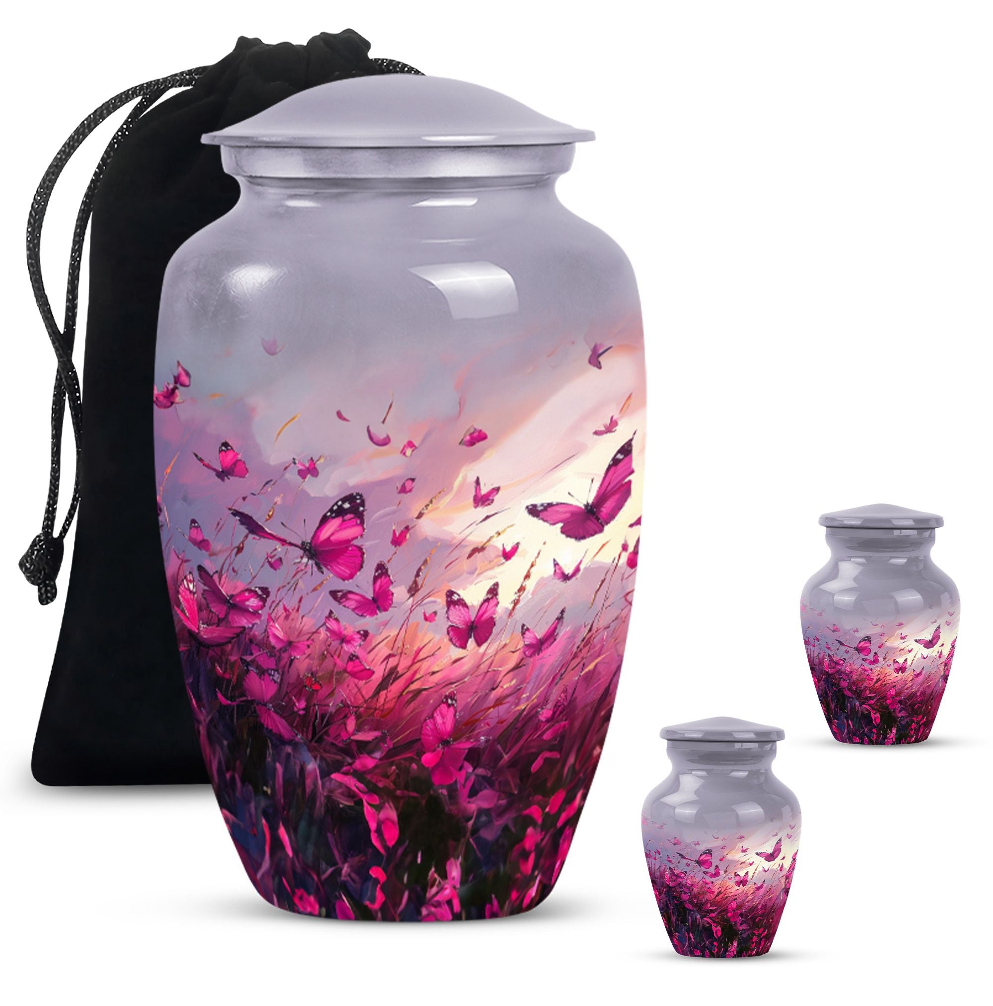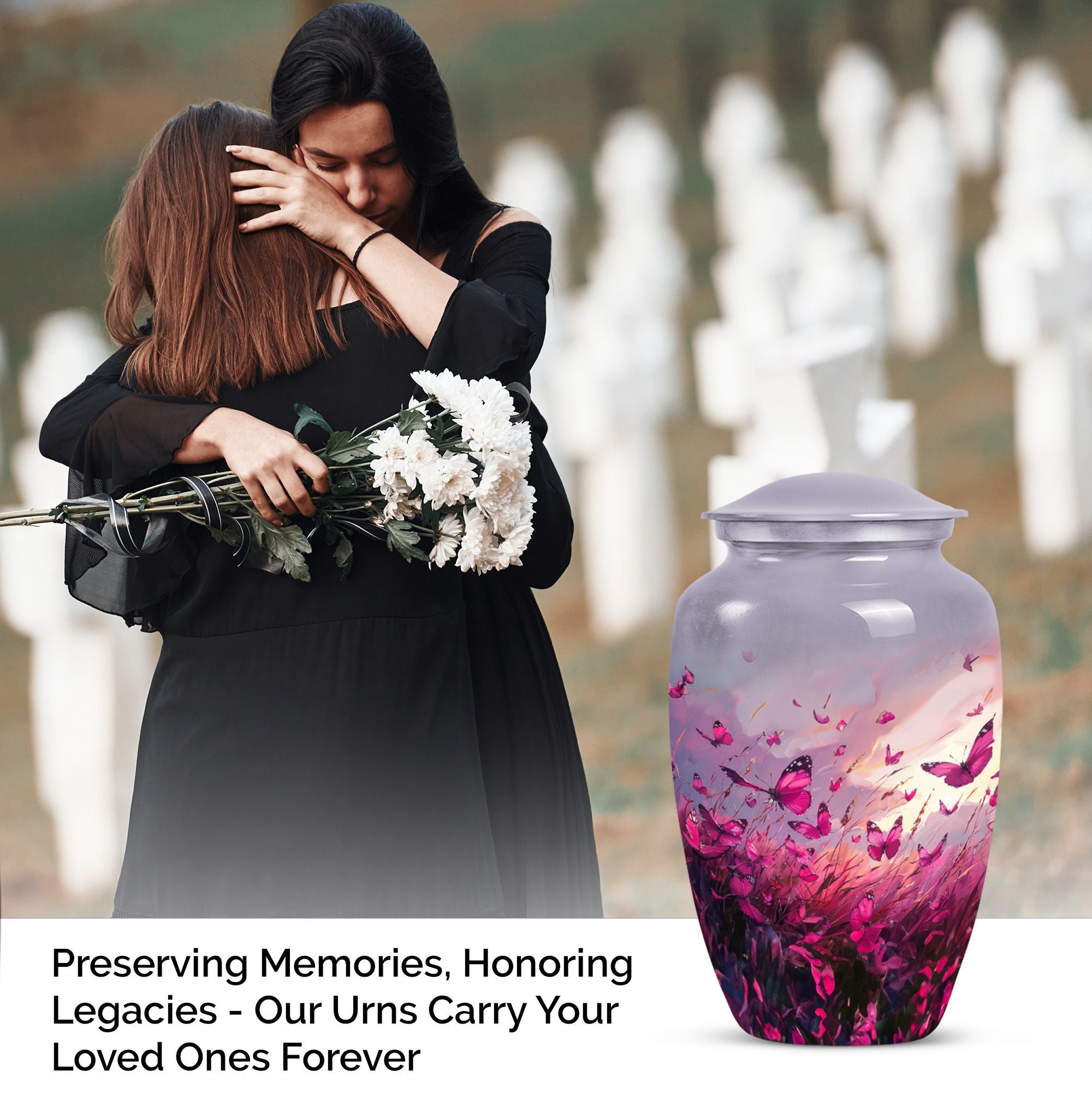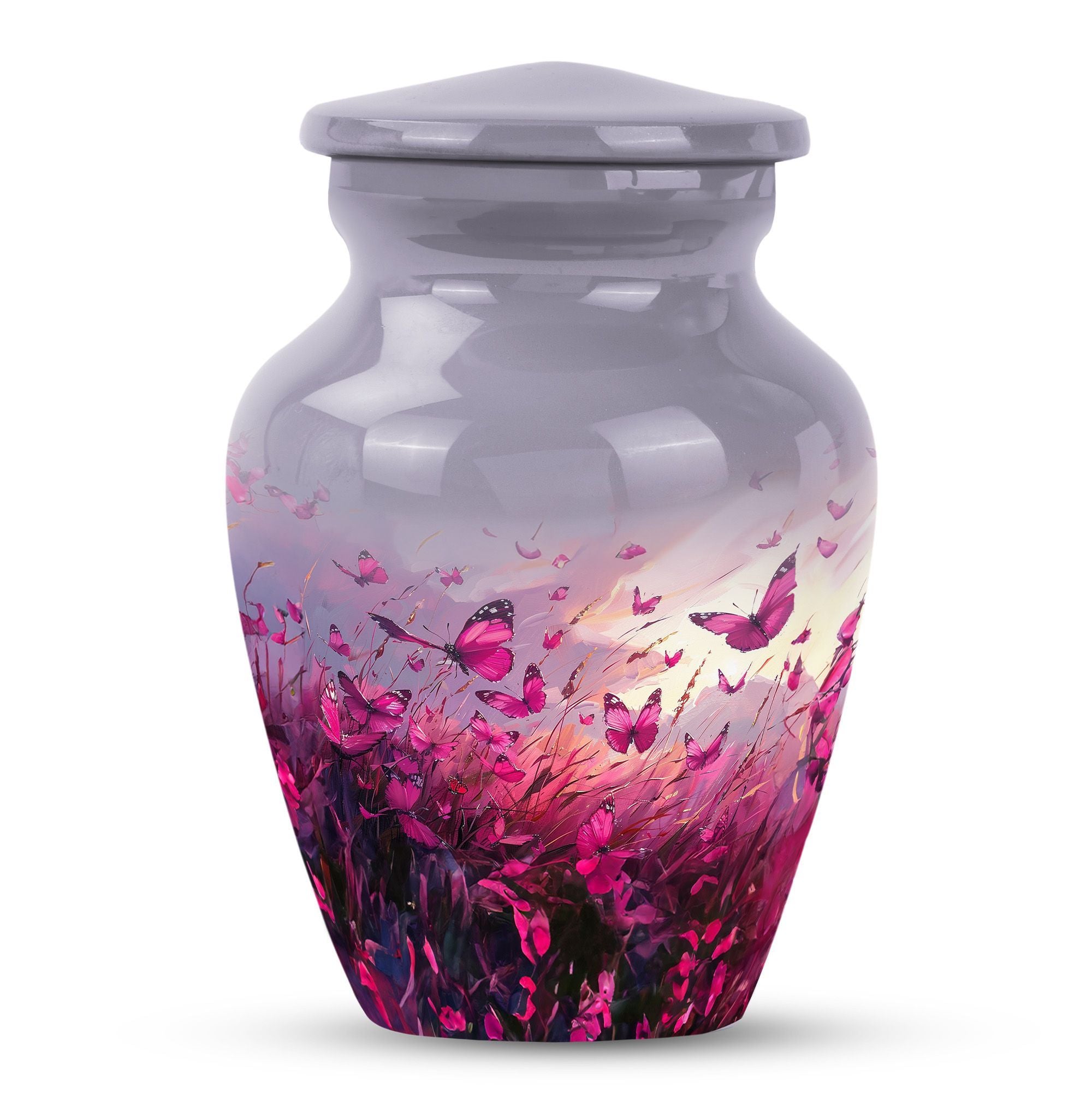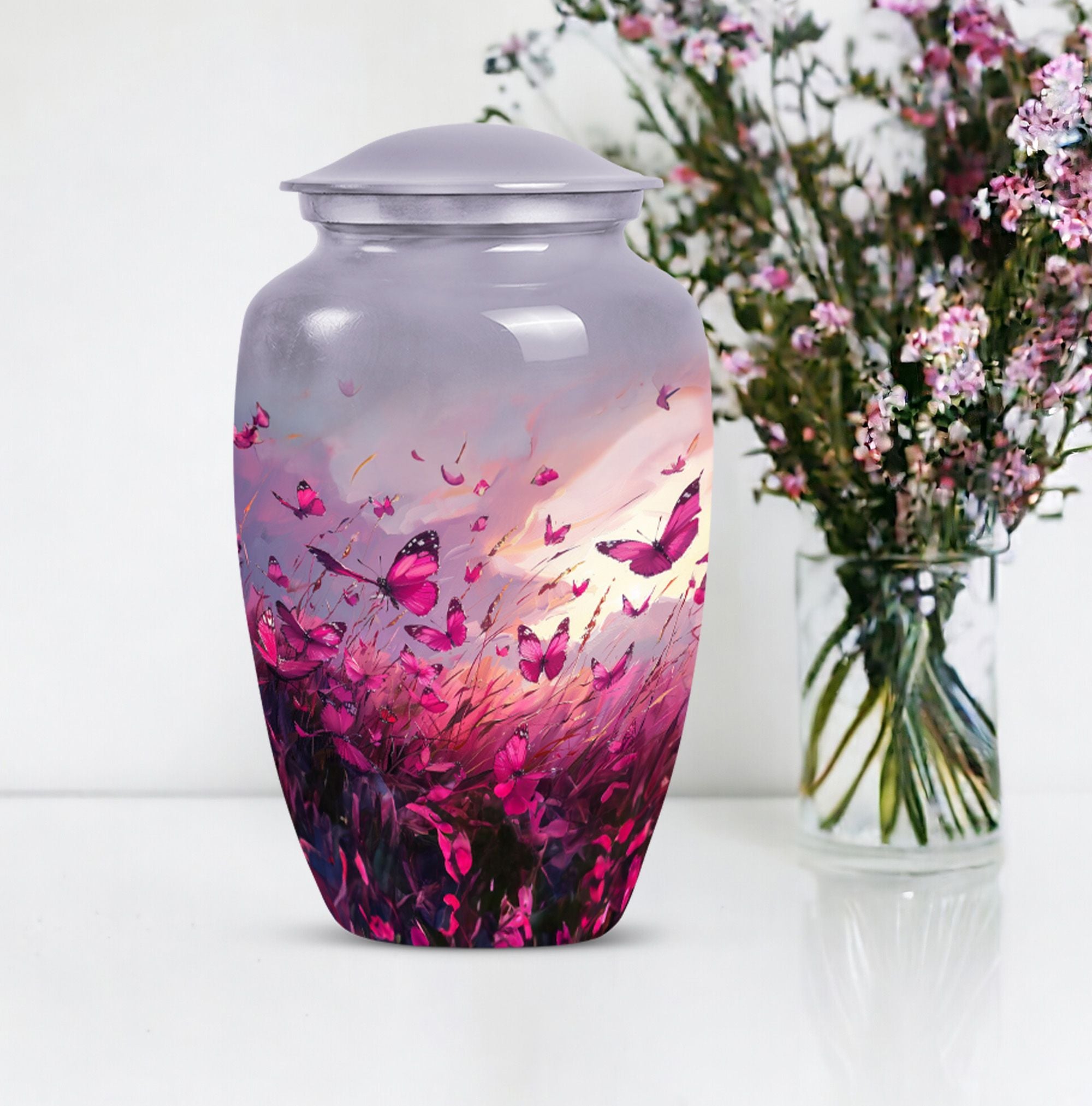 Immerse yourself in the serene world of remembrance with our intricately adorned 'Pink Butterfly Urn'. This large urn is not just a burial cremation urn, it is an artistic ode to the serenity and beauty of life. Cast in high-quality Aluminium, this 10-inch memorial piece comfortably holds 200 cubic inches of ash, a size typically sufficient for an adult. The elegantly themed butterfly urn mirrors the soul's transformation, serving as a comforting symbolic piece. Each pink butterfly urn is complete with a velvet pouch for containment and safekeeping of ashes. Weighing a sturdy 3.3 pounds and 10 inches in height, its formidable presence is a dignified tribute to your loved ones. Moreover, the urn offers a feature of personalization - engrave names or a heartfelt message. Leave behind the generic metal urn for burial and embrace the adult female elegant urn in porcelain - a meaningful way to honor your loved ones in this solemn time. Please search for 'cremation urn' to further explore our wide collection.