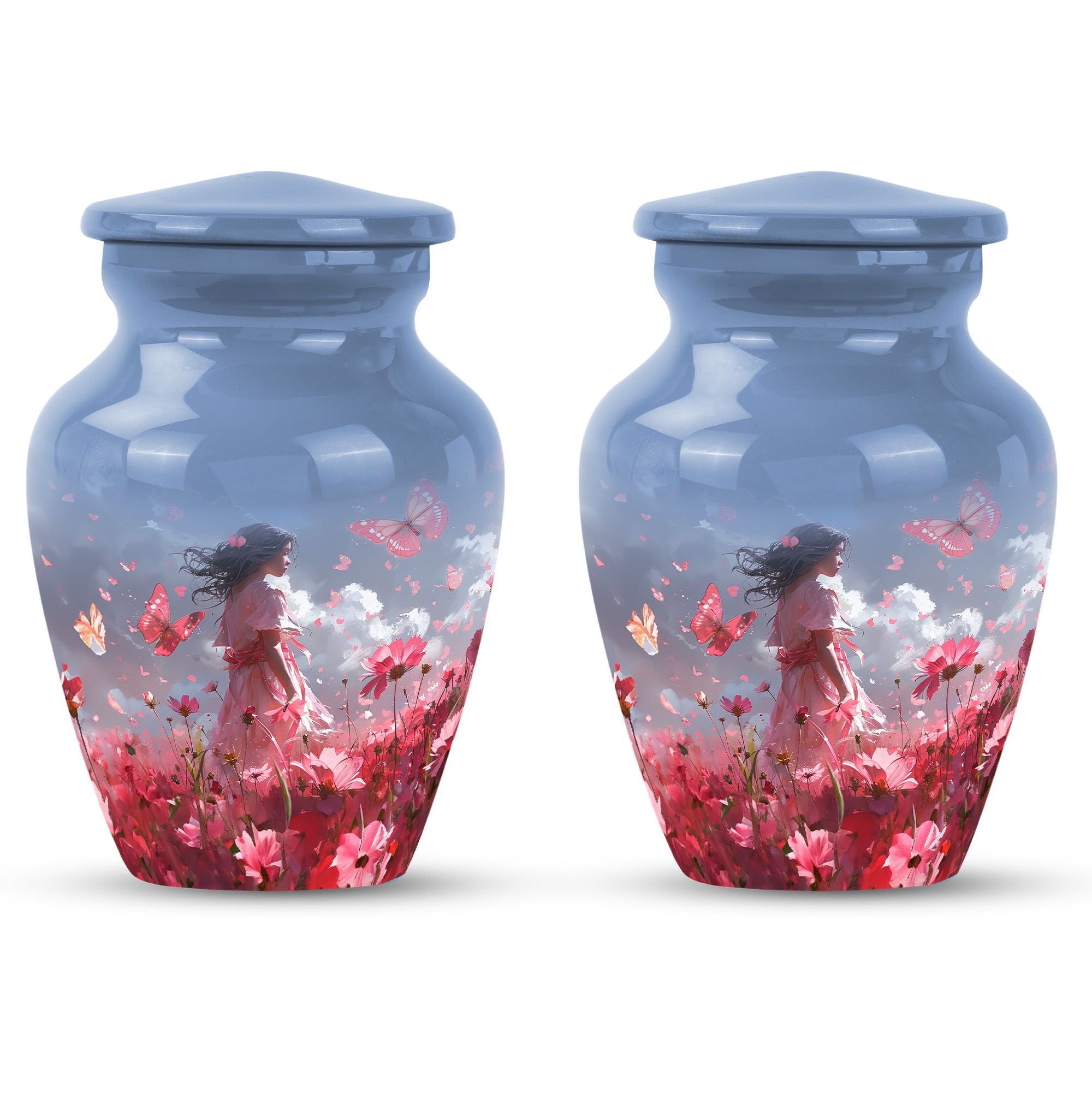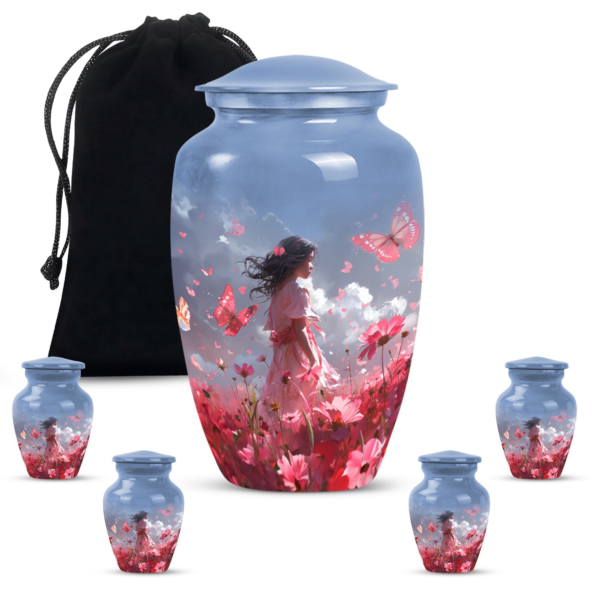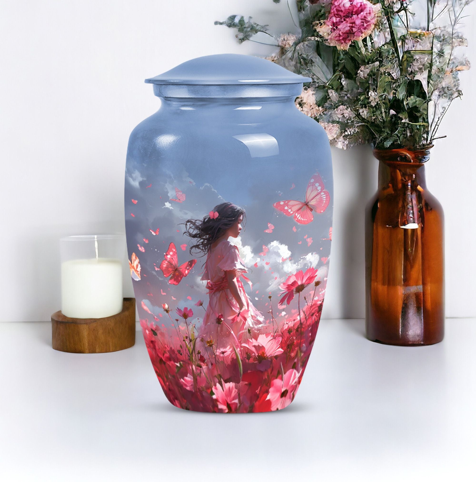 Grace your memories of a loved one, adult male and female alike, with our pink butterfly urn, a testament to life's fleeting beauty. Our 10-inch urn, emerging from aluminium, evokes a classic, enduring sentiment. Its butterfly theme is tastefully executed, paying homage to the transformation and journey of the soul. Weighing 3.3 pounds, this large urn measures precisely 10 inches in height and can accommodate 200 cubic inches of ashes. It excels in every functional aspect and transcends into an aesthetic masterpiece, never distracting from its noble purpose. The urn comes with a velvet pouch, treating your loved one's ashes with dignity and respect. And for a truly touching tribute, this urn can be personalized with engraved names. Preferred keywords for this product are 'pink butterfly urn,' 'memorial urns,' 'funeral urns for human ashes,' and 'funeral urns for adult ashes women large.' Make those heartfelt moments count with our dignified urns.