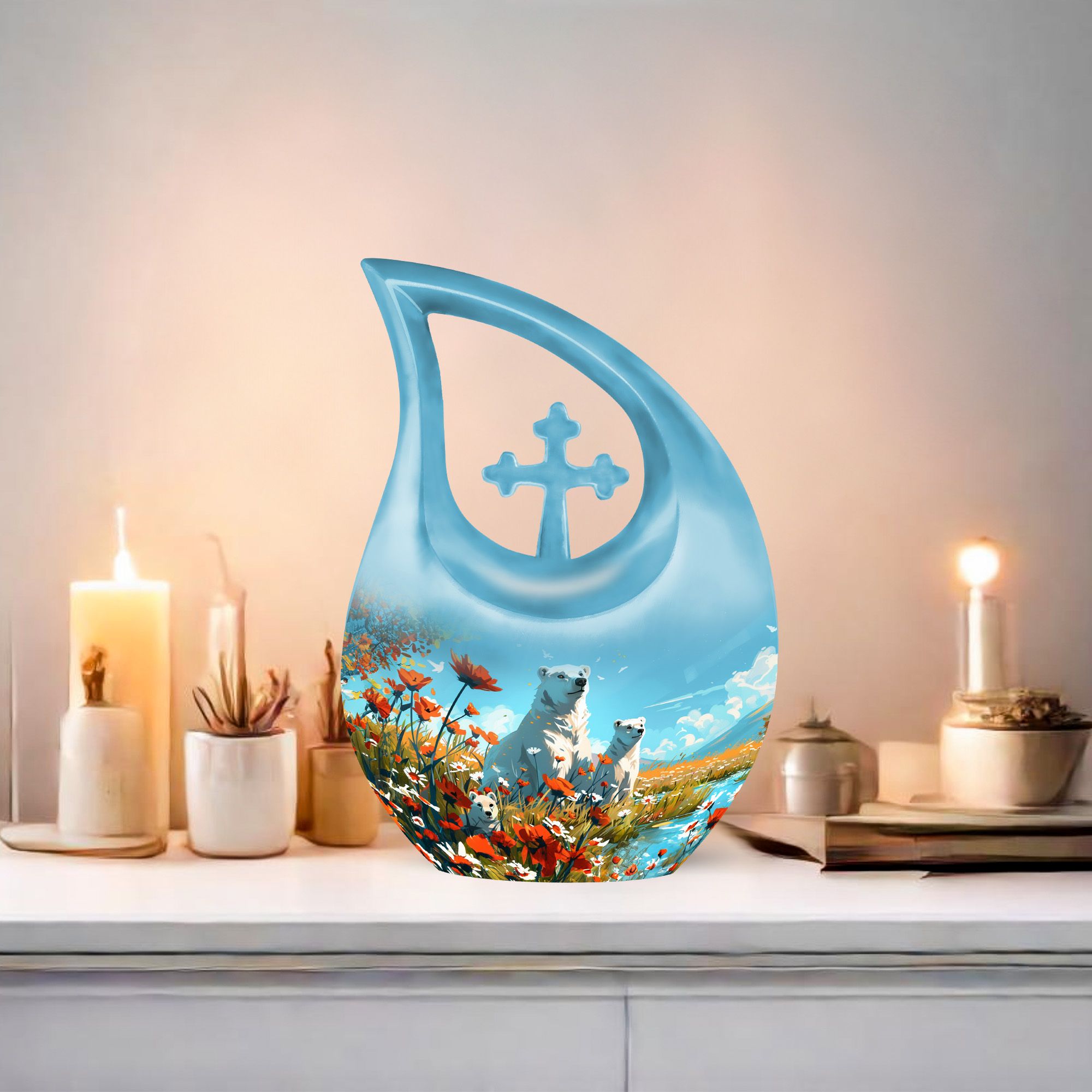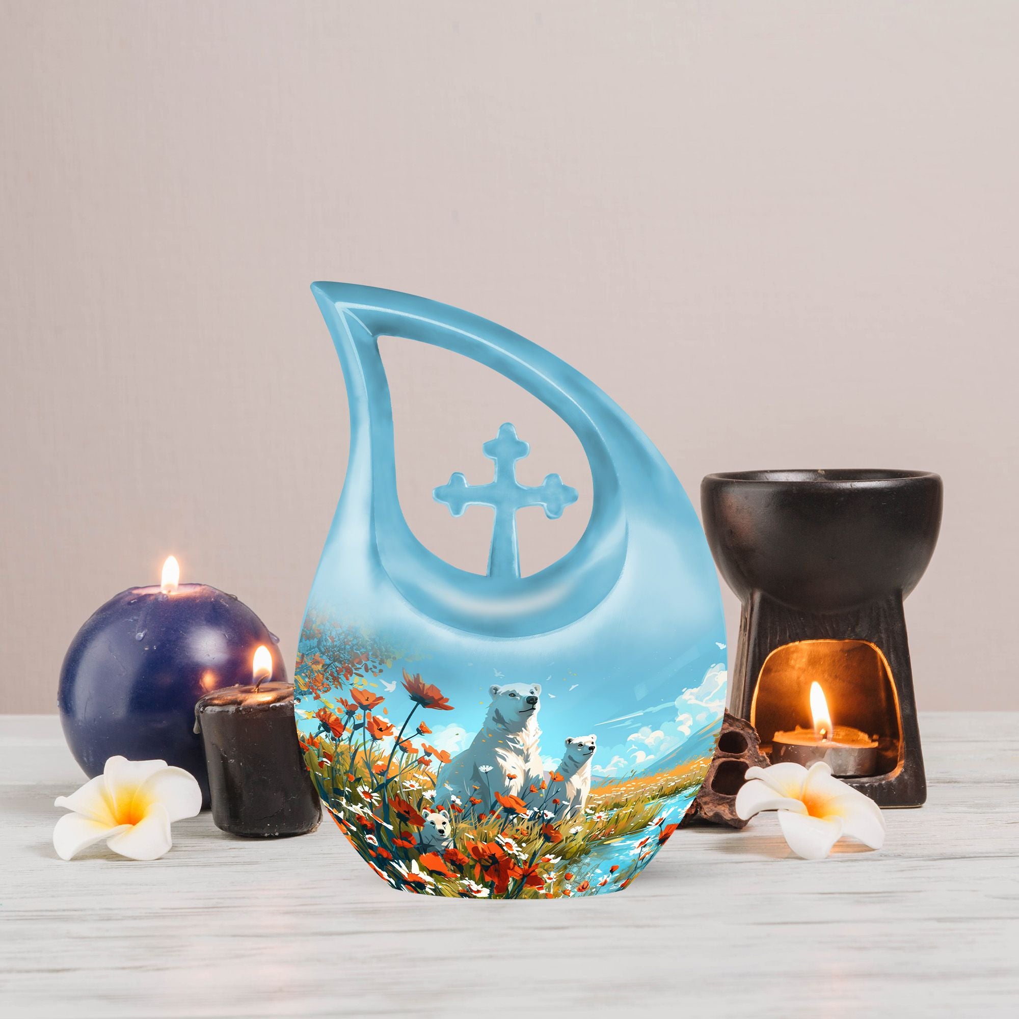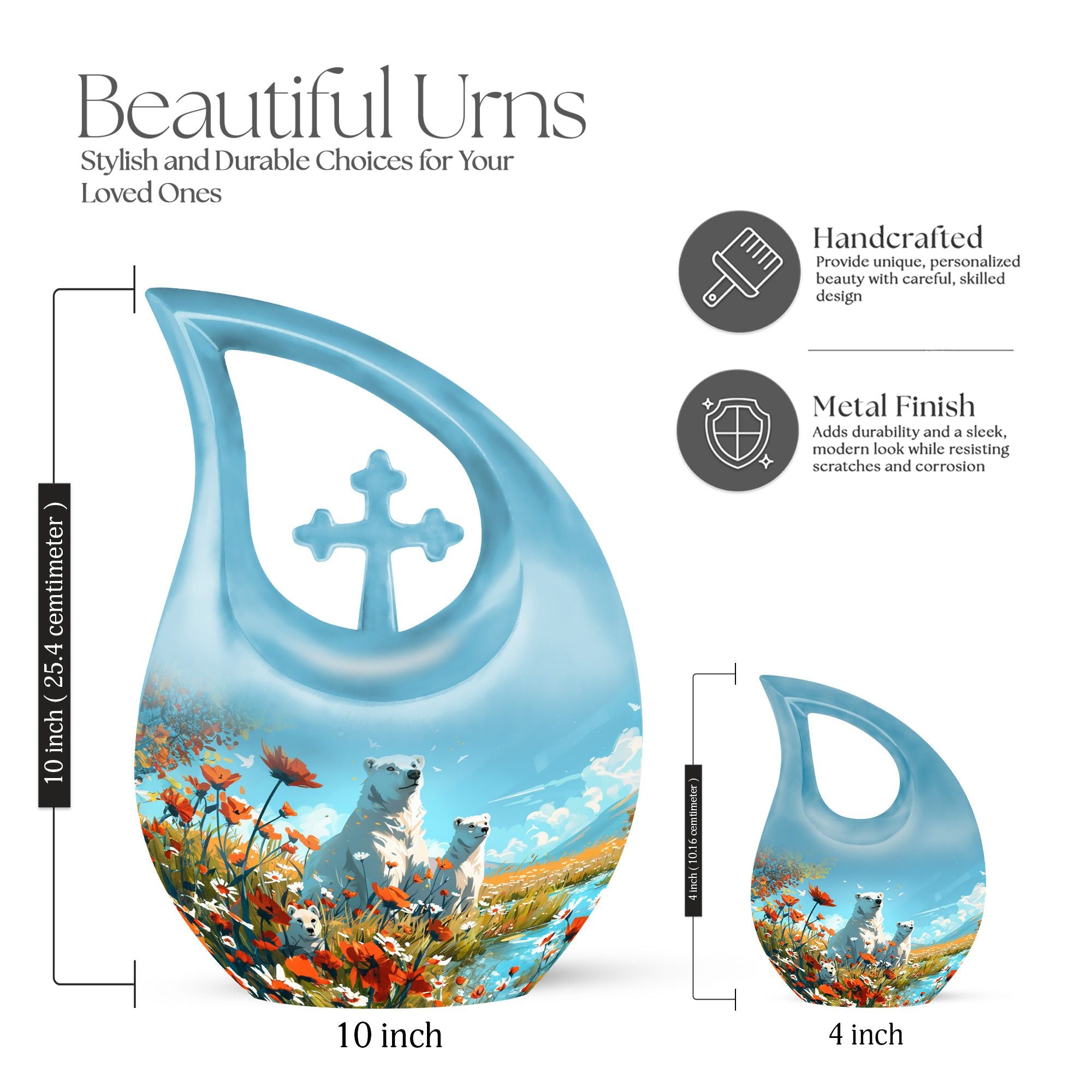 Crafted from durable aluminium, this 10-inch urn features a serene polar bear motif symbolizing purity, strength, and peaceful protection. Its smooth finish and secure screw-top lid ensure long-lasting safety, making it ideal for funeral urns for human ashes, funeral cremation urns for ashes, or families choosing funeral adult urn options. Whether used at home, during a service, or for long-term display, it provides timeless beauty and dependable craftsmanship.