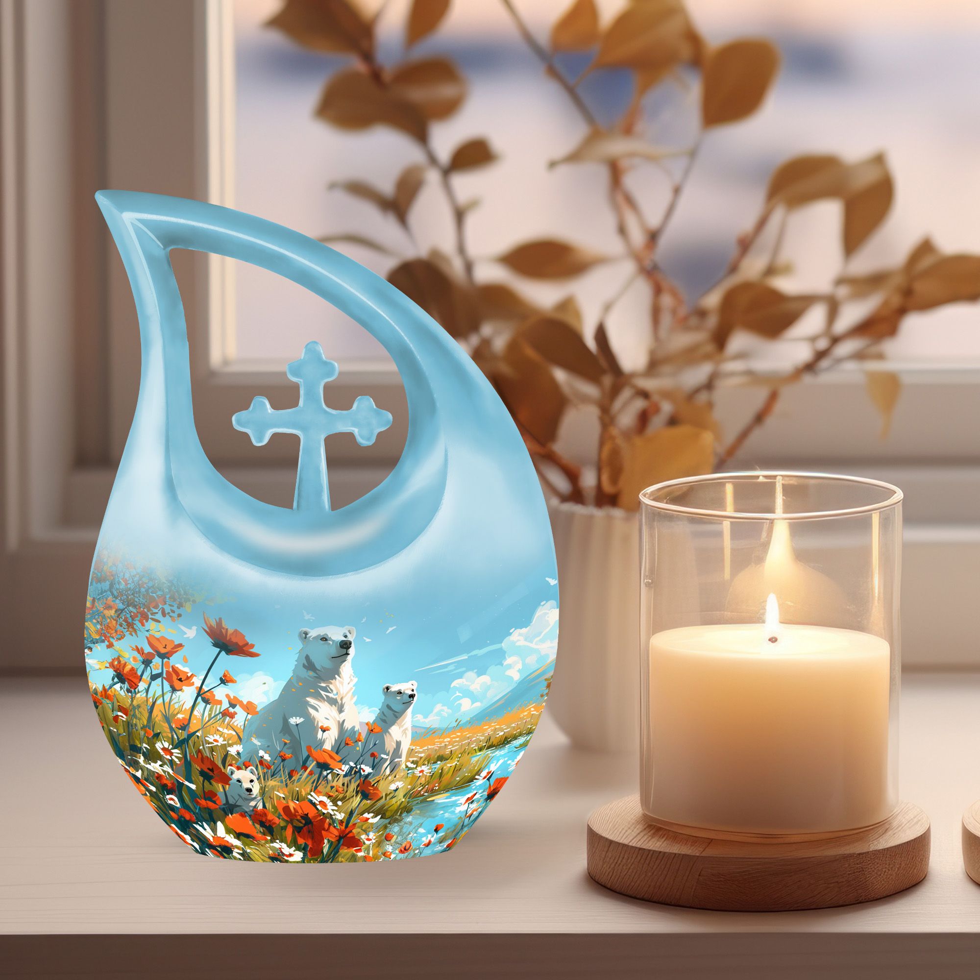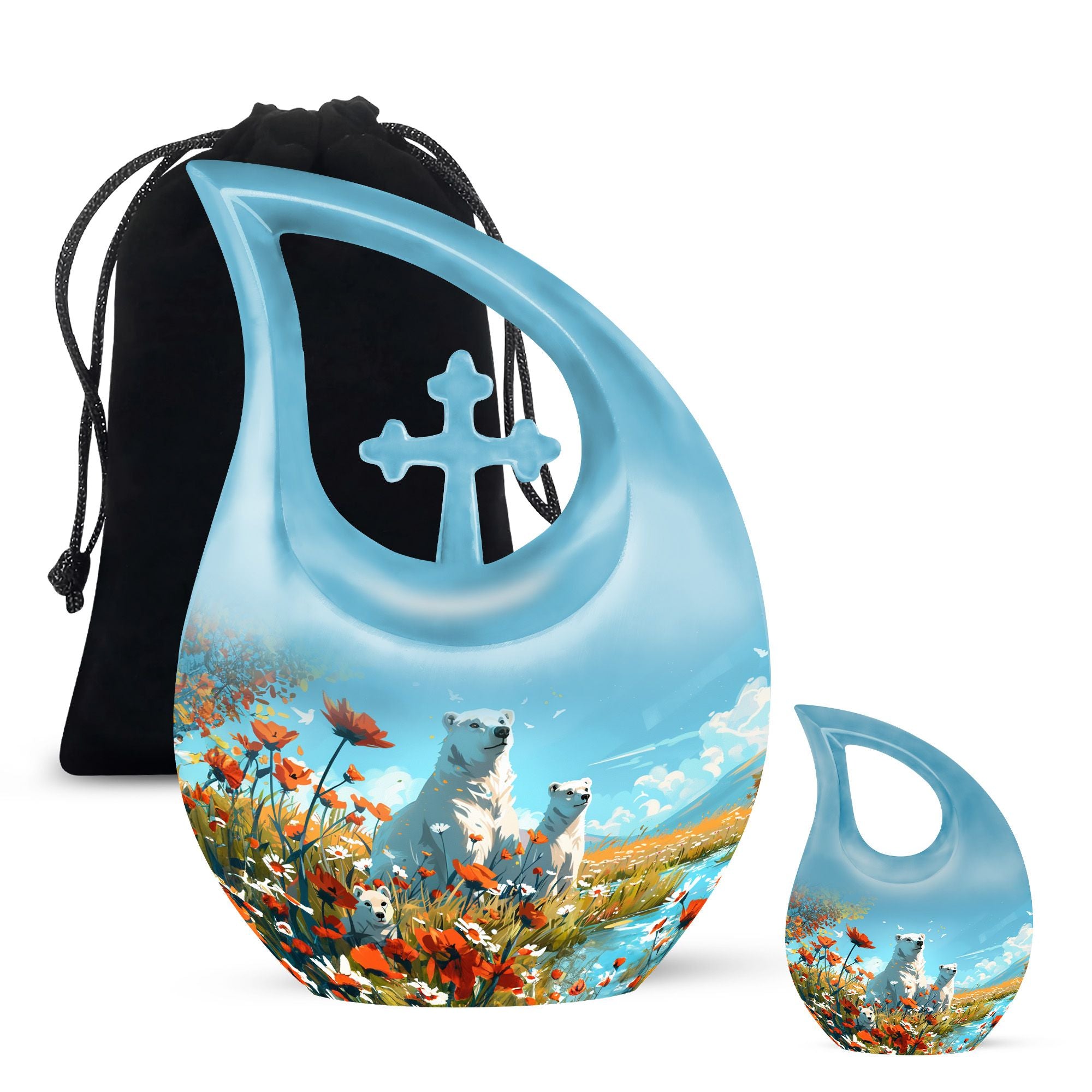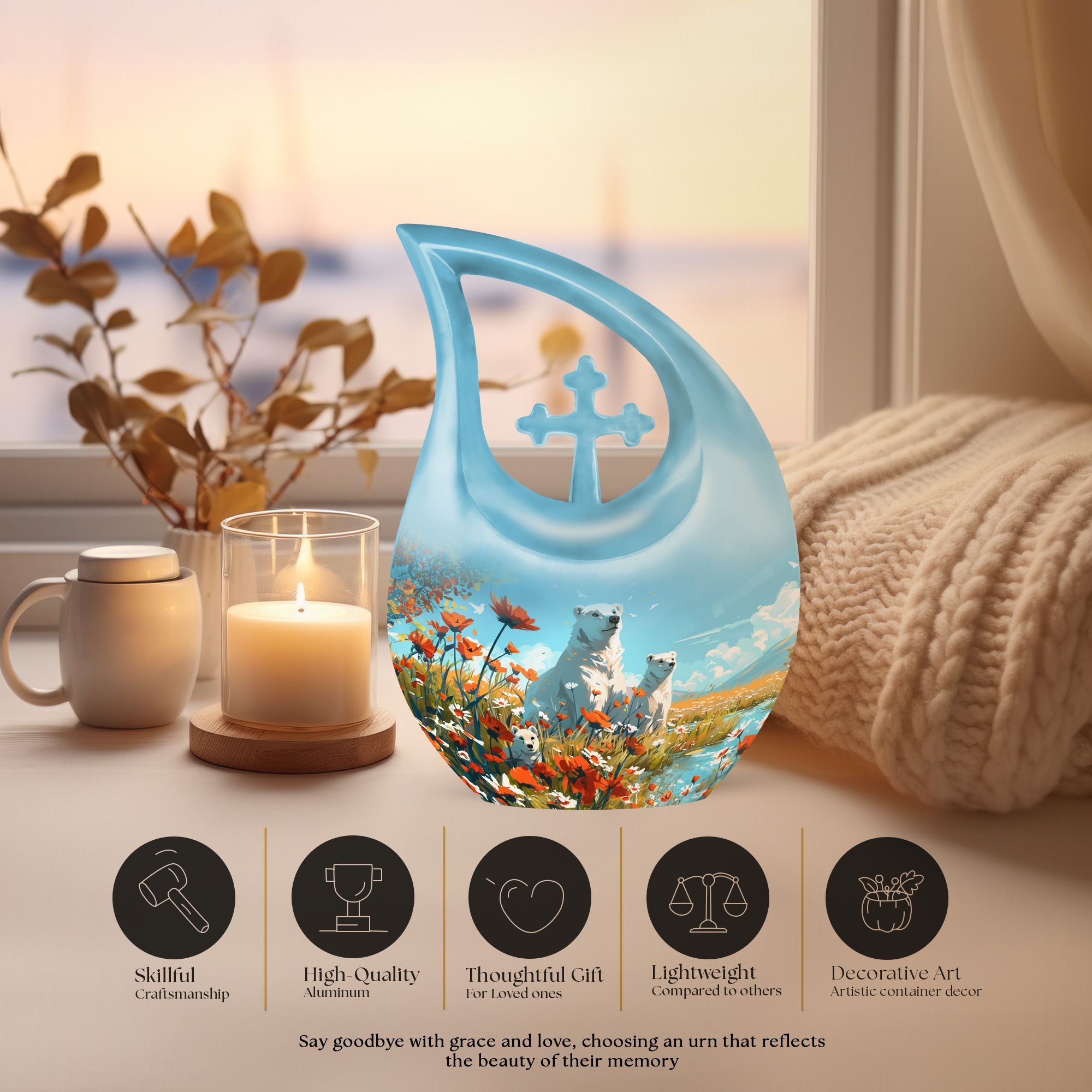 Crafted from durable aluminium, this 10-inch urn features a serene polar bear motif symbolizing purity, strength, and peaceful protection. Its smooth finish and secure screw-top lid ensure long-lasting safety, making it ideal for funeral urns for human ashes, funeral cremation urns for ashes, or families choosing funeral adult urn options. Whether used at home, during a service, or for long-term display, it provides timeless beauty and dependable craftsmanship.
