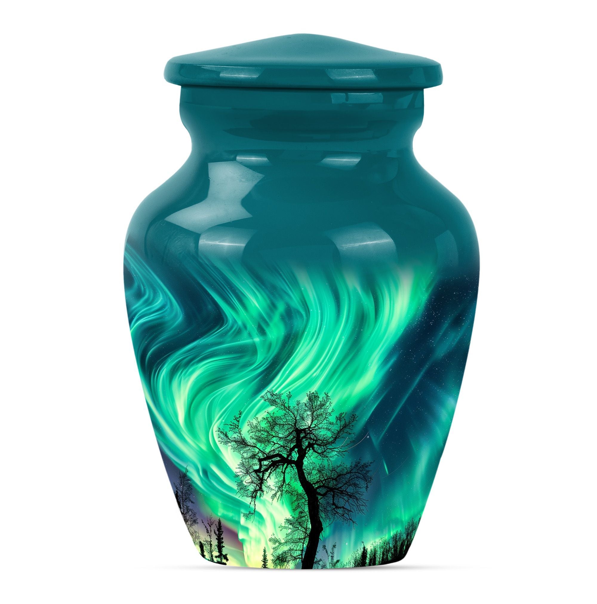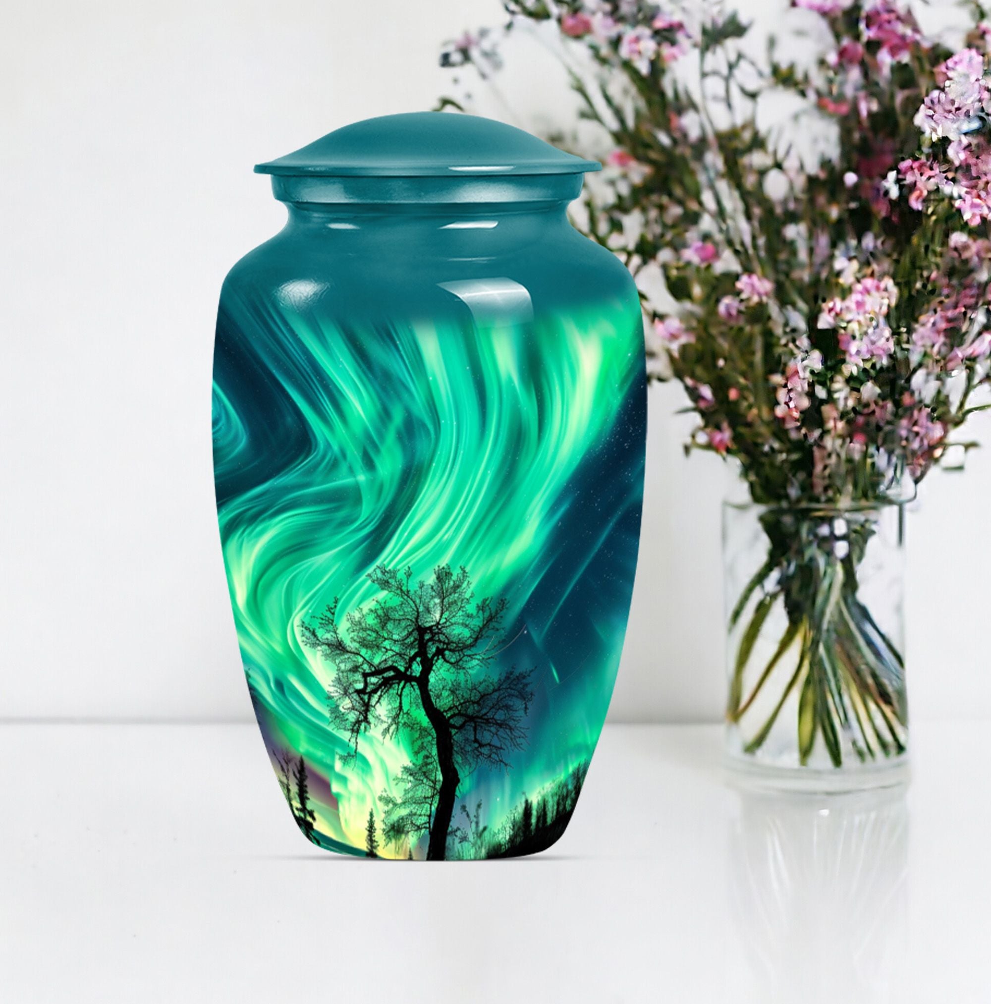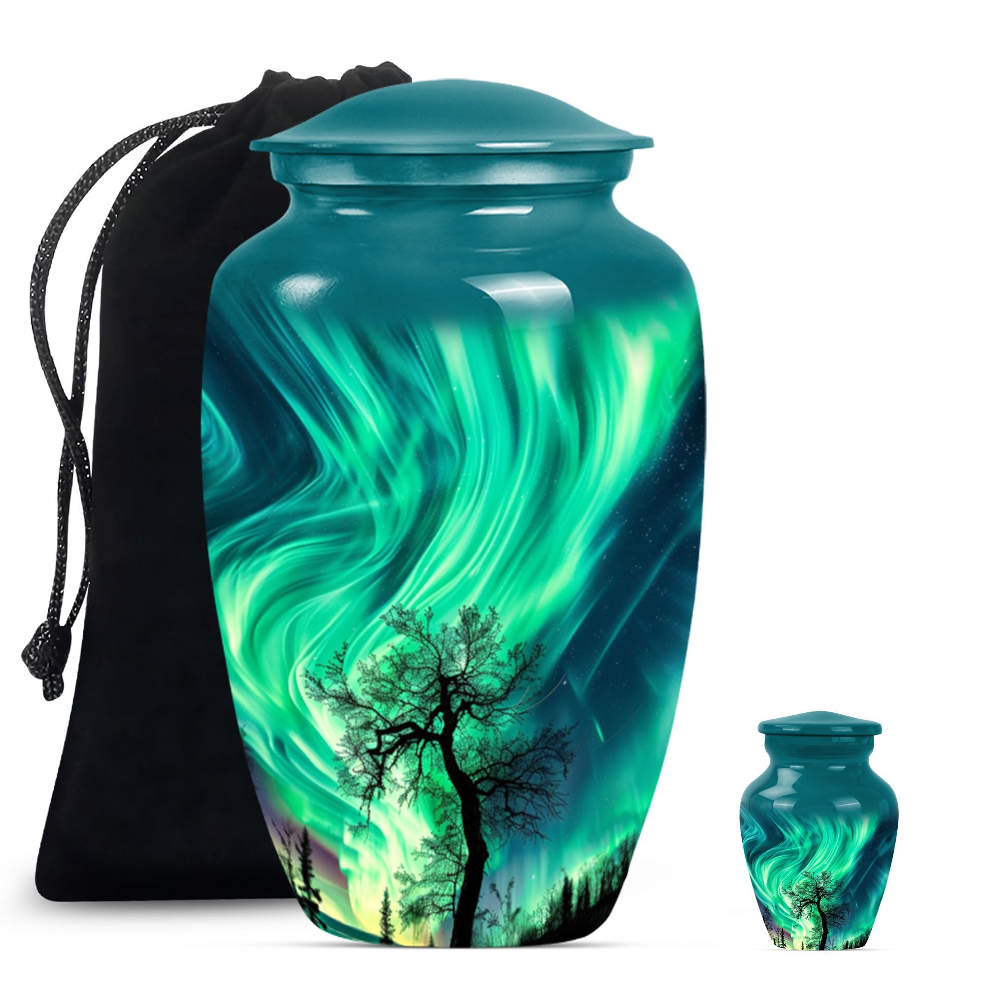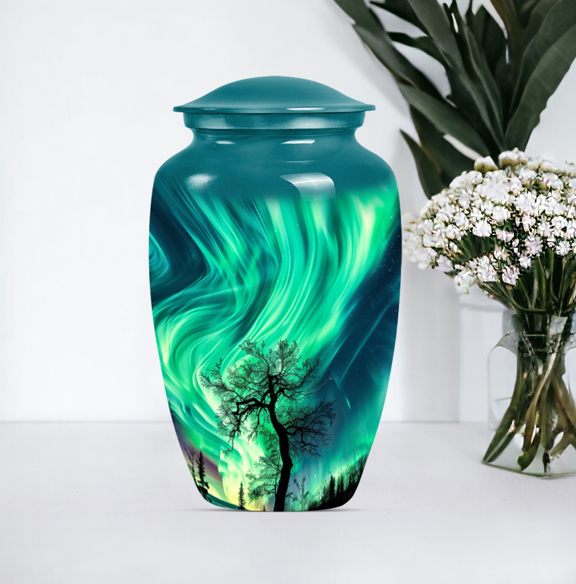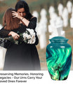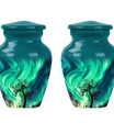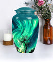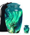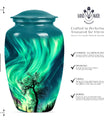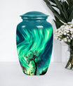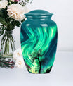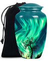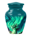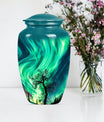 Introducing our 'Northern Lights Urn', a dignified resting place that reflects a lifetime of unique moments and memories. Designed to stand 10 inches tall, it fits ideally under the category of large urns. Constructed from robust aluminium, this memorial urn for burial in ground harnesses a blend of eternity and charm that can hold up to 200 cubic inches of ashes. Styled with an abstract theme, its classic urn design stands as an embodiment of eternal solace and tranquillity. Alongside, our urn comes securely packaged with a velvet pouch, assuring confidential containment of the ashes. Weighing 3.3 pounds, it tactfully symbolises the precious weight of your loved one's memories. You also have the option to further compensate it with engraved names, thus adding a special touch of identity. For those seeking memorial urns with a balance of aesthetic appeal and emotional significance, the Northern Lights Urn is an excellent choice.