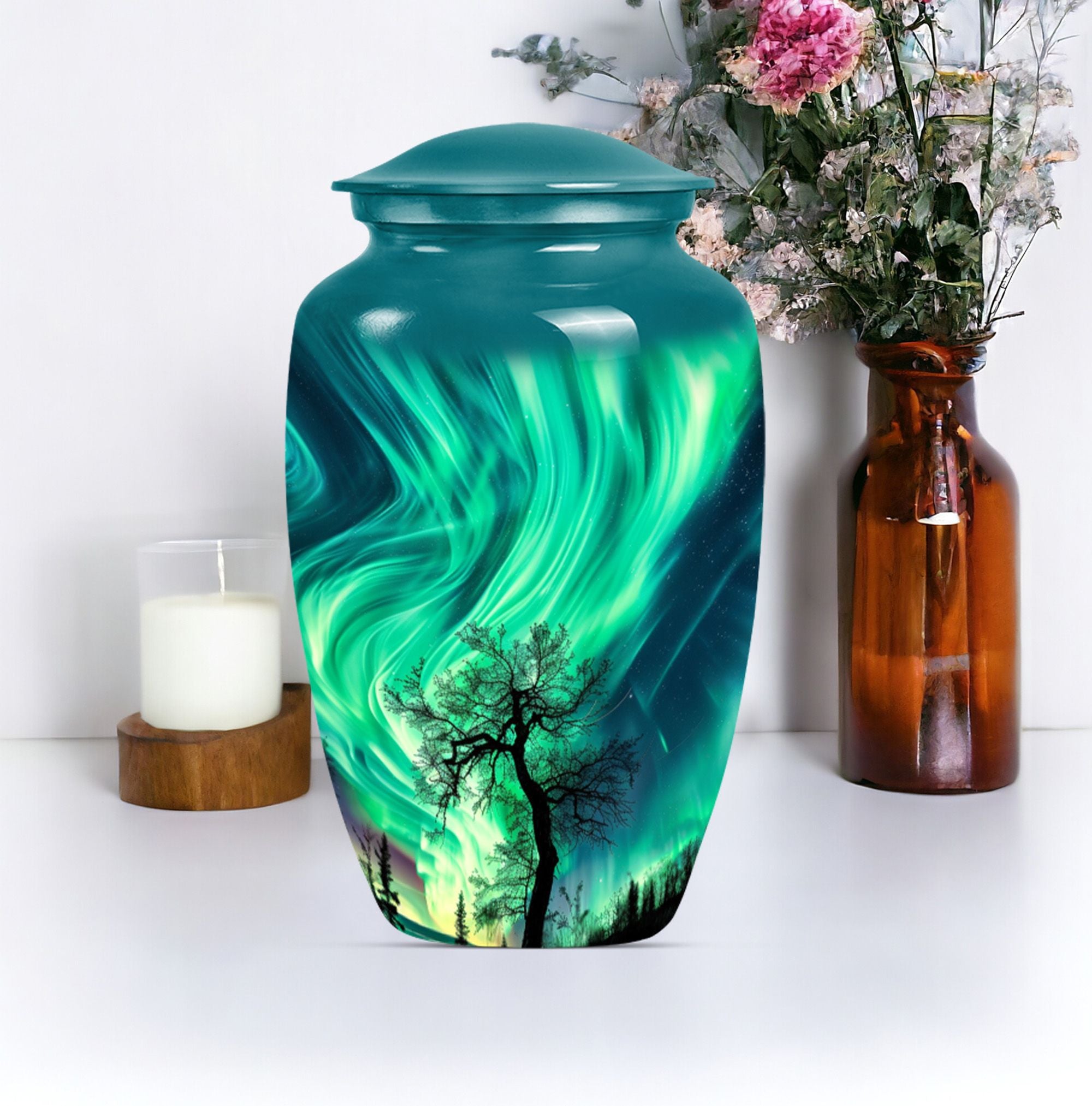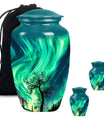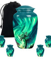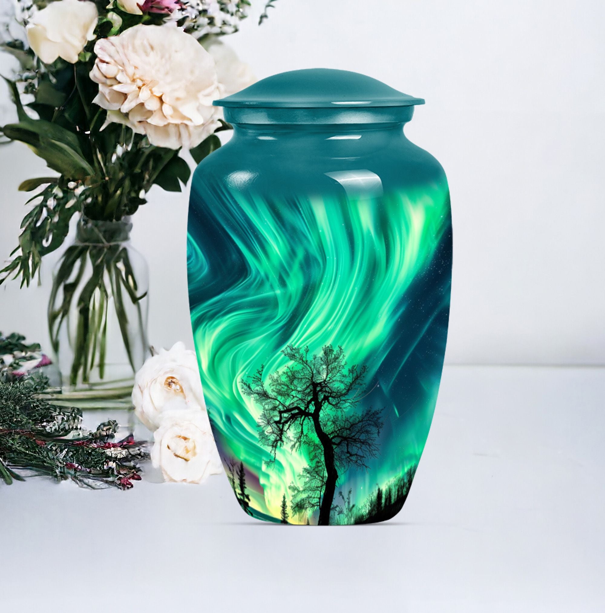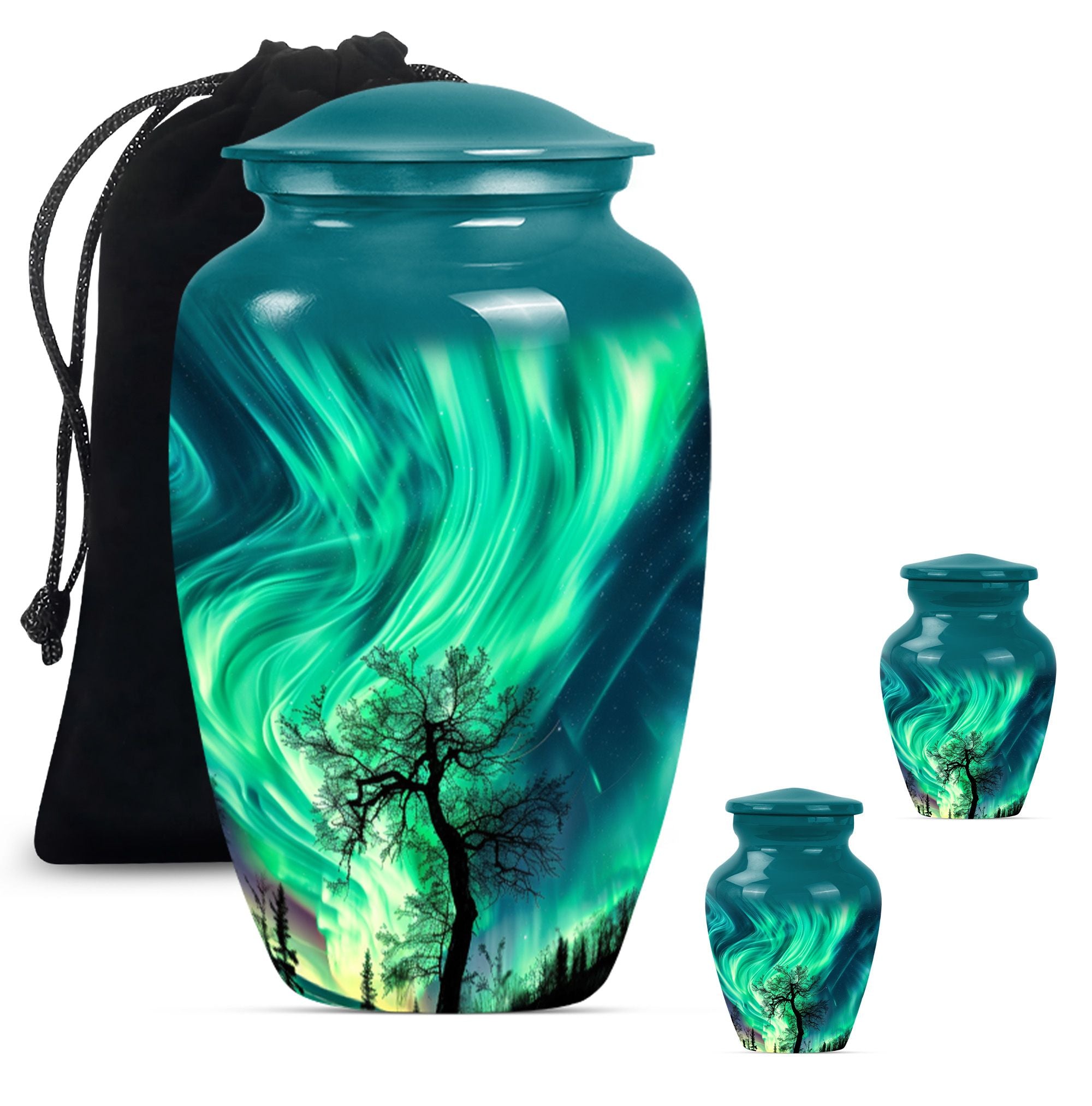 Introducing our 'Northern Lights Urn', a dignified resting place that reflects a lifetime of unique moments and memories. Designed to stand 10 inches tall, it fits ideally under the category of large urns. Constructed from robust aluminium, this memorial urn for burial in ground harnesses a blend of eternity and charm that can hold up to 200 cubic inches of ashes. Styled with an abstract theme, its classic urn design stands as an embodiment of eternal solace and tranquillity. Alongside, our urn comes securely packaged with a velvet pouch, assuring confidential containment of the ashes. Weighing 3.3 pounds, it tactfully symbolises the precious weight of your loved one's memories. You also have the option to further compensate it with engraved names, thus adding a special touch of identity. For those seeking memorial urns with a balance of aesthetic appeal and emotional significance, the Northern Lights Urn is an excellent choice.