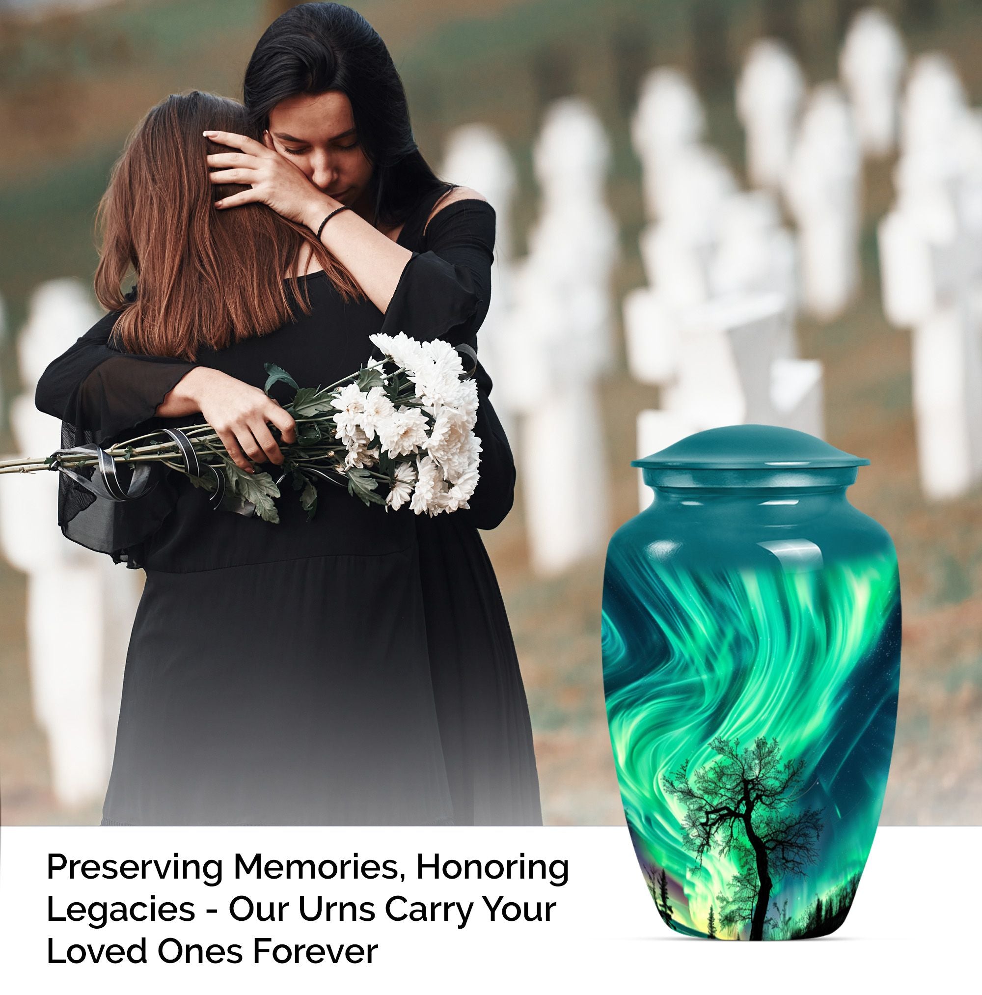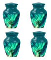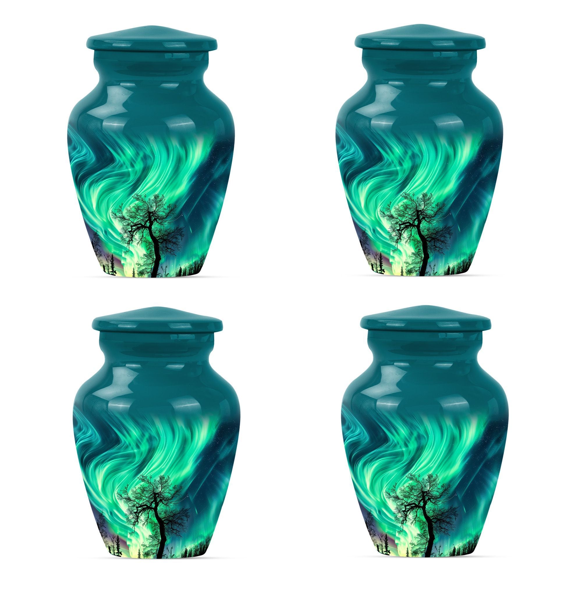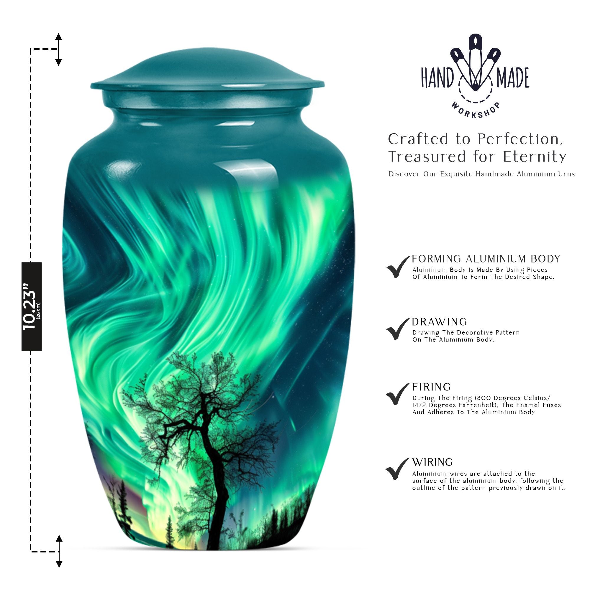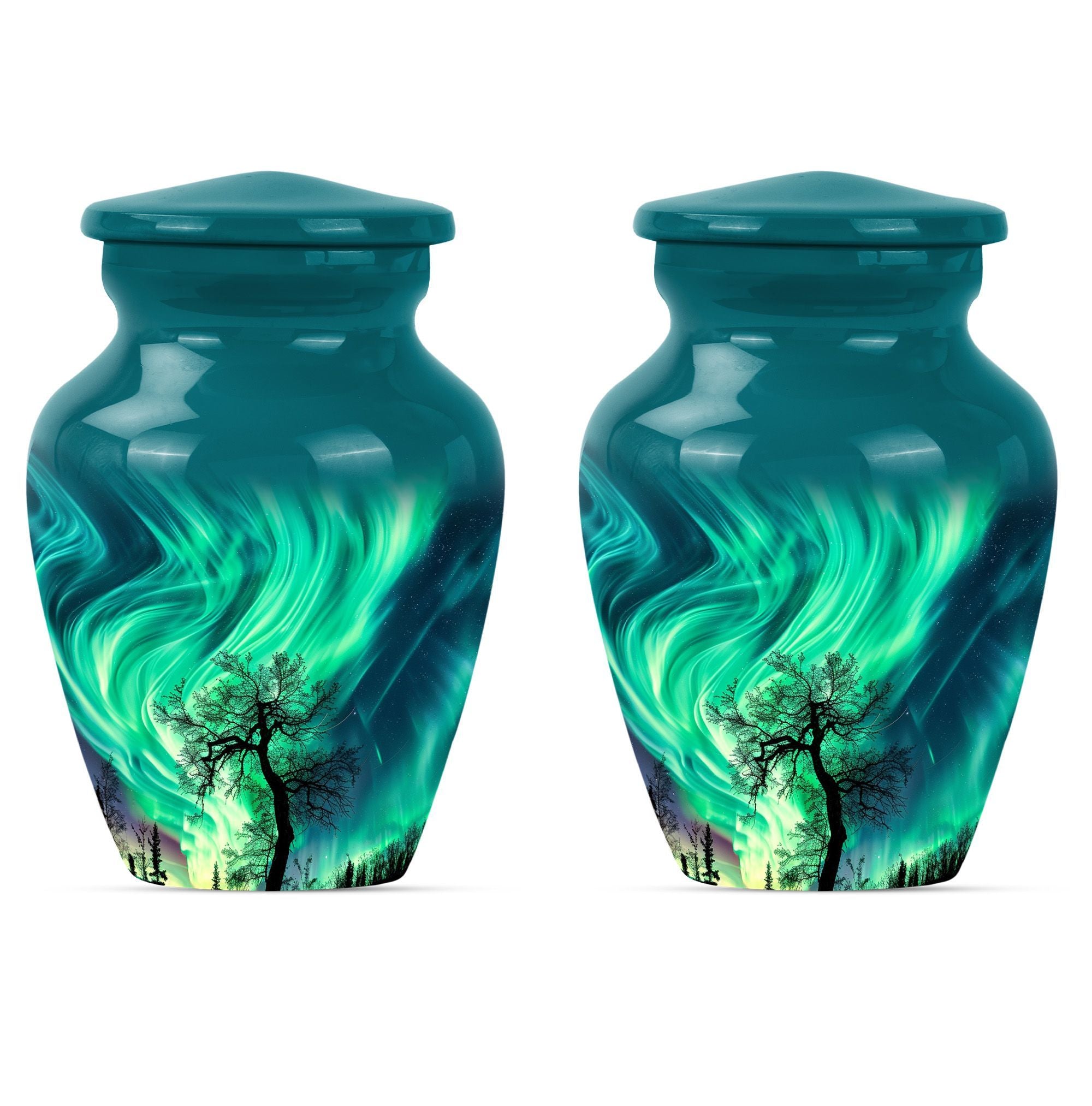 Introducing our 'Northern Lights Urn', a dignified resting place that reflects a lifetime of unique moments and memories. Designed to stand 10 inches tall, it fits ideally under the category of large urns. Constructed from robust aluminium, this memorial urn for burial in ground harnesses a blend of eternity and charm that can hold up to 200 cubic inches of ashes. Styled with an abstract theme, its classic urn design stands as an embodiment of eternal solace and tranquillity. Alongside, our urn comes securely packaged with a velvet pouch, assuring confidential containment of the ashes. Weighing 3.3 pounds, it tactfully symbolises the precious weight of your loved one's memories. You also have the option to further compensate it with engraved names, thus adding a special touch of identity. For those seeking memorial urns with a balance of aesthetic appeal and emotional significance, the Northern Lights Urn is an excellent choice.
