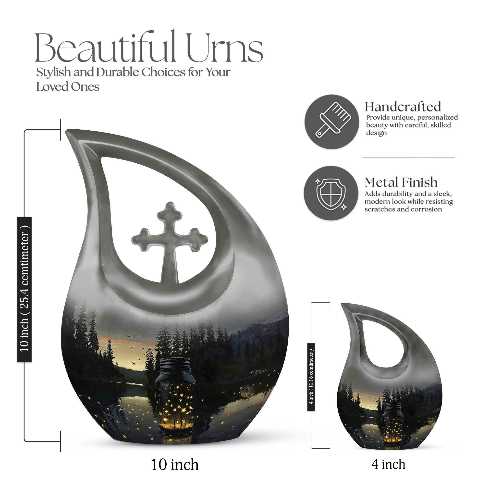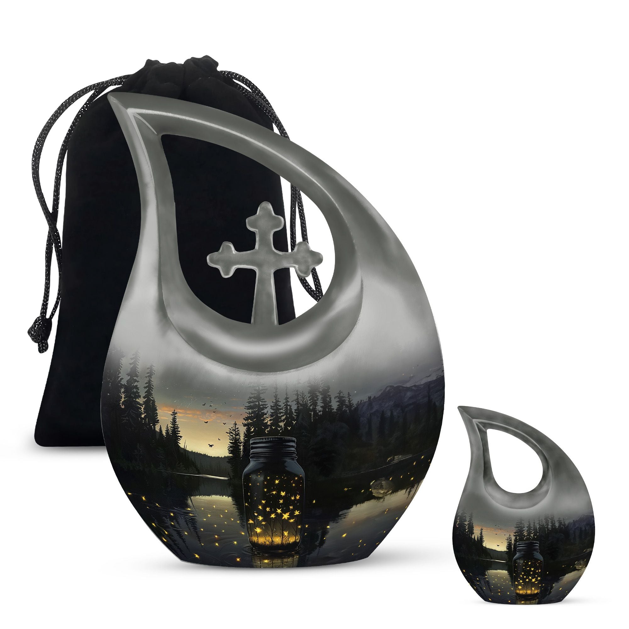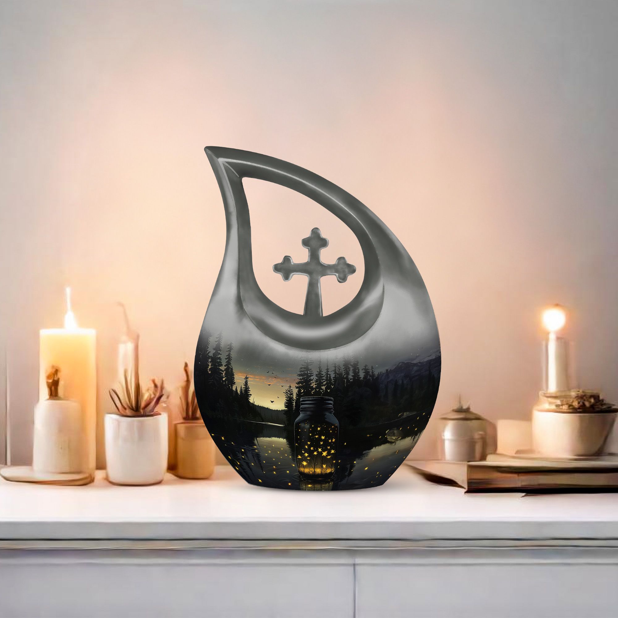 Crafted in a unique flame-teardrop shape with a cross cutout, this Whispering Lights Large Adult Urn For Human Ashes is ideal for those who cherished nature, twilight walks, or the magic of quiet moments. The fireflies symbolize the light we carry, even in darkness—making this urn a powerful tribute for either a Large Urn For Mom, dad, spouse, or friend.