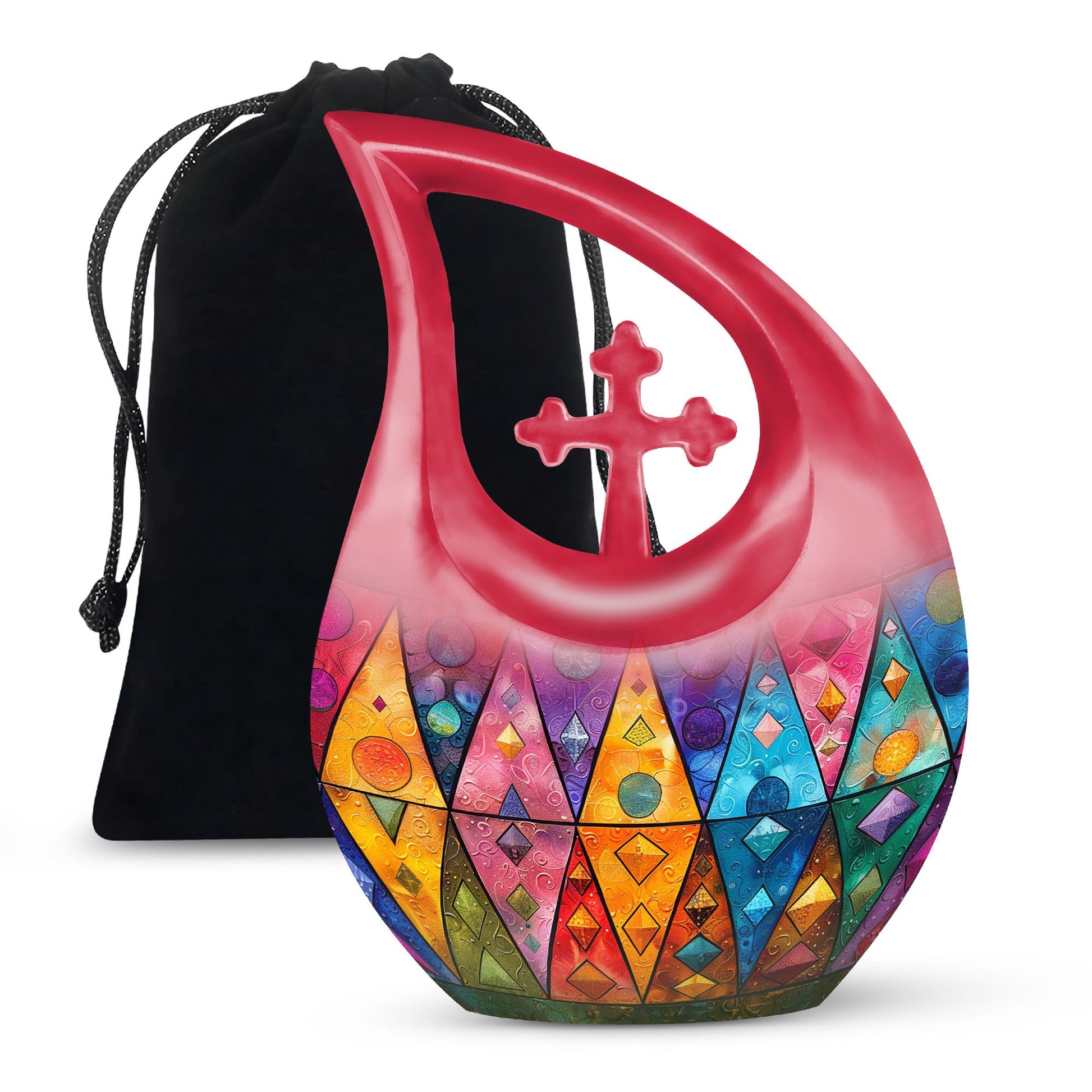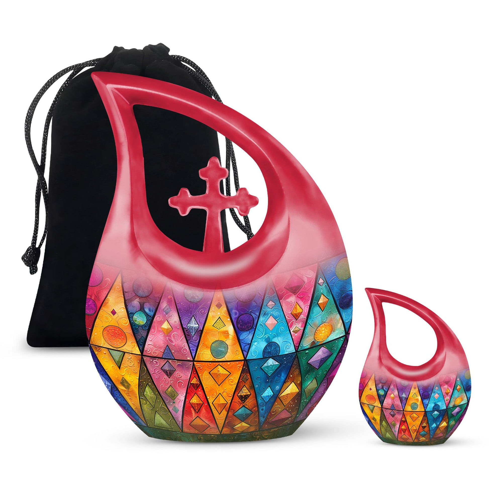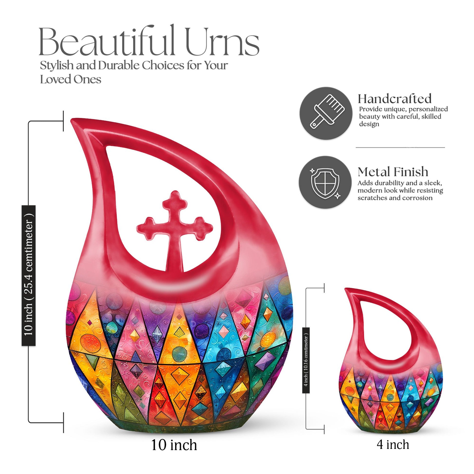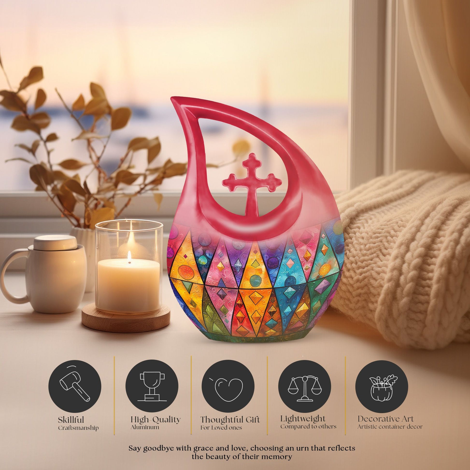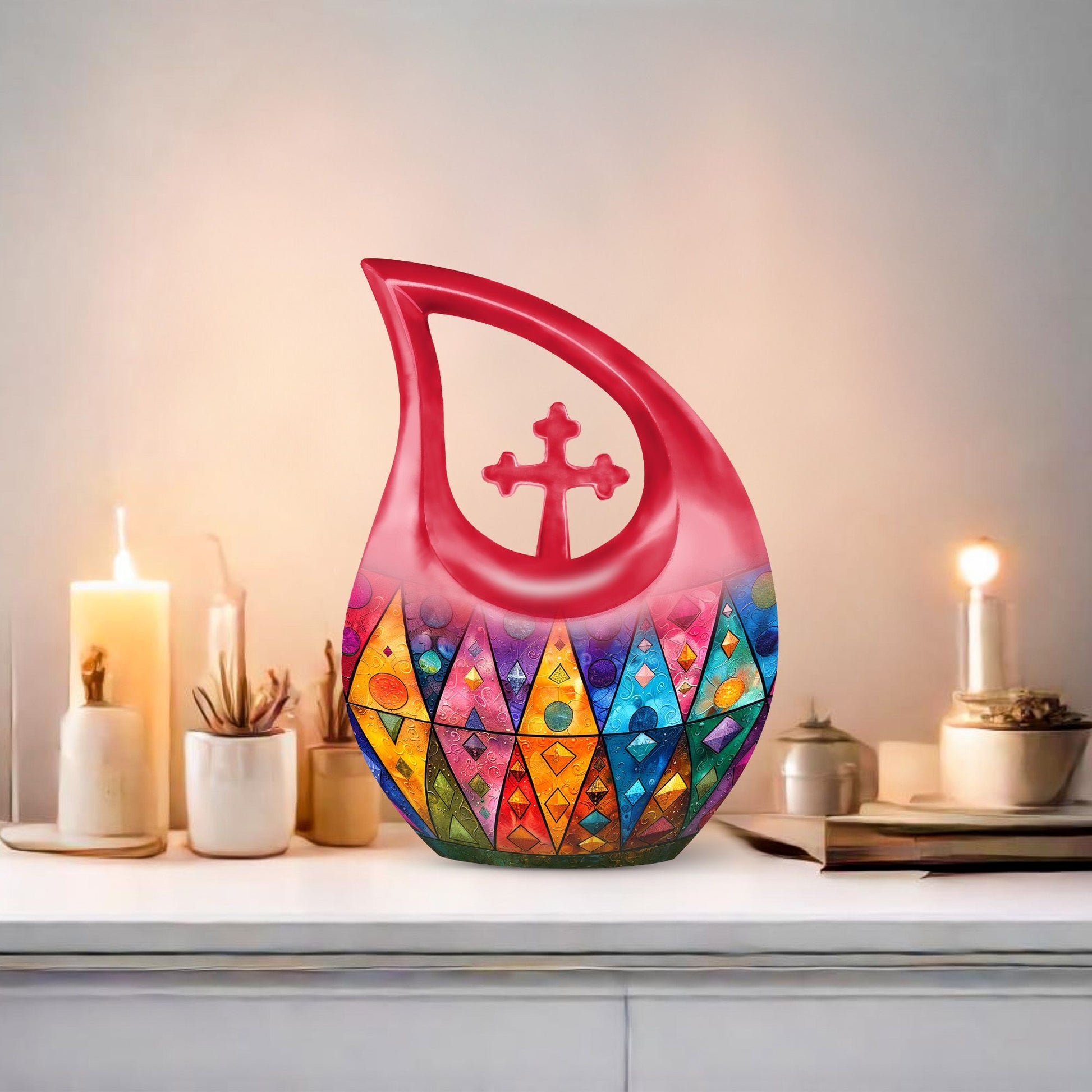 Unite the transcendent beauty of the Prismatic Mosaic Urn with your precious memories. This large urn, made of durable aluminium, stands 10 inches tall and has a capacity of 200 cubic inches, making it a fitting tribute for your loved one. Its unique Cross Drop design, part of the Prismatic Mosaic theme, adds an exquisite touch, setting it apart from standard Outdoor Cremation Urns. Weighing just 3.3 pounds, this memorial urn easy to handle and transport. With the added option to engrave names, this pet urn vase allows you to add a personal touch. As a thoughtful addition, each urn comes with a velvet pouch for careful containment of ashes. As a testament to your loved one or beloved pet, this urn is a wonderful selection. Let your search for 'Outdoor Urns' or 'Urns For Women'S Ashes' end here with our Prismatic Mosaic Urn, a dignified and loving resting place.