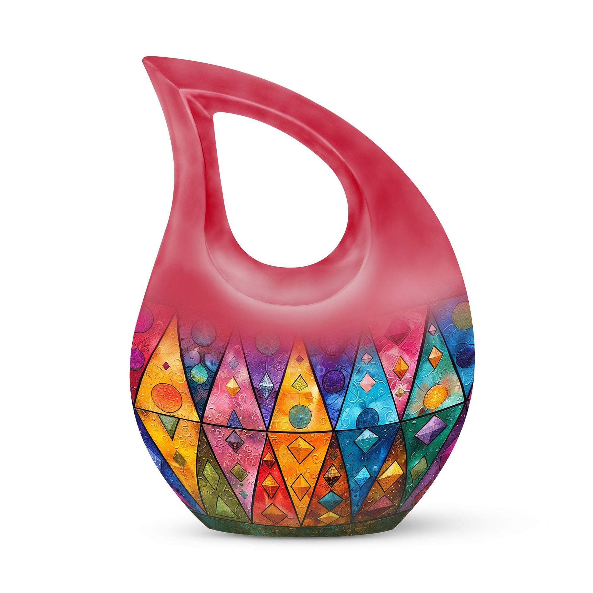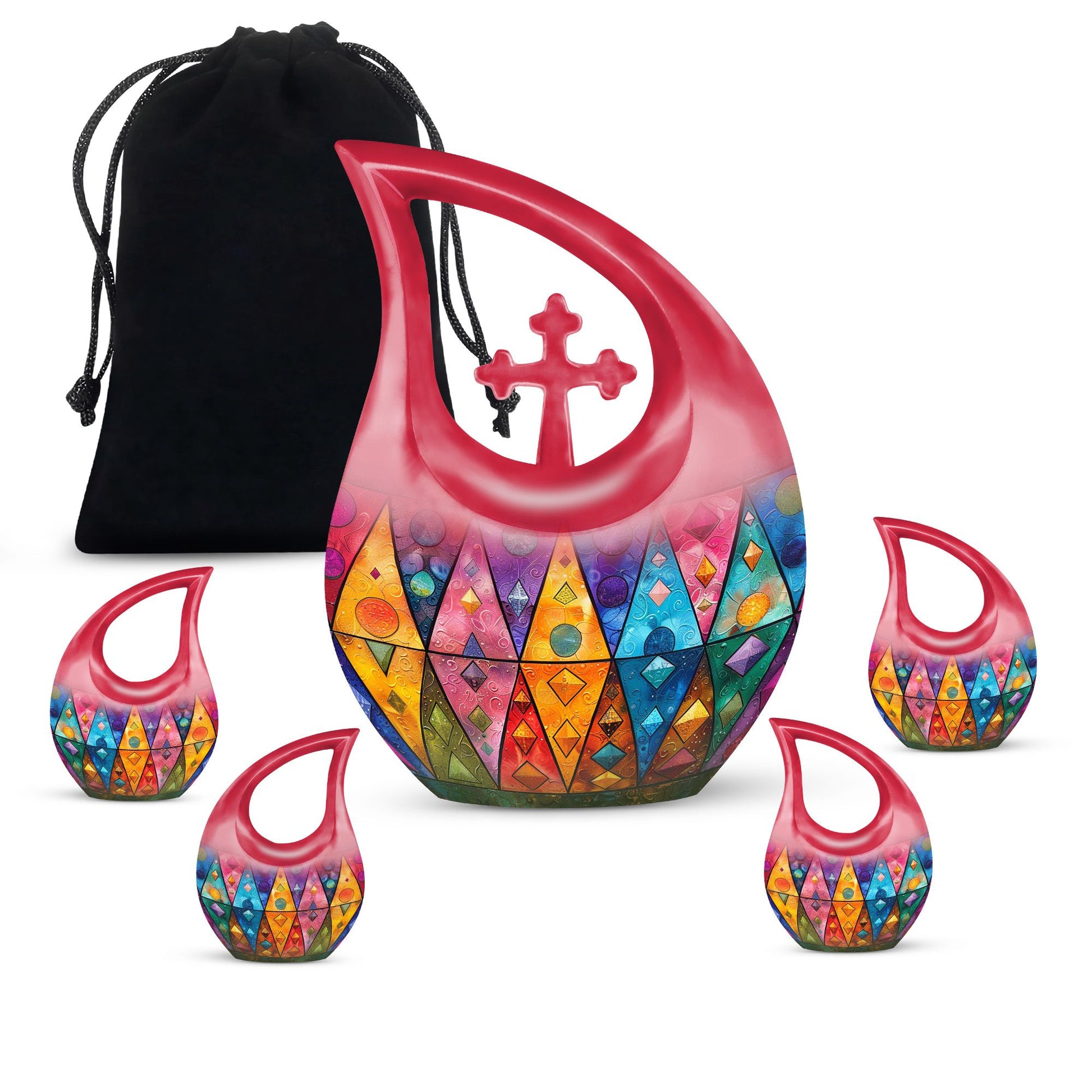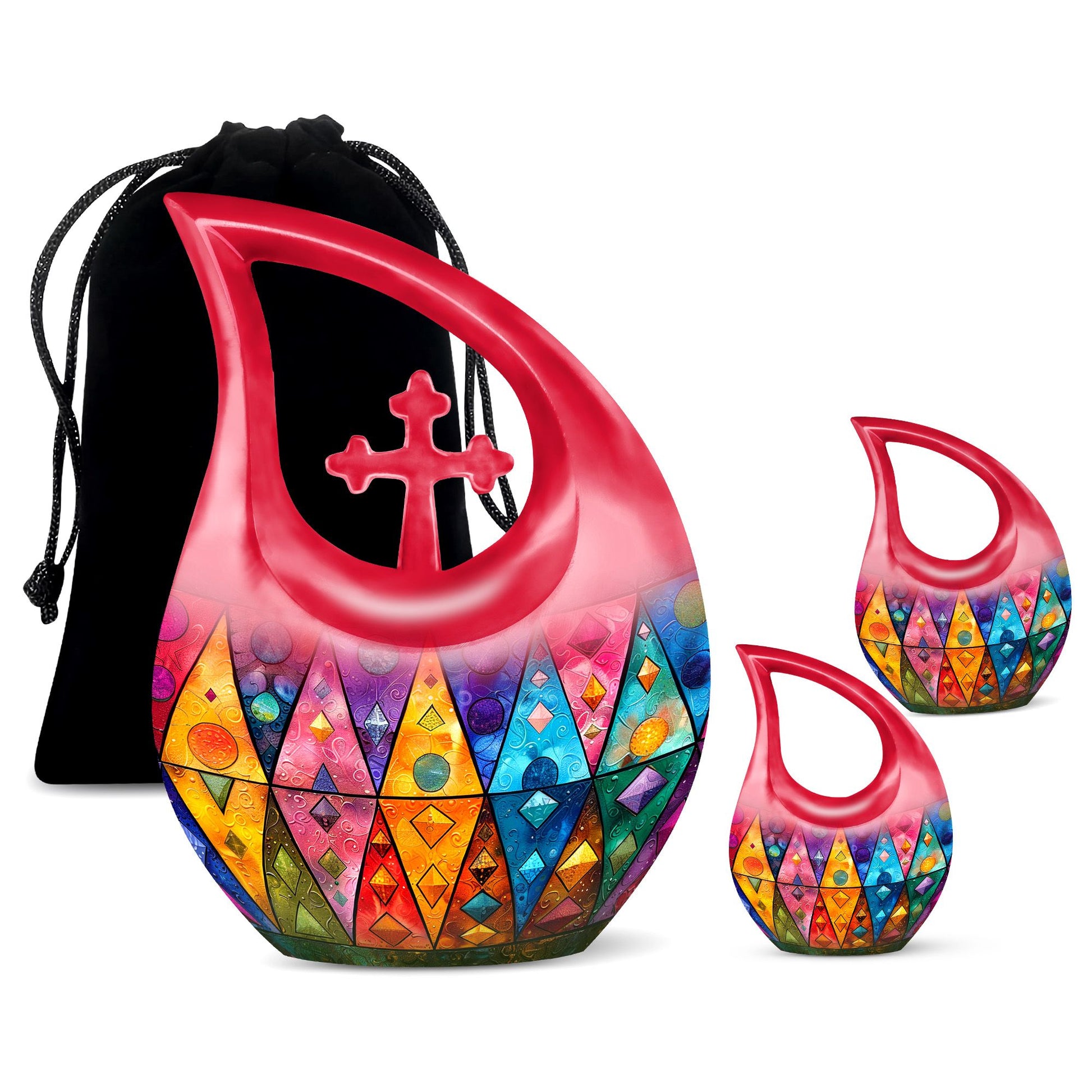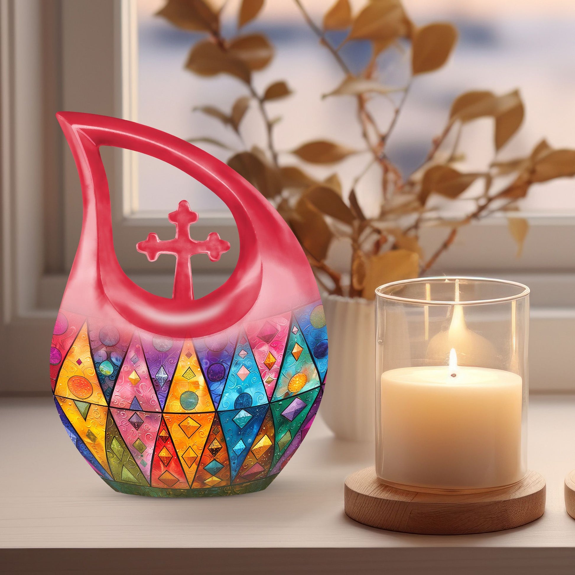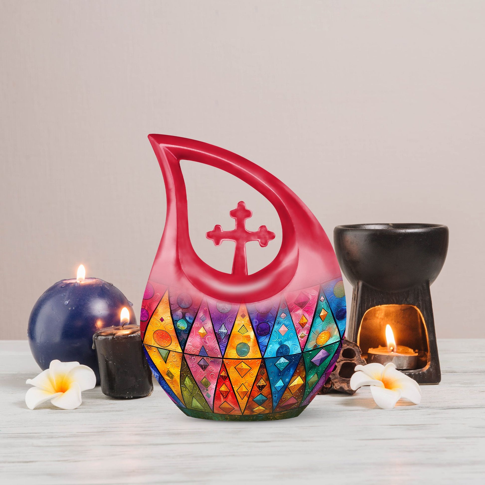 Unite the transcendent beauty of the Prismatic Mosaic Urn with your precious memories. This large urn, made of durable aluminium, stands 10 inches tall and has a capacity of 200 cubic inches, making it a fitting tribute for your loved one. Its unique Cross Drop design, part of the Prismatic Mosaic theme, adds an exquisite touch, setting it apart from standard Outdoor Cremation Urns. Weighing just 3.3 pounds, this memorial urn easy to handle and transport. With the added option to engrave names, this pet urn vase allows you to add a personal touch. As a thoughtful addition, each urn comes with a velvet pouch for careful containment of ashes. As a testament to your loved one or beloved pet, this urn is a wonderful selection. Let your search for 'Outdoor Urns' or 'Urns For Women'S Ashes' end here with our Prismatic Mosaic Urn, a dignified and loving resting place.