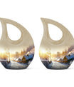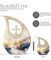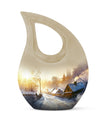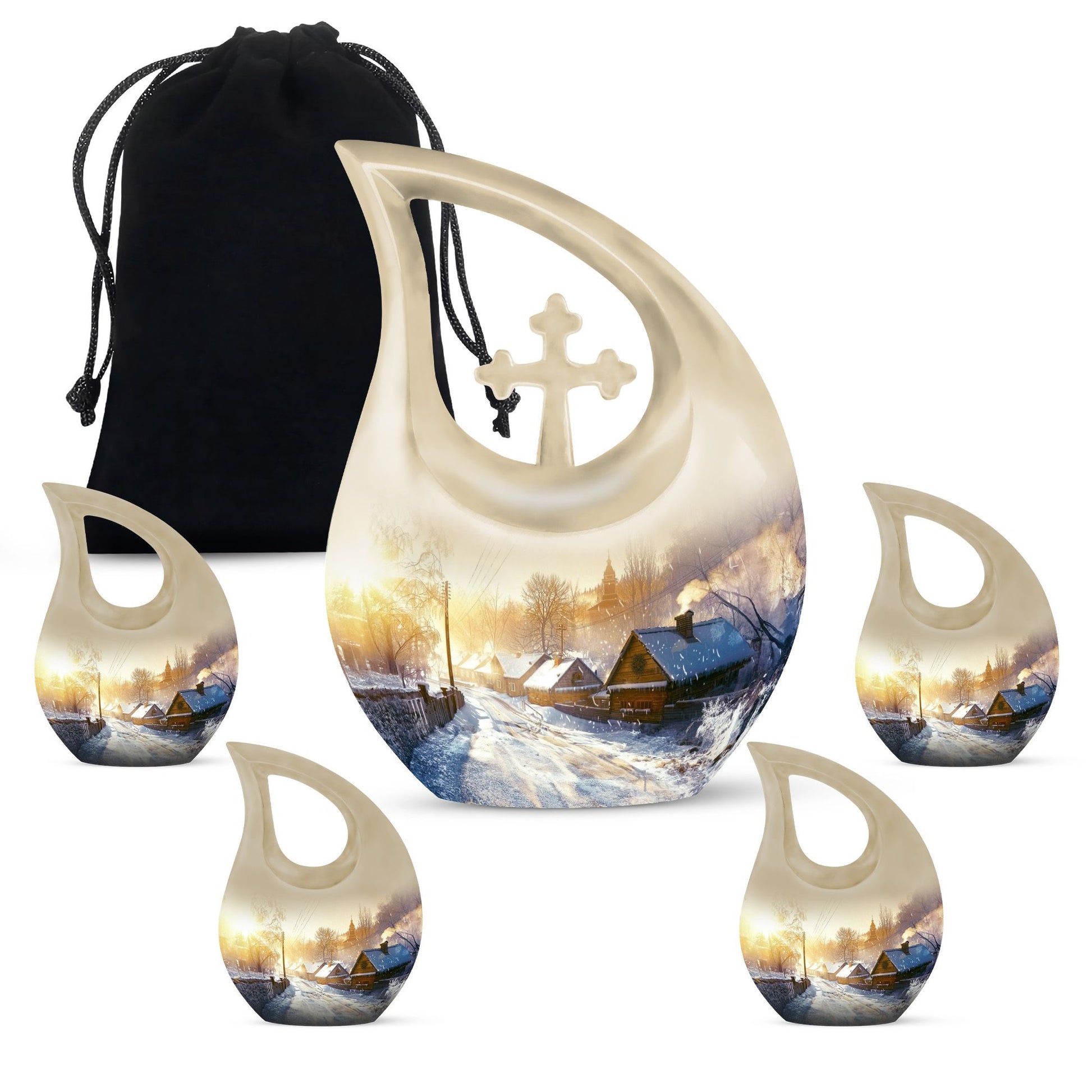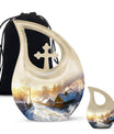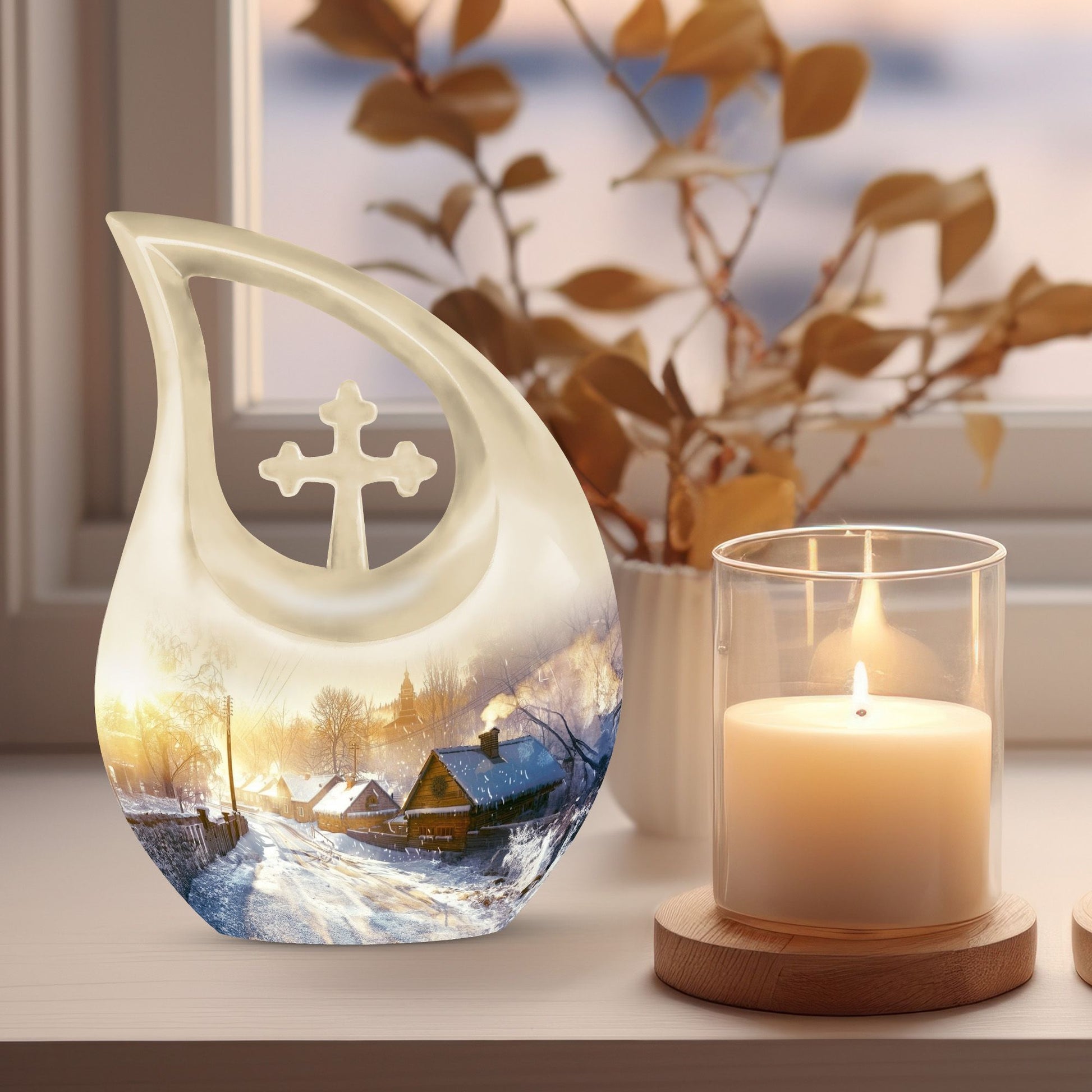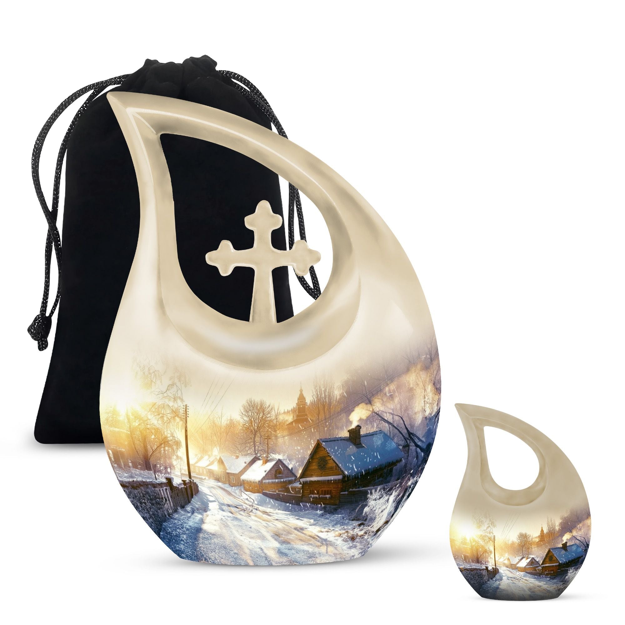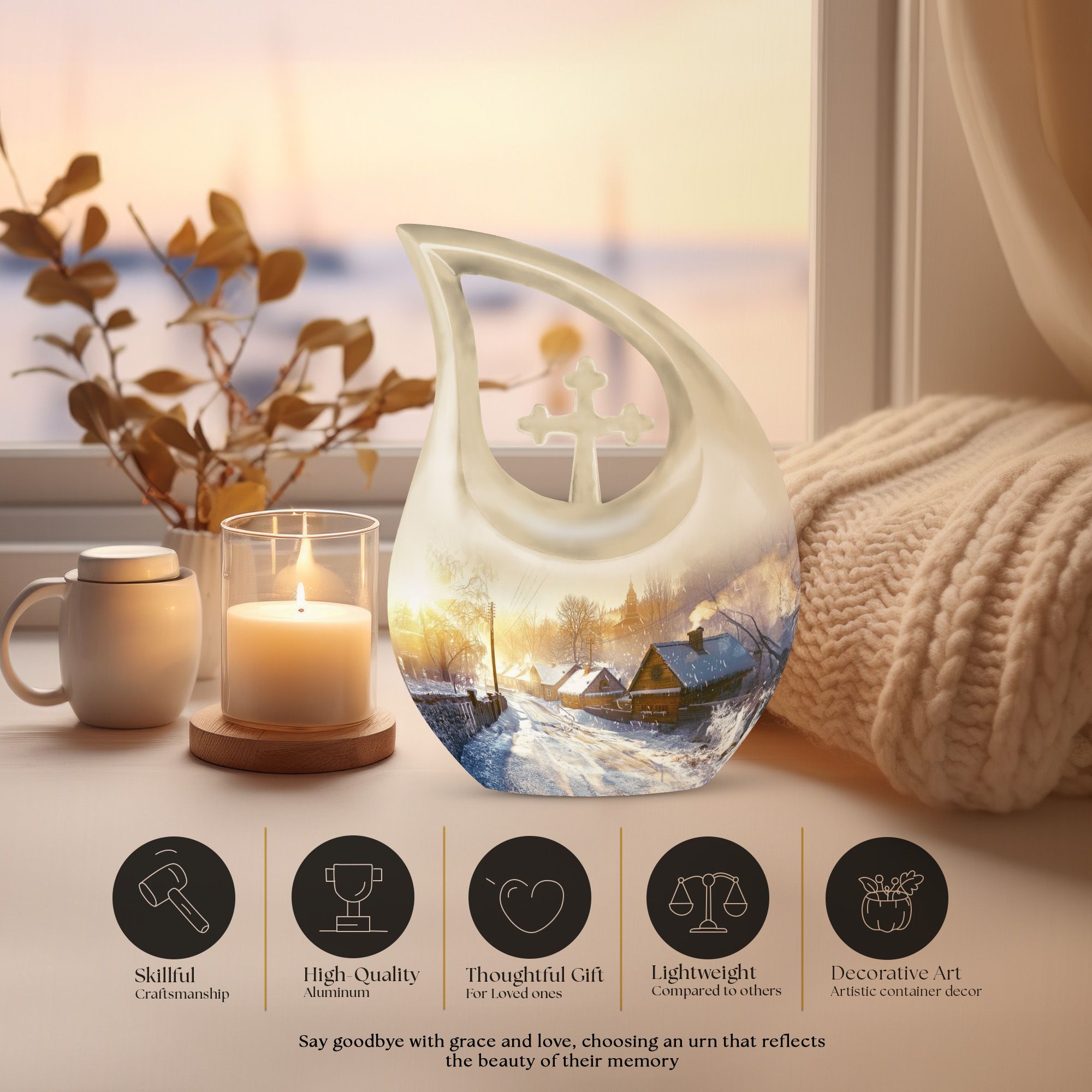 Honor the memory of your beloved with the exquisitely crafted Snowflakes Urn, a beautifully symbolic and functional vase. The design features a unique 'Cross Drop' engraving, a stellar convergence of solemnity and elegance. Sized at a respectful 10 inch stature, it is substantial enough to serve as a memorial centerpiece, while intricately designed to invite a closer look. The urn is constructed from resolute Aluminium, designed to withstand outdoor conditions, making it perfect for an outdoor memorial ceremony. The Urn is of 200 cubic inches capacity, weighing a substantial 3.3 pounds, providing a solid and stable footprint for safe storage of ashes. The package comes with a velvet pouch to softly preserve the remains of your loved one. The urn is customizable - engrave the names of your beloved as a lasting testament of your love. This sizable urn typifies the dignity and irreplacability of human life, an Adult-size memorial marker that never ceases to remind us of the bond we shared with the departed. It also serves as a timeless reminder of the transience of life, making it ideal for religious and memorial ceremonies. As a touch of personalization, our Pet Urn Vase can be engraved with names. Uniquely enamoured with a Theme reflecting glistening Snowflakes, this urn exudes a peaceful disposition that reflects in its aura. Highly searched terminologies such as 'Urns for Women's Ashes', 'Outdoor Cremation Urns', and 'Outdoor Urns' align well with this product.