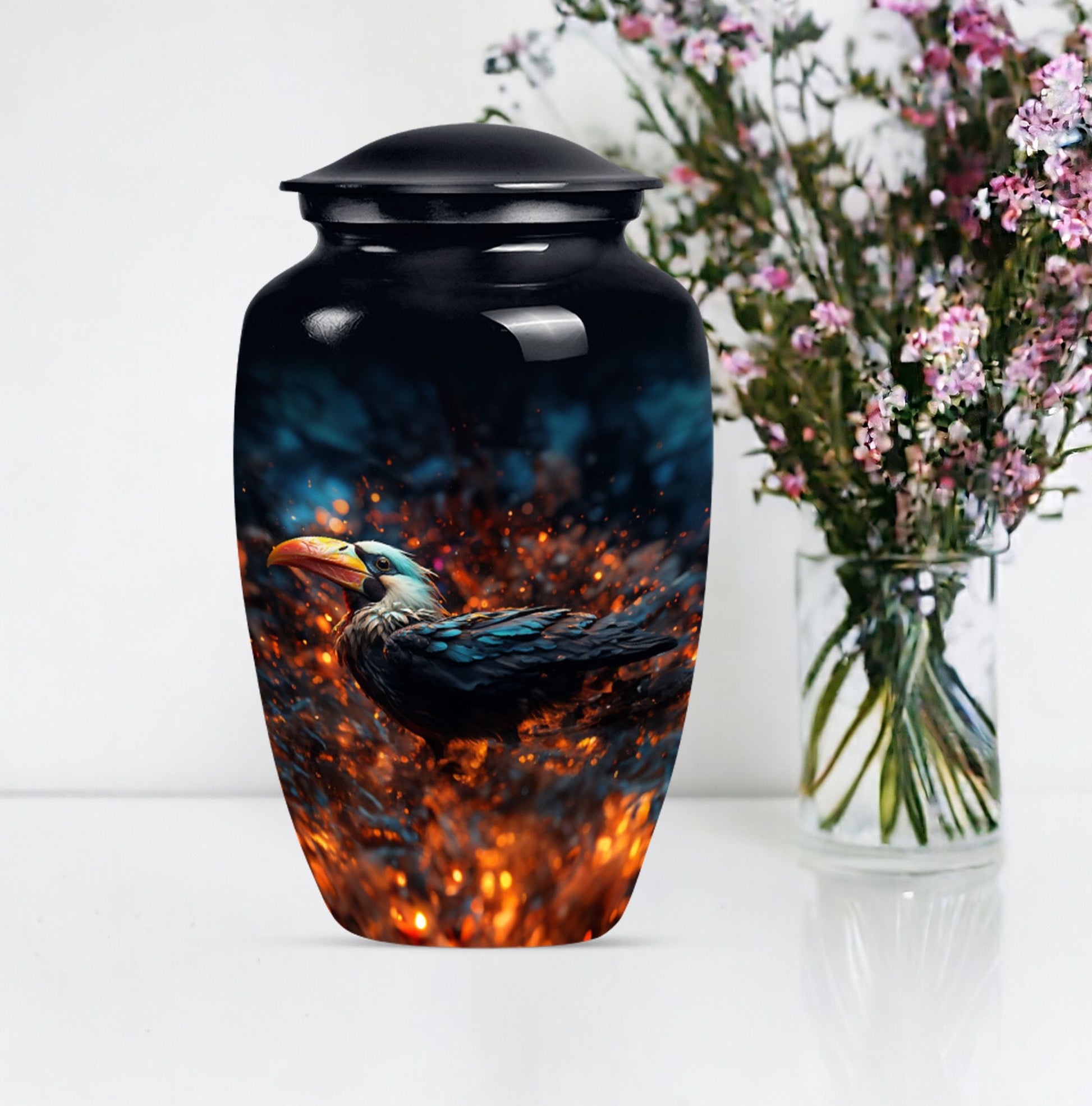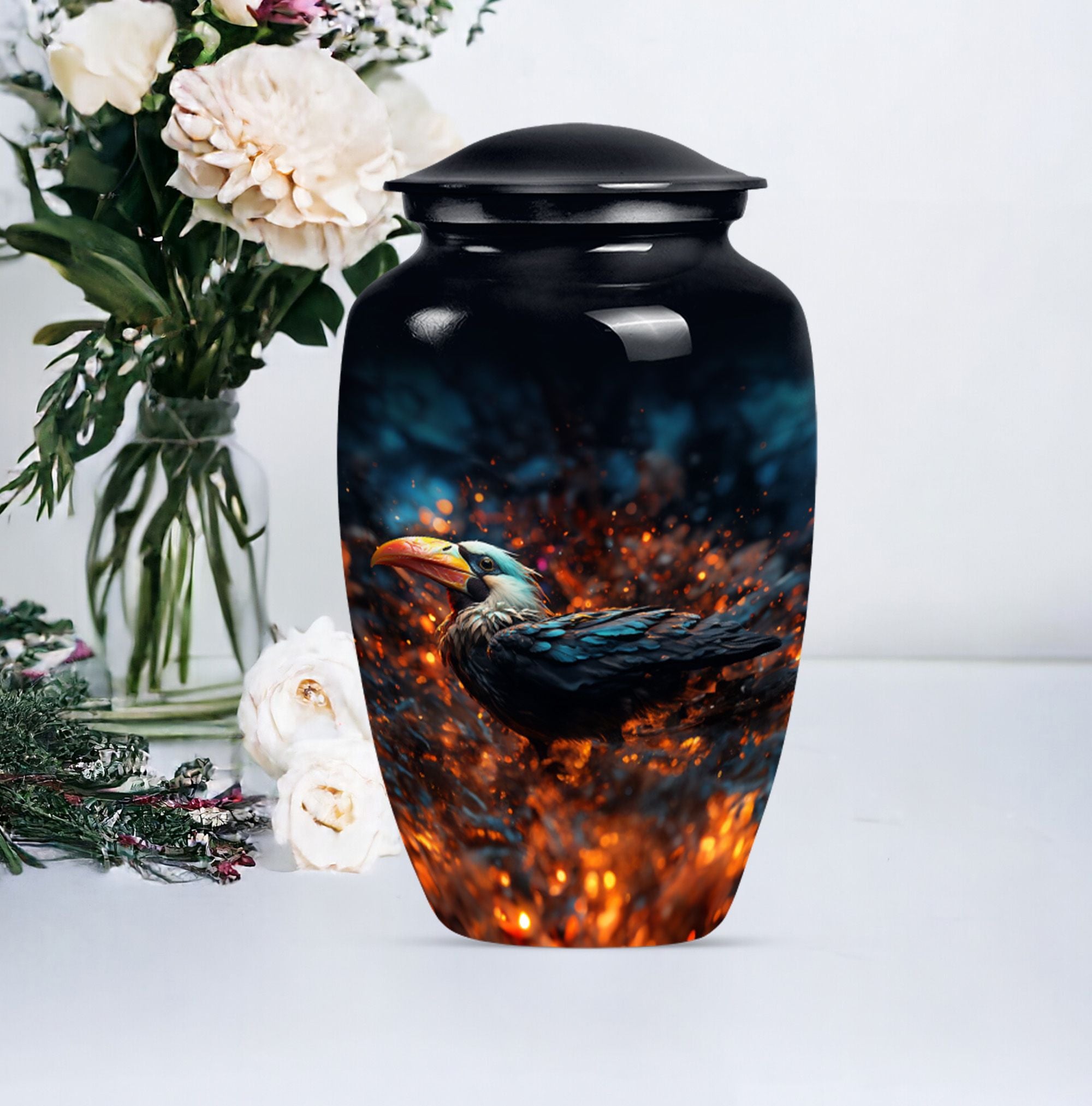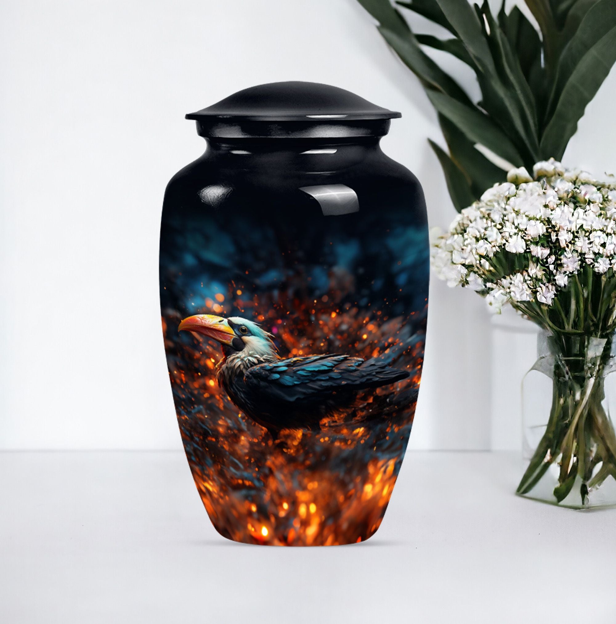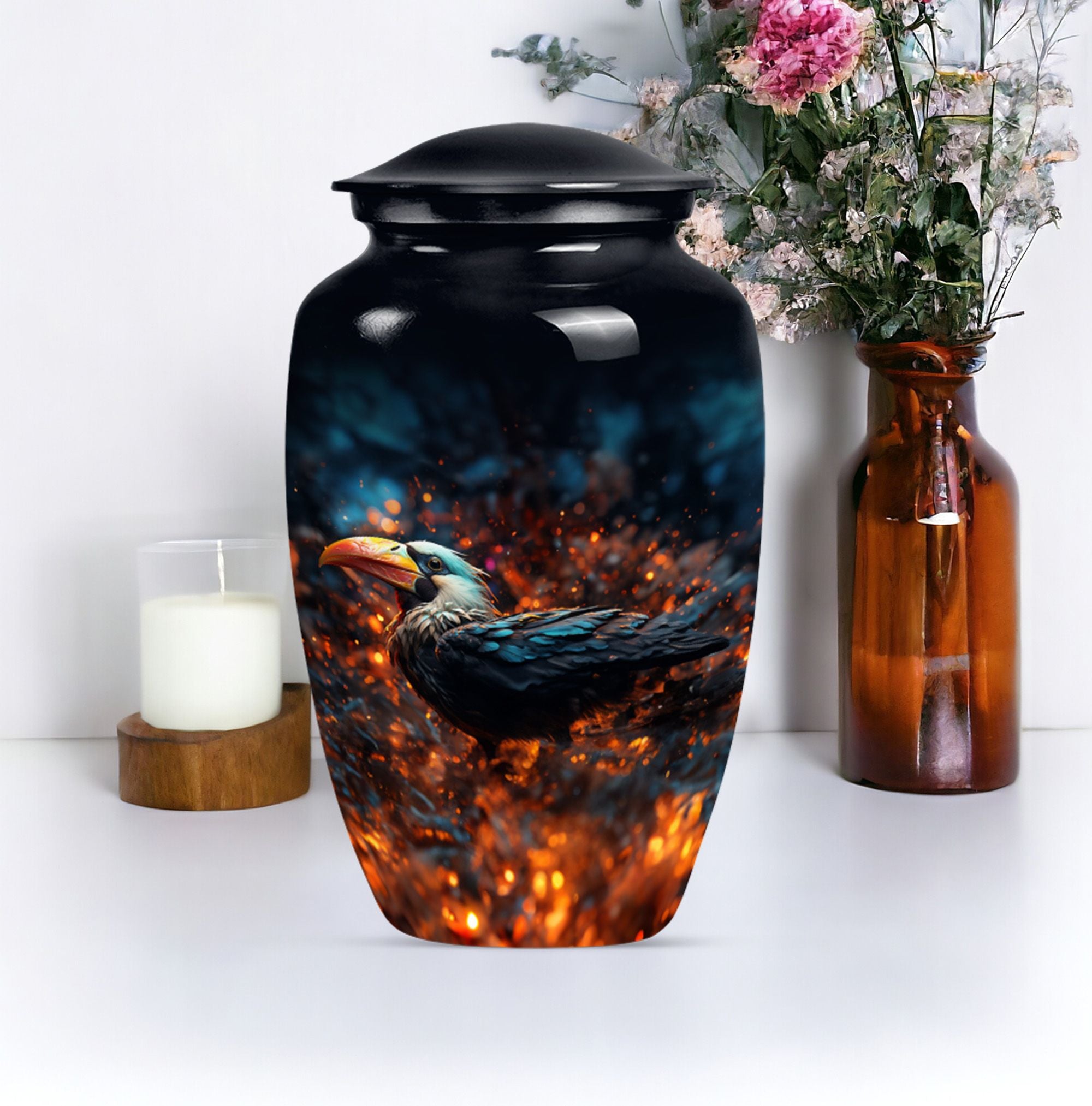 Introducing our remarkable Puffin Bird Urn, an essential addition for the dignified ceremonial requirements. Serving as an elegant container for burial ashes, this large urn is designed with an abstract theme that conveys the abstractness of departure and memories. It is made of premium aluminium, boasting a weight of 3.3 pounds and a height of 10 inches. This urn comfortably holds up to 200 cubic inches, making it suitable for both adult male and female ashes. Personalize this eternal memory keeper by engraving names on it, adding a special, individual touch to this memento. Padding your love and memories, it comes with a velvet pouch for containing the ashes securely. Keywords including 'cremation urns for adult ashes men', 'urn human ash ash adult male' and 'cremation urn for adult female ashes', help you find this product easily. A perfect embodiment of love and memory, our Puffin Bird Urn gracefully represents the indelible presence of your loved ones.