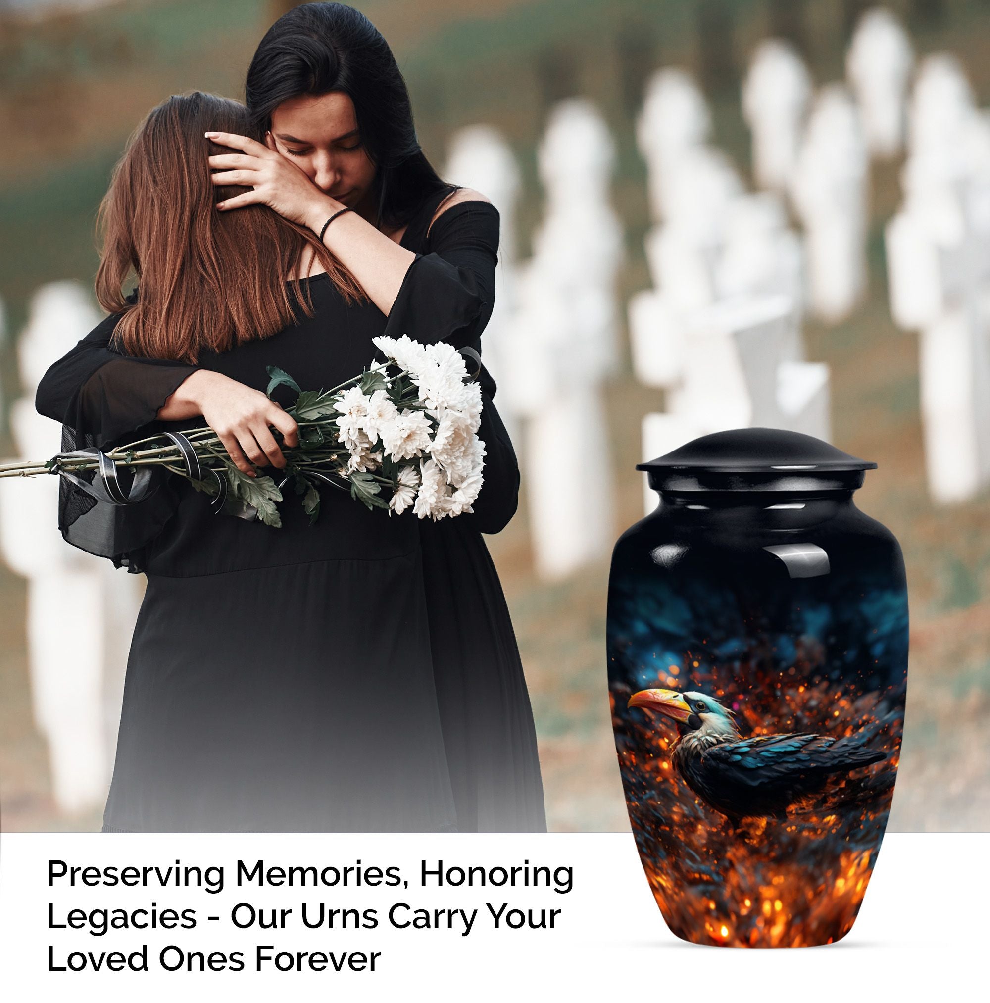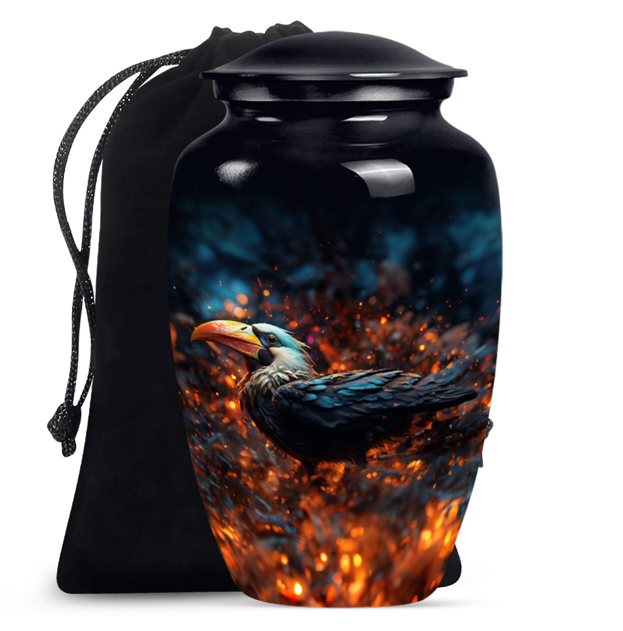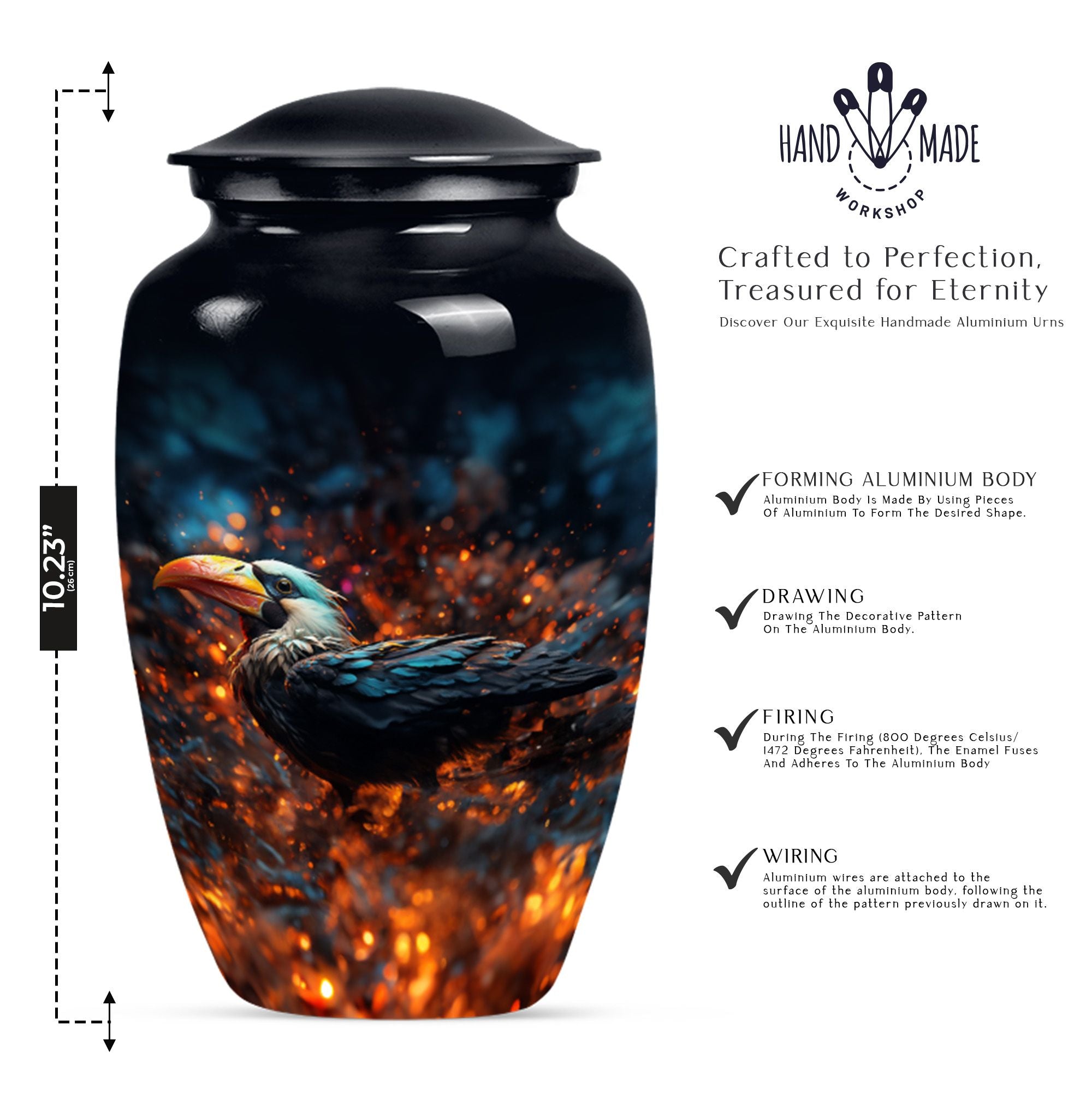 Introducing our remarkable Puffin Bird Urn, an essential addition for the dignified ceremonial requirements. Serving as an elegant container for burial ashes, this large urn is designed with an abstract theme that conveys the abstractness of departure and memories. It is made of premium aluminium, boasting a weight of 3.3 pounds and a height of 10 inches. This urn comfortably holds up to 200 cubic inches, making it suitable for both adult male and female ashes. Personalize this eternal memory keeper by engraving names on it, adding a special, individual touch to this memento. Padding your love and memories, it comes with a velvet pouch for containing the ashes securely. Keywords including 'cremation urns for adult ashes men', 'urn human ash ash adult male' and 'cremation urn for adult female ashes', help you find this product easily. A perfect embodiment of love and memory, our Puffin Bird Urn gracefully represents the indelible presence of your loved ones.