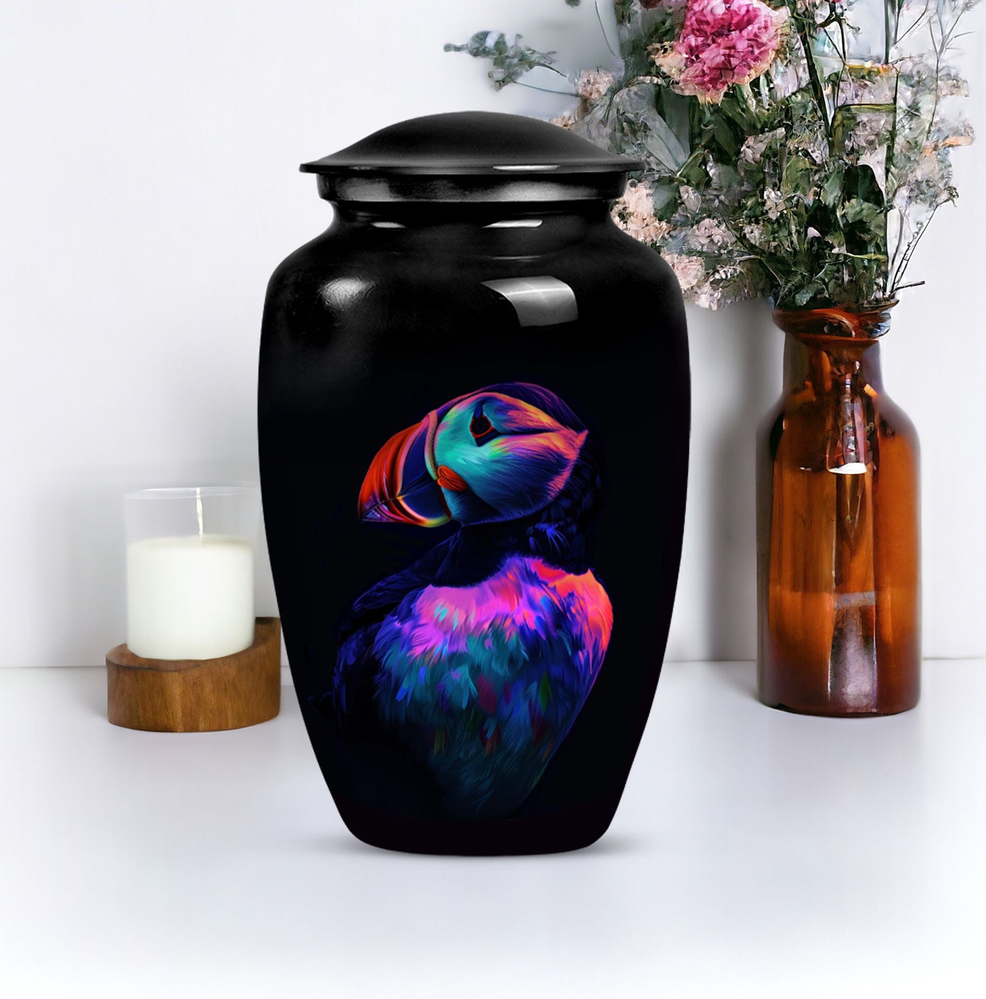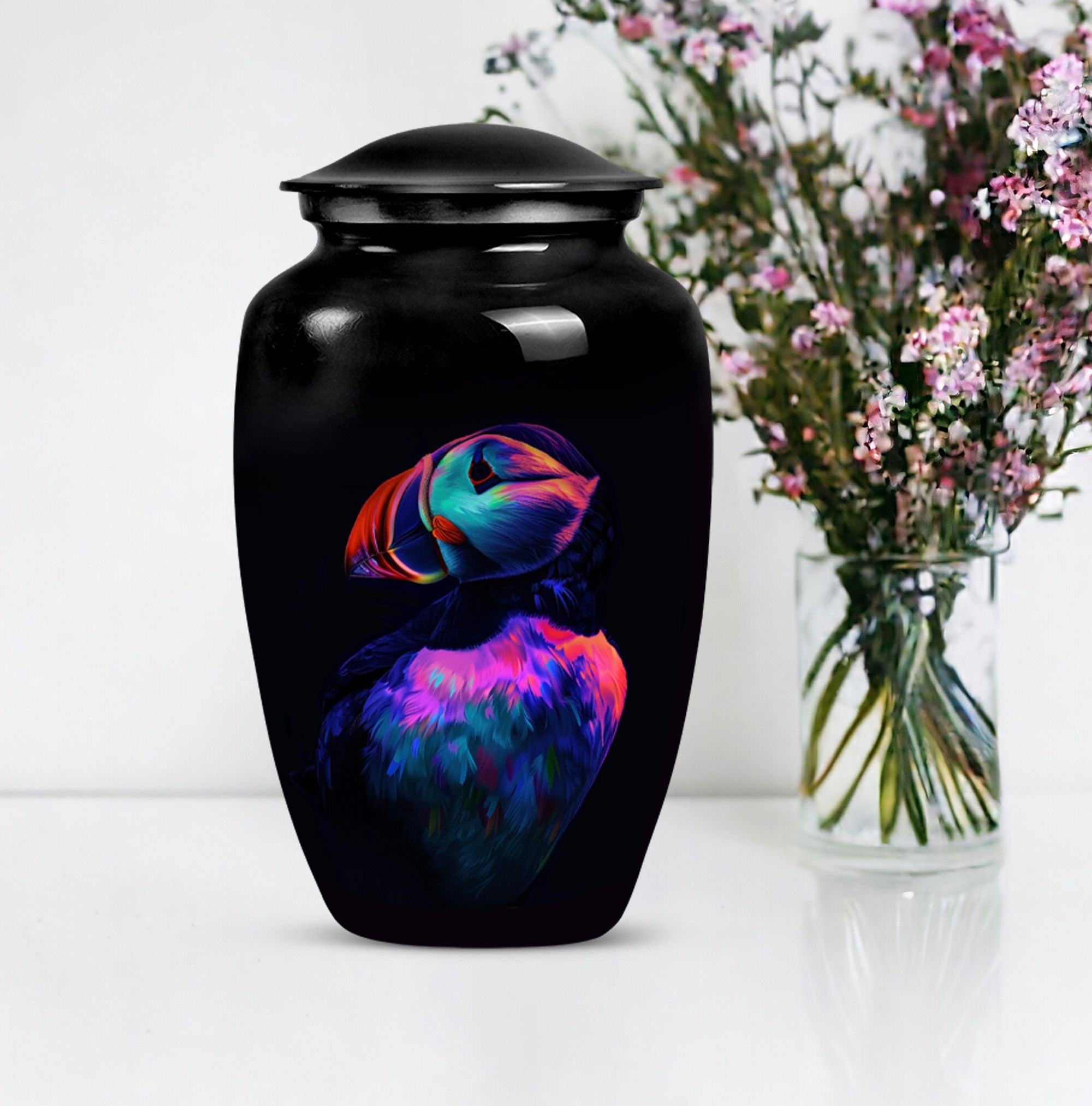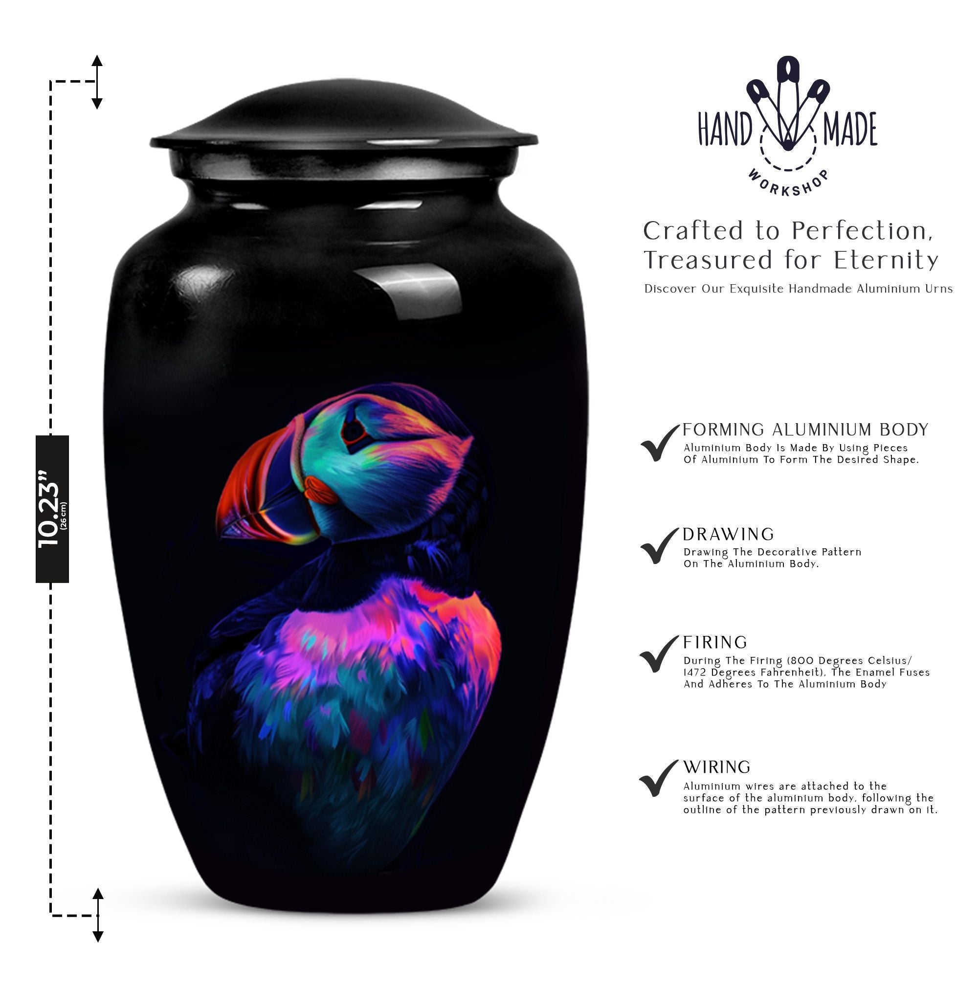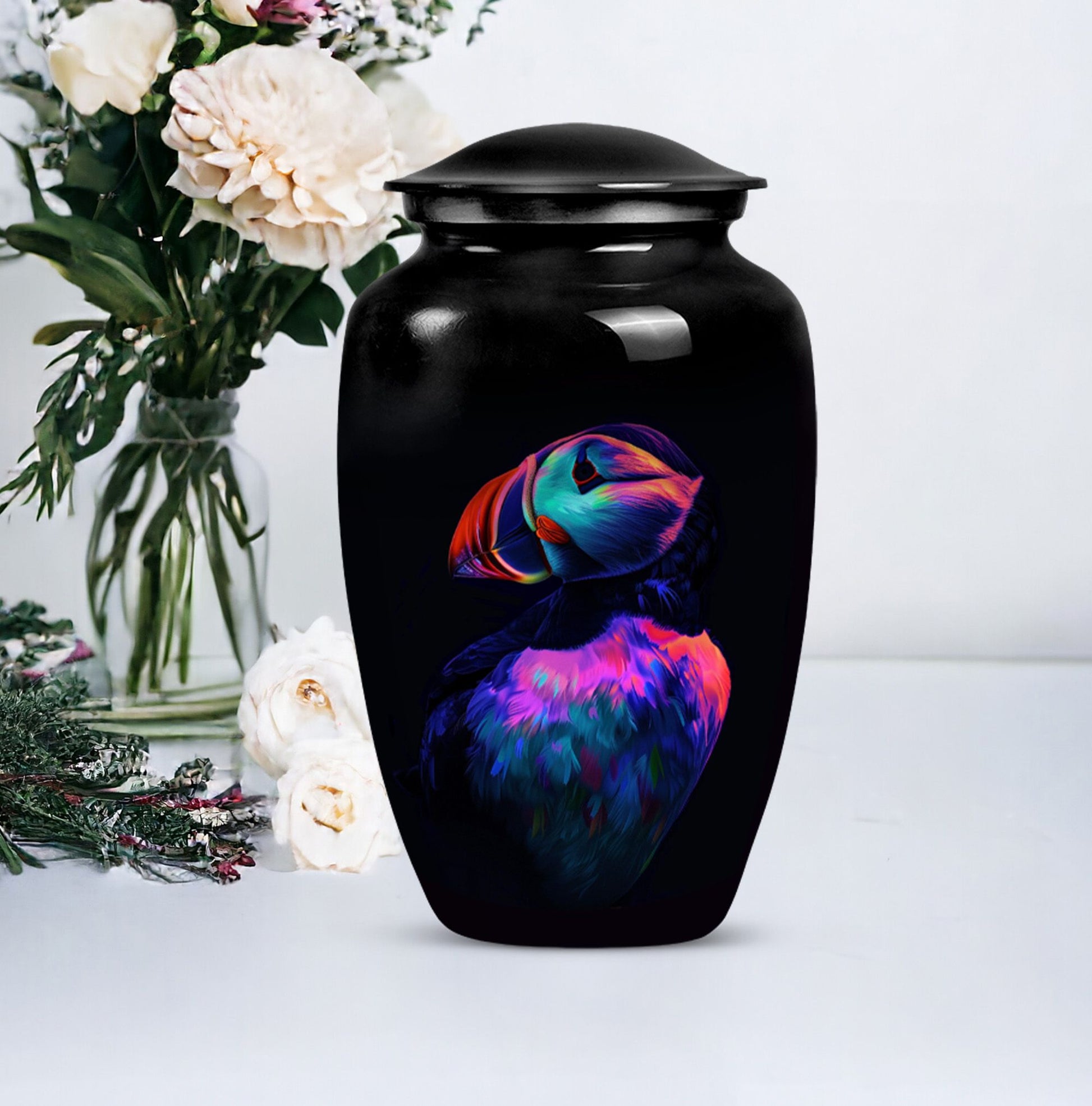 Herein is our uniquely crafted 'Puffin Bird Urn', an abstract-themed masterpiece, expressing limitless affection for your departed loved one. This large urn stands proudly at 10 inches in height and comfortably weighing 3.3 pounds. It is fabricated from top-notch aluminum, enduring through time just like your enduring memories. Perfect for urban homes, this compact urn suits both men and women, respectfully retaining up to 200 cubic inches of your loved one's ashes. We understand the importance of personal tokens of memory - this urn can be customized, allowing for names to be engraved lovingly onto its surface. The package includes a plush velvet pouch for dignified containment of the precious ashes. Let our 'burial urns for cremation ashes mother' or 'cremation urn for adult male ashes' serve as a lasting tribute for your loved one's unique life journey. Pay homage to your cherished memories with our meticulously crafted memorial urns.