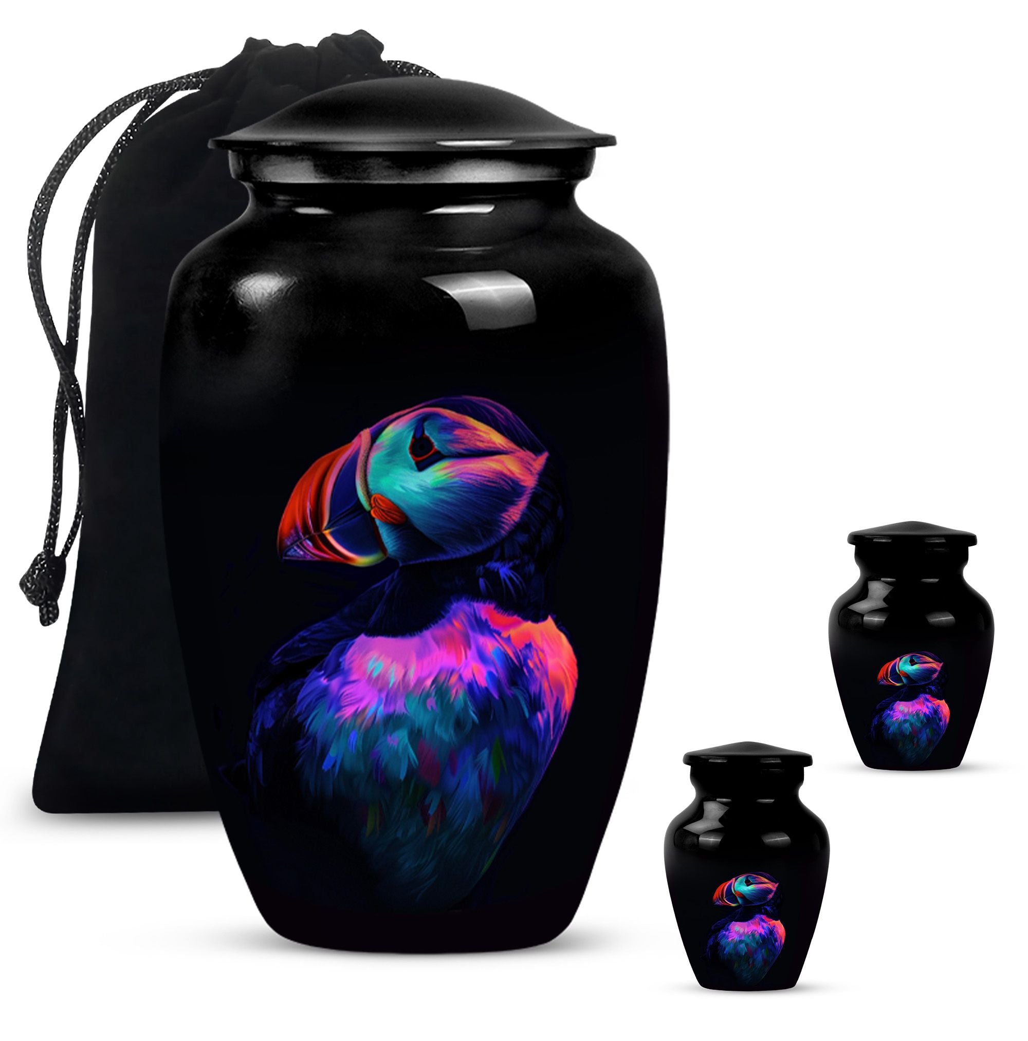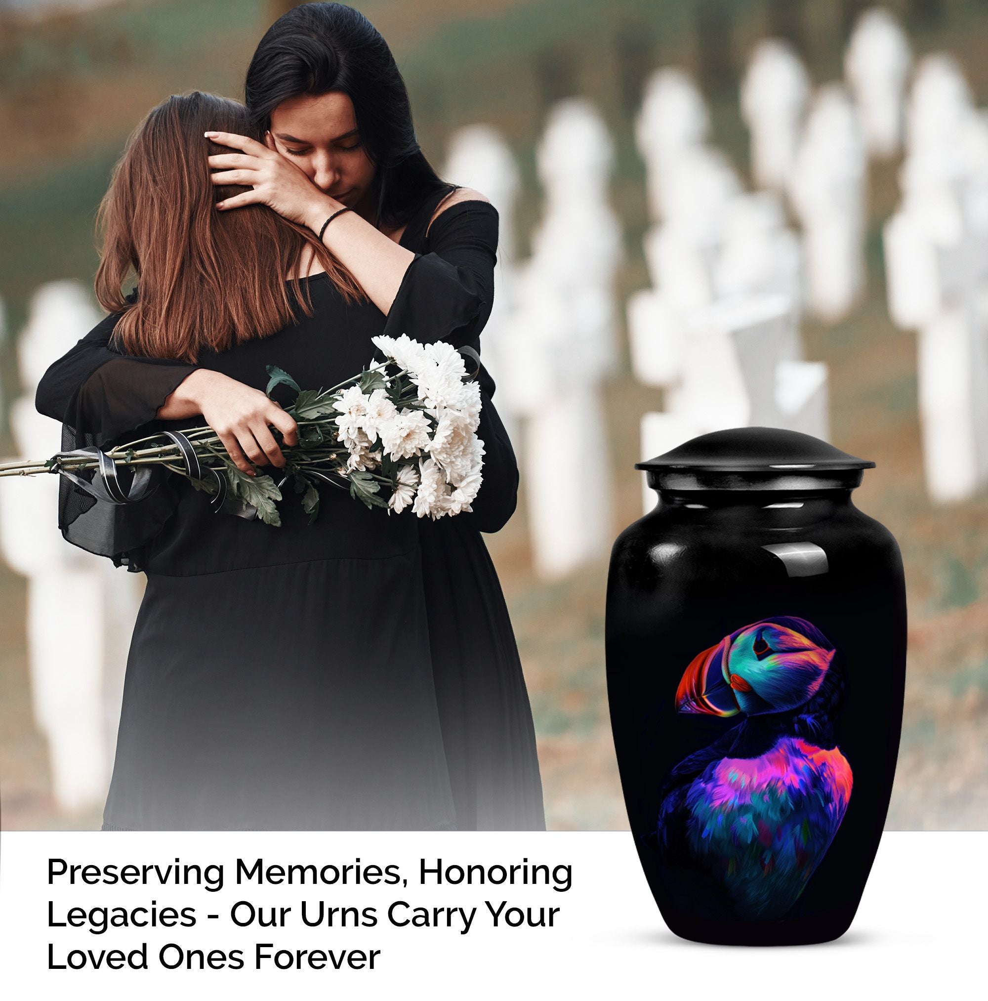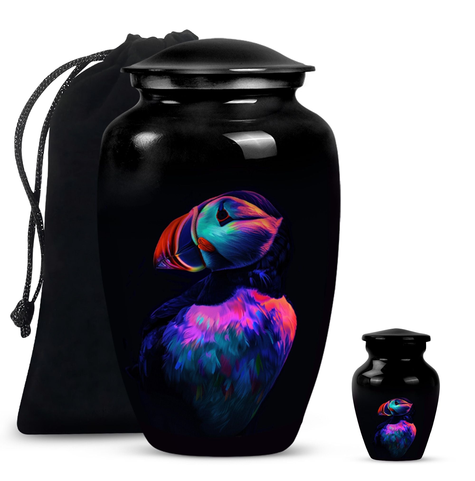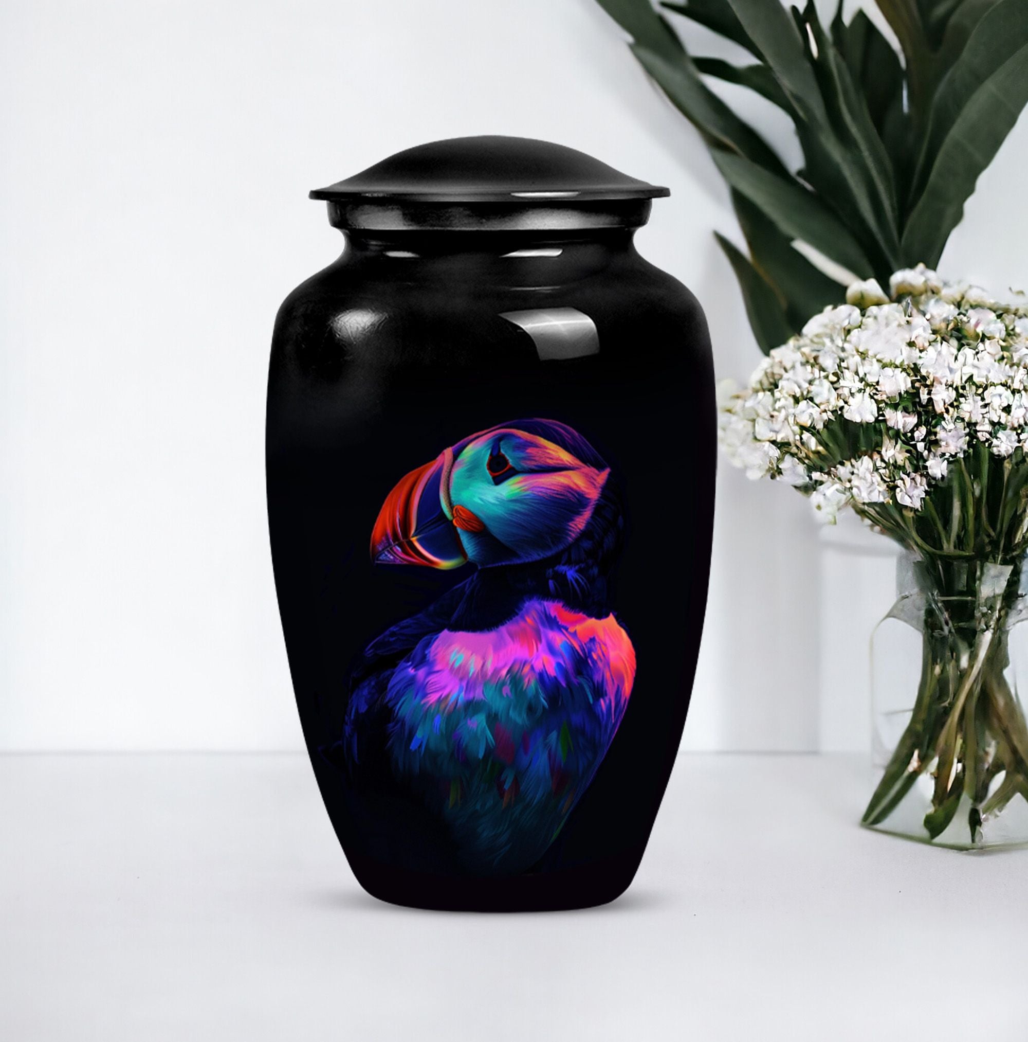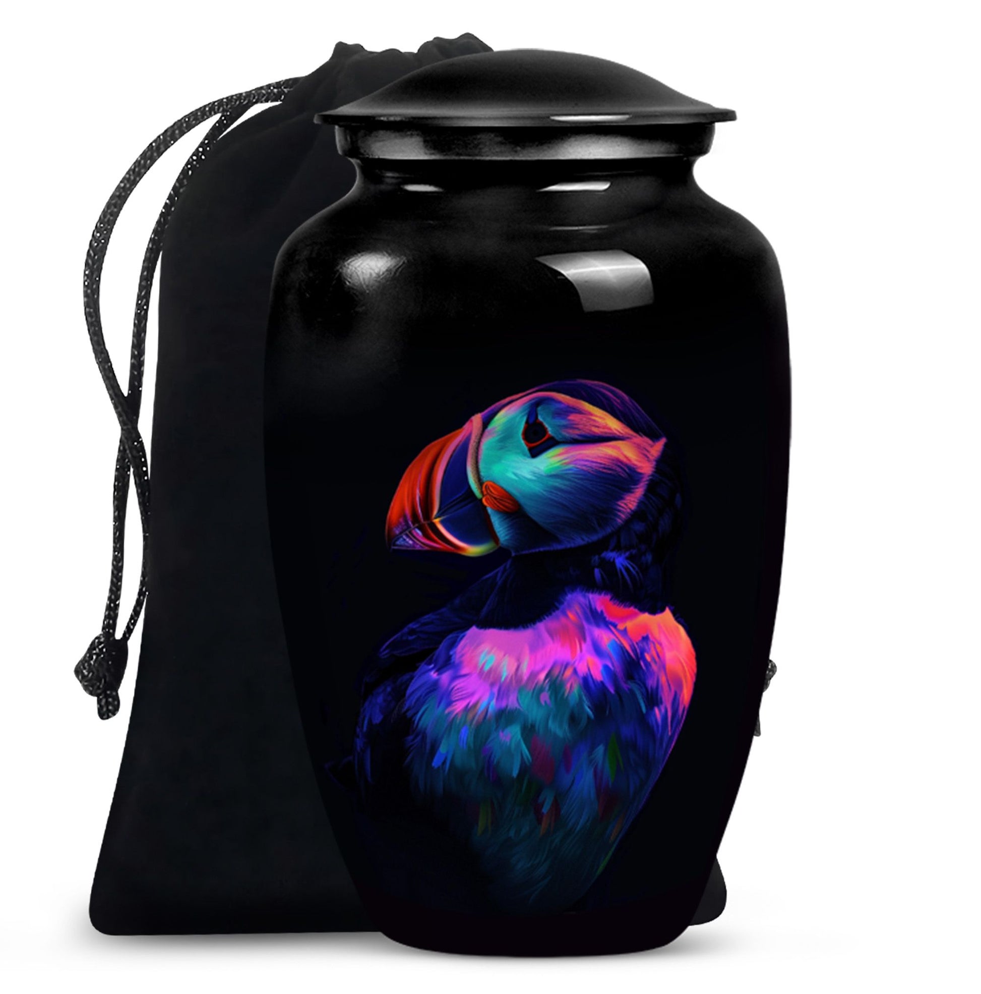 Herein is our uniquely crafted 'Puffin Bird Urn', an abstract-themed masterpiece, expressing limitless affection for your departed loved one. This large urn stands proudly at 10 inches in height and comfortably weighing 3.3 pounds. It is fabricated from top-notch aluminum, enduring through time just like your enduring memories. Perfect for urban homes, this compact urn suits both men and women, respectfully retaining up to 200 cubic inches of your loved one's ashes. We understand the importance of personal tokens of memory - this urn can be customized, allowing for names to be engraved lovingly onto its surface. The package includes a plush velvet pouch for dignified containment of the precious ashes. Let our 'burial urns for cremation ashes mother' or 'cremation urn for adult male ashes' serve as a lasting tribute for your loved one's unique life journey. Pay homage to your cherished memories with our meticulously crafted memorial urns.
