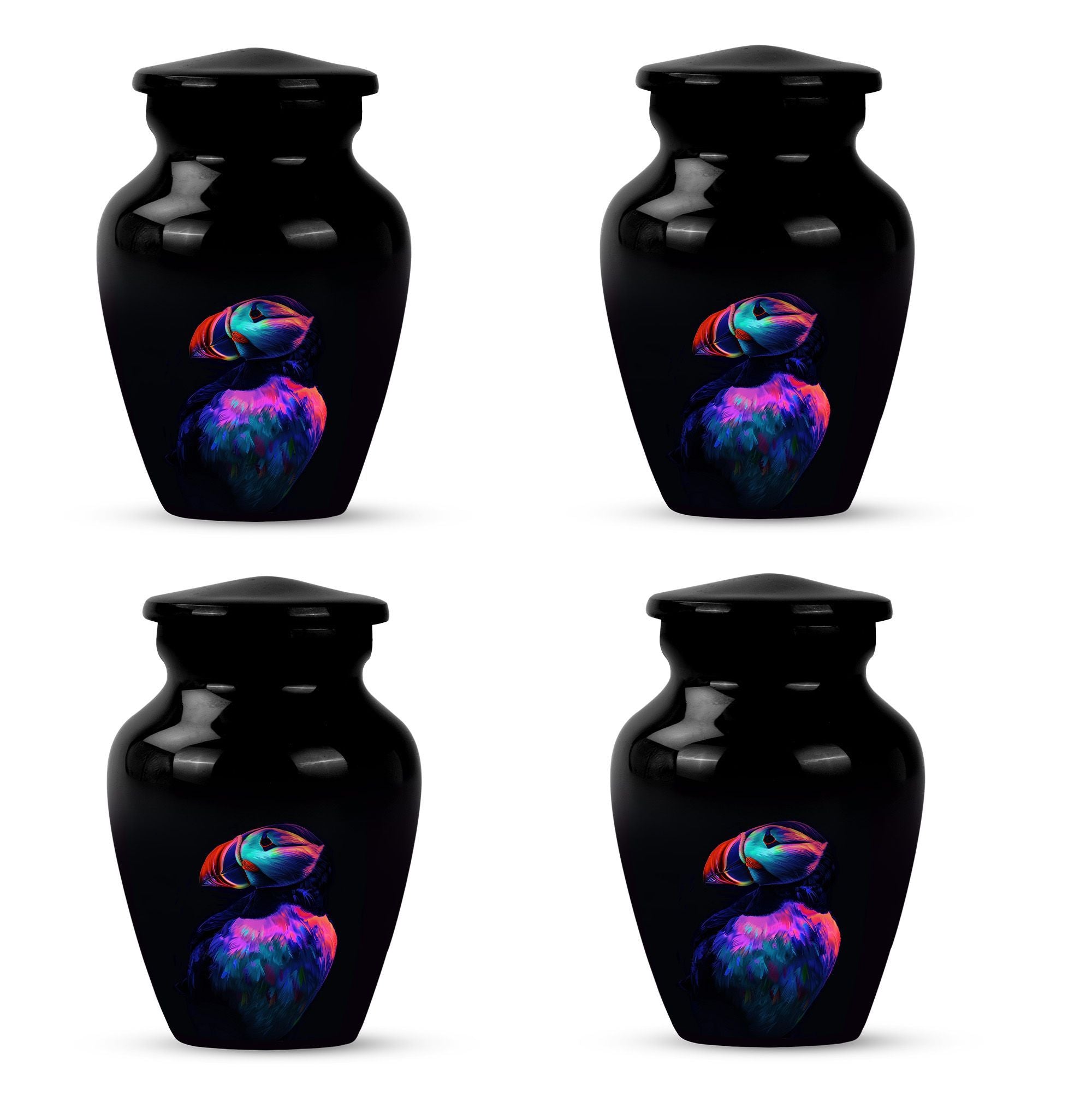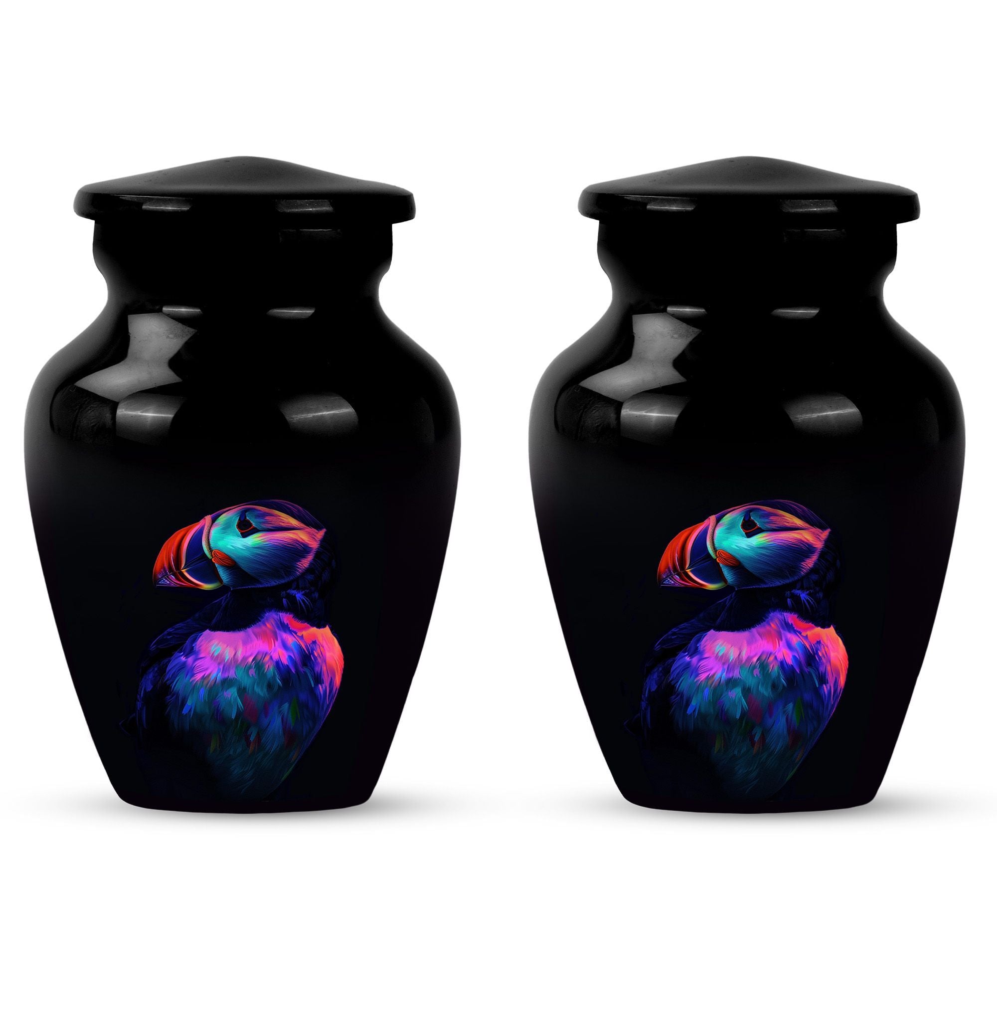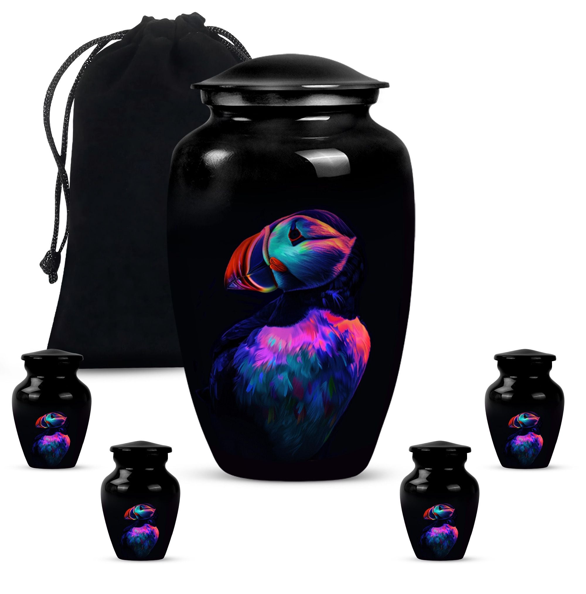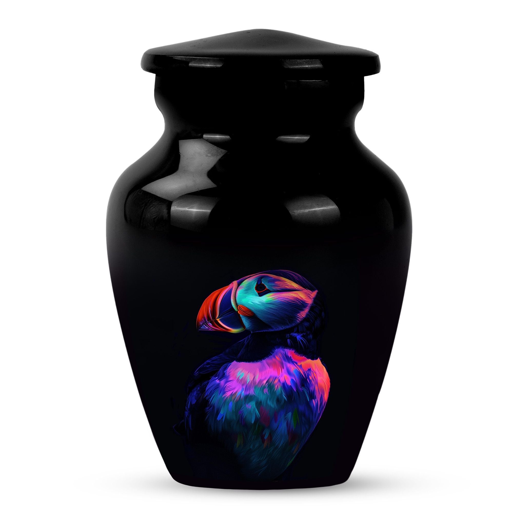 Herein is our uniquely crafted 'Puffin Bird Urn', an abstract-themed masterpiece, expressing limitless affection for your departed loved one. This large urn stands proudly at 10 inches in height and comfortably weighing 3.3 pounds. It is fabricated from top-notch aluminum, enduring through time just like your enduring memories. Perfect for urban homes, this compact urn suits both men and women, respectfully retaining up to 200 cubic inches of your loved one's ashes. We understand the importance of personal tokens of memory - this urn can be customized, allowing for names to be engraved lovingly onto its surface. The package includes a plush velvet pouch for dignified containment of the precious ashes. Let our 'burial urns for cremation ashes mother' or 'cremation urn for adult male ashes' serve as a lasting tribute for your loved one's unique life journey. Pay homage to your cherished memories with our meticulously crafted memorial urns.