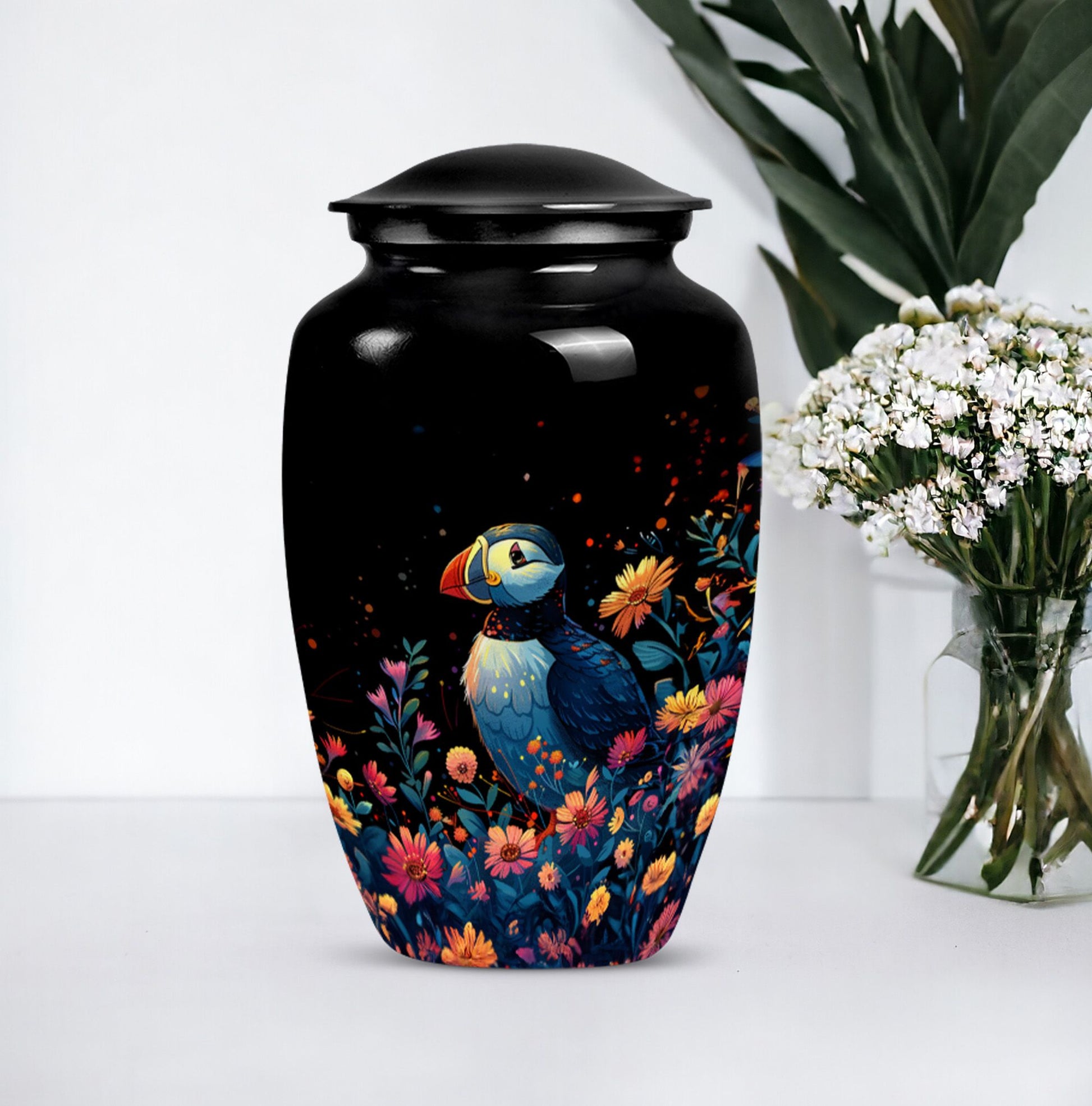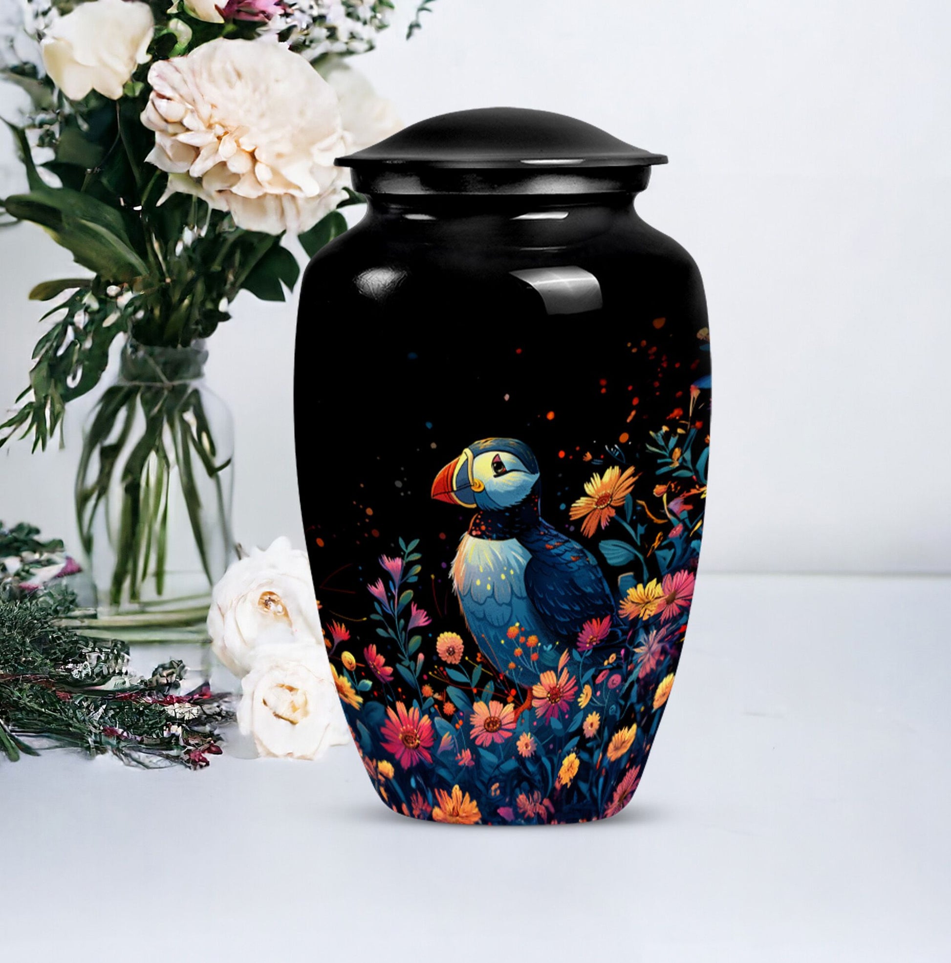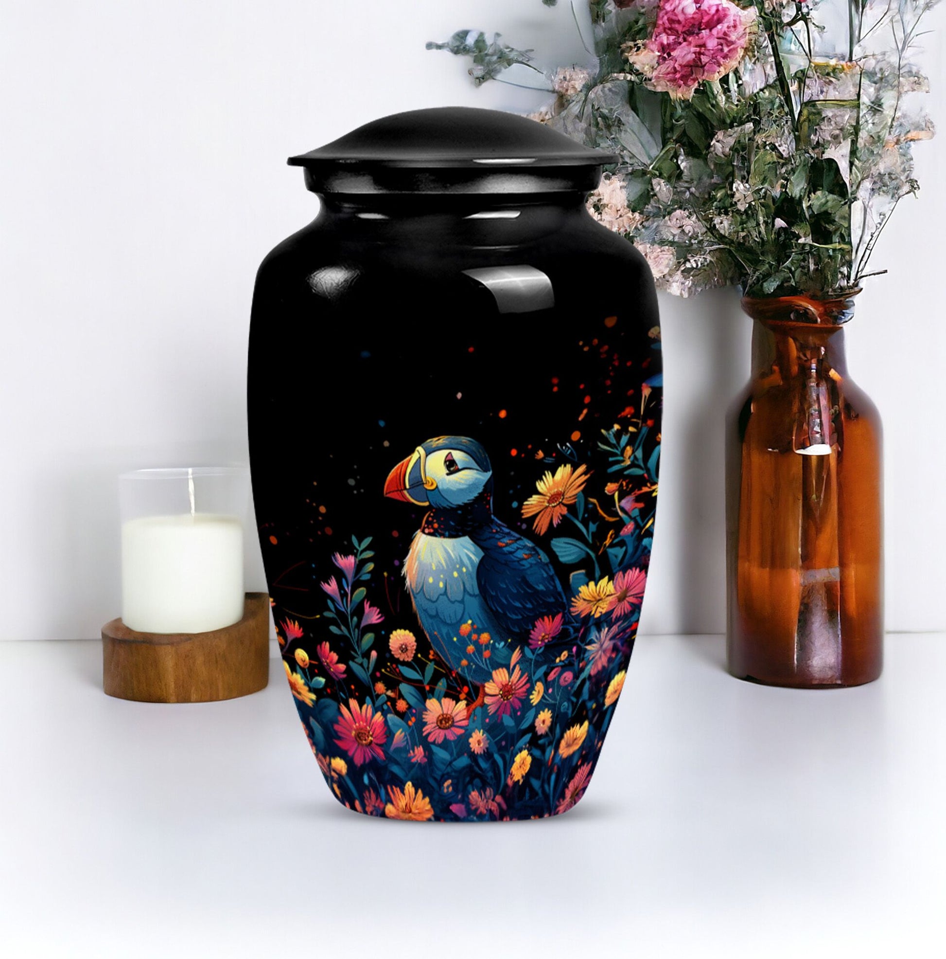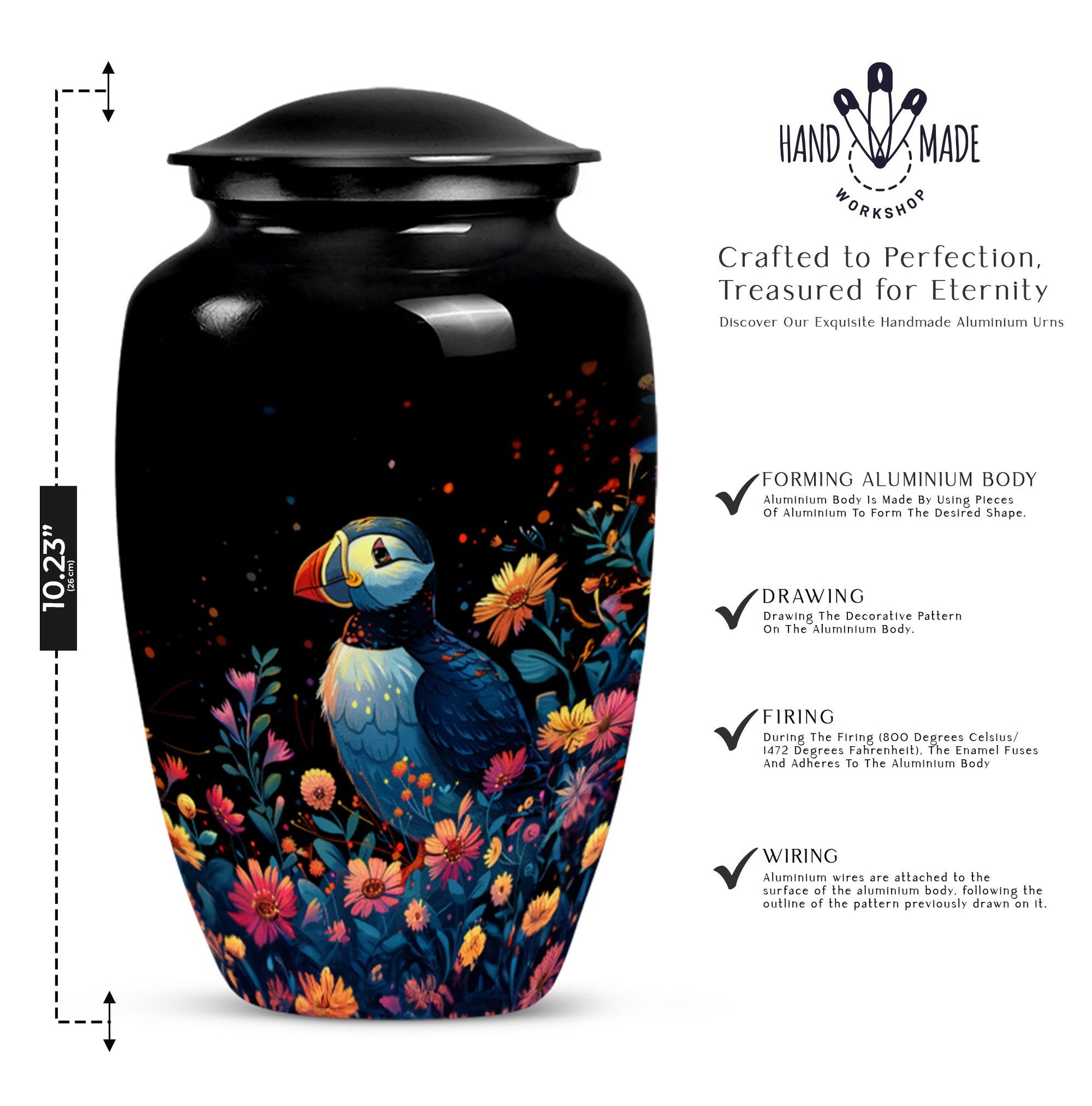 Safeguard the sacred remains of your loved one with the Puffin Bird Urn. This large funeral urn stands at 10 inches tall and has a solemn Puffin Bird theme, offering a unique yet respectful containment for your dearly departed. Crafted from enduring aluminium, the urn weighs a sturdy 3.3 pounds with a sizeable capacity of 200 cubic inches, accommodating human ashes from an adult male or female. It comes with a soft velvet pouch for secure placement of ashes, offering you peace of mind. Further adding to its distinctiveness is the option to personalize it with engraved names, manifesting an everlasting tribute. While it exhibits the classic urn design, the Puffin Bird Urn reintroduces tradition in a unique way. Ideal for memorial ceremonies or simply as a poignant keepsake, entrust the charm of this cremation urn to honor your lost loved one. Search phrases like 'cremation companion urns' or 'memorial urns for adult ashes' may also help you find this product.