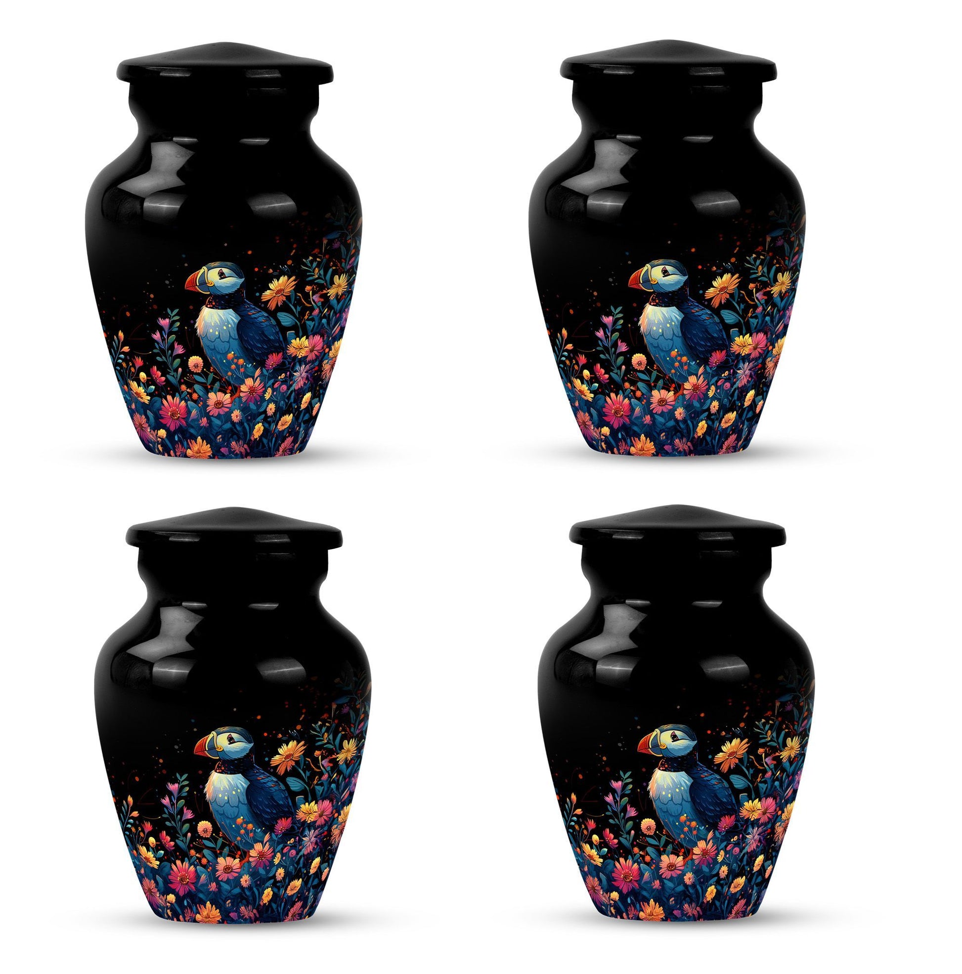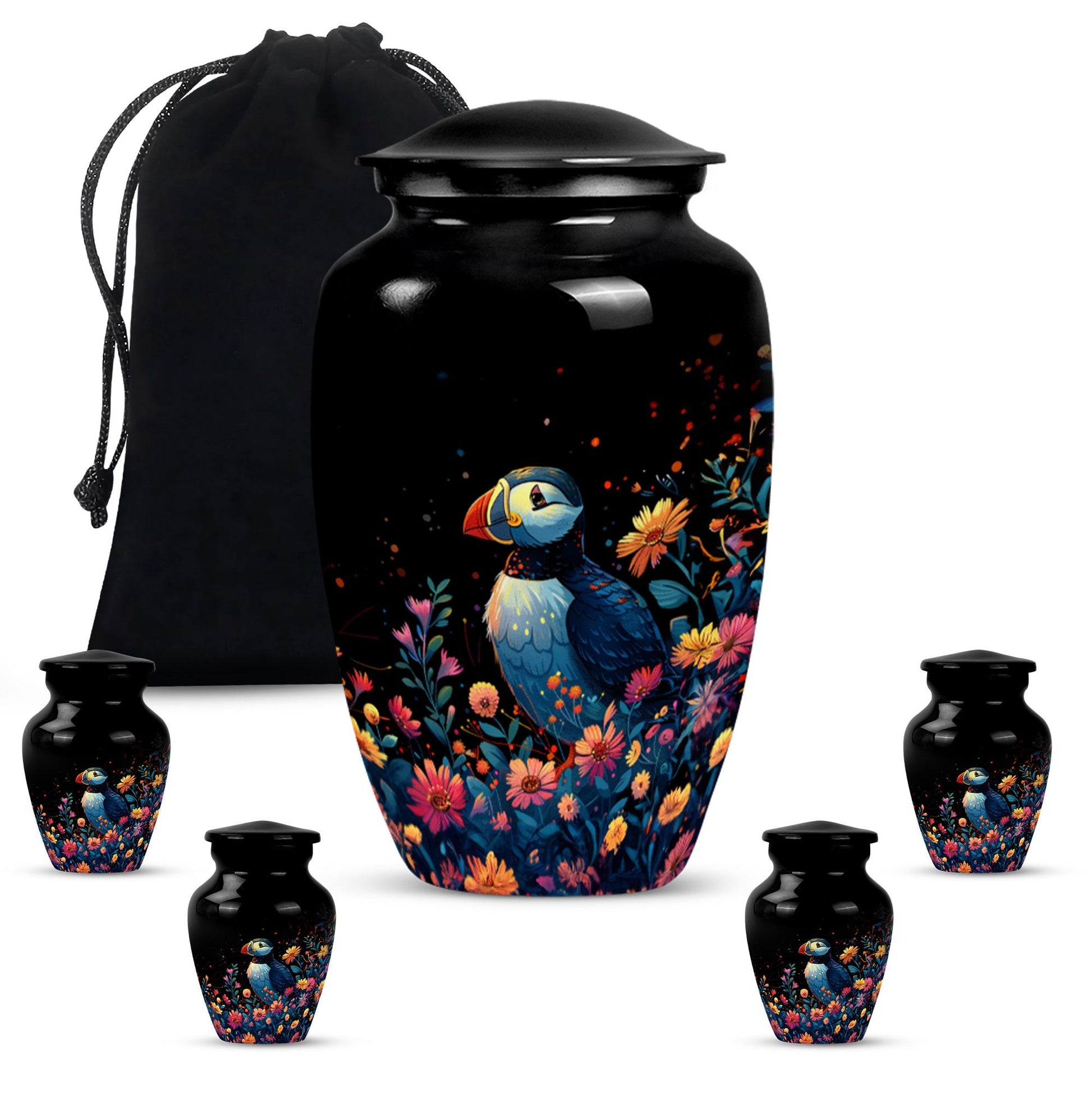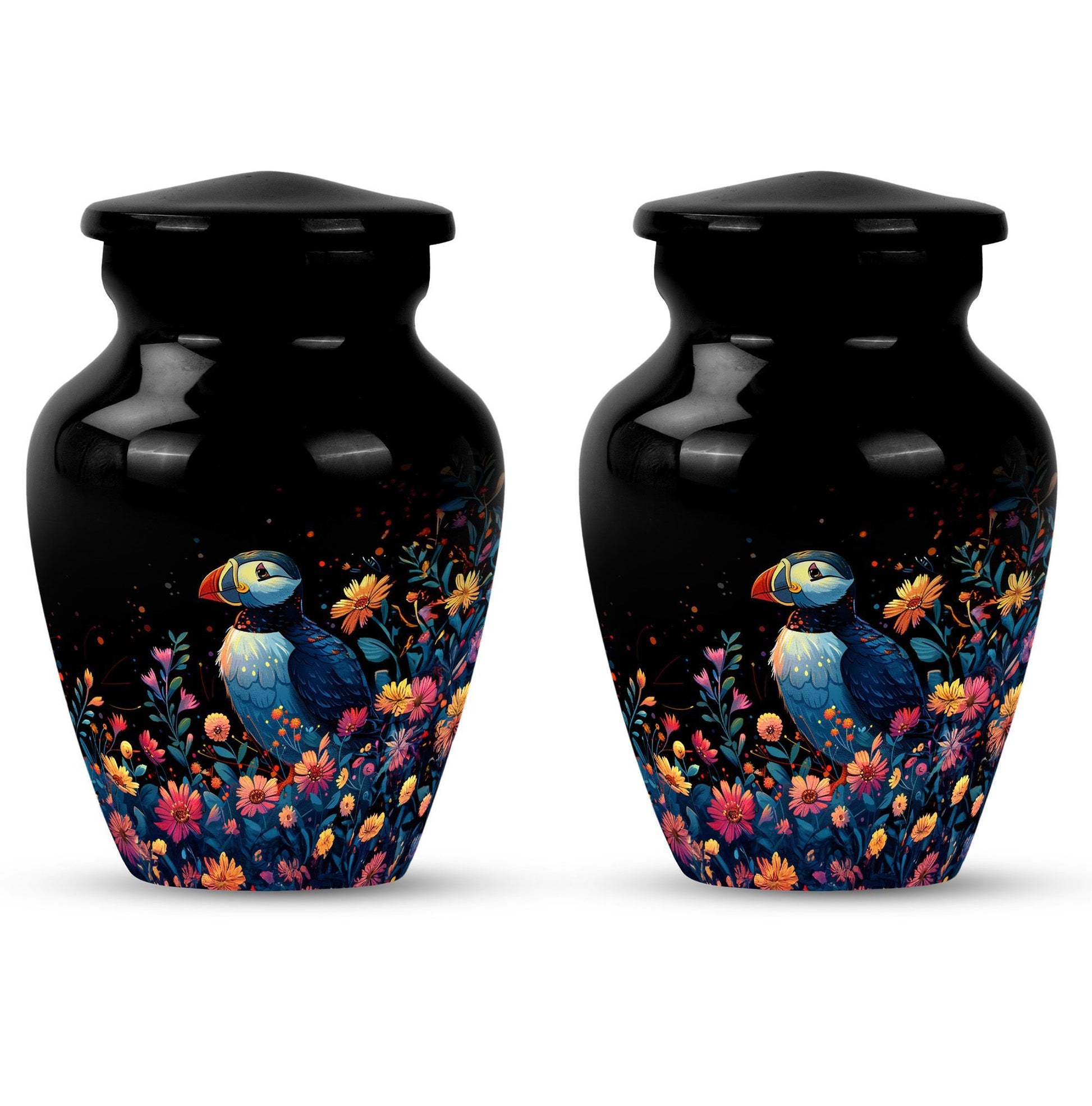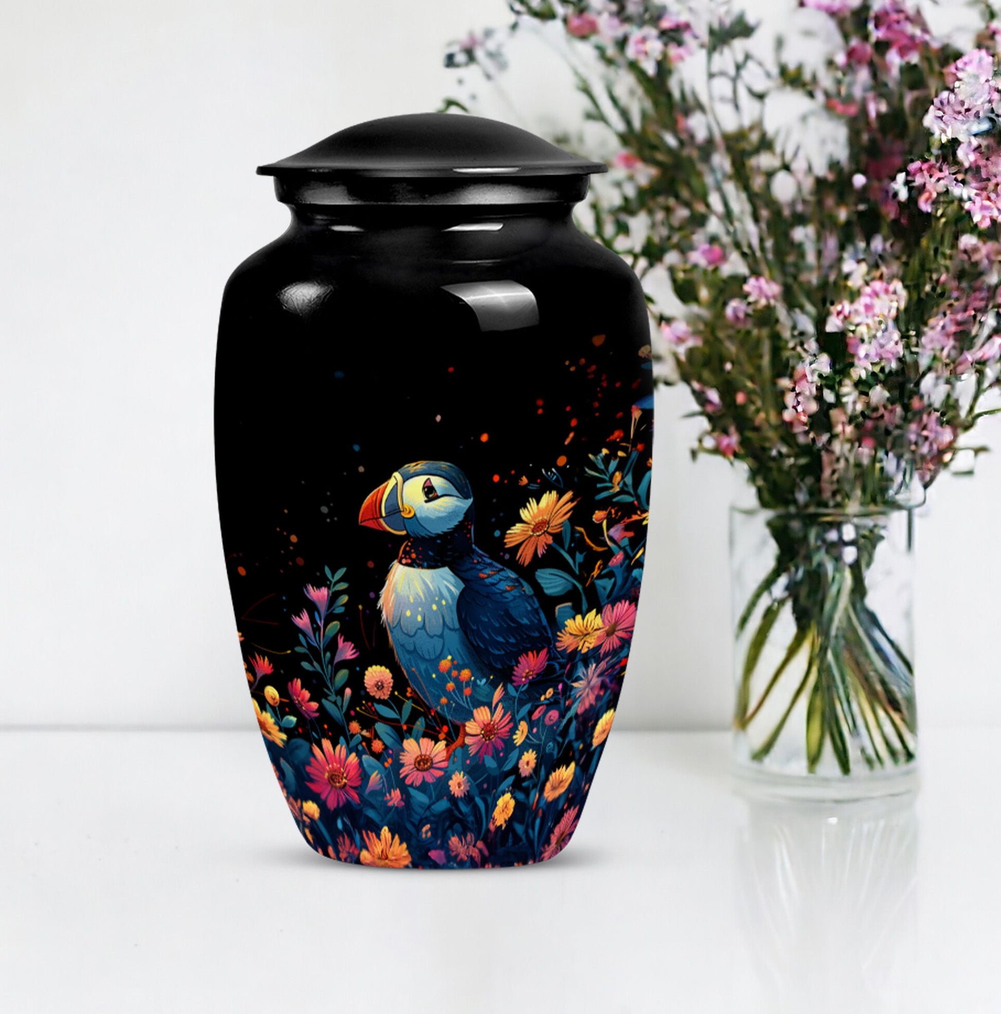 Safeguard the sacred remains of your loved one with the Puffin Bird Urn. This large funeral urn stands at 10 inches tall and has a solemn Puffin Bird theme, offering a unique yet respectful containment for your dearly departed. Crafted from enduring aluminium, the urn weighs a sturdy 3.3 pounds with a sizeable capacity of 200 cubic inches, accommodating human ashes from an adult male or female. It comes with a soft velvet pouch for secure placement of ashes, offering you peace of mind. Further adding to its distinctiveness is the option to personalize it with engraved names, manifesting an everlasting tribute. While it exhibits the classic urn design, the Puffin Bird Urn reintroduces tradition in a unique way. Ideal for memorial ceremonies or simply as a poignant keepsake, entrust the charm of this cremation urn to honor your lost loved one. Search phrases like 'cremation companion urns' or 'memorial urns for adult ashes' may also help you find this product.