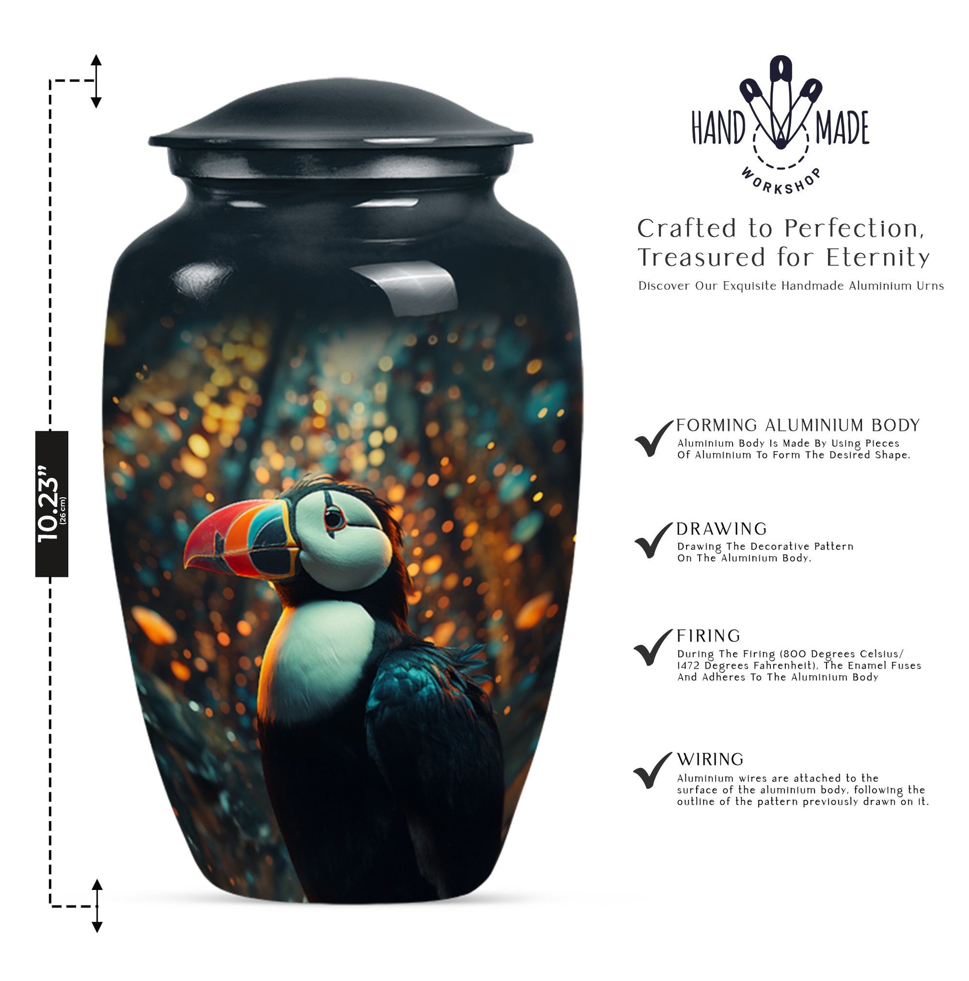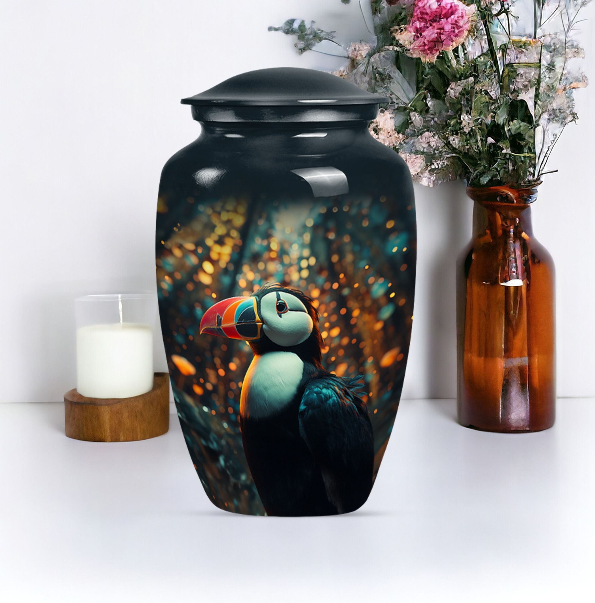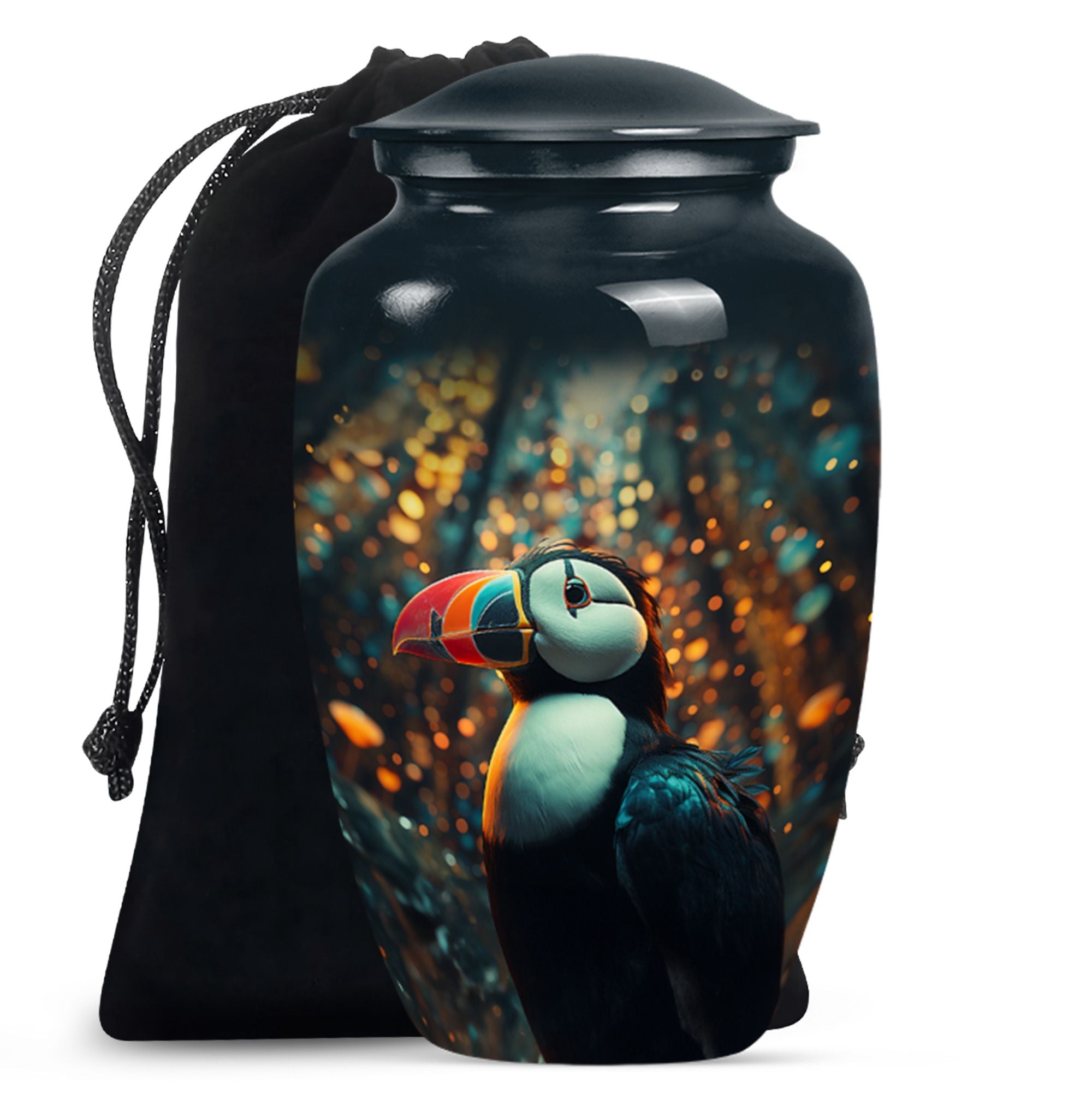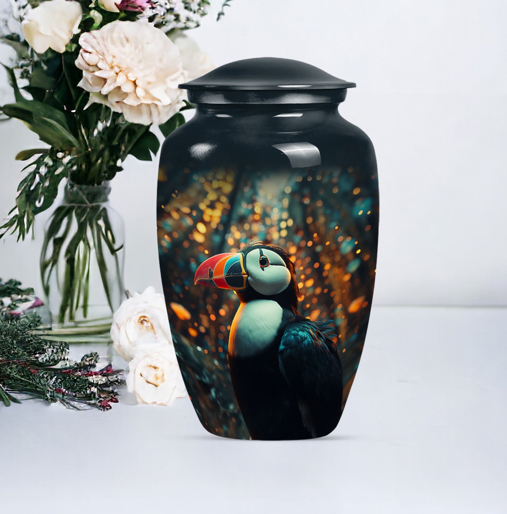 Showcase your loved one's memory with the Puffin Bird Urn. Resiliently crafted from high-quality aluminium with an abstract theme, this large urn is designed not just to house human ashes, but to honor your departed one in a respectful manner. Being 10 inches in height, it comes with a commodious capacity of 200 cubic inches to solely accommodate adult ashes. Weighing at 3.3 pounds, this funeral urn is sturdy and substantial, ensuring a lasting tribute to your beloved. With each Puffin Bird Urn, a velvet pouch is included for safe containment of the ashes. This urn ceremony essential can be personalized to carry the engraving of your loved one's names, imparting an intimate touch to the memorial. Whether it's funeral or memorial medium urn you're searching for, our Puffin Bird Urn impeccably fits your needs. Transform a somber ceremony into a celebration of their life by opting for this monumental piece.