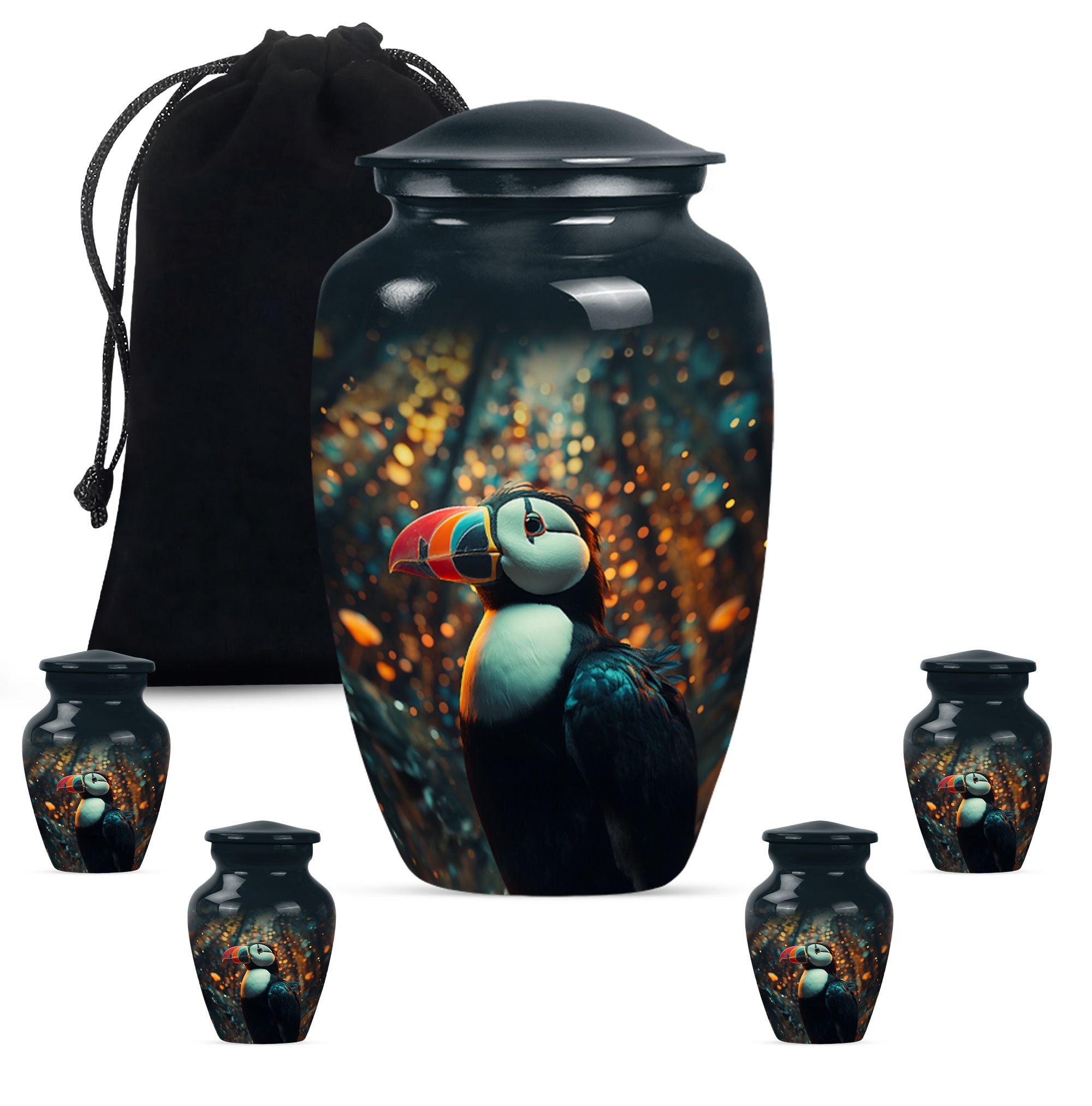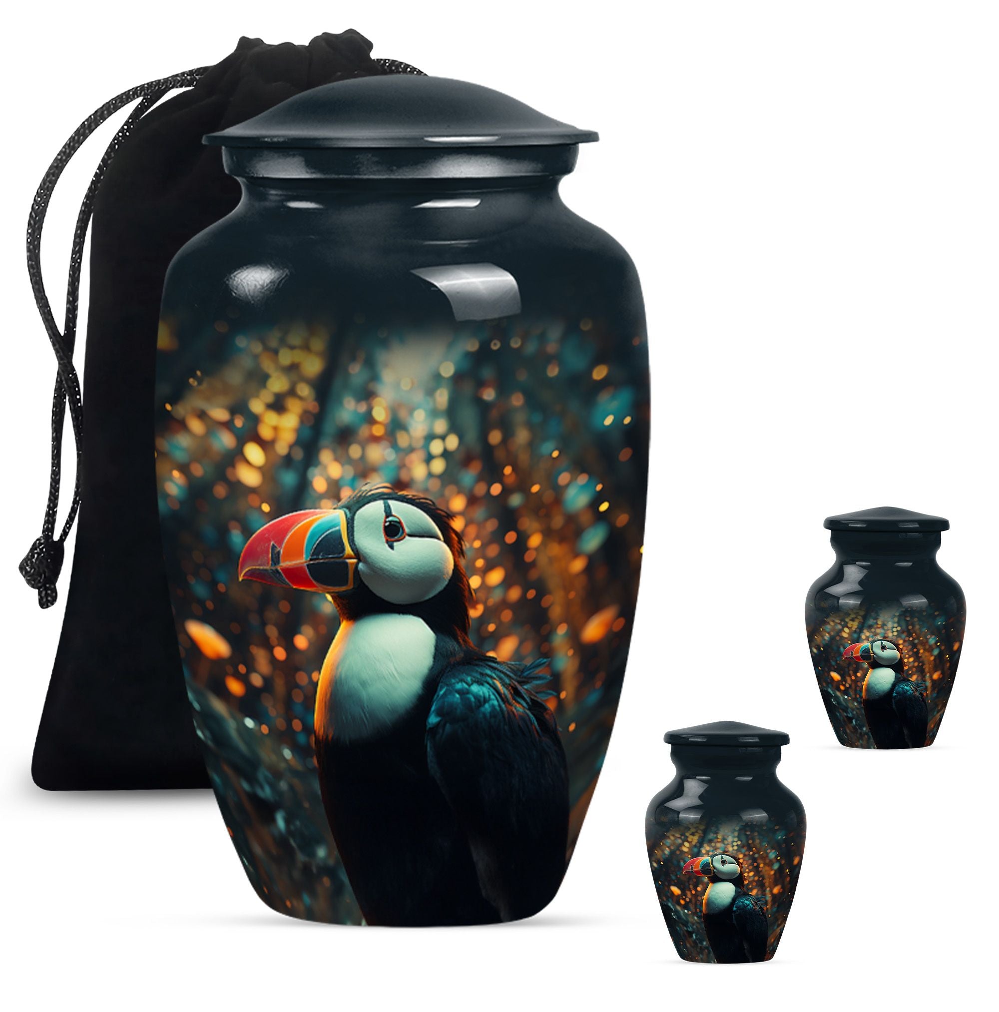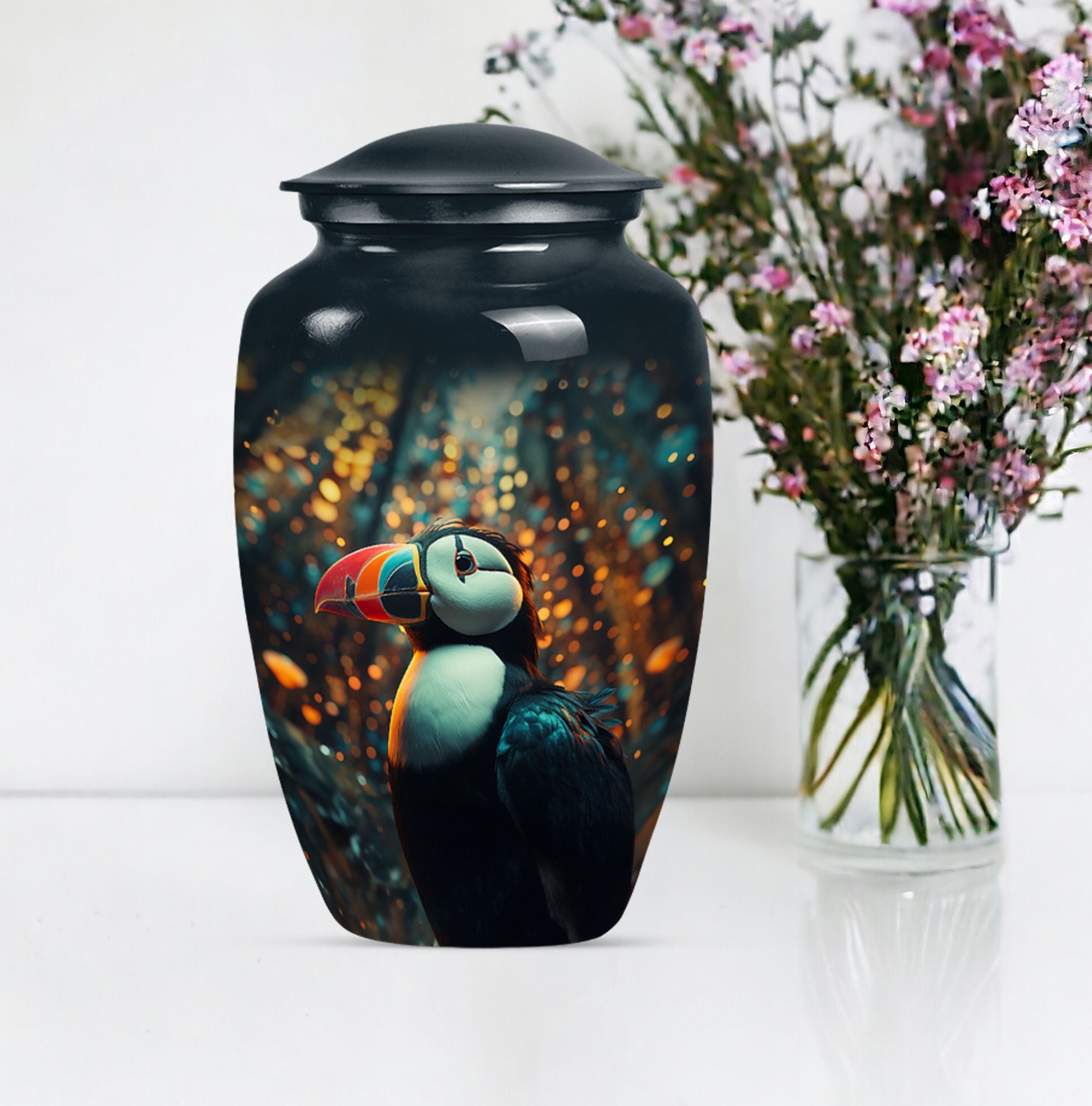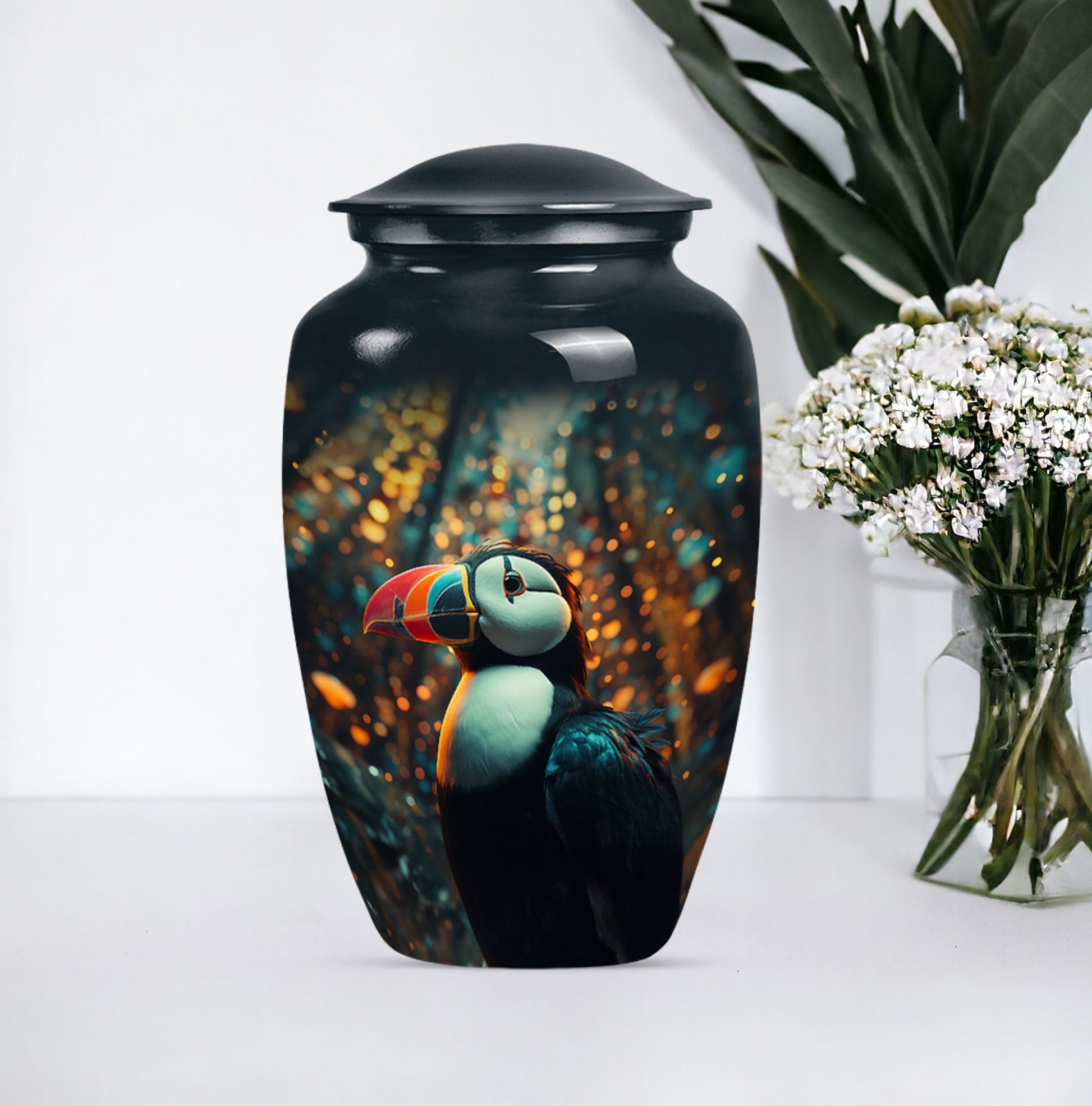 Showcase your loved one's memory with the Puffin Bird Urn. Resiliently crafted from high-quality aluminium with an abstract theme, this large urn is designed not just to house human ashes, but to honor your departed one in a respectful manner. Being 10 inches in height, it comes with a commodious capacity of 200 cubic inches to solely accommodate adult ashes. Weighing at 3.3 pounds, this funeral urn is sturdy and substantial, ensuring a lasting tribute to your beloved. With each Puffin Bird Urn, a velvet pouch is included for safe containment of the ashes. This urn ceremony essential can be personalized to carry the engraving of your loved one's names, imparting an intimate touch to the memorial. Whether it's funeral or memorial medium urn you're searching for, our Puffin Bird Urn impeccably fits your needs. Transform a somber ceremony into a celebration of their life by opting for this monumental piece.