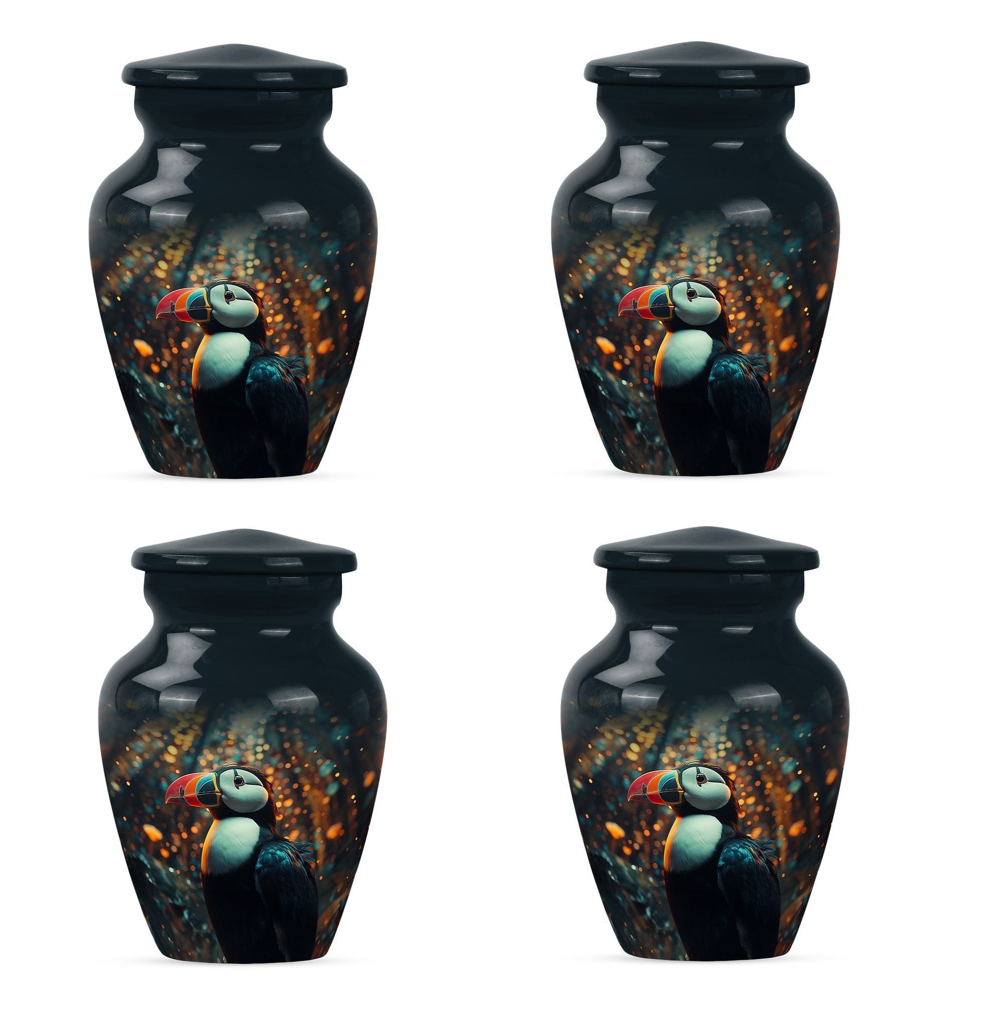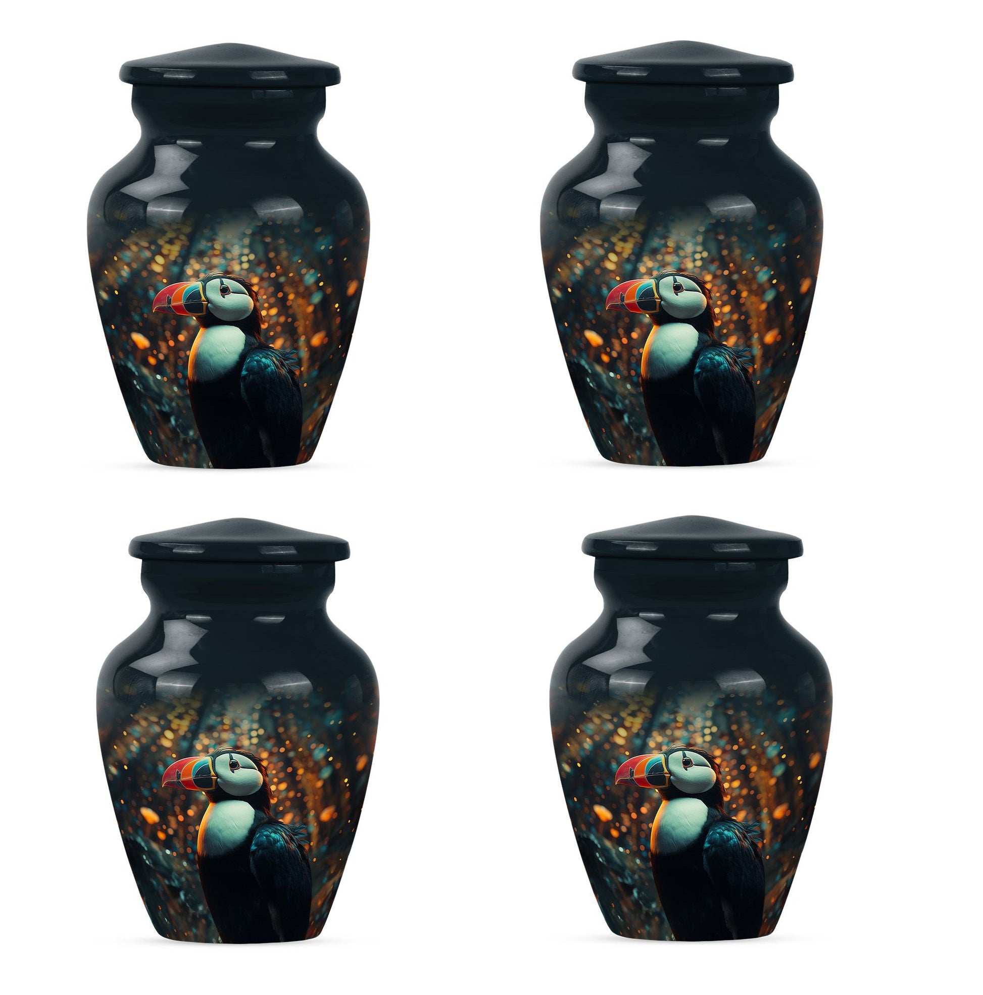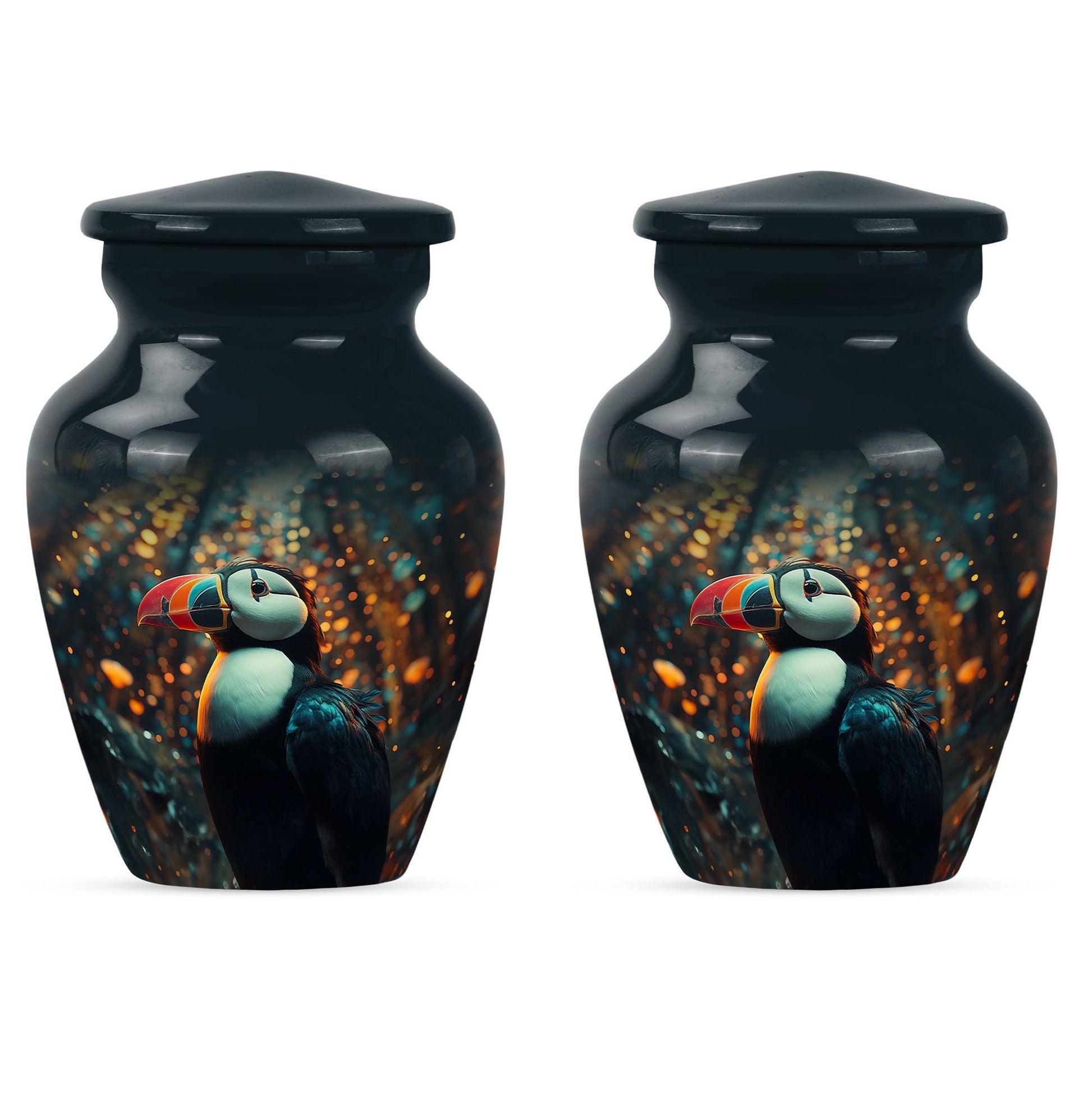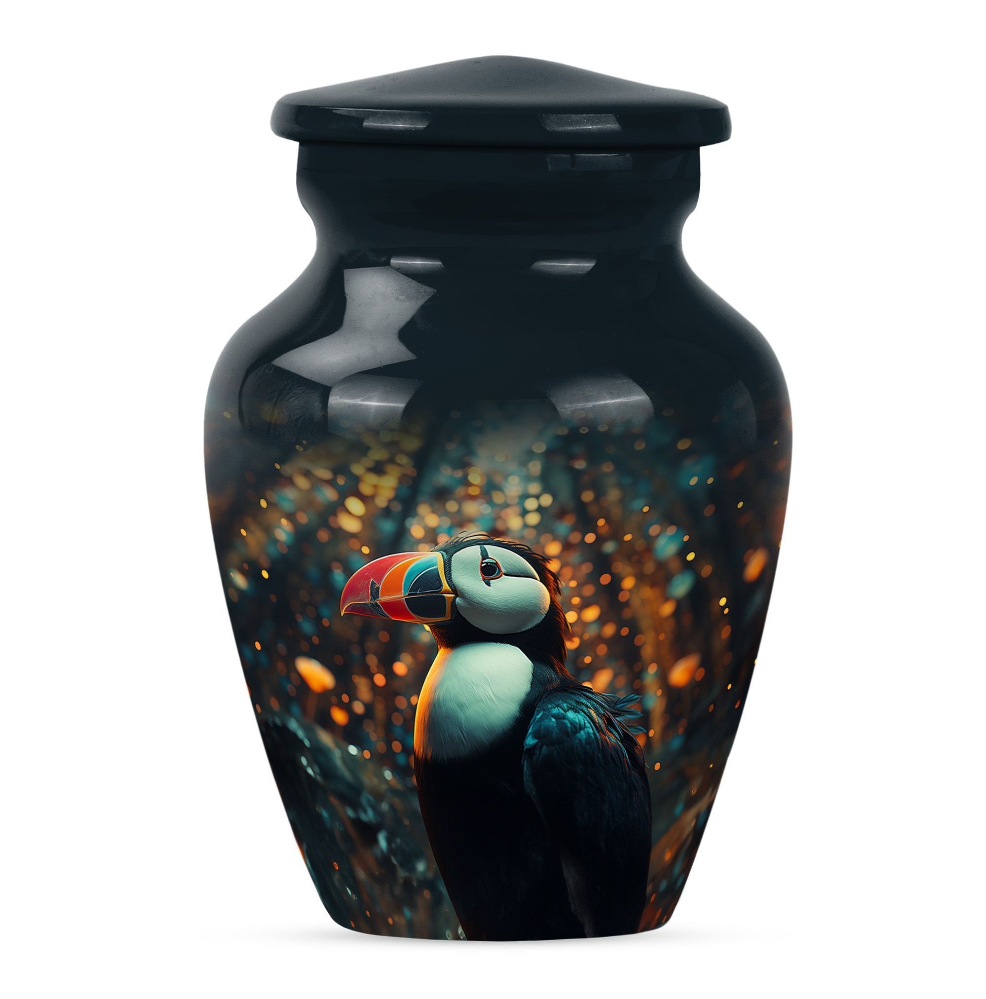Showcase your loved one's memory with the Puffin Bird Urn. Resiliently crafted from high-quality aluminium with an abstract theme, this large urn is designed not just to house human ashes, but to honor your departed one in a respectful manner. Being 10 inches in height, it comes with a commodious capacity of 200 cubic inches to solely accommodate adult ashes. Weighing at 3.3 pounds, this funeral urn is sturdy and substantial, ensuring a lasting tribute to your beloved. With each Puffin Bird Urn, a velvet pouch is included for safe containment of the ashes. This urn ceremony essential can be personalized to carry the engraving of your loved one's names, imparting an intimate touch to the memorial. Whether it's funeral or memorial medium urn you're searching for, our Puffin Bird Urn impeccably fits your needs. Transform a somber ceremony into a celebration of their life by opting for this monumental piece.