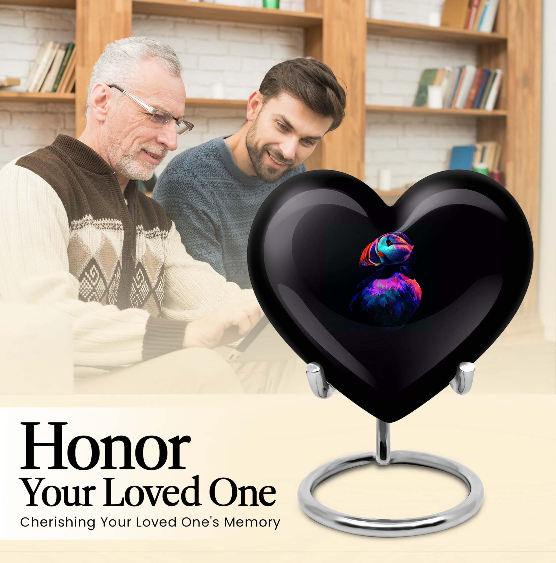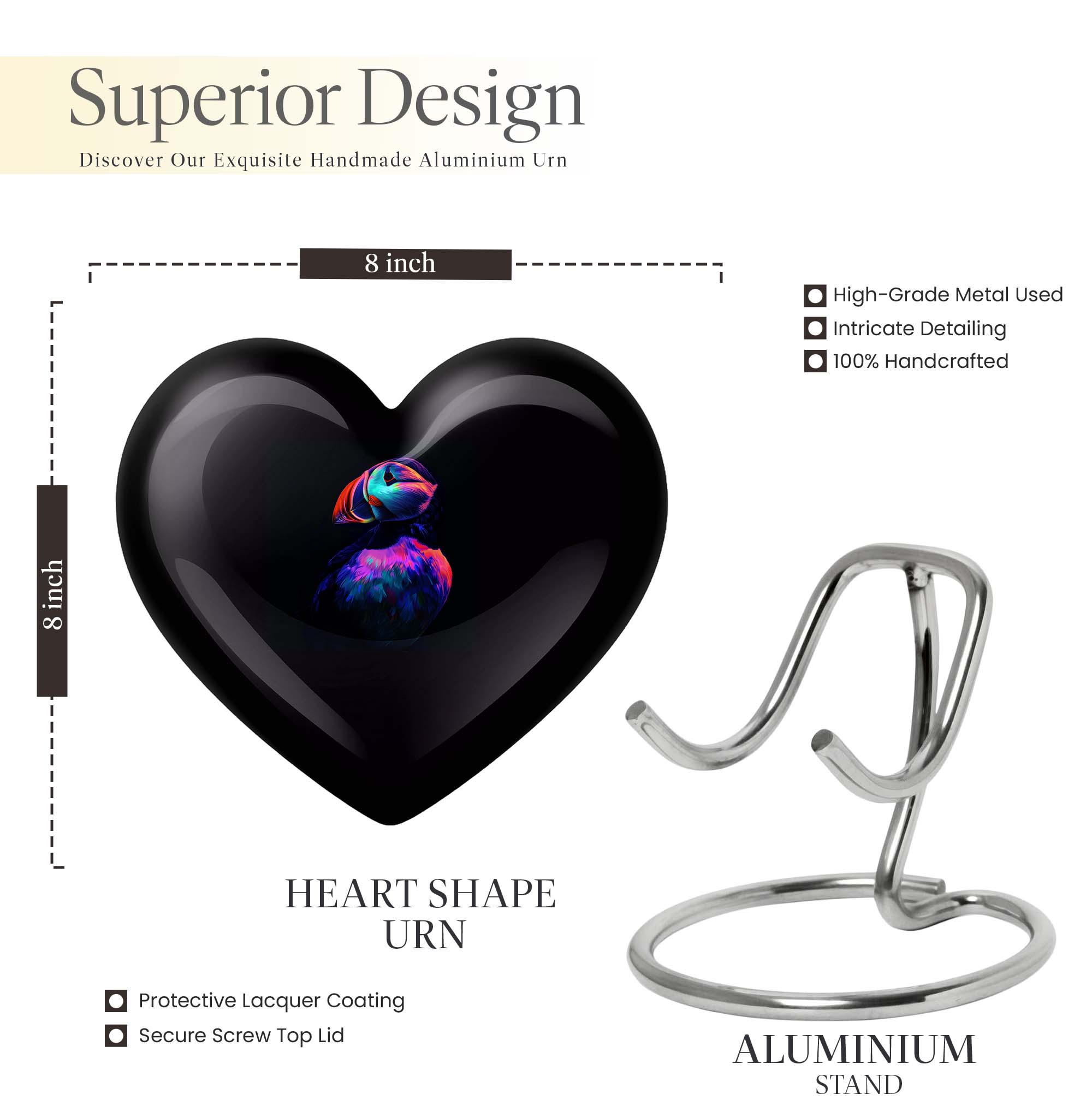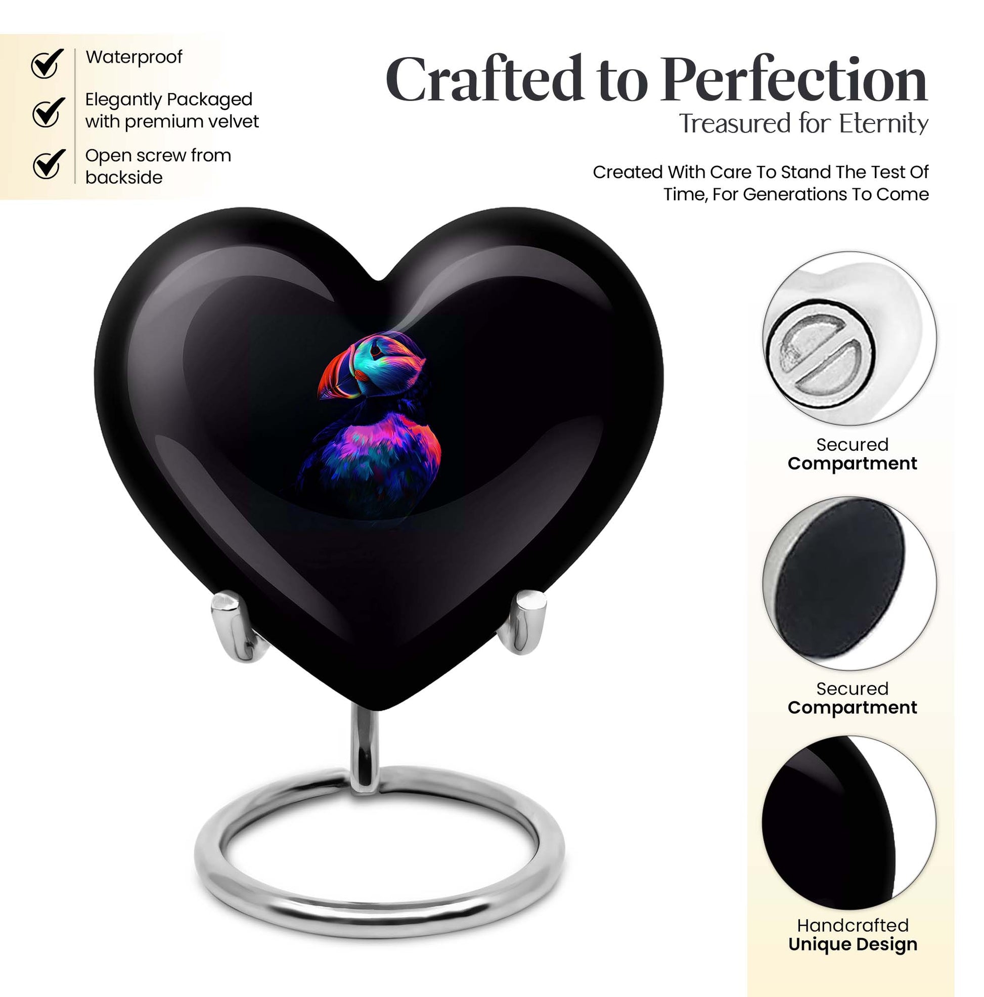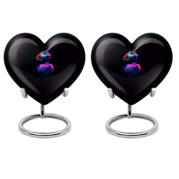 Seek solace in the thought of eternal peace for your loved one with the unique Puffin Bird Urn. Resembling the heart's undying love, this memorial urn is crafted from resilient aluminium, ensuring long-lastingness. It sports an abstract theme that transcends traditional bounds, adding a touch of enigma and interest to this resting place for cremation ashes. Digitized at a size of 10 inches, it comfortably holds up to 200 cubic inches of ashes, making it a practicable choice for adult male ashes. The convenient weight of 3.3 pounds adds stability, while the heart urn doesn't fall back on style either. Customization facilities are readily available to personalize the urn with engraved names, creating an everlasting tribute. Be it for your mother or any loved one, this burial urn can aptly fit into urban homes acting as a subtle decor. It also comes with a velvet pouch for containment of ashes, ensuring careful preservation during these poignant times. So, entrust the memories of your cherished ones in this compact urn - a symbol of eternal love and respect.