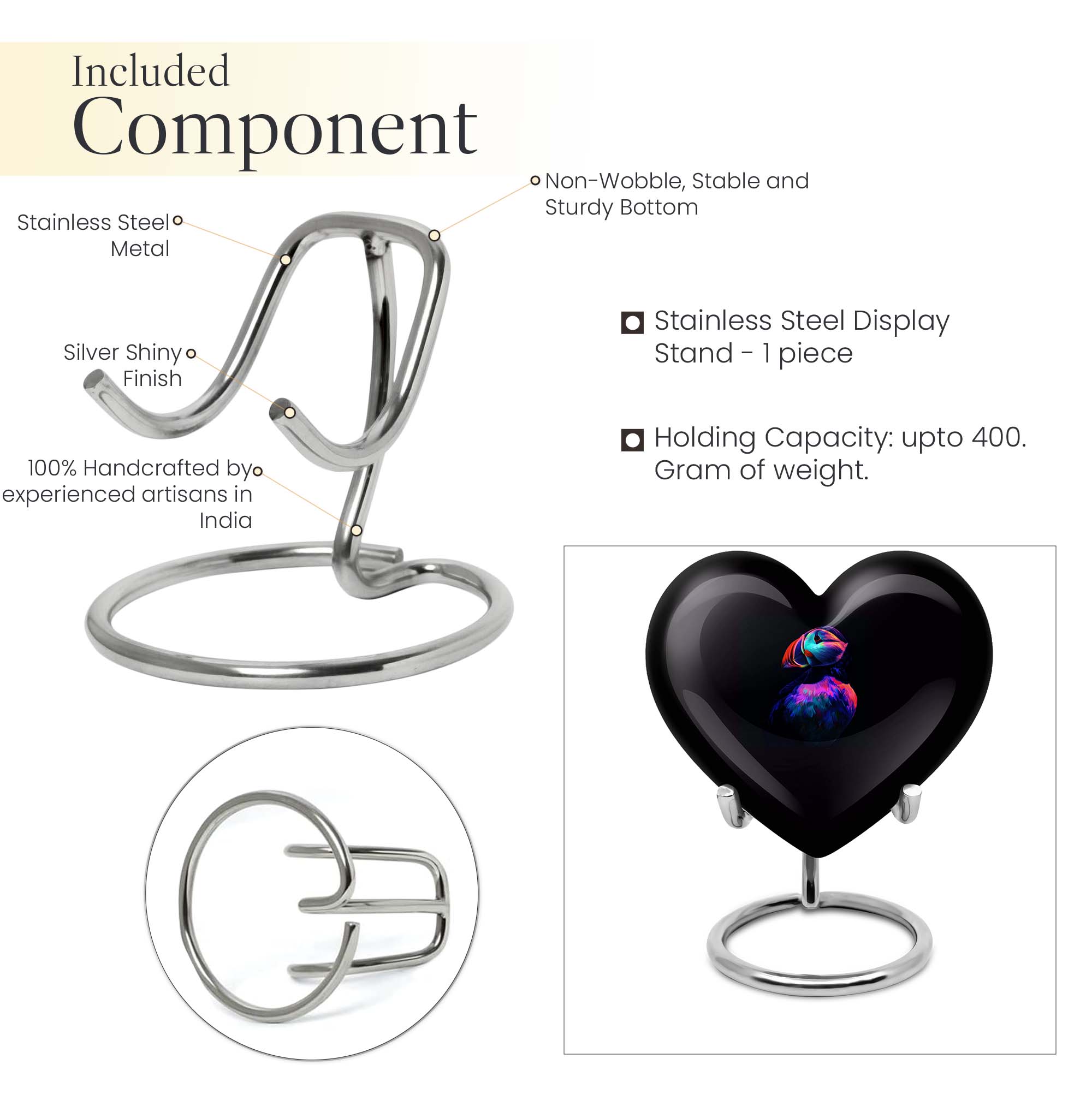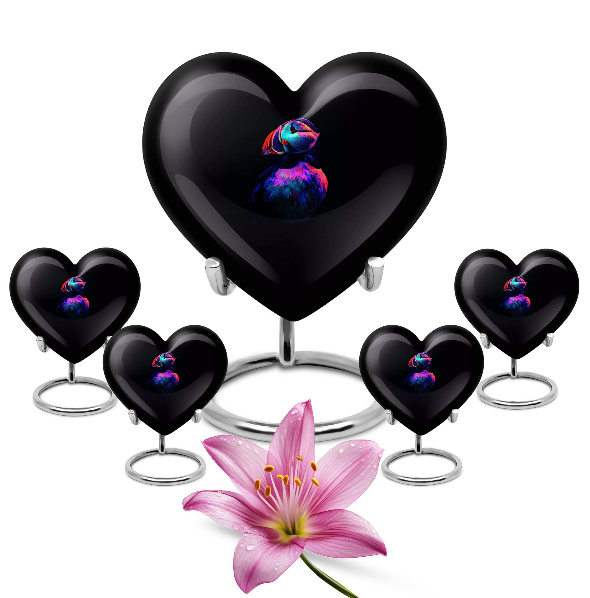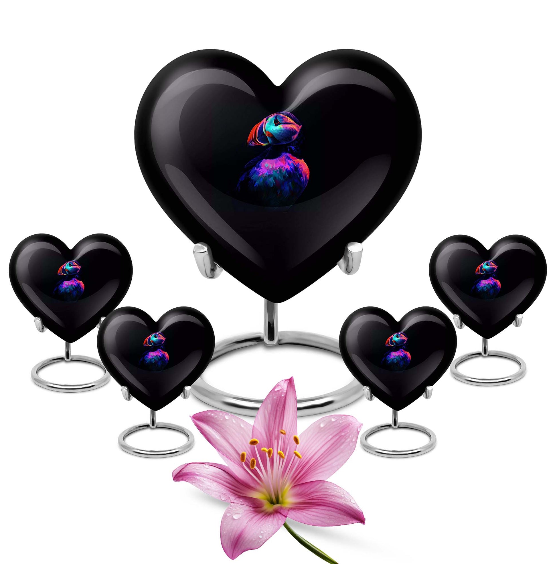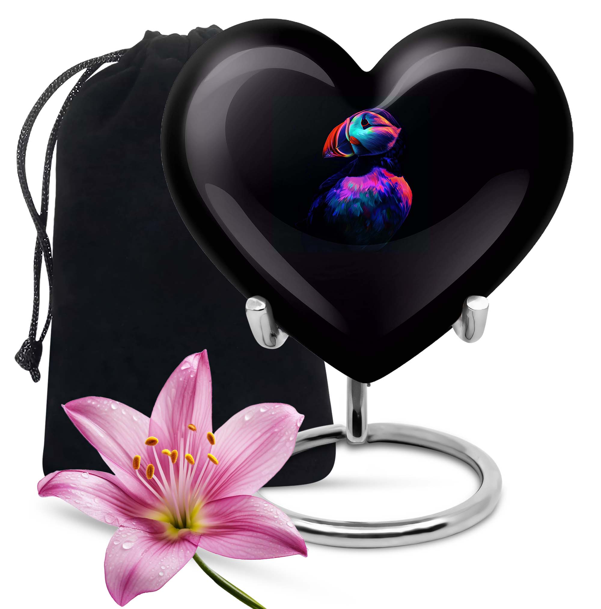 Seek solace in the thought of eternal peace for your loved one with the unique Puffin Bird Urn. Resembling the heart's undying love, this memorial urn is crafted from resilient aluminium, ensuring long-lastingness. It sports an abstract theme that transcends traditional bounds, adding a touch of enigma and interest to this resting place for cremation ashes. Digitized at a size of 10 inches, it comfortably holds up to 200 cubic inches of ashes, making it a practicable choice for adult male ashes. The convenient weight of 3.3 pounds adds stability, while the heart urn doesn't fall back on style either. Customization facilities are readily available to personalize the urn with engraved names, creating an everlasting tribute. Be it for your mother or any loved one, this burial urn can aptly fit into urban homes acting as a subtle decor. It also comes with a velvet pouch for containment of ashes, ensuring careful preservation during these poignant times. So, entrust the memories of your cherished ones in this compact urn - a symbol of eternal love and respect.