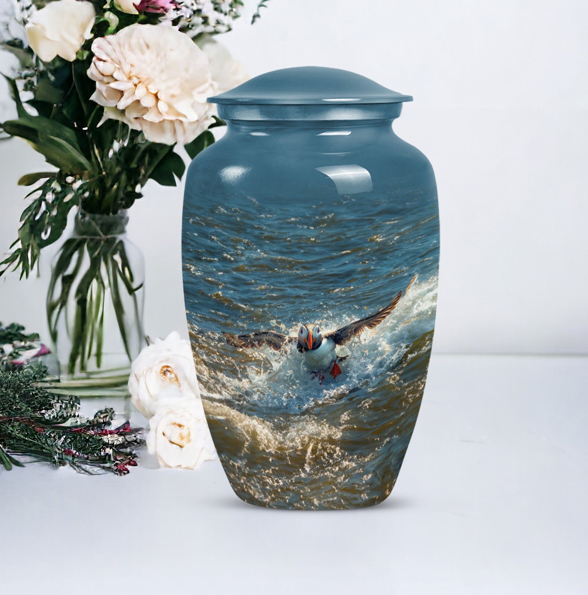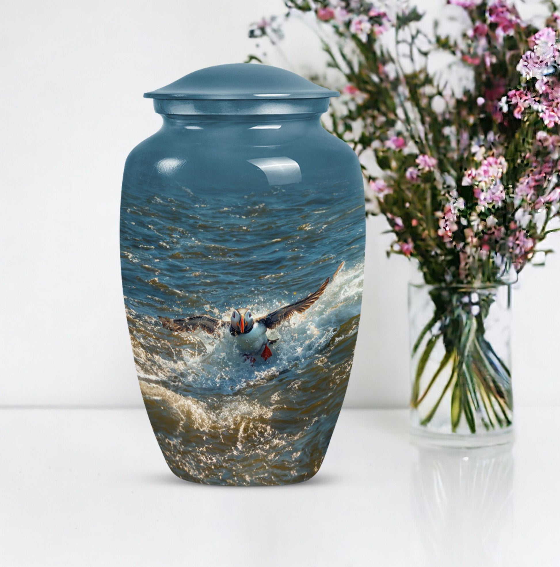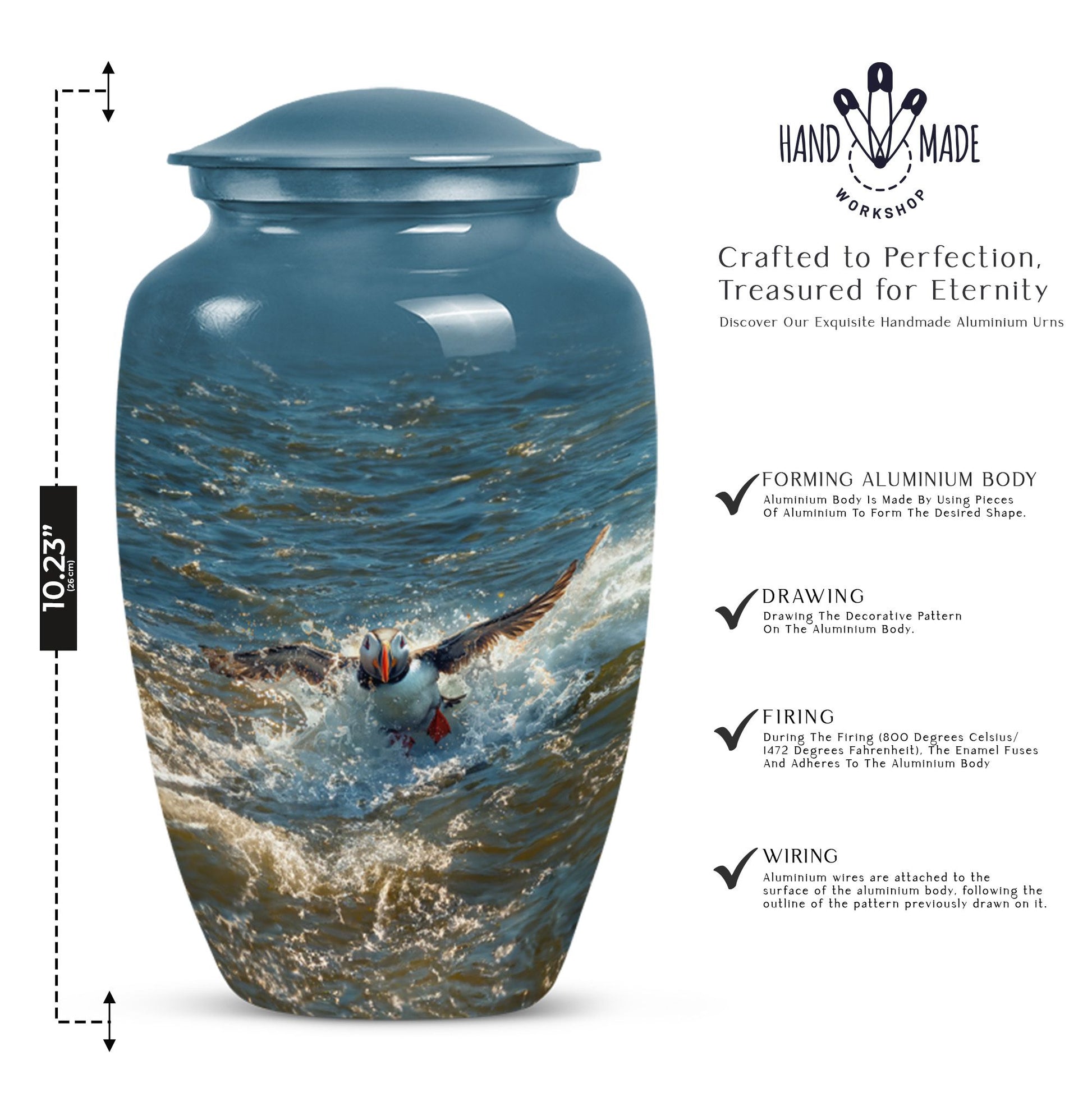 Discover serenity with our Puffin Bird Urn, a symbol of peace and beauty during a time of loss. This burial ash urn is designed for adults, skillfully crafted from quality aluminium to ensure durability. With a size of 10 inches and weight of 3.3 pounds, it exudes an undeniable presence. The capacity to hold up to 200 cubic inches of cremation ashes makes it an ideal choice for honoring your loved ones. Plus, you can make it more personal by engraving the names. This large urn comes with a velvet pouch for safe containment and respectful handling of the ashes. The choice of material and the elegant Puffin Bird theme adds to its grace. Whether you're searching for cremation urns for adult female ashes, urn for human ash adult male, or cremation urn for adult ashes men, this memorial urn is a lasting tribute to your beloved.