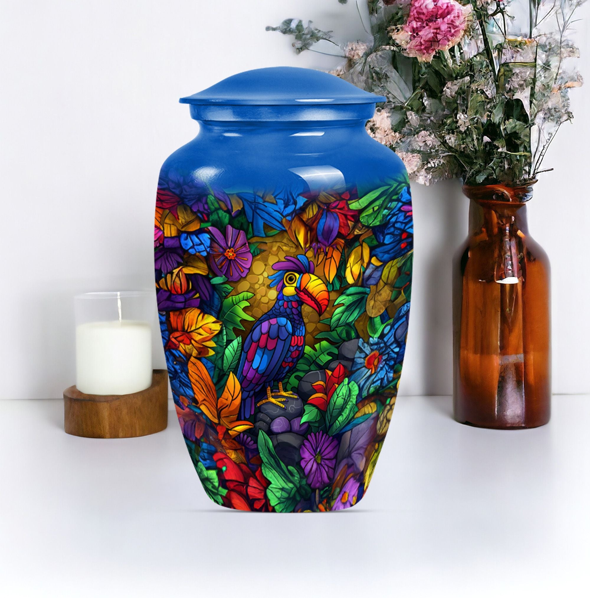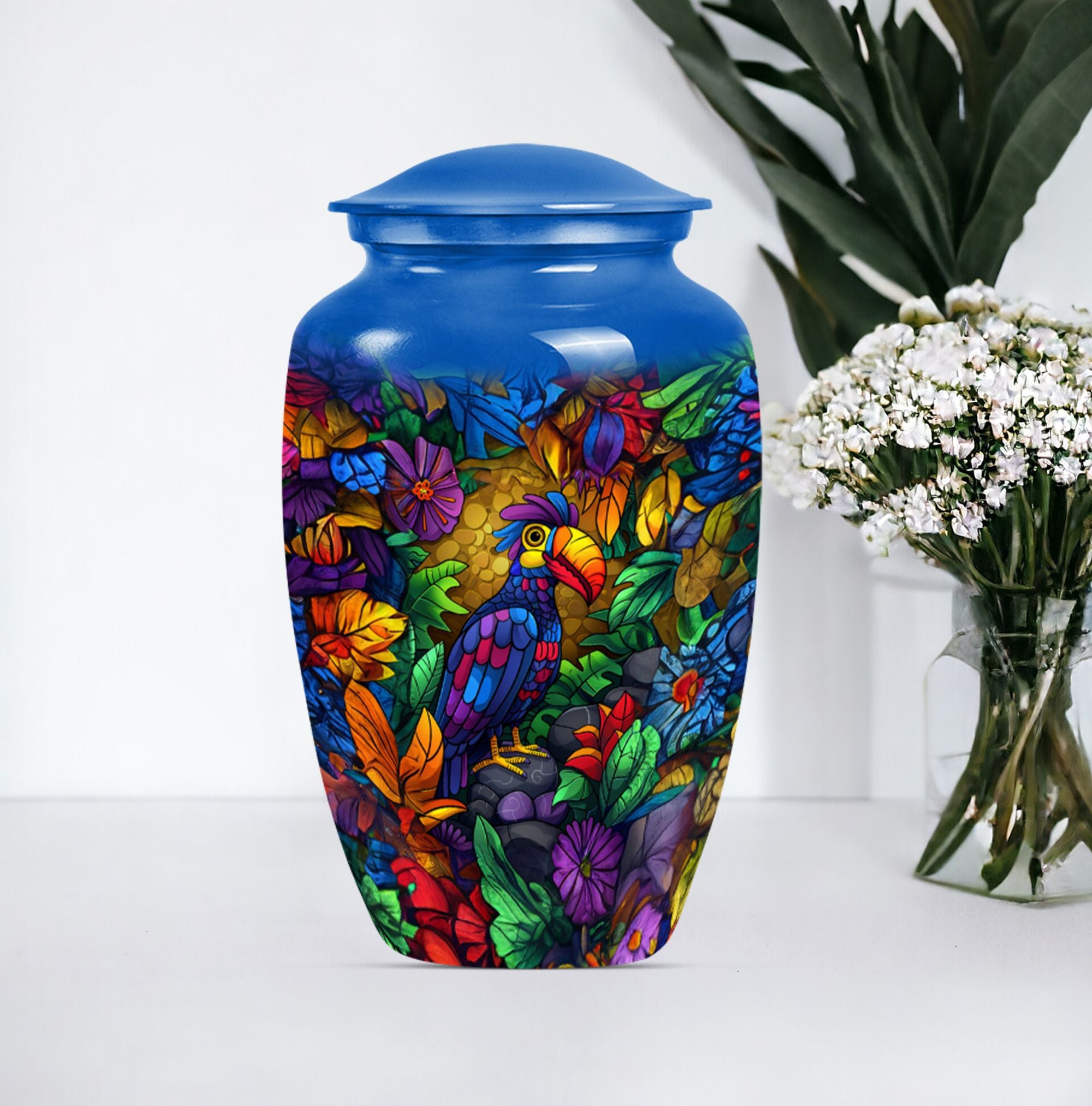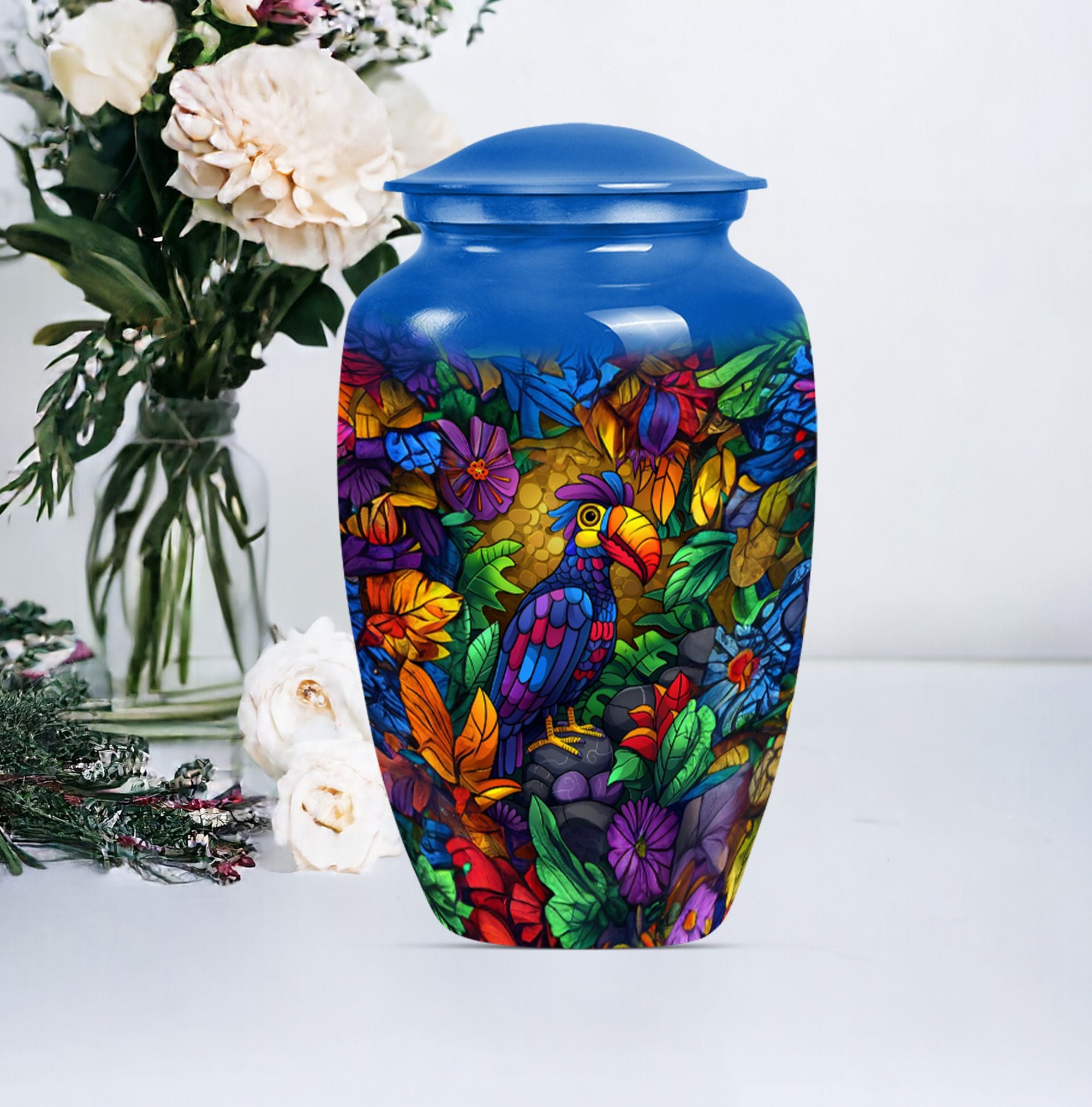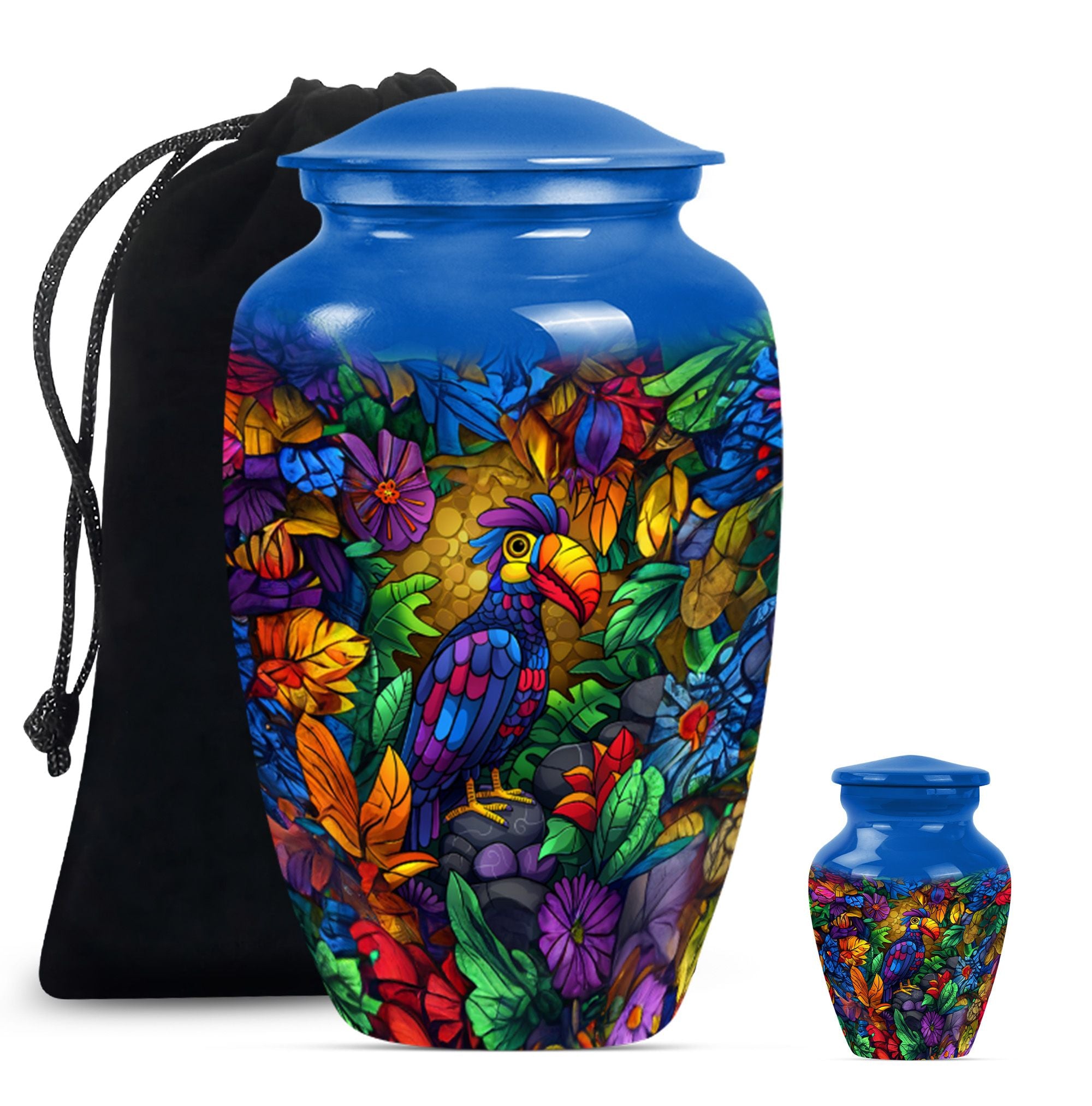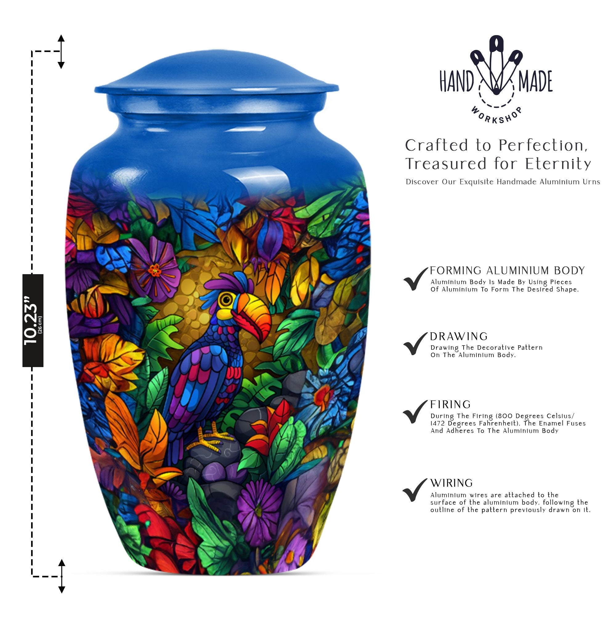 Pay your respects and honor the memory of your lost loved one with the Puffin Bird Urn, a memorial urn for an adult male. Standing at a sizable 10 inches in height and capable of containing up to 200 cubic inches, this large urn is a dignified final resting place. Despite its significant capacity, it weighs a manageable 3.3 pounds thanks to its aluminium construction. This large urn features a time-honored abstract theme and arrives with a velvet pouch for respectful containment and easy transportation of ashes. Additionally, you have the opportunity to personalize the urn with engraved names, adding a special, intimate touch to an already unique memorial piece. It's more than just funeral medium-sized urns for human ashes, it's a symbol of a life worth remembering. Ideal for those seeking urns for human ashes adult sized and companion cremation urns for 2 adults, the Puffin Bird Urn represents a soothing semblance of peace and respect.