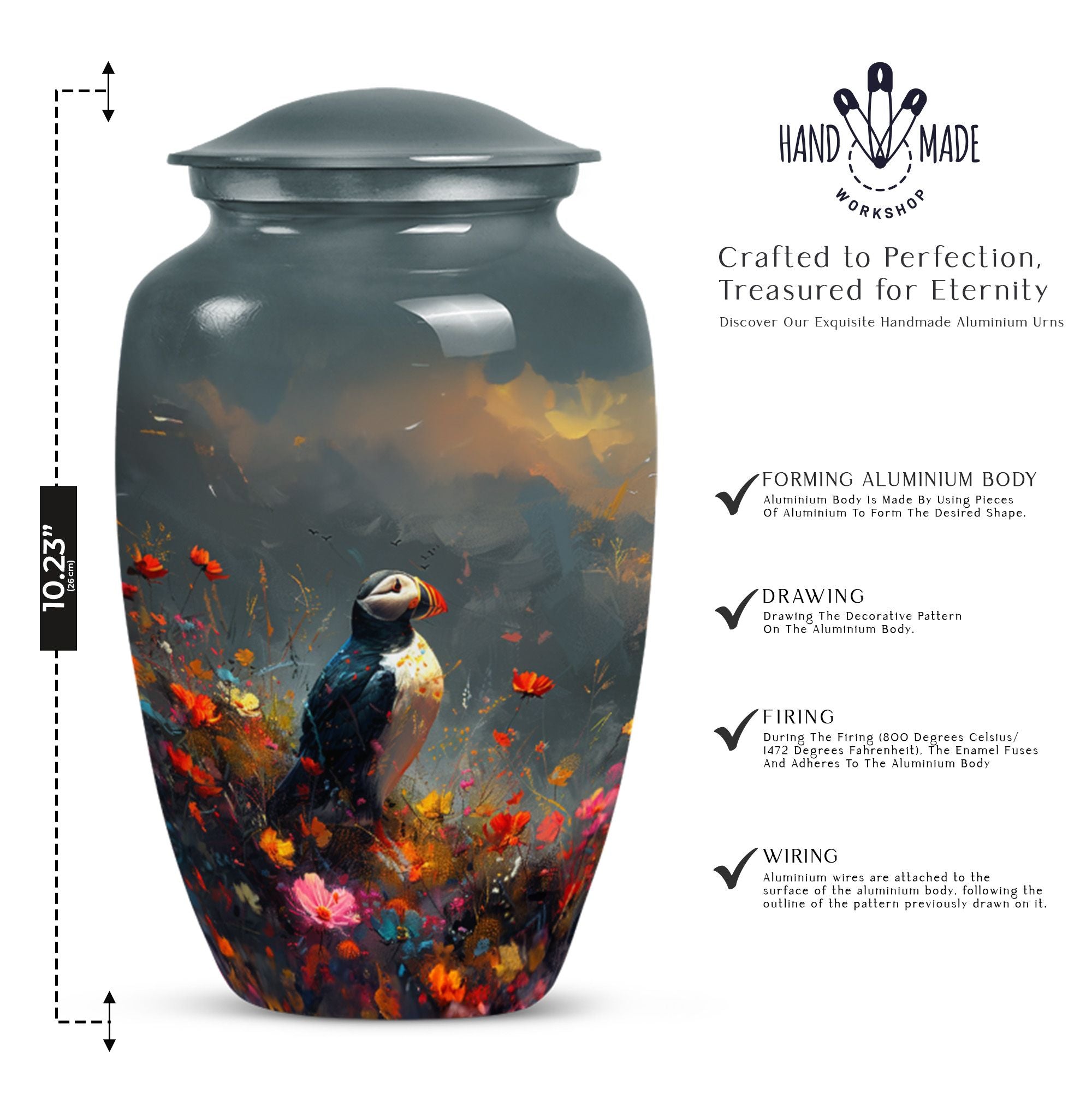 Elevate your memorial tribute with our Puffin Bird Urn, a poignant and durable cremation urn for ashes expertly crafted for adult females. Uniquely themed with the graceful 'Puffin Bird,' this large urn designed to offer an everlasting peaceful resting place for your loved one. Measuring 10-inches in height, and a capacity of 200 cubic inches, this urn can comfortably contain the ashes of your loved one, ensuring their memories live on. We understand the need for a personal touch in your memorial journey, thus providing the option to personalize the urn with engraved names. This 3.3 pounds urn, constructed of premium quality aluminium, guarantees longevity and durability, maintaining its elegance over time. Our package includes a thoughtful velvet pouch for containment and protection of the ashes. Honor your dearly departed with these burial large urns, the perfect urns for ashes and cremation ashes containers for a touching memorial.