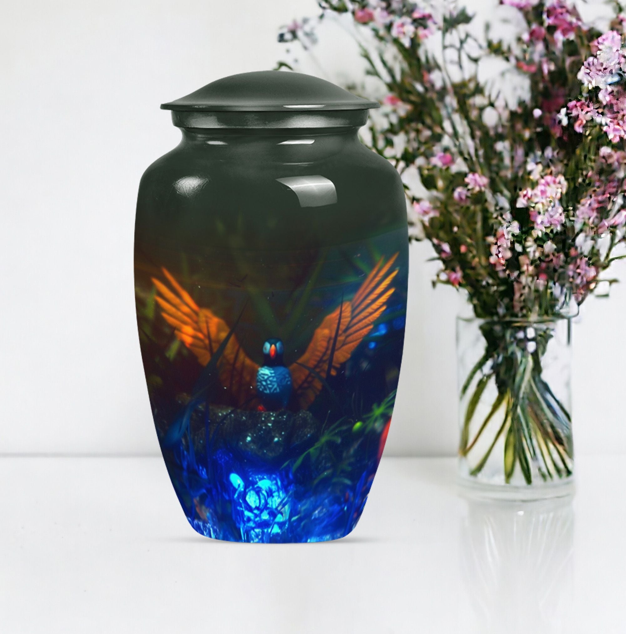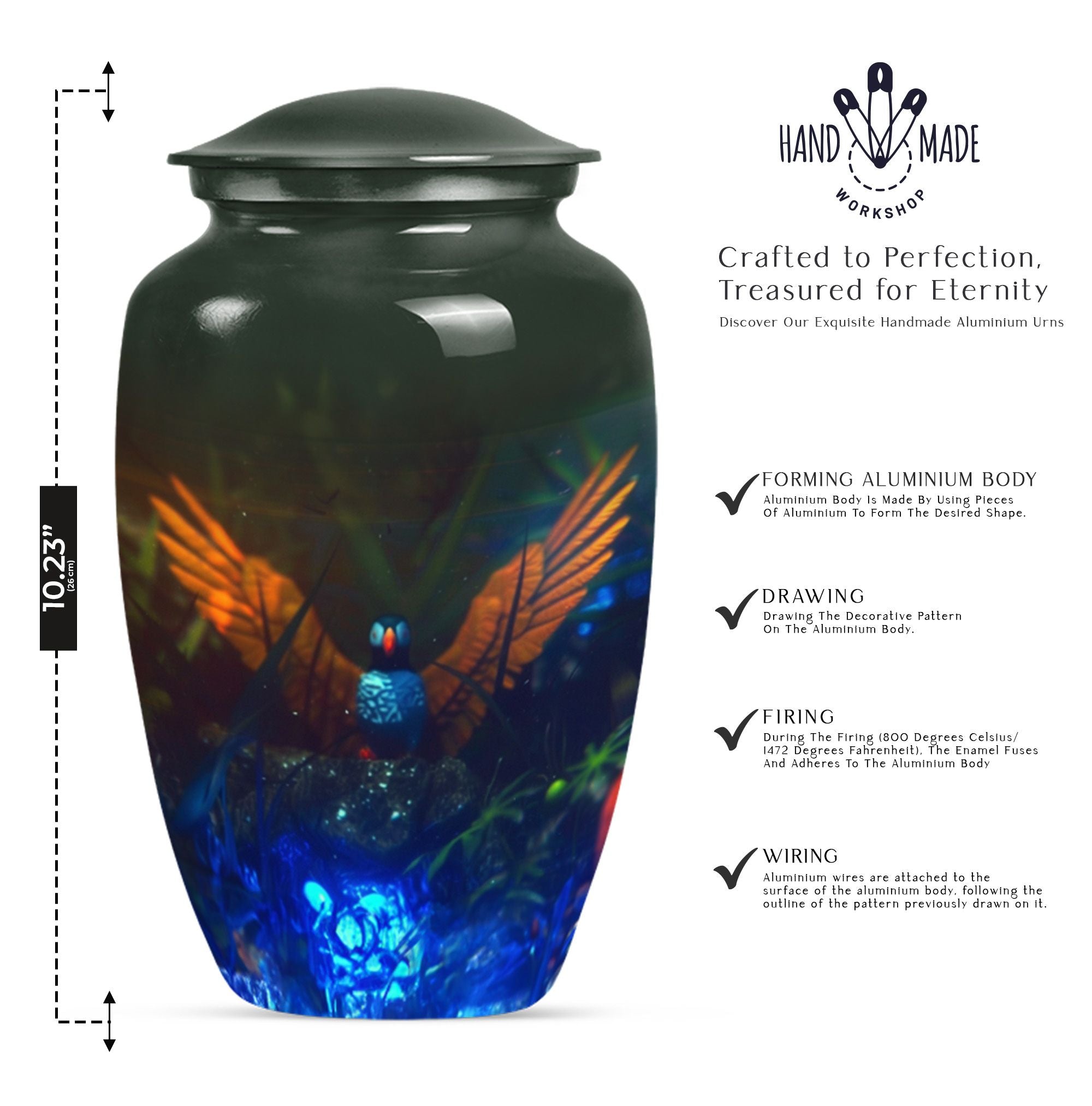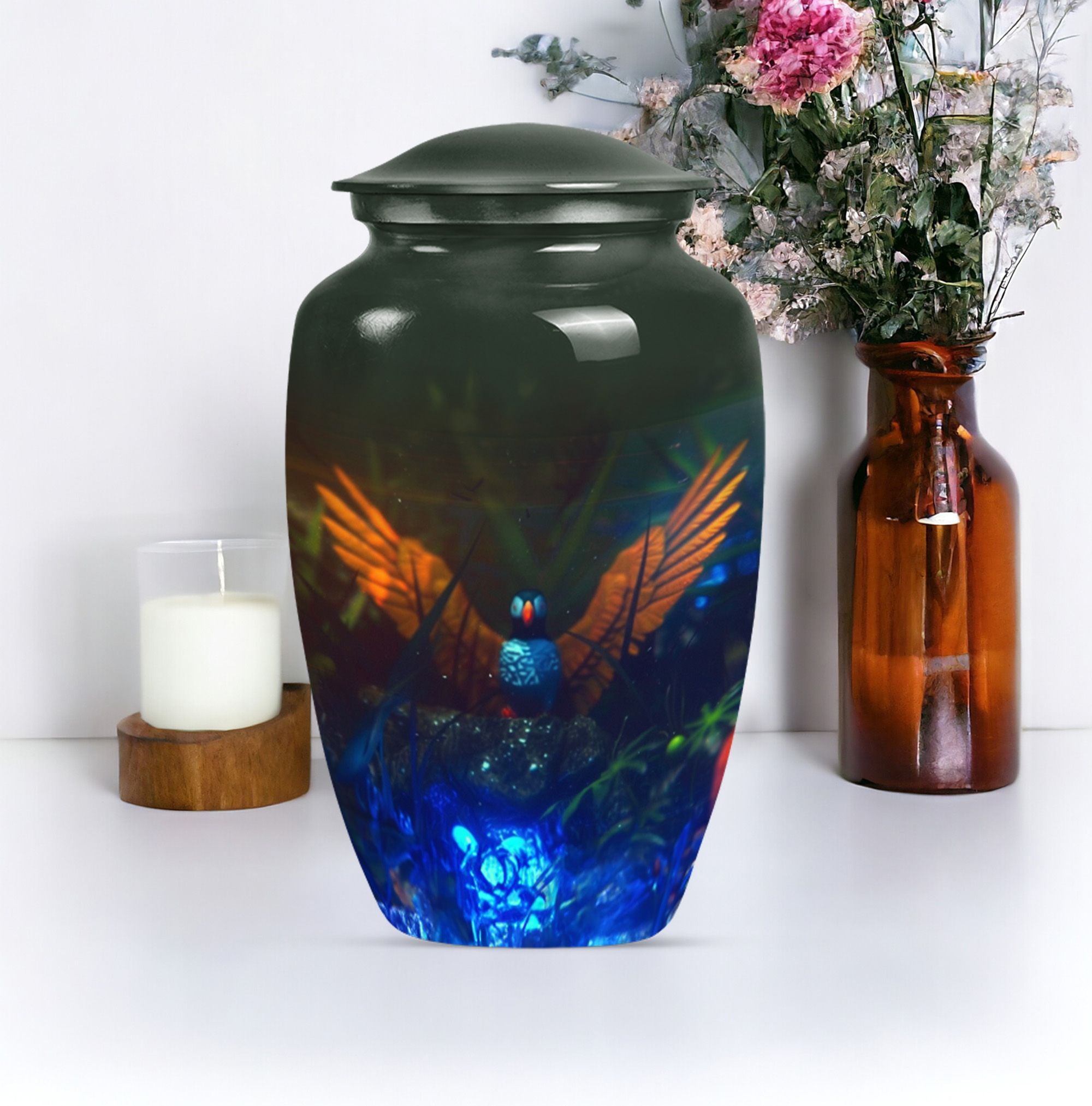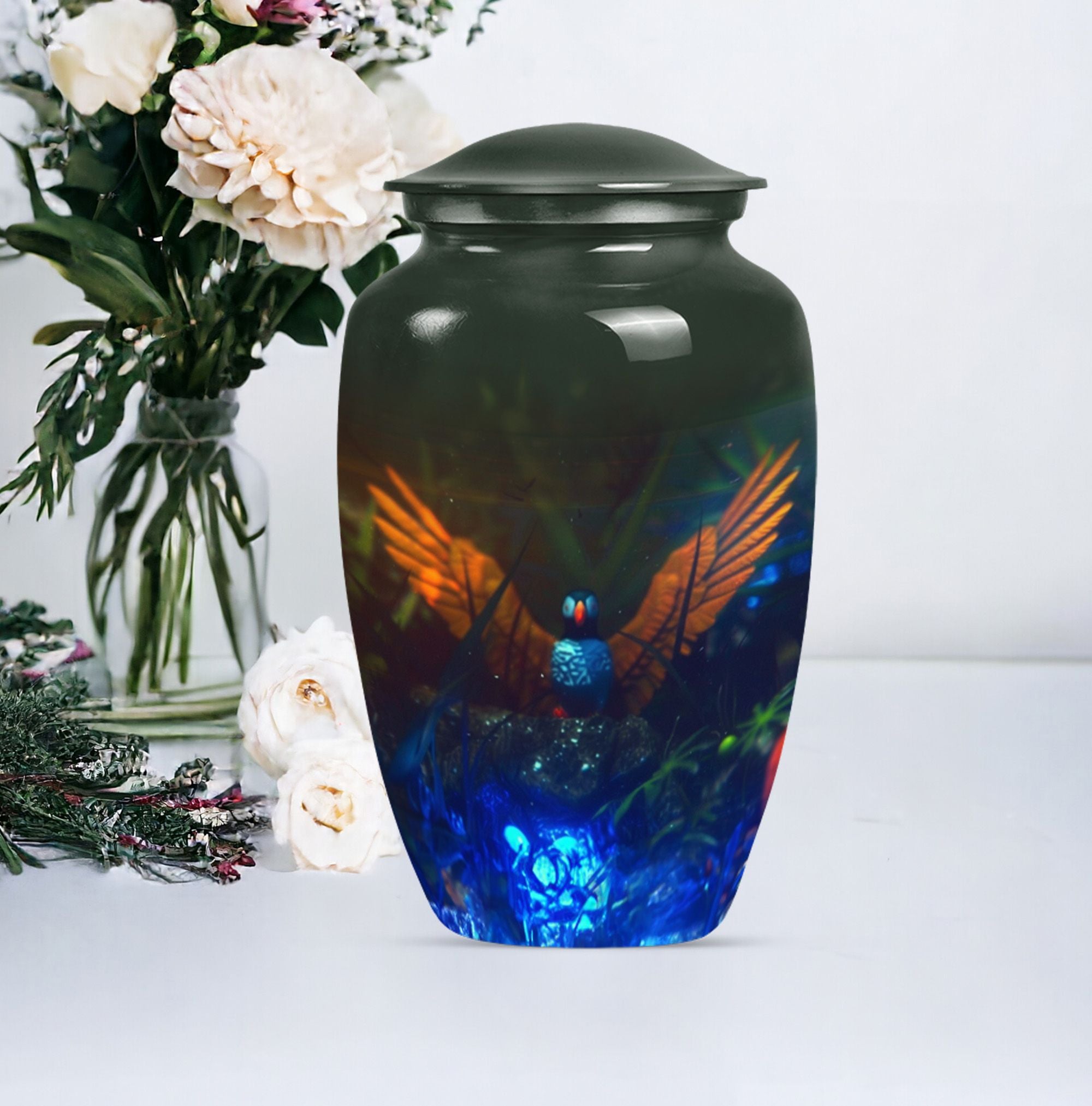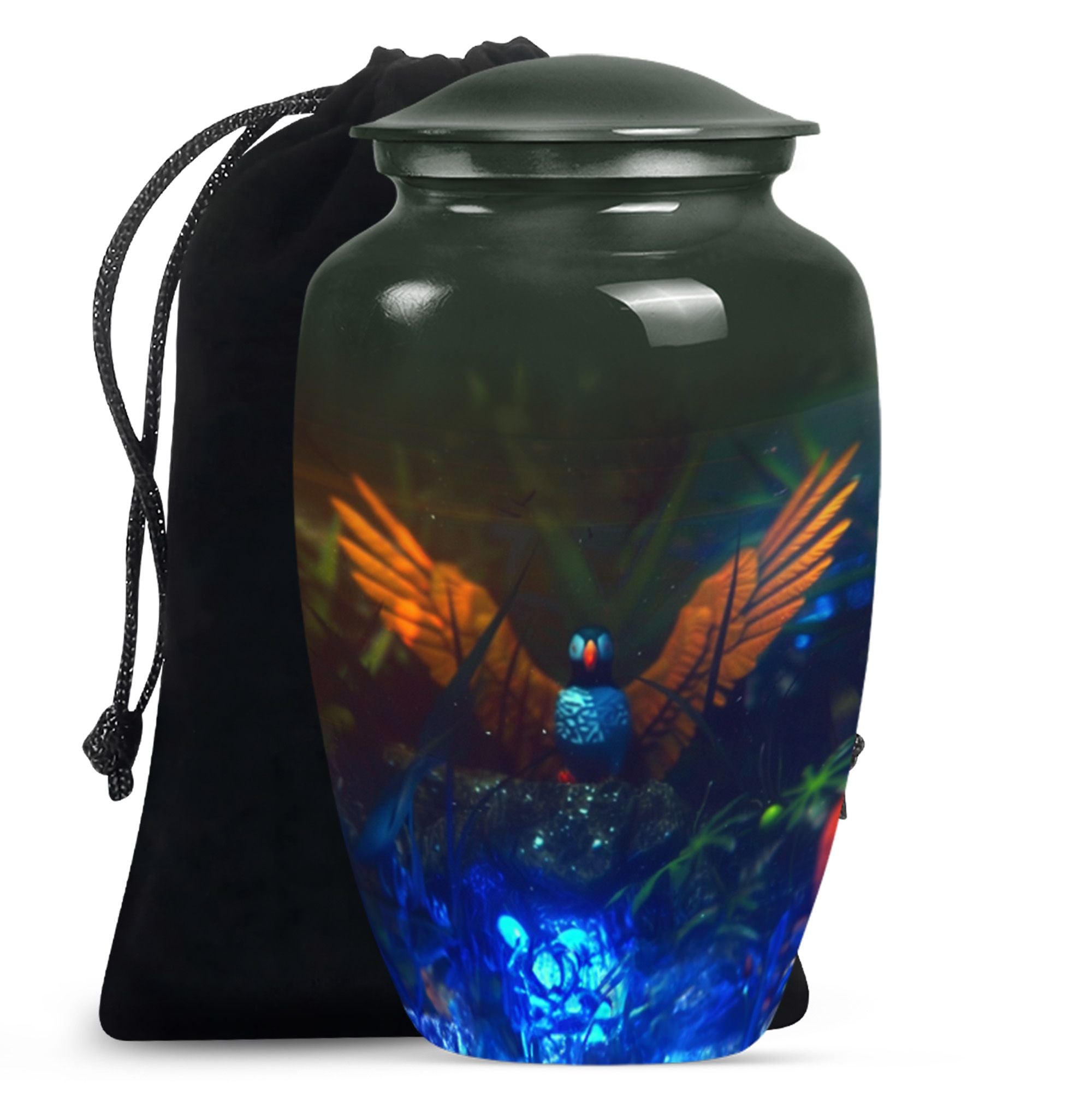 Discover the Puffin Bird Urn, an exemplary and distinctive choice among memorial adult urns for human ashes. Its unique abstract theme combined with its familiar and comforting 'classic urn' look offers a fitting final resting place. Crafted from high-quality aluminium, this sizeable urn measures substantial 10 inches in height and has been designed with a generous 200 cubic inch capacity - suitable as large urns for all adults. The urn's weight of 3.3 pounds ensures stability, providing peace of mind. Every purchase includes a lovely velvet pouch for secure containment of your loved one's ashes, an approach to memorializing that offers both elegance and warmth. Consider the option to personalize your urn, adding engraved names to create a bespoke monument. This cremation urn stands apart in the memorial ceremony supply category, equally suited to adult male or female ashes. Seamless and dignified, the Puffin Bird Urn provides a lasting tribute.
