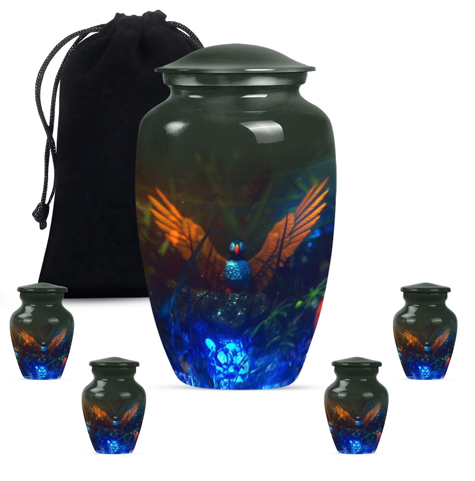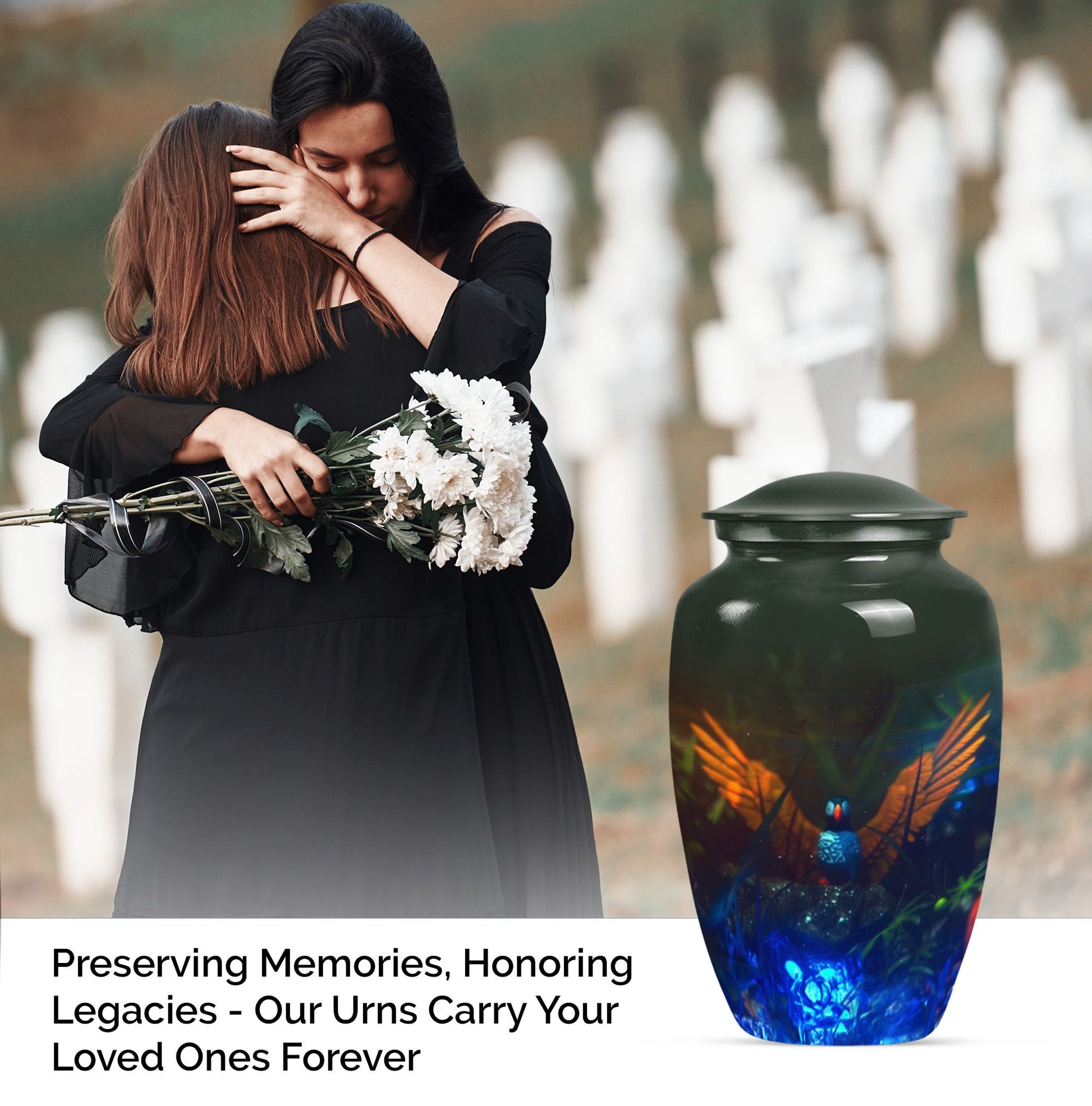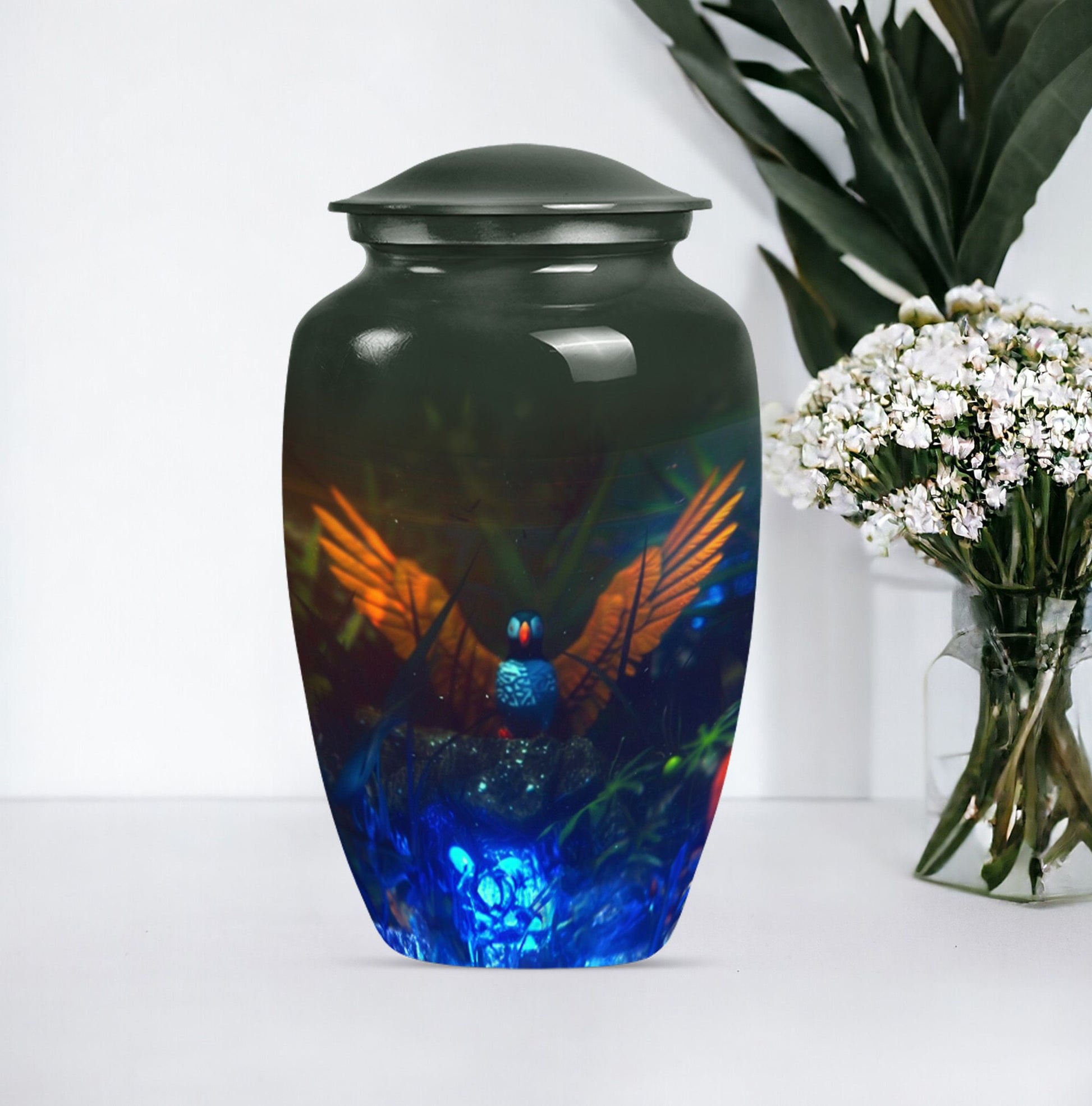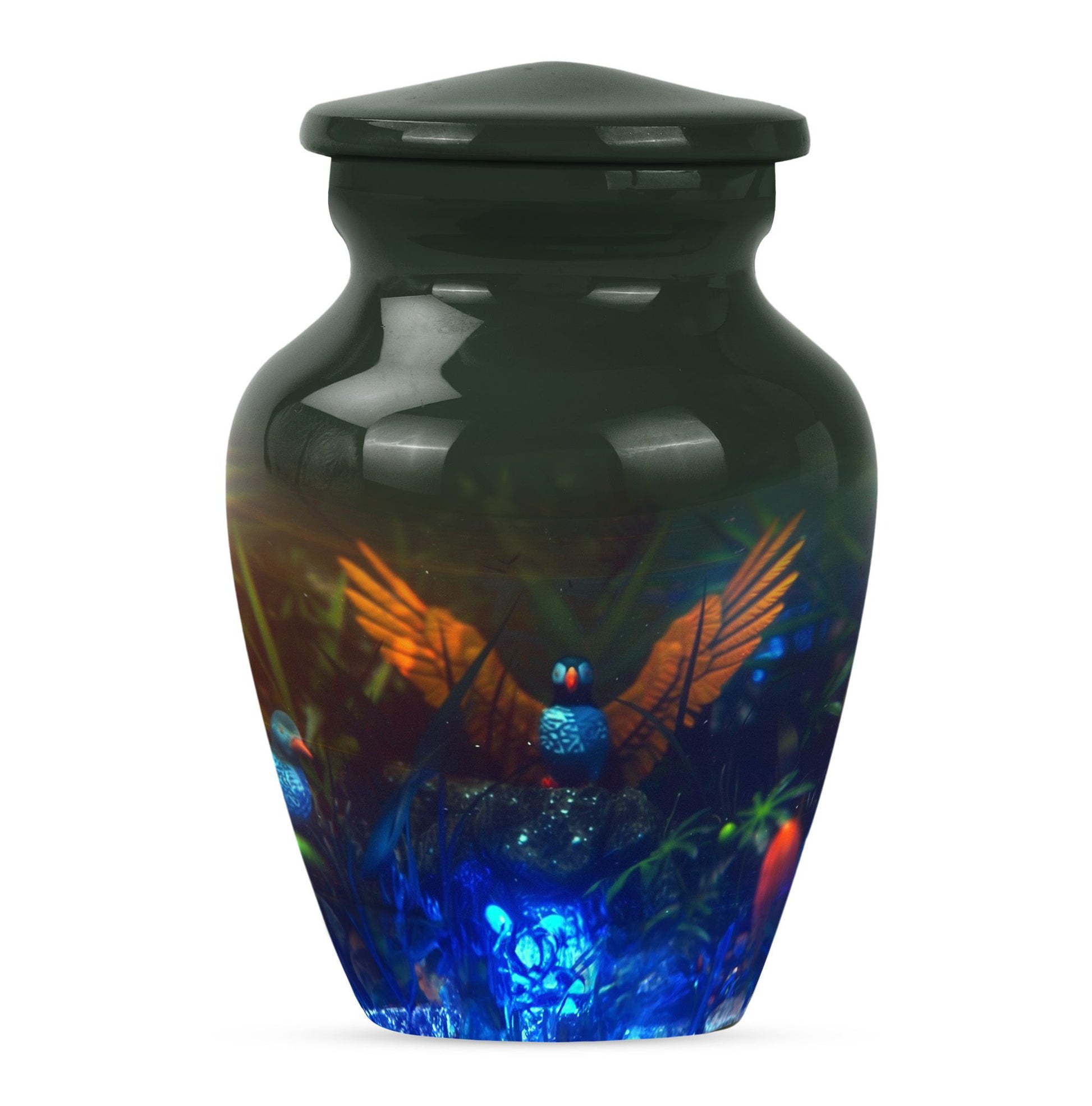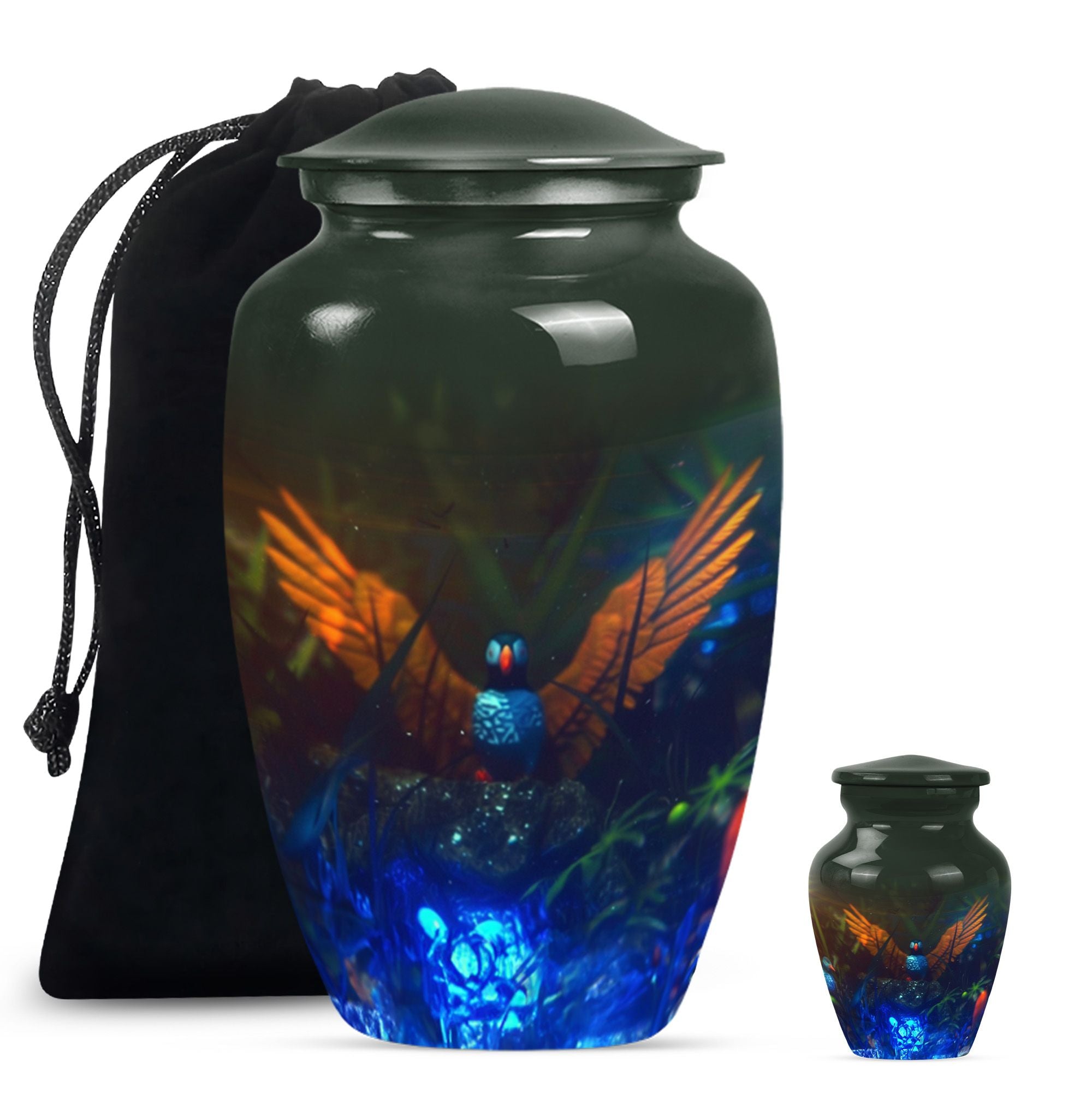 Discover the Puffin Bird Urn, an exemplary and distinctive choice among memorial adult urns for human ashes. Its unique abstract theme combined with its familiar and comforting 'classic urn' look offers a fitting final resting place. Crafted from high-quality aluminium, this sizeable urn measures substantial 10 inches in height and has been designed with a generous 200 cubic inch capacity - suitable as large urns for all adults. The urn's weight of 3.3 pounds ensures stability, providing peace of mind. Every purchase includes a lovely velvet pouch for secure containment of your loved one's ashes, an approach to memorializing that offers both elegance and warmth. Consider the option to personalize your urn, adding engraved names to create a bespoke monument. This cremation urn stands apart in the memorial ceremony supply category, equally suited to adult male or female ashes. Seamless and dignified, the Puffin Bird Urn provides a lasting tribute.